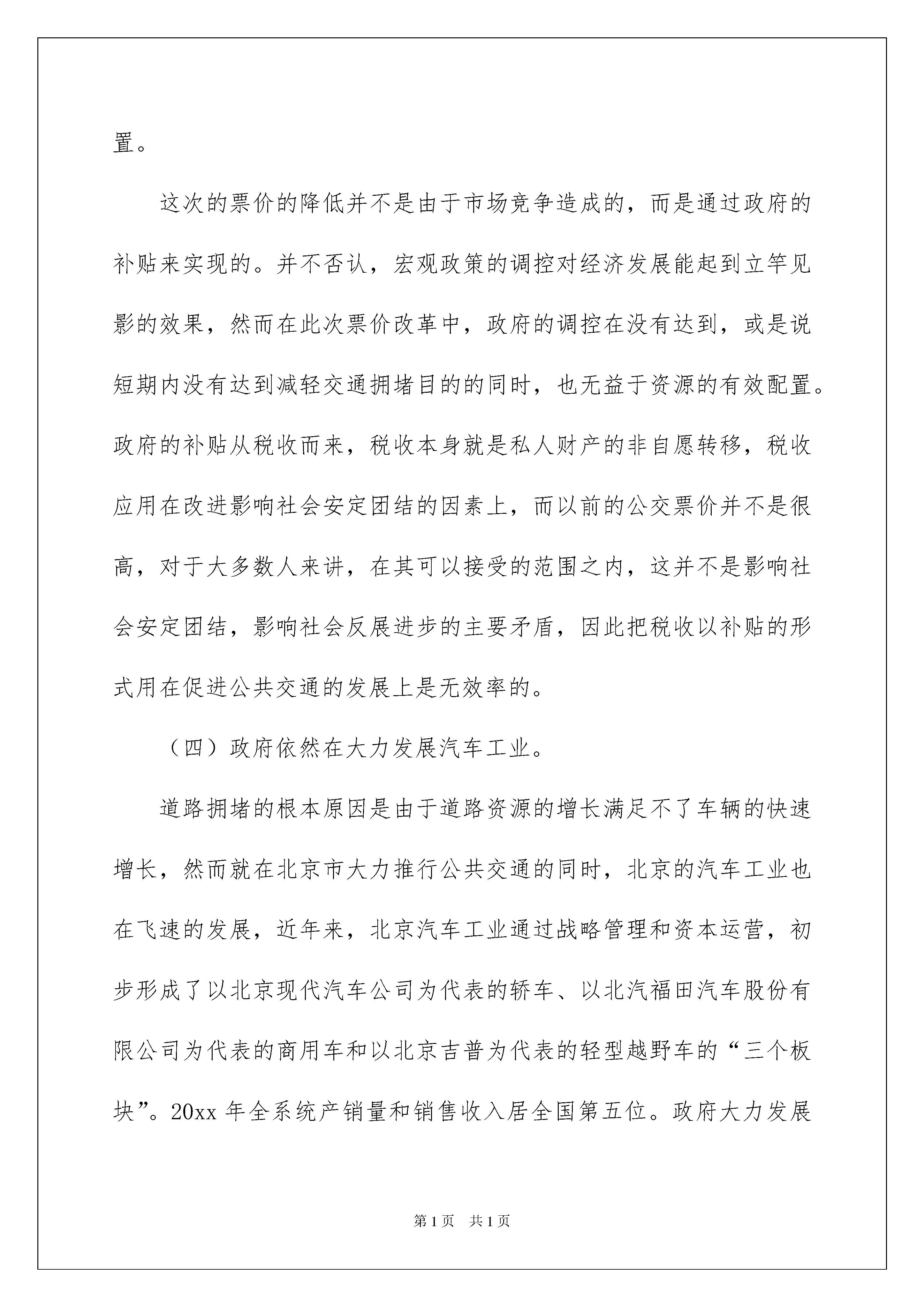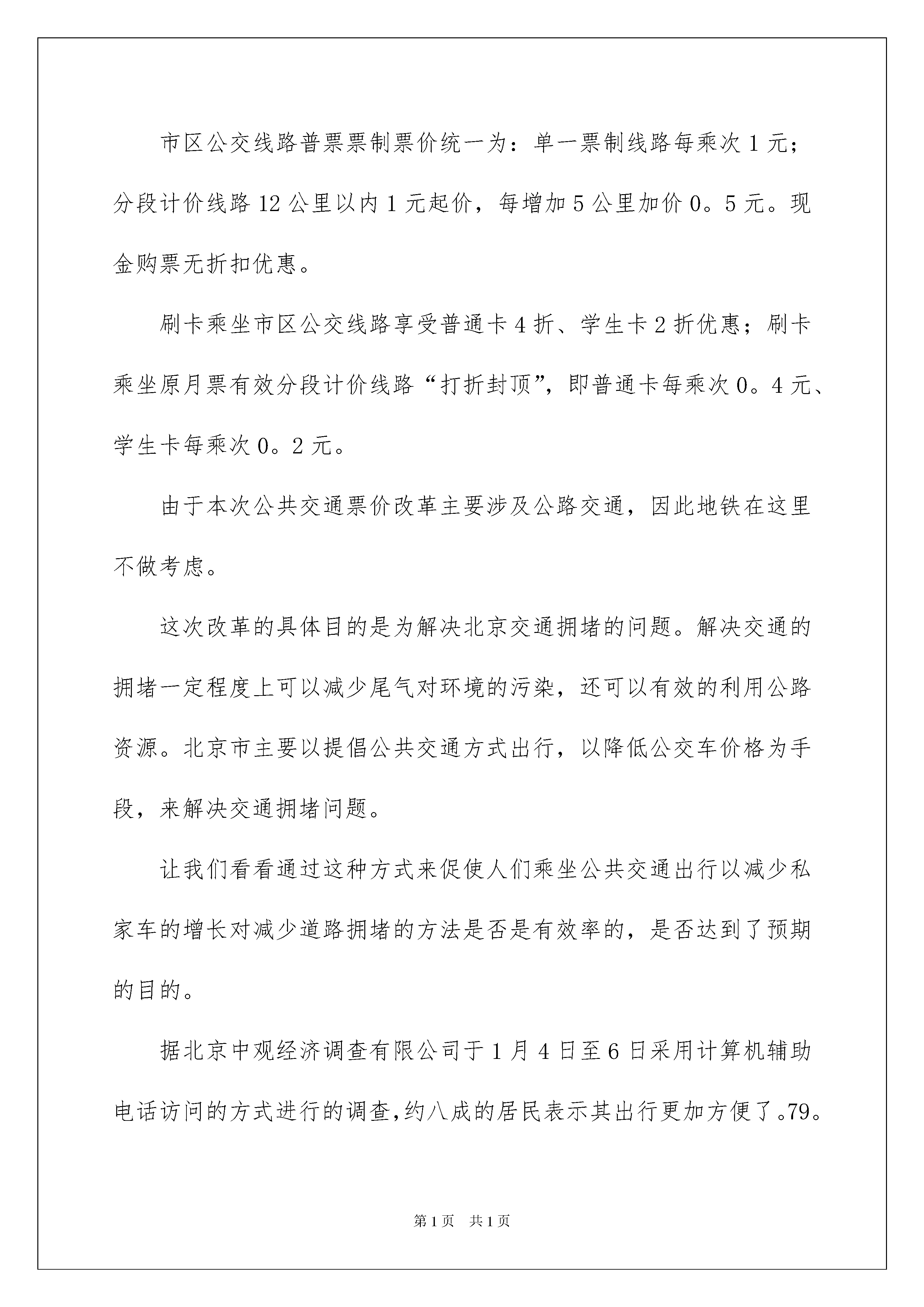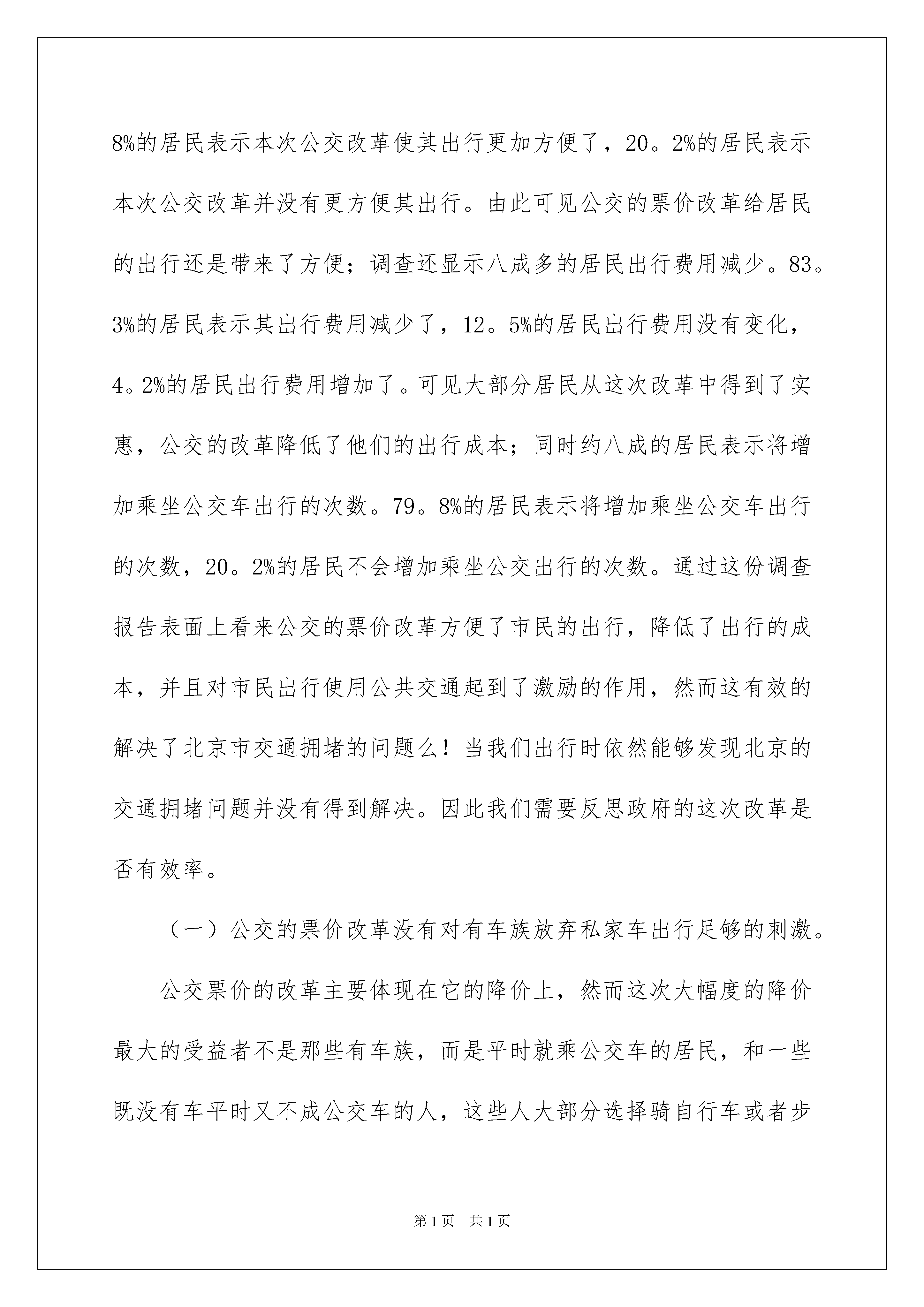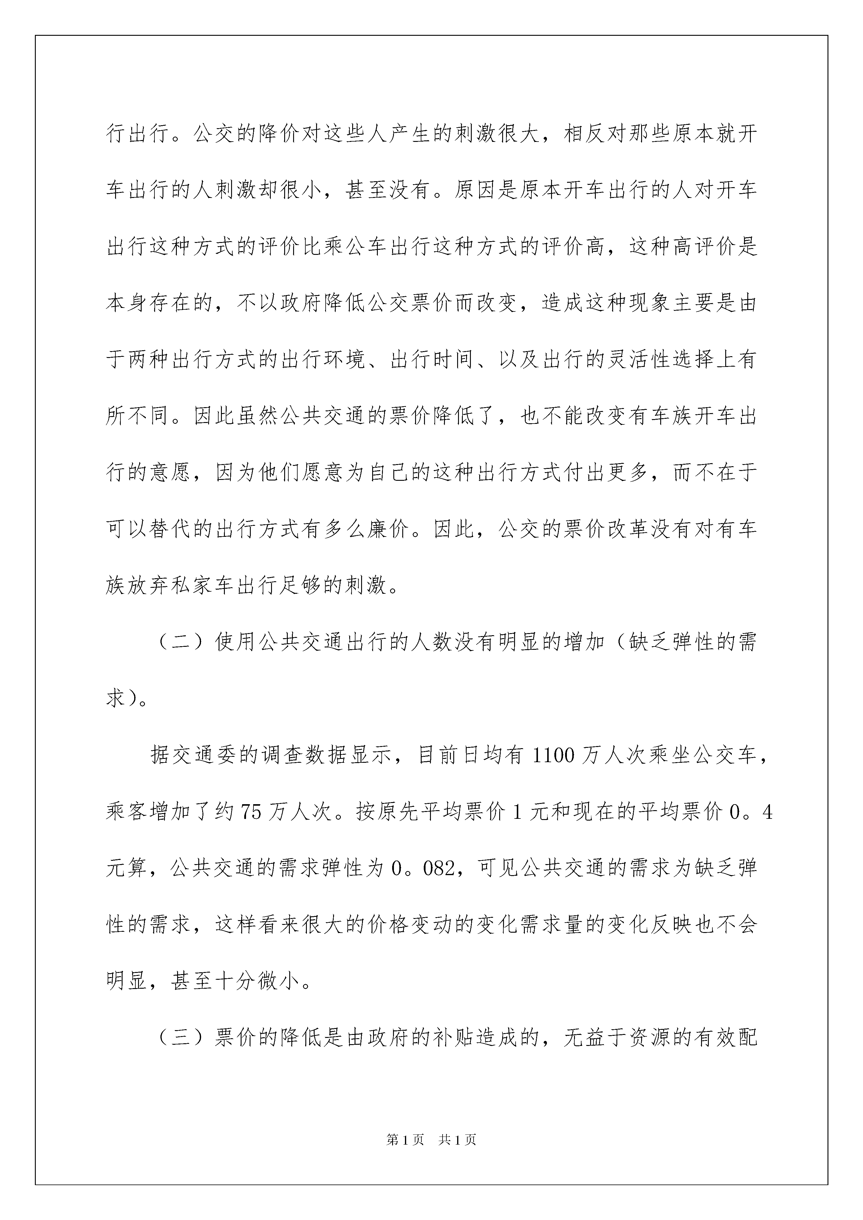2022寒假社会实践活动总结寒假社会实践活动总结总结是对取得的成绩、存在的问题及得到的经验和教训等方面情况进行评价与描述的一种书面材料,它能够使头脑更加清醒,目标更加明确,因此我们要做好归纳,写好总结。那么总结要注意有什么内容呢?下面是我整理的寒假社会实践活动总结,仅供参考,大家一起来看看吧。寒假社会实践活动总结1——关于北京市政公交票价改革效率的分析各个大城市发展过程中遇到的共同问题就是交通拥堵,北京市在遇到这个问题时力图通过降低公共交通的票价来引导人们出行方式的改变,北京市公交自今年1月1日起进行改革的具体调整如下:取消成人月票卡、学生月票卡和公交地铁联合月票卡,保留地铁专用月票卡,发行普通卡、学生卡。原学生月票卡可作为学生卡继续使用,原成人月票卡可作为普通卡继续使用,原公交地铁联合月票卡可作为地铁专用月票卡继续使用。市区公交线路普票票制票价统一为:单一票制线路每乘次1元;分段计价线路12公里以内1元起价,每增加5公里加价0。5元。现金购票无折扣优惠。刷卡乘坐市区公交线路享受普通卡4折、学生卡2折优惠;刷卡乘坐原月票有效分段计价线路“打折封顶”,即普通卡每乘次0。4元、学生卡每乘次0。2元。由于本次公共交通票价改革主要涉及公路交通,因此地铁在这里不做考虑。这次改革的具体目的是为解决北京交通拥堵的问题。解决交通的拥堵一定程度上可以减少尾气对环境的污染,还可以有效的利用公路资源。北京市主要以提倡公共交通方式出行,以降低公交车价格为手段,来解决交通拥堵问题。让我们看看通过这种方式来促使人们乘坐公共交通出行以减少私家车的增长对减少道路拥堵的方法是否是有效率的,是否达到了预期的目的。据北京中观经济调查有限公司于1月4日至6日采用计算机辅助电话访问的方式进行的调查,约八成的居民表示其出行更加方便了。79。8%的居民表示本次公交改革使其出行更加方便了,20。2%的居民表示本次公交改革并没有更方便其出行。由此可见公交的票价改革给居民的出行还是带来了方便;调查还显示八成多的居民出行费用减少。83。3%的居民表示其出行费用减少了,12。5%的居民出行费用没有变化,4。2%的居民出行费用增加了。可见大部分居民从这次改革中得到了实惠,公交的改革降低了他们的出行成本;同时约八成的居民表示将增加乘坐公交车出行的次数。79。8%的居民表示将增加乘坐公交车出行的次数,20。2%的居民不会增加乘坐公交出行的次数。通过这份调查报告表面上看来公交的票价改革方便了市民的出行,降低了出行的成本,并且对市民出行使用公共交通起到了激励的作用,然而这有效的解决了北京市交通拥堵的问题么!当我们出行时依然能够发现北京的交通拥堵问题并没有得到解决。因此我们需要反思政府的这次改革是否有效率。(一)公交的票价改革没有对有车族放弃私家车出行足够的刺激。公交票价的改革主要体现在它的降价上,然而这次大幅度的降价最大的受益者不是那些有车族,而是平时就乘公交车的居民,和一些既没有车平时又不成公交车的人,这些人大部分选择骑自行车或者步行出行。公交的降价对这些人产生的刺激很大,相反对那些原本就开车出行的人刺激却很小,甚至没有。原因是原本开车出行的人对开车出行这种方式的评价比乘公车出行这种方式的评价高,这种高评价是本身存在的,不以政府降低公交票价而改变,造成这种现象主要是由于两种出行方式的出行环境、出行时间、以及出行的灵活性选择上有所不同。因此虽然公共交通的票价降低了,也不能改变有车族开车出行的意愿,因为他们愿意为自己的这种出行方式付出更多,而不在于可以替代的出行方式有多么廉价。因此,公交的票价改革没有对有车族放弃私家车出行足够的刺激。(二)使用公共交通出行的人数没有明显的增加(缺乏弹性的需求)。据交通委的调查数据显示,目前日均有1100万人次乘坐公交车,乘客增加了约75万人次。按原先平均票价1元和现在的平均票价0。4元算,公共交通的需求弹性为0。082,可见公共交通的需求为缺乏弹性的需求,这样看来很大的价格变动的变化需求量的变化反映也不会明显,甚至十分微小。(三)票价的降低是由政府的补贴造成的,无益于资源的有效配置。这次的票价的降低并不是由于市场竞争造成的,而是通过政府的补贴来实现的。并不否认,宏观政策的调控对经济发展能起到立竿见影的效果,然而在此次票价改革中,政府的调控在没有达到,或是说短期内没有达到减轻交通拥堵目的的同时,也无益于资源的有效配置。政府的补贴从税收而来,税收本身就是私人财产的非自愿转移,税收应用在改进影响社会安定团结的因素上,而以前的公交票价并不是很高,对于大多数人来讲,在其可以接受的范围之内,这并不是影响社会安定团结,