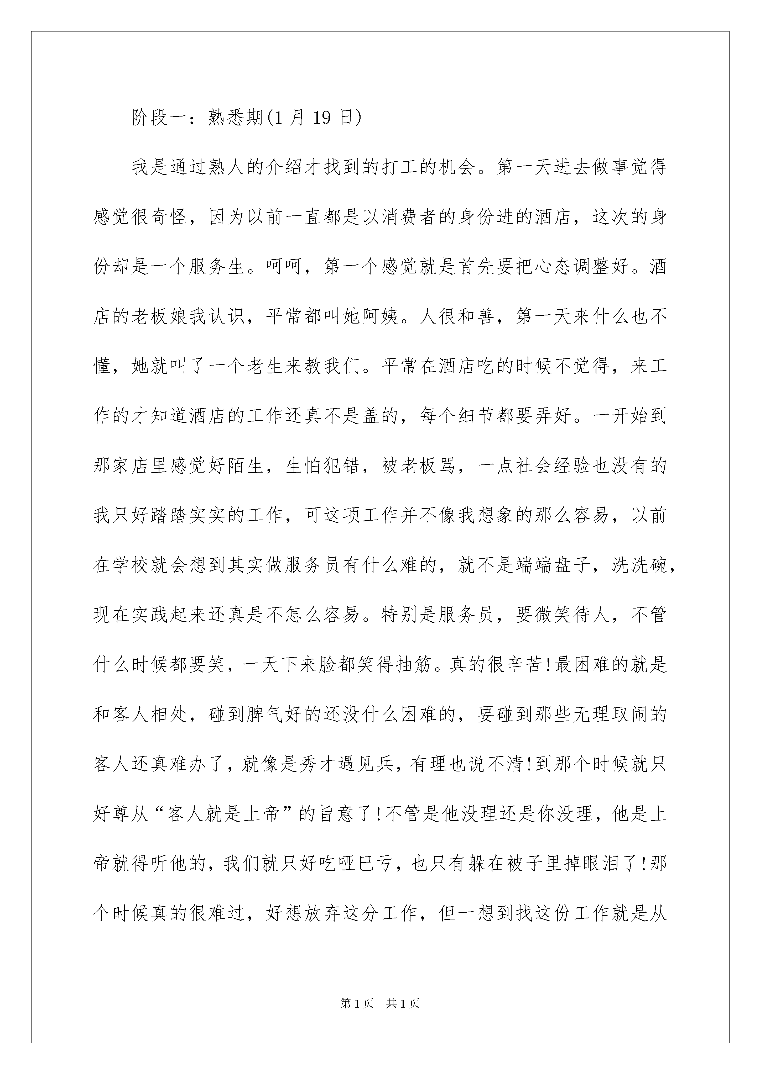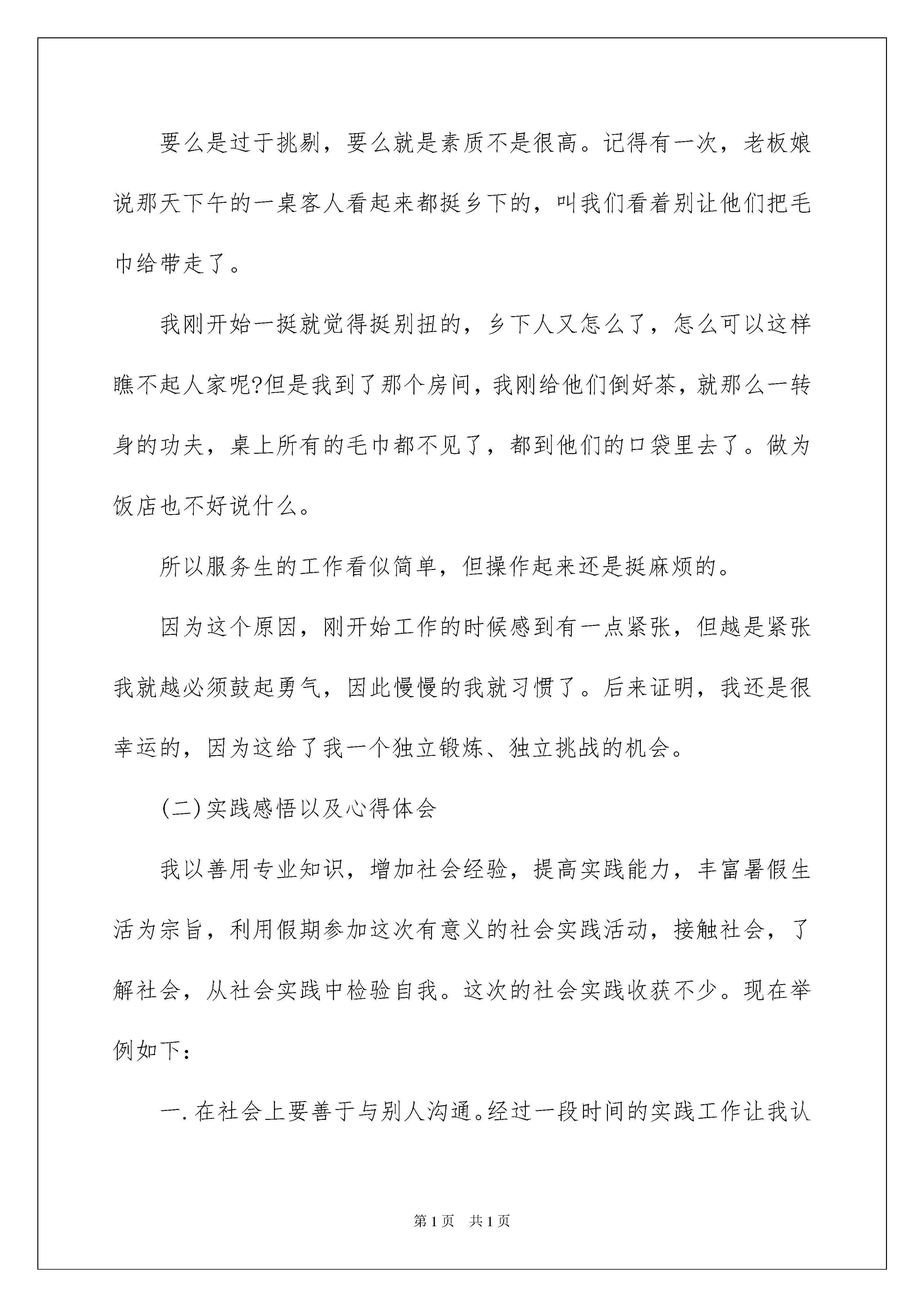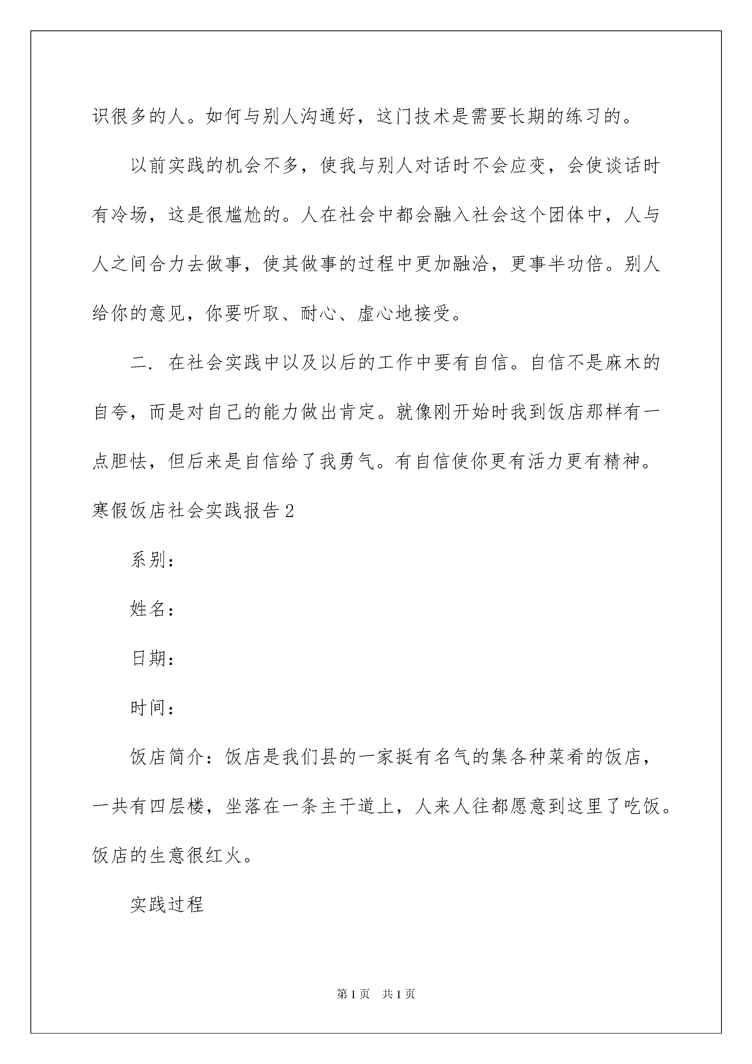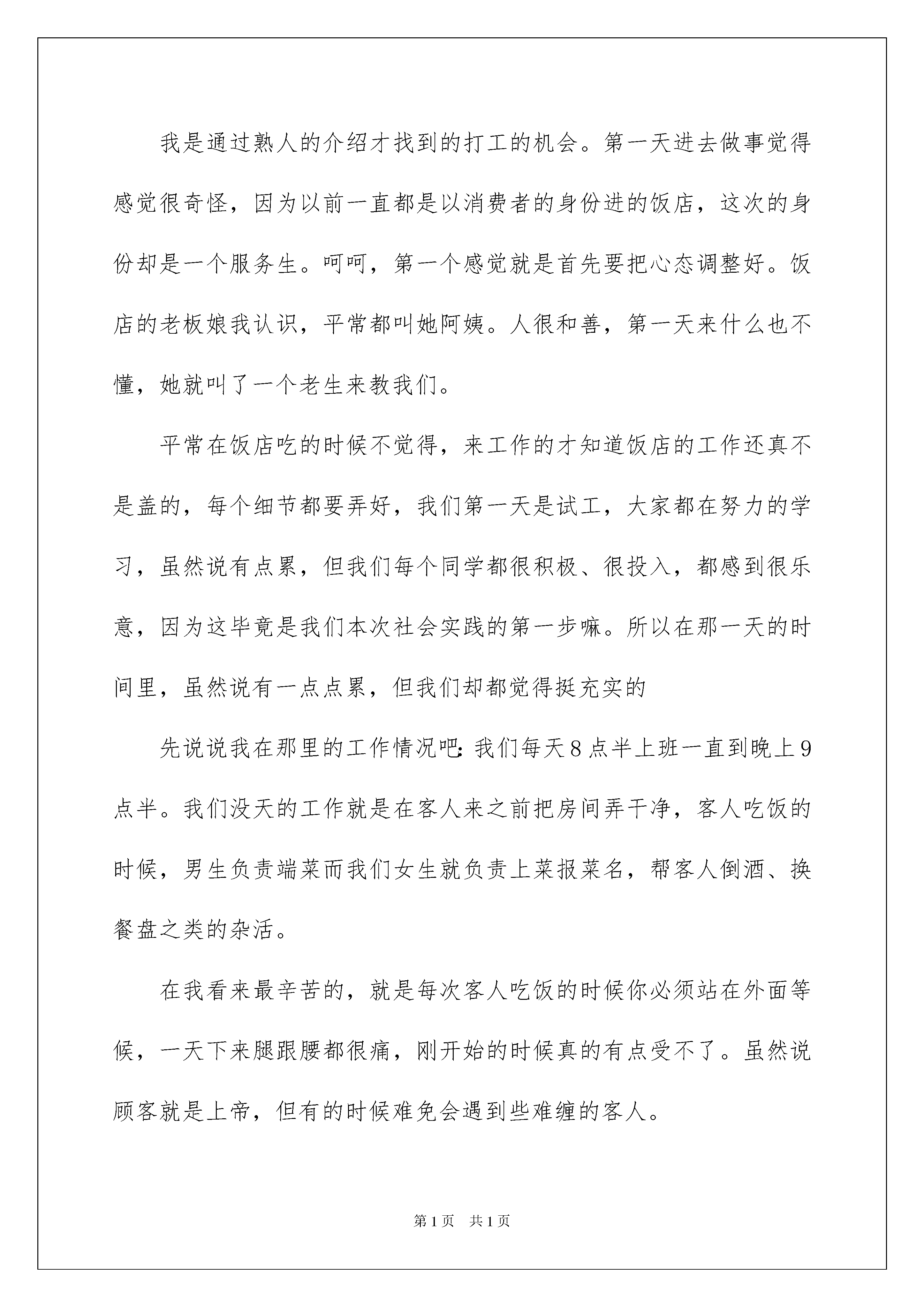 2022寒假饭店社会实践报告寒假饭店社会实践报告随着个人素质的提升,报告与我们愈发关系密切,要注意报告在写作时具有一定的格式。你知道怎样写报告才能写的好吗?下面是我为大家收集的寒假饭店社会实践报告,欢迎大家借鉴与参考,希望对大家有所帮助。寒假饭店社会实践报告1在中国的教育里,我们学的都是理论知识,真正用到的却不多。理论加实践才是最科学的学习方法。感谢学校给我们学生提供一个社会实践的平台。本次到饭店参加社会实践的总共有三位同学,所学专业有建筑,监理,造价等。实践的时间是从01月09日到02月08号为期一个月,实践的主题是了解自己,了解社会上班的主要日常工作有:刷盘子、擦酒杯、上菜、收拾餐具等等。(一)基本情况以及工作体会:我是通过熟人的介绍才找到的打工的机会。第一天进去做事觉得感觉很奇怪,因为以前一直都是以消费者的身份进的饭店,这次的身份却是一个服务生。呵呵,第一个感觉就是首先要把心态调整好。饭店的老板娘我认识,平常都叫她阿姨。人很和善,第一天来什么也不懂,她就叫了一个老生来教我们。平常在饭店吃的时候不觉得,来工作的才知道饭店的工作还真不是盖的,每个细节都要弄好,我们第一天是试工,大家都在努力的学习,虽然说有点累,但我们每个同学都很积极、很投入,都感到很乐意,因为这毕竟是我们本次社会实践的第一步嘛。所以在那一天的时间里,虽然说有一点点累,但我们却都觉得挺充实的先说说我在那里的工作情况吧:我们每天8点半上班一直到晚上9点半。我们没天的工作就是在客人来之前把房间弄干净,客人吃饭的时候,男生负责端菜而我们女生就负责上菜报菜名,帮客人倒酒、换餐盘之类的杂活。在我看来最辛苦的,就是每次客人吃饭的时候你必须站在外面等候,一天下来腿跟腰都很痛,刚开始的时候真的有点受不了。虽然说顾客就是上帝,但有的时候难免会遇到些难缠的客人。要么是过于挑剔,要么就是素质不是很高。记得有一次,老板娘说那天下午的一桌客人看起来都挺乡下的,叫我们看着别让他们把毛巾给带走了。我刚开始一挺就觉得挺别扭的,乡下人又怎么了,怎么可以这样瞧不起人家呢?但是我到了那个房间,我刚给他们倒好茶,就那么一转身的功夫,桌上所有的毛巾都不见了,都到他们的口袋里去了。做为饭店也不好说什么。所以服务生的工作看似简单,但操作起来还是挺麻烦的。因为这个原因,刚开始工作的时候感到有一点紧张,但越是紧张我就越必须鼓起勇气,因此慢慢的我就习惯了。后来证明,我还是很幸运的,因为这给了我一个独立锻炼、独立挑战的机会。(二)实践感悟以及心得体会我以善用专业知识,增加社会经验,提高实践能力,丰富暑假生活为宗旨,利用假期参加这次有意义的社会实践活动,接触社会,了解社会,从社会实践中检验自我。这次的社会实践收获不少。现在举例如下:一.在社会上要善于与别人沟通。经过一段时间的实践工作让我认识很多的人。如何与别人沟通好,这门技术是需要长期的练习的。以前实践的机会不多,使我与别人对话时不会应变,会使谈话时有冷场,这是很尴尬的。人在社会中都会融入社会这个团体中,人与人之间合力去做事,使其做事的过程中更加融洽,更事半功倍。别人给你的意见,你要听取、耐心、虚心地接受。二.在社会实践中以及以后的工作中要有自信。自信不是麻木的自夸,而是对自己的能力做出肯定。就像刚开始时我到饭店那样有一点胆怯,但后来是自信给了我勇气。有自信使你更有活力更有精神。寒假饭店社会实践报告2系别:姓名:日期:时间:饭店简介:饭店是我们县的一家挺有名气的集各种菜肴的饭店,一共有四层楼,坐落在一条主干道上,人来人往都愿意到这里了吃饭。饭店的生意很红火。实践过程阶段一:熟悉期(1月19日)我是通过熟人的介绍才找到的打工的机会。第一天进去做事觉得感觉很奇怪,因为以前一直都是以消费者的身份进的酒店,这次的身份却是一个服务生。呵呵,第一个感觉就是首先要把心态调整好。酒店的老板娘我认识,平常都叫她阿姨。人很和善,第一天来什么也不懂,她就叫了一个老生来教我们。平常在酒店吃的时候不觉得,来工作的才知道酒店的工作还真不是盖的,每个细节都要弄好。一开始到那家店里感觉好陌生,生怕犯错,被老板骂,一点社会经验也没有的我只好踏踏实实的工作,可这项工作并不像我想象的那么容易,以前在学校就会想到其实做服务员有什么难的,就不是端端盘子,洗洗碗,现在实践起来还真是不怎么容易。特别是服务员,要微笑待人,不管什么时候都要笑,一天下来脸都笑得抽筋。真的很辛苦!最困难的就是和客人相处,碰到脾气好的还没什么困难的,要碰到那些无理取闹的客人还真难办了,就像是秀才遇见兵,有理也说不清!到那个时候就只好尊从“客人就是上帝”的旨意了!不管是他没理还是你