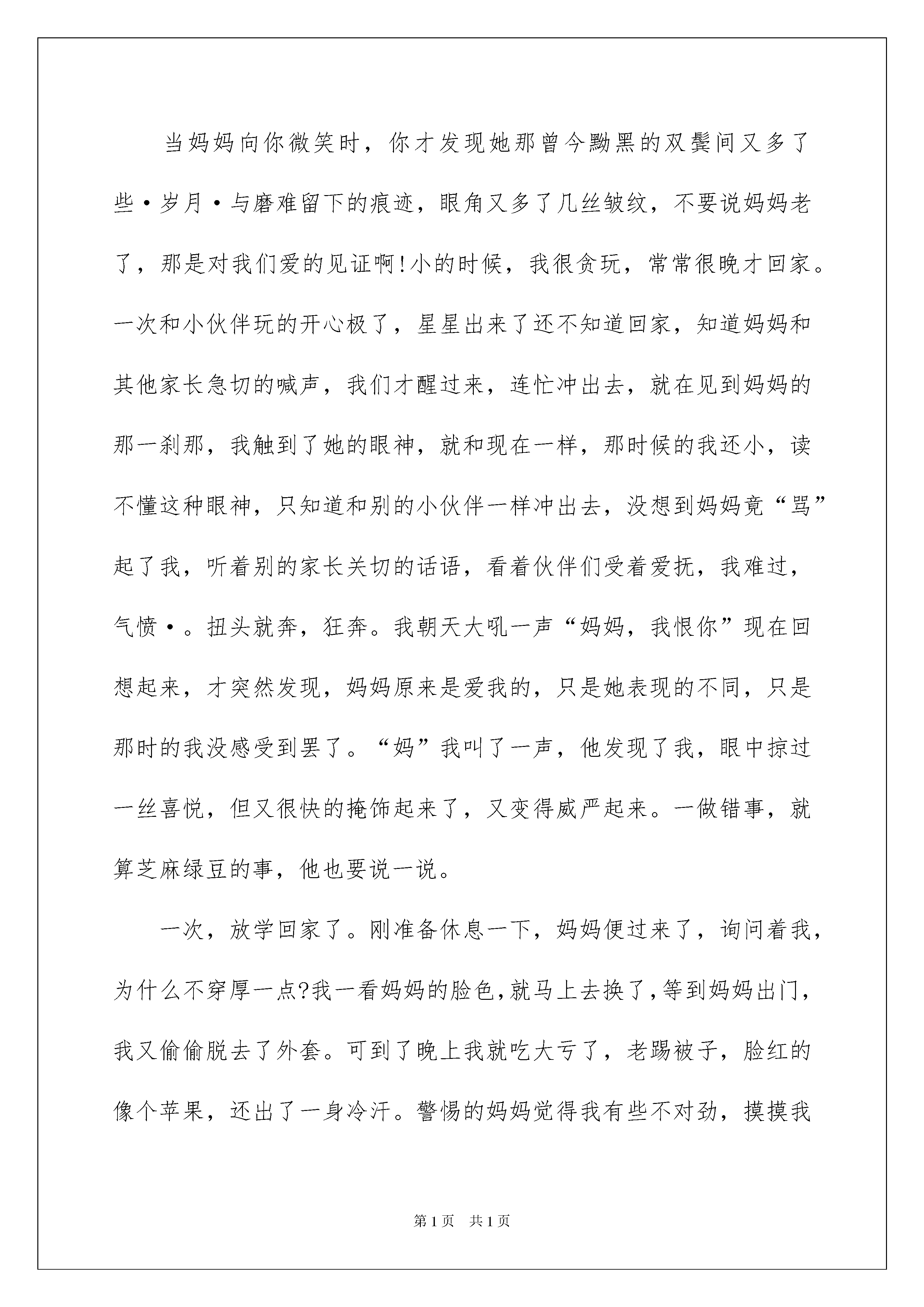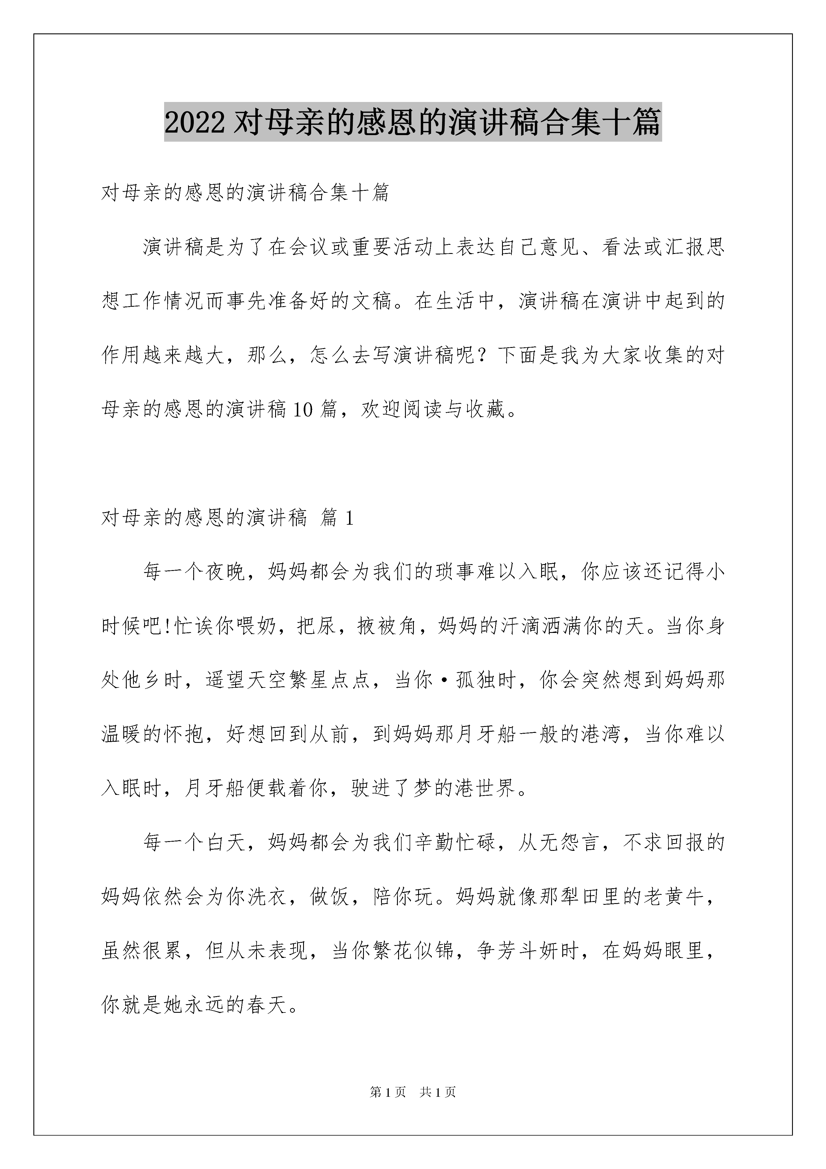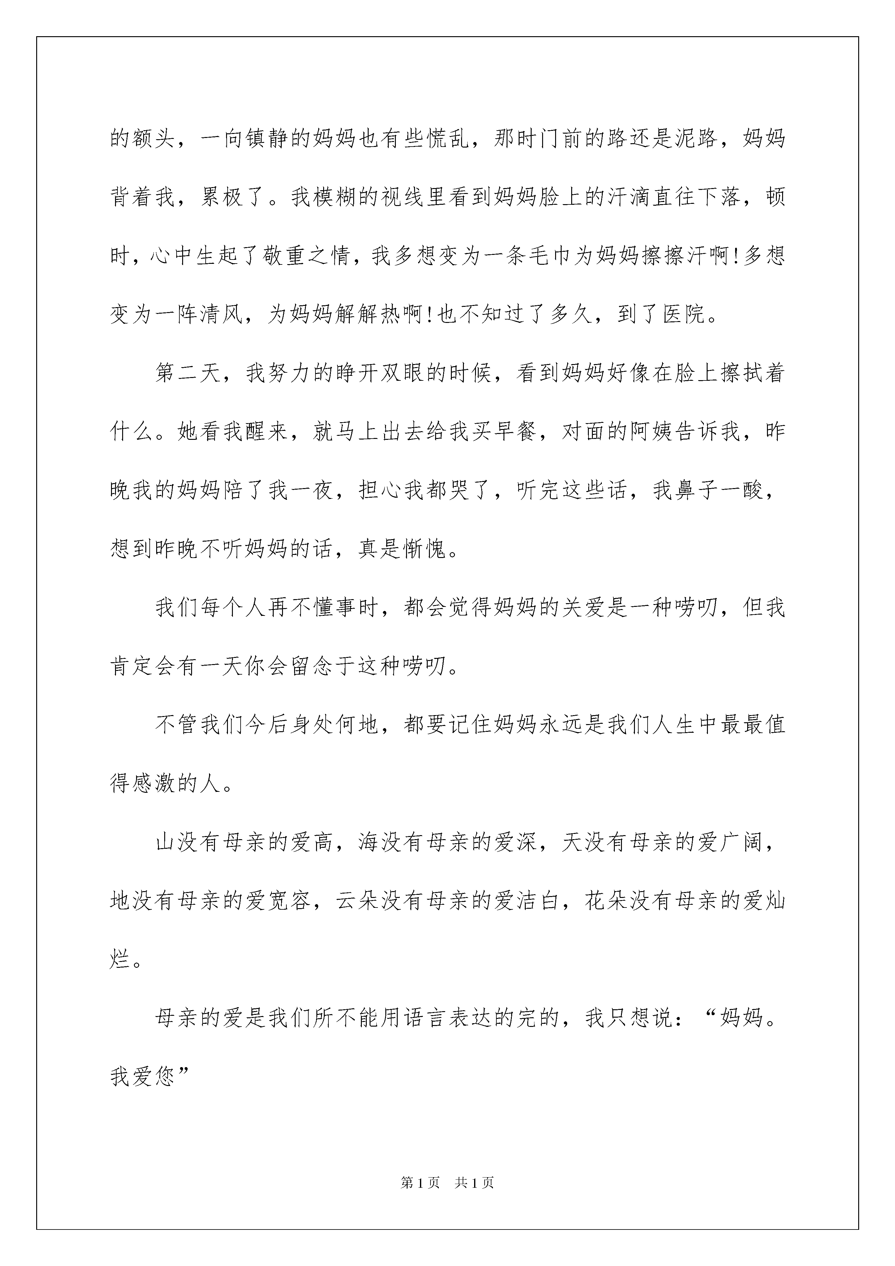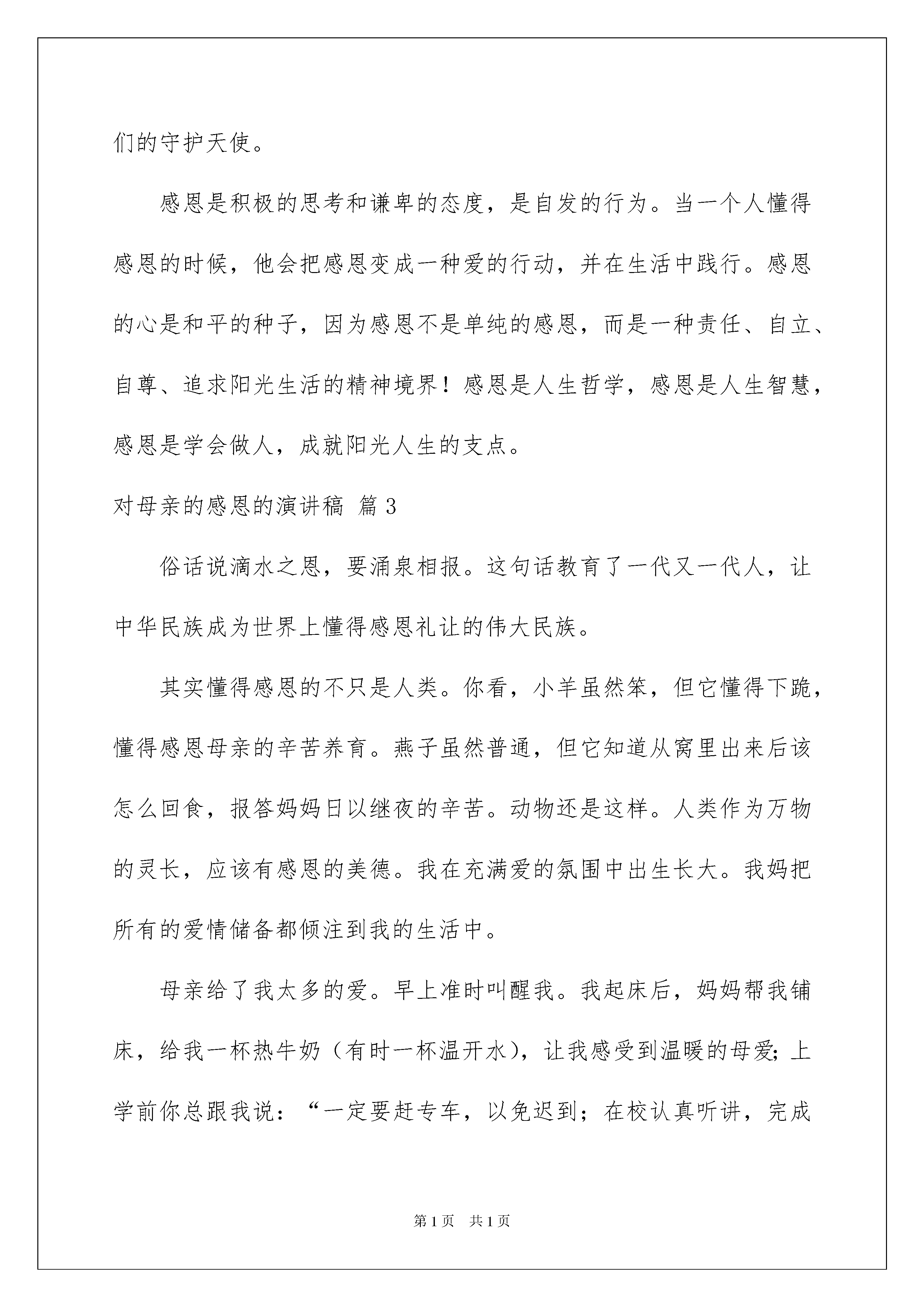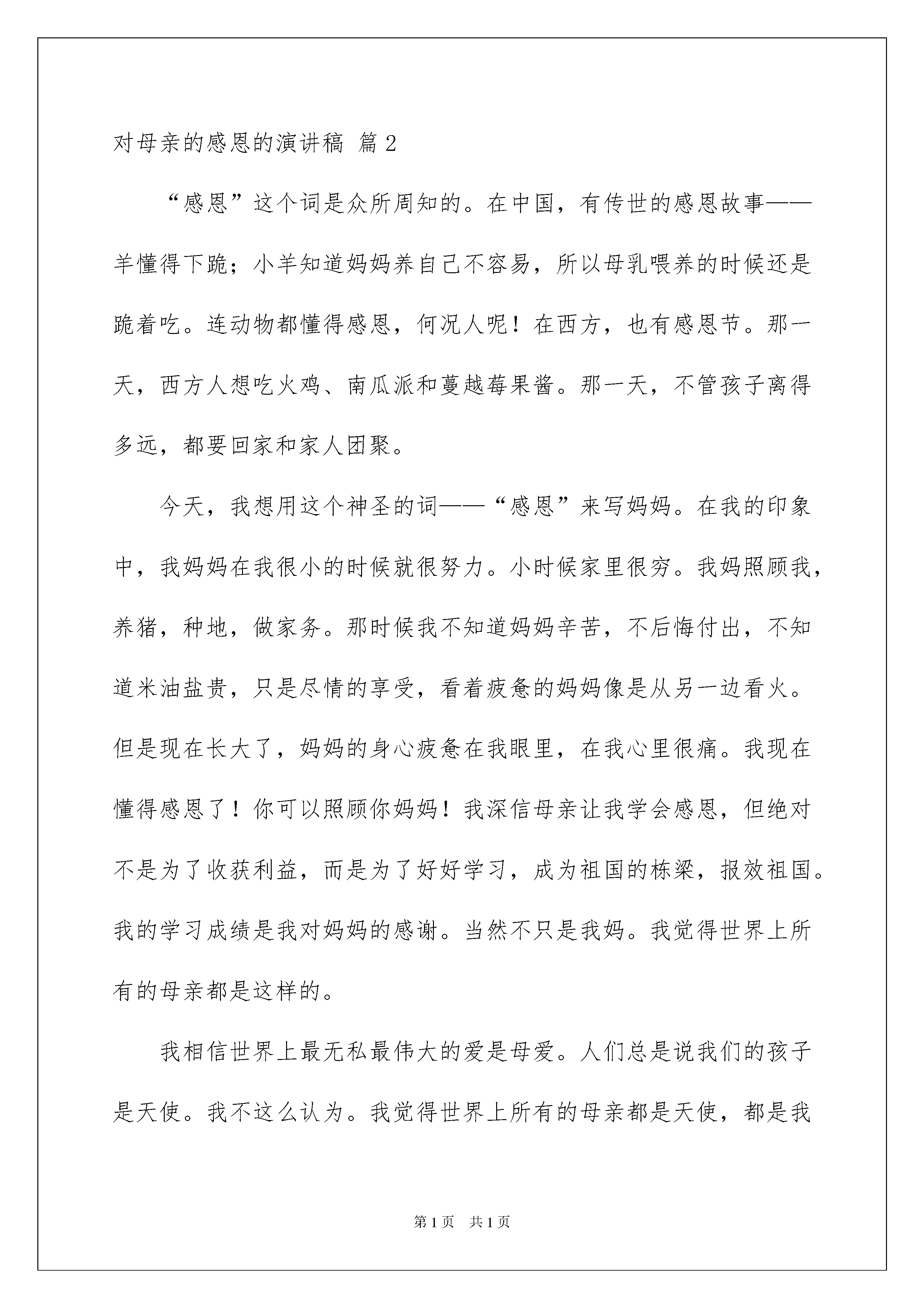 2022对母亲的感恩的演讲稿合集十篇对母亲的感恩的演讲稿合集十篇演讲稿是为了在会议或重要活动上表达自己意见、看法或汇报思想工作情况而事先准备好的文稿。在生活中,演讲稿在演讲中起到的作用越来越大,那么,怎么去写演讲稿呢?下面是我为大家收集的对母亲的感恩的演讲稿10篇,欢迎阅读与收藏。对母亲的感恩的演讲稿篇1每一个夜晚,妈妈都会为我们的琐事难以入眠,你应该还记得小时候吧!忙诶你喂奶,把尿,掖被角,妈妈的汗滴洒满你的天。当你身处他乡时,遥望天空繁星点点,当你·孤独时,你会突然想到妈妈那温暖的怀抱,好想回到从前,到妈妈那月牙船一般的港湾,当你难以入眠时,月牙船便载着你,驶进了梦的港世界。每一个白天,妈妈都会为我们辛勤忙碌,从无怨言,不求回报的妈妈依然会为你洗衣,做饭,陪你玩。妈妈就像那犁田里的老黄牛,虽然很累,但从未表现,当你繁花似锦,争芳斗妍时,在妈妈眼里,你就是她永远的春天。当妈妈向你微笑时,你才发现她那曾今黝黑的双鬓间又多了些·岁月·与磨难留下的痕迹,眼角又多了几丝皱纹,不要说妈妈老了,那是对我们爱的见证啊!小的时候,我很贪玩,常常很晚才回家。一次和小伙伴玩的开心极了,星星出来了还不知道回家,知道妈妈和其他家长急切的喊声,我们才醒过来,连忙冲出去,就在见到妈妈的那一刹那,我触到了她的眼神,就和现在一样,那时候的我还小,读不懂这种眼神,只知道和别的小伙伴一样冲出去,没想到妈妈竟“骂”起了我,听着别的家长关切的话语,看着伙伴们受着爱抚,我难过,气愤·。扭头就奔,狂奔。我朝天大吼一声“妈妈,我恨你”现在回想起来,才突然发现,妈妈原来是爱我的,只是她表现的不同,只是那时的我没感受到罢了。“妈”我叫了一声,他发现了我,眼中掠过一丝喜悦,但又很快的掩饰起来了,又变得威严起来。一做错事,就算芝麻绿豆的事,他也要说一说。一次,放学回家了。刚准备休息一下,妈妈便过来了,询问着我,为什么不穿厚一点?我一看妈妈的脸色,就马上去换了,等到妈妈出门,我又偷偷脱去了外套。可到了晚上我就吃大亏了,老踢被子,脸红的像个苹果,还出了一身冷汗。警惕的妈妈觉得我有些不对劲,摸摸我的额头,一向镇静的妈妈也有些慌乱,那时门前的路还是泥路,妈妈背着我,累极了。我模糊的视线里看到妈妈脸上的汗滴直往下落,顿时,心中生起了敬重之情,我多想变为一条毛巾为妈妈擦擦汗啊!多想变为一阵清风,为妈妈解解热啊!也不知过了多久,到了医院。第二天,我努力的睁开双眼的时候,看到妈妈好像在脸上擦拭着什么。她看我醒来,就马上出去给我买早餐,对面的阿姨告诉我,昨晚我的妈妈陪了我一夜,担心我都哭了,听完这些话,我鼻子一酸,想到昨晚不听妈妈的话,真是惭愧。我们每个人再不懂事时,都会觉得妈妈的关爱是一种唠叨,但我肯定会有一天你会留念于这种唠叨。不管我们今后身处何地,都要记住妈妈永远是我们人生中最最值得感激的人。山没有母亲的爱高,海没有母亲的爱深,天没有母亲的爱广阔,地没有母亲的爱宽容,云朵没有母亲的爱洁白,花朵没有母亲的爱灿烂。母亲的爱是我们所不能用语言表达的完的,我只想说:“妈妈。我爱您”对母亲的感恩的演讲稿篇2“感恩”这个词是众所周知的。在中国,有传世的感恩故事——羊懂得下跪;小羊知道妈妈养自己不容易,所以母乳喂养的时候还是跪着吃。连动物都懂得感恩,何况人呢!在西方,也有感恩节。那一天,西方人想吃火鸡、南瓜派和蔓越莓果酱。那一天,不管孩子离得多远,都要回家和家人团聚。今天,我想用这个神圣的词——“感恩”来写妈妈。在我的印象中,我妈妈在我很小的时候就很努力。小时候家里很穷。我妈照顾我,养猪,种地,做家务。那时候我不知道妈妈辛苦,不后悔付出,不知道米油盐贵,只是尽情的享受,看着疲惫的妈妈像是从另一边看火。但是现在长大了,妈妈的身心疲惫在我眼里,在我心里很痛。我现在懂得感恩了!你可以照顾你妈妈!我深信母亲让我学会感恩,但绝对不是为了收获利益,而是为了好好学习,成为祖国的栋梁,报效祖国。我的学习成绩是我对妈妈的感谢。当然不只是我妈。我觉得世界上所有的母亲都是这样的。我相信世界上最无私最伟大的爱是母爱。人们总是说我们的孩子是天使。我不这么认为。我觉得世界上所有的母亲都是天使,都是我们的守护天使。感恩是积极的思考和谦卑的态度,是自发的行为。当一个人懂得感恩的时候,他会把感恩变成一种爱的行动,并在生活中践行。感恩的心是和平的种子,因为感恩不是单纯的感恩,而是一种责任、自立、自尊、追求阳光生活的精神境界!感恩是人生哲学,感恩是人生智慧,感恩是学会做人,成就阳光人生的支点。对母亲的感恩的演讲稿篇3俗话说滴水之恩,要涌泉相报。这句话教育了一代又一代人,让中华民族成为世