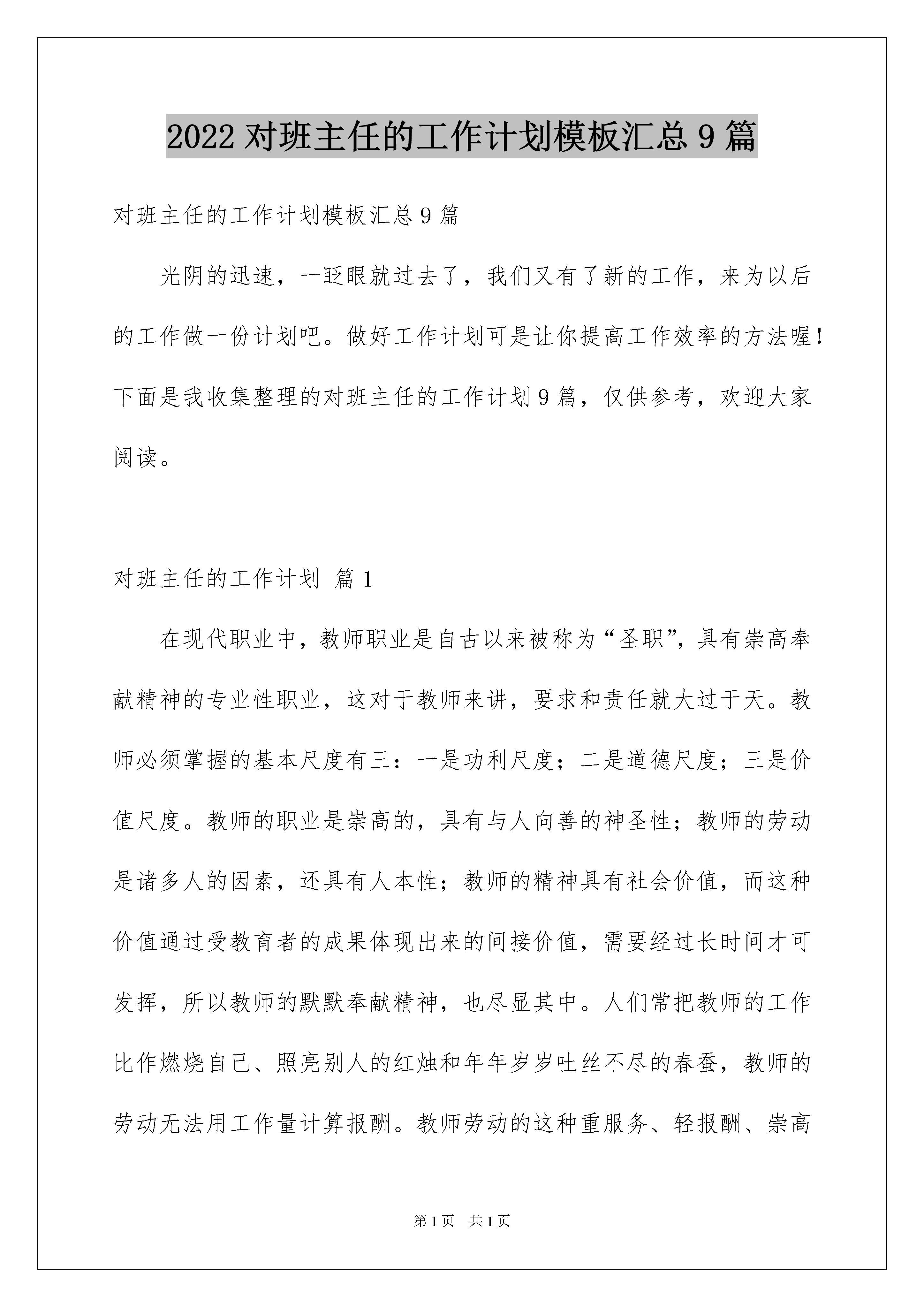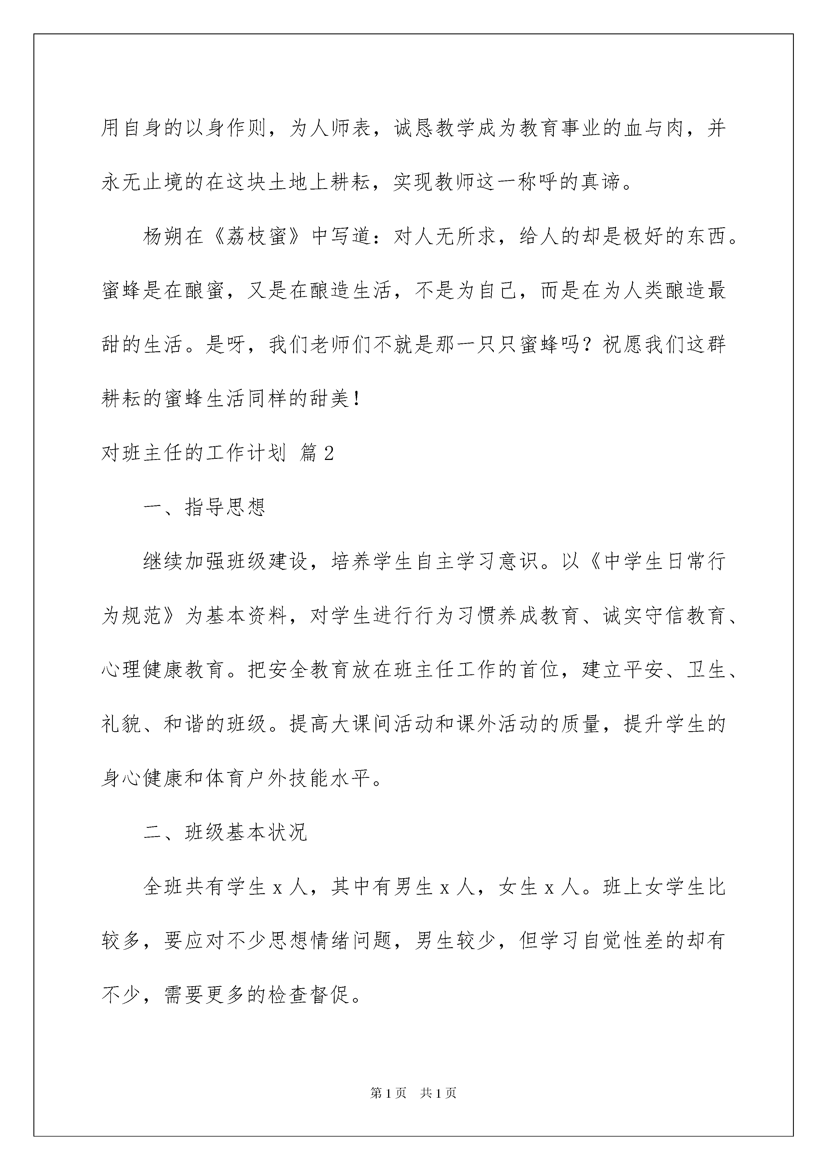 2022对班主任的工作计划模板汇总9篇对班主任的工作计划模板汇总9篇光阴的迅速,一眨眼就过去了,我们又有了新的工作,来为以后的工作做一份计划吧。做好工作计划可是让你提高工作效率的方法喔!下面是我收集整理的对班主任的工作计划9篇,仅供参考,欢迎大家阅读。对班主任的工作计划篇1在现代职业中,教师职业是自古以来被称为“圣职”,具有崇高奉献精神的专业性职业,这对于教师来讲,要求和责任就大过于天。教师必须掌握的基本尺度有三:一是功利尺度;二是道德尺度;三是价值尺度。教师的职业是崇高的,具有与人向善的神圣性;教师的劳动是诸多人的因素,还具有人本性;教师的精神具有社会价值,而这种价值通过受教育者的成果体现出来的间接价值,需要经过长时间才可发挥,所以教师的默默奉献精神,也尽显其中。人们常把教师的工作比作燃烧自己、照亮别人的红烛和年年岁岁吐丝不尽的春蚕,教师的劳动无法用工作量计算报酬。教师劳动的这种重服务、轻报酬、崇高奉献的职业精神本身正是一种崇高的道德价值。这样说来,我们教师的人生价值就需要有追求,有境界:首先,我具有职业意识境界。回想XX年初为人师,站在讲台上,几十双眼睛注视着我,目光相撞之时,一种强大的吸引力使我意志坚决的在这个小小的空间上伫立了十六年之久。十年间,我没有放弃过学习、进修,小至周期培训,大致大本的进修,现已都顺利完成。并决心以“一桶水”灌溉“一杯水”,尽全力完成好传道、授业、解惑,用自己的底蕴丰富幼苗的成长。认真地对待学校的每一项工作,虽然教授六年级课程已5余年,但不放松任何一个细节的研讨,与同组的老师攻克每年知识点的变换万千,交流提高学生学习兴趣的方法策略,以及虚心求教我教学中的不足,以便更好的改善未来的工作。其次,我具有事业心境界。教书育人,关心每个学生的全面发展,耕耘学生的心灵,做到“教学生一年,想学生一生。”行为规范上,我是严师,我要求学生要具有作为学生的标准,他们的一言一行,关系到他们一辈子的人生态度。我不放过他们的任何一个细节,好的,我会弘扬之群体中,坏的,我会视情节予以教育或严厉的批评。在管理班级体上,我有自己独到的一面,几年来我接任了无数个称为乱班的班级体,但是每年的乱班“乱”的程度和意义,所以方法也不一不同,所以管理这样的班集体必须要经过三步走:视、理、放。所谓“视”,即用眼睛观察,摸清班内为什么乱,乱在哪些人身上,导致他们乱的因素何在;搞清楚后,就要实施我们的措施,进行严肃而有意义的治理,不惜时间,不惜精力,但惜让我的每一次教育和治理都有成效;规范养成后,学生就会明白我的每一个眼神,一个神情代表的语言,这时我就有的放矢的放手让学生自我管理,让好习惯成为他们的自我修养。课堂上,我是讲师,组织好每一次课堂,充分发挥自己的长处,创设情境,调动学生积极性,让每一节课都成为教师、学生、和数学知识的结合,让我们融为一体,相隔一章,渐渐的,学生对数学的学习产生了浓厚的兴趣,兴趣也促进了成绩的提高,每年的毕业考试成绩都大幅度提高。作为教师的我,也在每一节课中总结自己的得与失,在探索、积累、和再实践中丰富自己,收获自己。课下,我们又成为了无话不谈的朋友,平等交谈,聊自己的爱好,论看电视节目的感想。让播种的辛勤汗水和爱,收获丰硕的果实。最后,我具有志向感的境界。我将事业、生命、个性、人生理想融为一体。在选择职业时,我就将事业默默的永恒发挥存留在心中。用自身的以身作则,为人师表,诚恳教学成为教育事业的血与肉,并永无止境的在这块土地上耕耘,实现教师这一称呼的真谛。杨朔在《荔枝蜜》中写道:对人无所求,给人的却是极好的东西。蜜蜂是在酿蜜,又是在酿造生活,不是为自己,而是在为人类酿造最甜的生活。是呀,我们老师们不就是那一只只蜜蜂吗?祝愿我们这群耕耘的蜜蜂生活同样的甜美!对班主任的工作计划篇2一、指导思想继续加强班级建设,培养学生自主学习意识。以《中学生日常行为规范》为基本资料,对学生进行行为习惯养成教育、诚实守信教育、心理健康教育。把安全教育放在班主任工作的首位,建立平安、卫生、礼貌、和谐的班级。提高大课间活动和课外活动的质量,提升学生的身心健康和体育户外技能水平。二、班级基本状况全班共有学生x人,其中有男生x人,女生x人。班上女学生比较多,要应对不少思想情绪问题,男生较少,但学习自觉性差的却有不少,需要更多的检查督促。三、奋斗目标:将本班建设具有“团结、严谨、奋发、拼搏”的班风;让学生养成良好的习惯,为今后学习工作打下坚实的基础,抒写人生中闪亮绚丽的青春风采。四、本学期班主任工作基本要点:1、增强凝聚力,构成团结、互助互爱的班群众透过班会、团活动、校活动等活动不断将这个群众建
