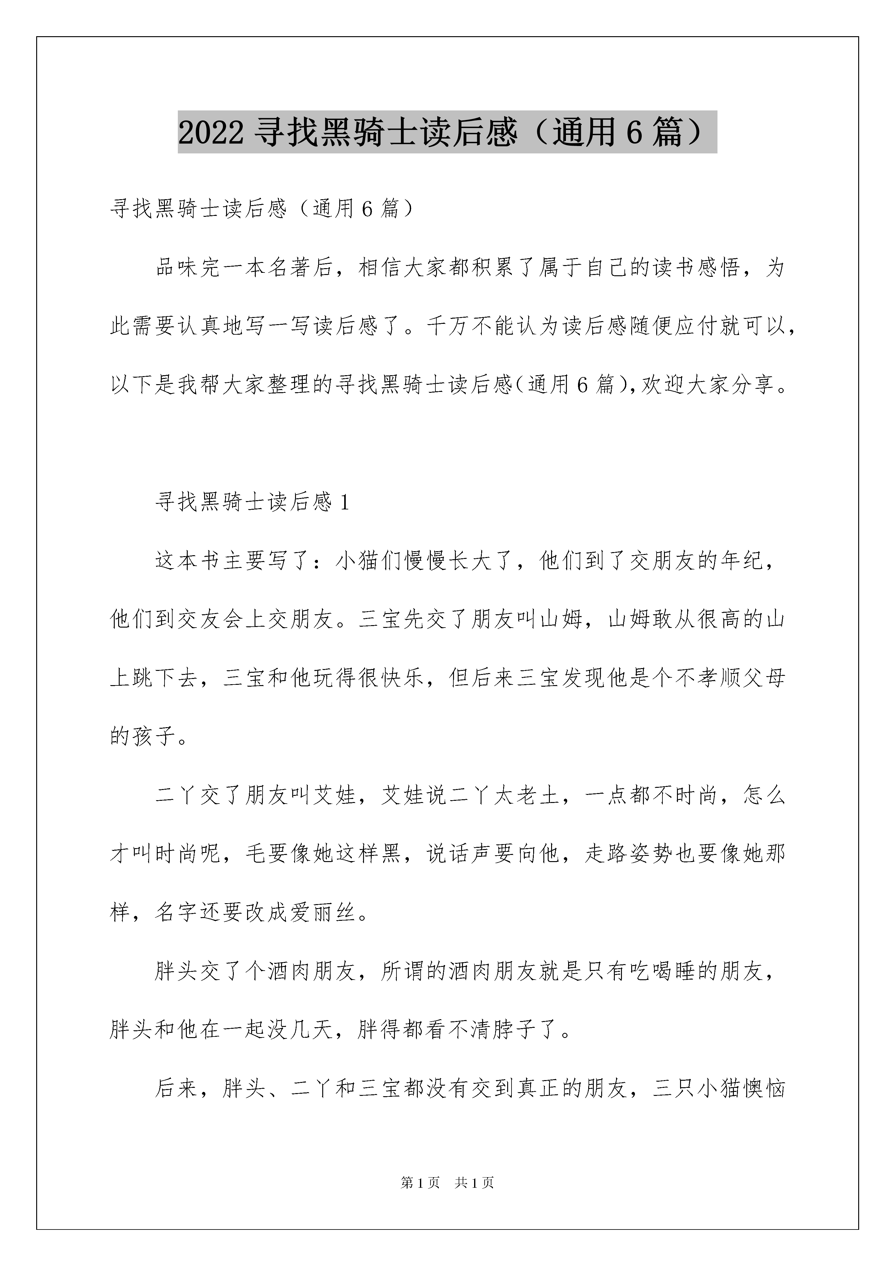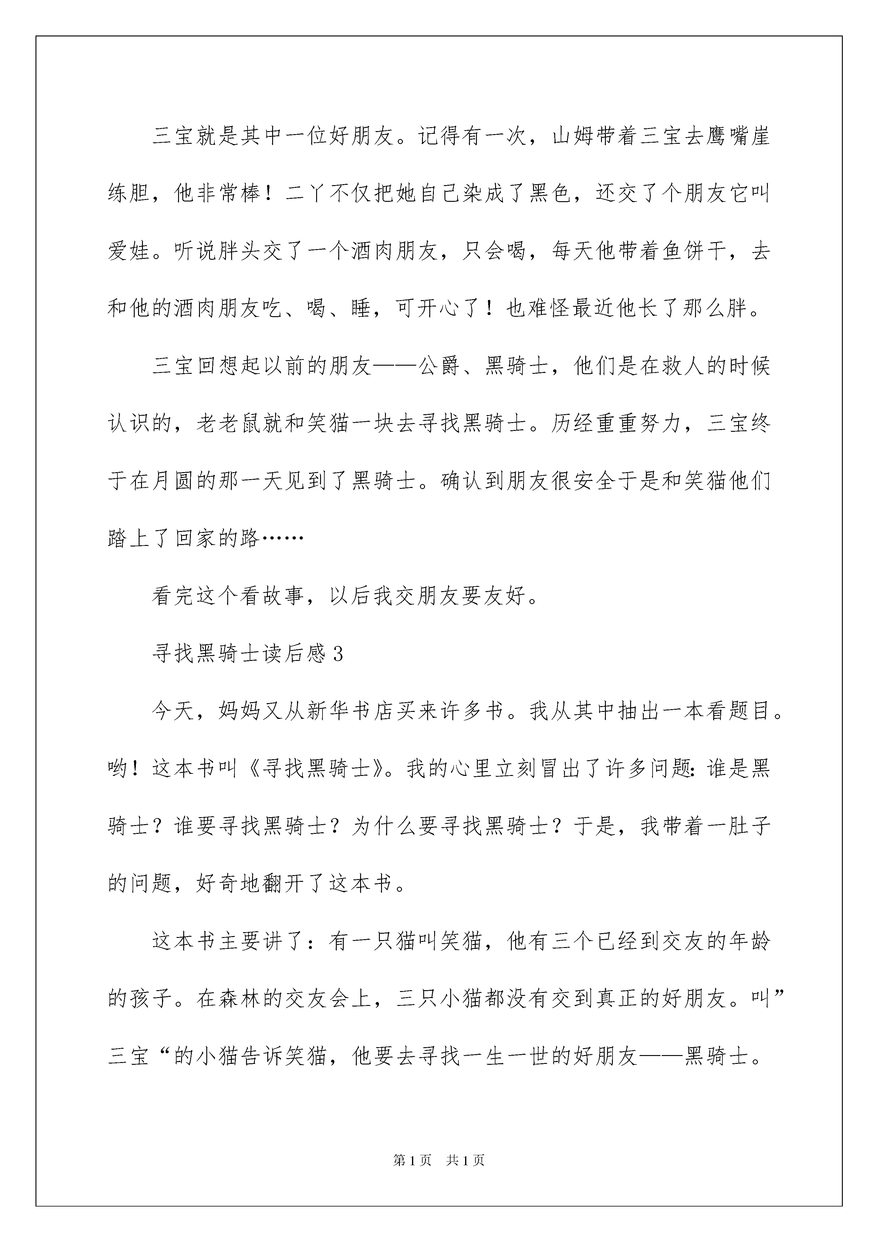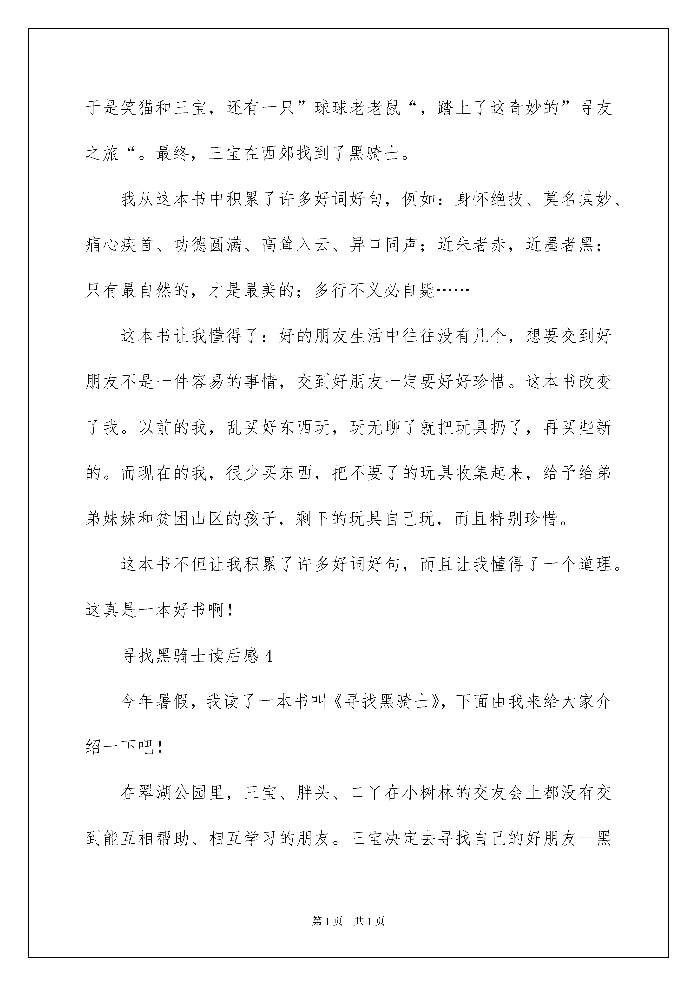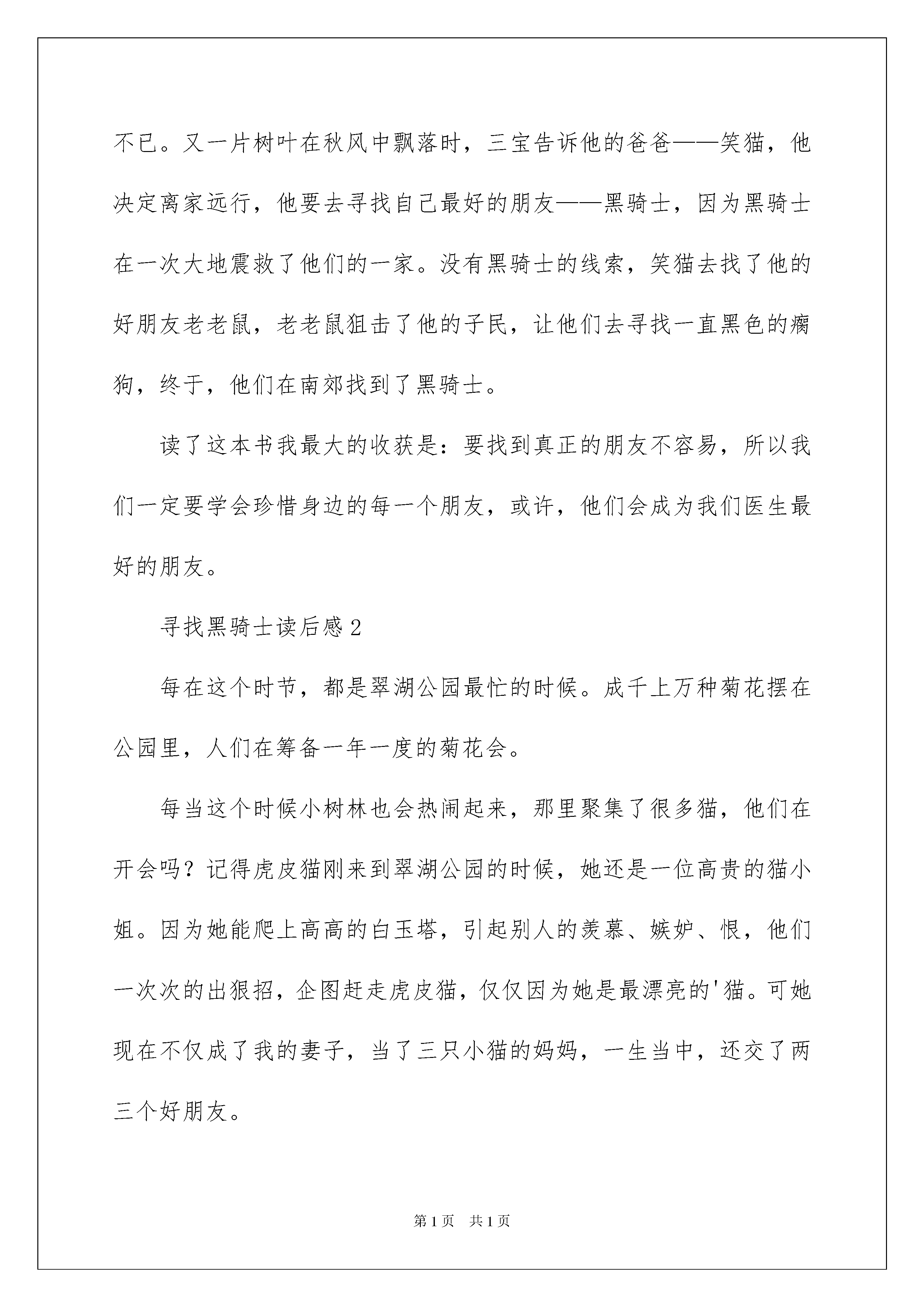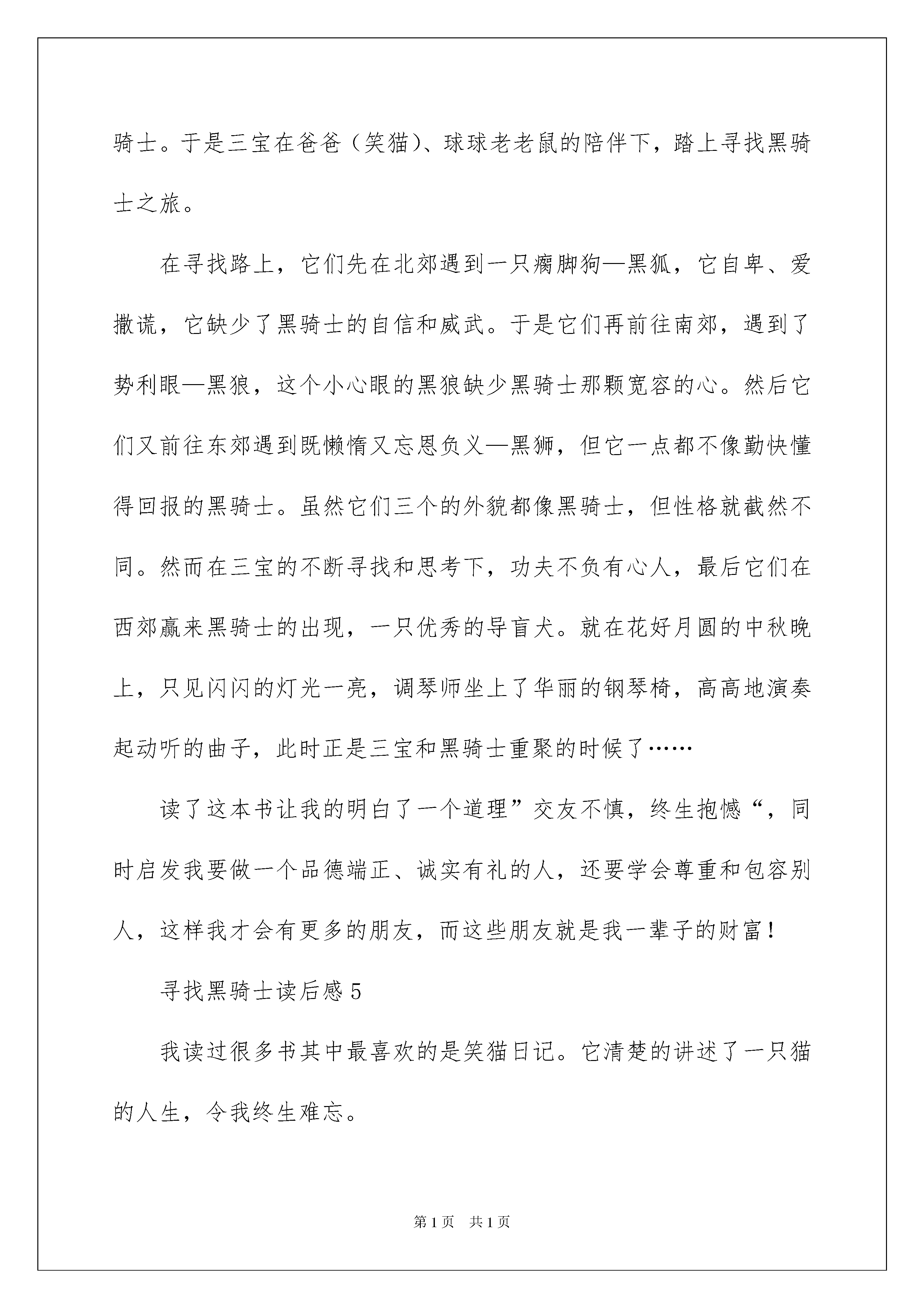 2022寻找黑骑士读后感(通用6篇)寻找黑骑士读后感(通用6篇)品味完一本名著后,相信大家都积累了属于自己的读书感悟,为此需要认真地写一写读后感了。千万不能认为读后感随便应付就可以,以下是我帮大家整理的寻找黑骑士读后感(通用6篇),欢迎大家分享。寻找黑骑士读后感1这本书主要写了:小猫们慢慢长大了,他们到了交朋友的年纪,他们到交友会上交朋友。三宝先交了朋友叫山姆,山姆敢从很高的山上跳下去,三宝和他玩得很快乐,但后来三宝发现他是个不孝顺父母的孩子。二丫交了朋友叫艾娃,艾娃说二丫太老土,一点都不时尚,怎么才叫时尚呢,毛要像她这样黑,说话声要向他,走路姿势也要像她那样,名字还要改成爱丽丝。胖头交了个酒肉朋友,所谓的酒肉朋友就是只有吃喝睡的朋友,胖头和他在一起没几天,胖得都看不清脖子了。后来,胖头、二丫和三宝都没有交到真正的朋友,三只小猫懊恼不已。又一片树叶在秋风中飘落时,三宝告诉他的爸爸——笑猫,他决定离家远行,他要去寻找自己最好的朋友——黑骑士,因为黑骑士在一次大地震救了他们的一家。没有黑骑士的线索,笑猫去找了他的好朋友老老鼠,老老鼠狙击了他的子民,让他们去寻找一直黑色的瘸狗,终于,他们在南郊找到了黑骑士。读了这本书我最大的收获是:要找到真正的朋友不容易,所以我们一定要学会珍惜身边的每一个朋友,或许,他们会成为我们医生最好的朋友。寻找黑骑士读后感2每在这个时节,都是翠湖公园最忙的时候。成千上万种菊花摆在公园里,人们在筹备一年一度的菊花会。每当这个时候小树林也会热闹起来,那里聚集了很多猫,他们在开会吗?记得虎皮猫刚来到翠湖公园的时候,她还是一位高贵的猫小姐。因为她能爬上高高的白玉塔,引起别人的羡慕、嫉妒、恨,他们一次次的出狠招,企图赶走虎皮猫,仅仅因为她是最漂亮的'猫。可她现在不仅成了我的妻子,当了三只小猫的妈妈,一生当中,还交了两三个好朋友。三宝就是其中一位好朋友。记得有一次,山姆带着三宝去鹰嘴崖练胆,他非常棒!二丫不仅把她自己染成了黑色,还交了个朋友它叫爱娃。听说胖头交了一个酒肉朋友,只会喝,每天他带着鱼饼干,去和他的酒肉朋友吃、喝、睡,可开心了!也难怪最近他长了那么胖。三宝回想起以前的朋友——公爵、黑骑士,他们是在救人的时候认识的,老老鼠就和笑猫一块去寻找黑骑士。历经重重努力,三宝终于在月圆的那一天见到了黑骑士。确认到朋友很安全于是和笑猫他们踏上了回家的路……看完这个看故事,以后我交朋友要友好。寻找黑骑士读后感3今天,妈妈又从新华书店买来许多书。我从其中抽出一本看题目。哟!这本书叫《寻找黑骑士》。我的心里立刻冒出了许多问题:谁是黑骑士?谁要寻找黑骑士?为什么要寻找黑骑士?于是,我带着一肚子的问题,好奇地翻开了这本书。这本书主要讲了:有一只猫叫笑猫,他有三个已经到交友的年龄的孩子。在森林的交友会上,三只小猫都没有交到真正的好朋友。叫”三宝“的小猫告诉笑猫,他要去寻找一生一世的好朋友——黑骑士。于是笑猫和三宝,还有一只”球球老老鼠“,踏上了这奇妙的”寻友之旅“。最终,三宝在西郊找到了黑骑士。我从这本书中积累了许多好词好句,例如:身怀绝技、莫名其妙、痛心疾首、功德圆满、高耸入云、异口同声;近朱者赤,近墨者黑;只有最自然的,才是最美的;多行不义必自毙……这本书让我懂得了:好的朋友生活中往往没有几个,想要交到好朋友不是一件容易的事情,交到好朋友一定要好好珍惜。这本书改变了我。以前的我,乱买好东西玩,玩无聊了就把玩具扔了,再买些新的。而现在的我,很少买东西,把不要了的玩具收集起来,给予给弟弟妹妹和贫困山区的孩子,剩下的玩具自己玩,而且特别珍惜。这本书不但让我积累了许多好词好句,而且让我懂得了一个道理。这真是一本好书啊!寻找黑骑士读后感4今年暑假,我读了一本书叫《寻找黑骑士》,下面由我来给大家介绍一下吧!在翠湖公园里,三宝、胖头、二丫在小树林的交友会上都没有交到能互相帮助、相互学习的朋友。三宝决定去寻找自己的好朋友—黑骑士。于是三宝在爸爸(笑猫)、球球老老鼠的陪伴下,踏上寻找黑骑士之旅。在寻找路上,它们先在北郊遇到一只瘸脚狗—黑狐,它自卑、爱撒谎,它缺少了黑骑士的自信和威武。于是它们再前往南郊,遇到了势利眼—黑狼,这个小心眼的黑狼缺少黑骑士那颗宽容的心。然后它们又前往东郊遇到既懒惰又忘恩负义—黑狮,但它一点都不像勤快懂得回报的黑骑士。虽然它们三个的外貌都像黑骑士,但性格就截然不同。然而在三宝的不断寻找和思考下,功夫不负有心人,最后它们在西郊赢来黑骑士的出现,一只优秀的导盲犬。就在花好月圆的中秋晚上,只见闪闪的灯光一亮,调琴师坐上了华丽的钢琴椅,高高地演奏起动听的曲子,此时正是三宝和黑骑士