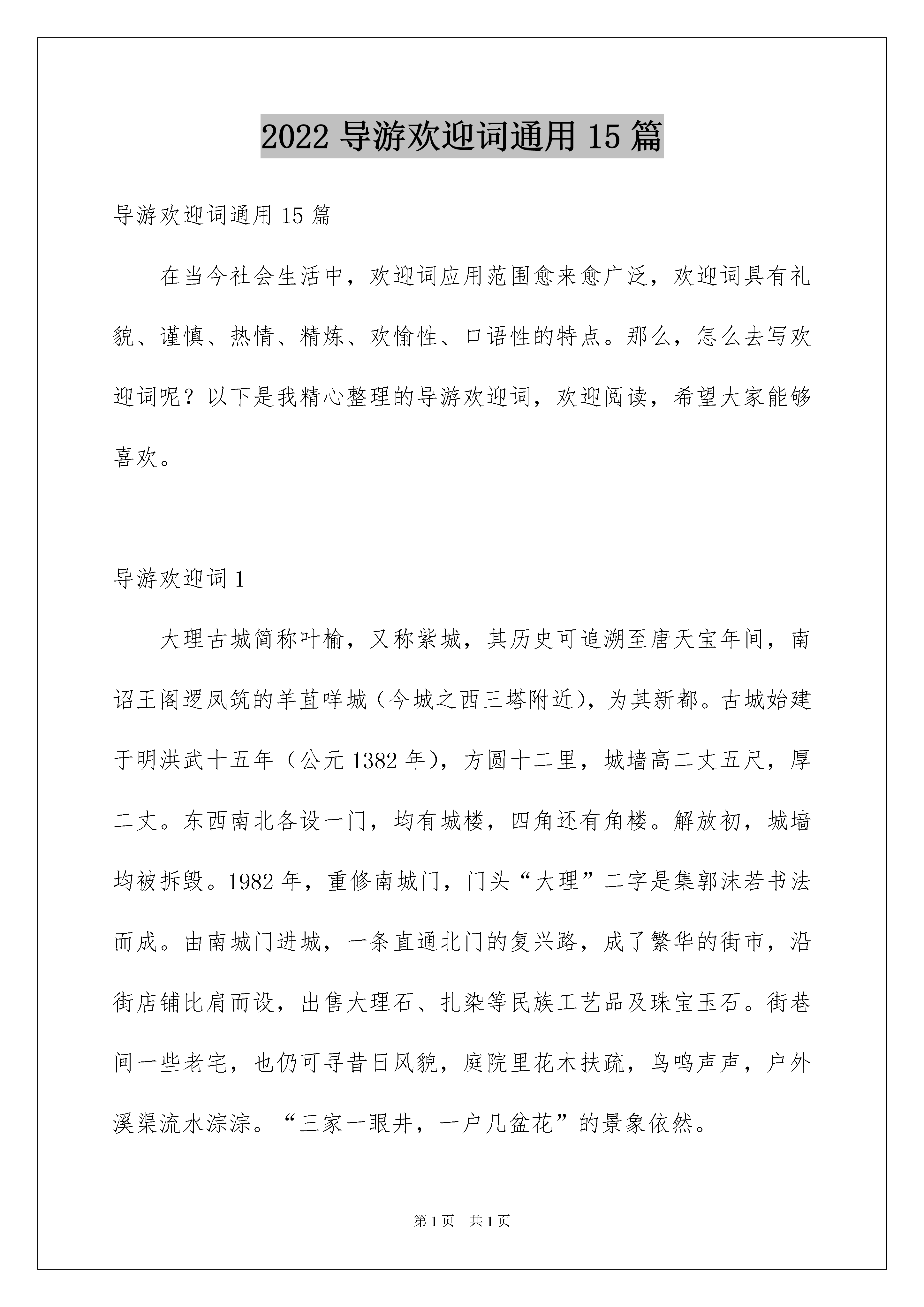 2022导游欢迎词通用15篇导游欢迎词通用15篇在当今社会生活中,欢迎词应用范围愈来愈广泛,欢迎词具有礼貌、谨慎、热情、精炼、欢愉性、口语性的特点。那么,怎么去写欢迎词呢?以下是我精心整理的导游欢迎词,欢迎阅读,希望大家能够喜欢。导游欢迎词1大理古城简称叶榆,又称紫城,其历史可追溯至唐天宝年间,南诏王阁逻凤筑的羊苴咩城(今城之西三塔附近),为其新都。古城始建于明洪武十五年(公元1382年),方圆十二里,城墙高二丈五尺,厚二丈。东西南北各设一门,均有城楼,四角还有角楼。解放初,城墙均被拆毁。1982年,重修南城门,门头“大理”二字是集郭沫若书法而成。由南城门进城,一条直通北门的复兴路,成了繁华的街市,沿街店铺比肩而设,出售大理石、扎染等民族工艺品及珠宝玉石。街巷间一些老宅,也仍可寻昔日风貌,庭院里花木扶疏,鸟鸣声声,户外溪渠流水淙淙。“三家一眼井,一户几盆花”的景象依然。古城内东西走向的护国路,被称为“洋人街”。这里一家接一家的中西餐馆、咖啡馆、茶馆及工艺品商店,招牌、广告多用洋文书写,吸引着金发碧眼的“老外”,在这里流连忘返,寻找东方古韵,渐成一道别致的风景。古城的历史可追溯至唐天宝年间,南诏王阁逻凤筑的羊苴咩城(今城之西三塔附近),为其新都。古城始建于明洪武十五年(公元1382年),方圆十二里。1982年2月8日,国务院公布大理古城为中国首批24个历史文化名城之一。大理古城的城门云南省首批重点文物保护的“世祖皇帝平云南碑”,就耸立在三月街街场上。在古城西北1公里处,就是被国务院列为全国第一批重点文物保护单位的大理三塔,与古城西南角的弘圣寺一塔遥遥相对,为古城增添了一层灿烂的色彩。大理古城的城区道路仍保持着明、清以来的棋盘式方格网结构,素有九街十八巷之称。南北对峙的两座城楼被修复一新。洋人街城内由南到北,一条大街横贯其中,深街幽巷,由西到东纵横交错,全城清一色的清瓦屋面,鹅卵石堆砌的墙壁,显示着古城的古朴、别致、优雅。从苍山俯看大理古城,文献楼、南城门楼、五华楼,北城门楼一字排开,巍峨雄壮,使古城透出一种诱人气韵。街道两旁,白族民居古香古色。大理古城鸟瞰图古城第一门——文献楼。位于大理古城南门外1公里的文献楼,素有古城第一门之称,是大理古城的标志性建筑。始建于清康熙年间。楼额悬挂云南提督偏图于康熙四十年(公元1701年)所题的“文献名邦”匾额,故名文献楼。文献楼横跨在南面进入大理古城通道上,道路两旁柳树成荫,拂面依依,颇有诗情画意,是官府迎送达官贵人的门户。文献楼为两层歇山式土木石结构的镝楼,具有典型的白族建筑特色,它矗立在砖石结构门洞上面,雄伟壮丽。洋人街——护国路。古城内东西走向的护国路,被称为“洋人街”。这里一家接一家的中西餐馆、咖啡馆、茶馆及工艺品商店,招牌、广告多用洋文书写,吸着金发碧眼的“老外”,在这里流连踯躅,寻找东方古韵,渐成一道别致的风景。大理古城古南诏的“天下第一楼”——五华楼。五华楼是古代南诏王的国宾馆,又叫五花楼。从南诏开始,五华楼多次烧毁,又多次得到重建,也越建越小。五华楼一带,已经形成一定规模的书画市场,经营品种包括书法,国画类的山水花鸟、人物等等,还有皮画、油画等交易十分活跃。大理古城堂。大理古城堂位于大理古城复兴路和平路交叉处,始建于1904年6月,当时称“中华礼拜堂”。1956年,更名为“大理合一会”。1980年,又更名为“大理古城会”。20xx年再次更名为“大理古城堂”。20xx年被列为市级文物保护单位。教堂主体结构为土木结构、四撇水瓦屋顶,保持着西欧教堂的风格,又具有浓郁的白族建筑特色,是一座中西结合式教堂。导游欢迎词2各位团友:大家早上好!(一般出远门都在早上)很高兴能跟大家一起参加神州旅行社组织的春游活动。首先请允许我做一下自我介绍:我叫汪峰,是神州旅行社的一名专职导游员,大家可以叫我汪导或是小汪。我谨代表公司及我个人对大家的到来表示最热烈的欢迎。(男导拱手,女导鞠躬)这位是我们的驾驶员汪师傅。汪师傅具有多年的驾龄,技术娴熟,行车稳妥,我们坐他的车既安全又舒适。在接下来的几天里,小汪将和大家吃住在一起,如果您在旅途中有什么意见和要求,尽管向我提出,在小汪力所能及的范围内,合理而可能的情况下,会尽量满足大家的要求的。中国有句老话说的好:“有缘千里来相会,无缘对面不相识”。今天,我们由不同的地方走到同一个目的地,乘坐在同一辆车里,大家由不相识到相见、相知,正是应了上面那句老话。这真是一种很奇妙而又美好的缘分,那么就让我们将这个美好的缘分进行到底,让我们开心而行,满意而归。迎着灿烂的朝阳,沐浴着清爽的晨风,我们的旅程开始了!各位朋友平时