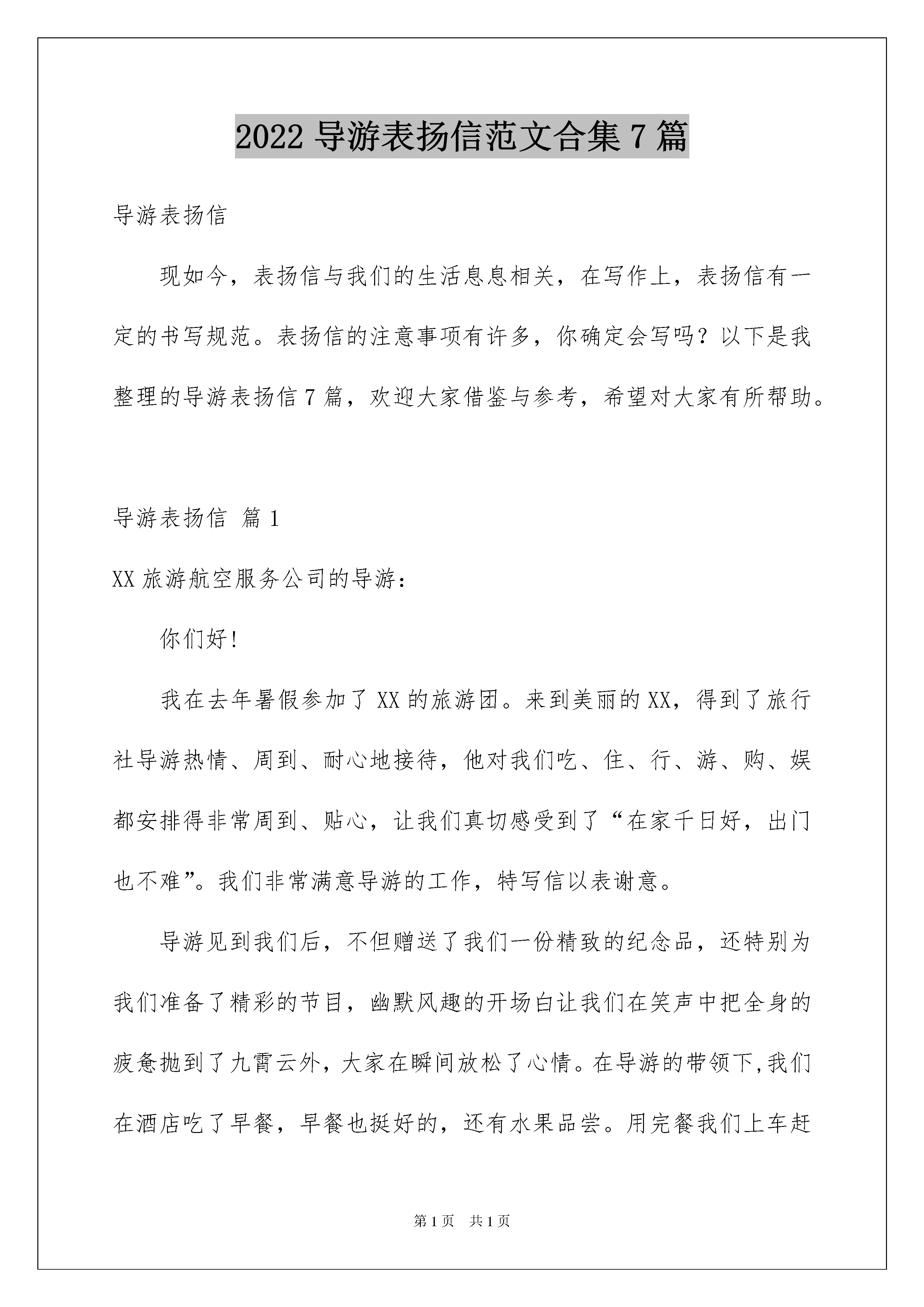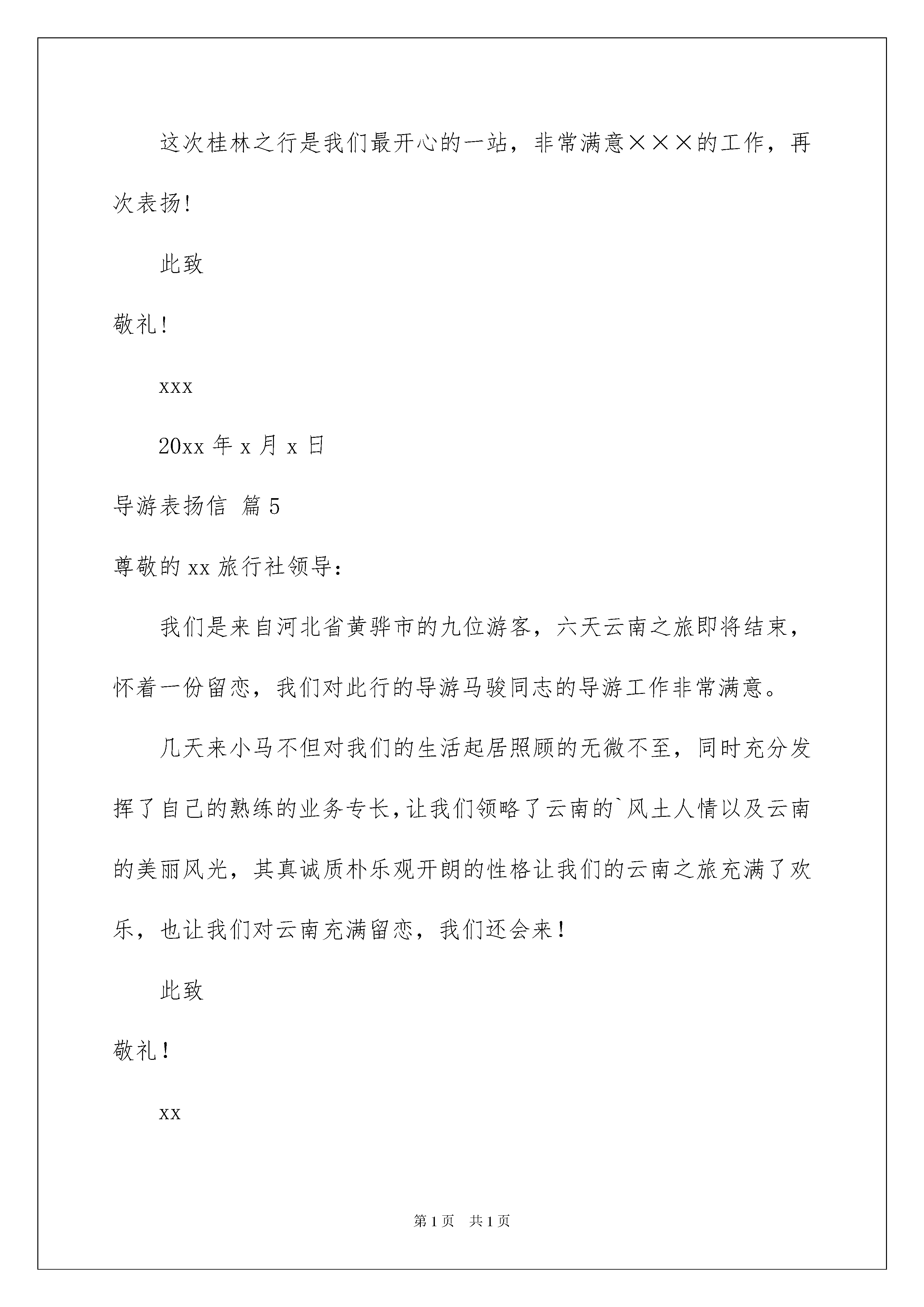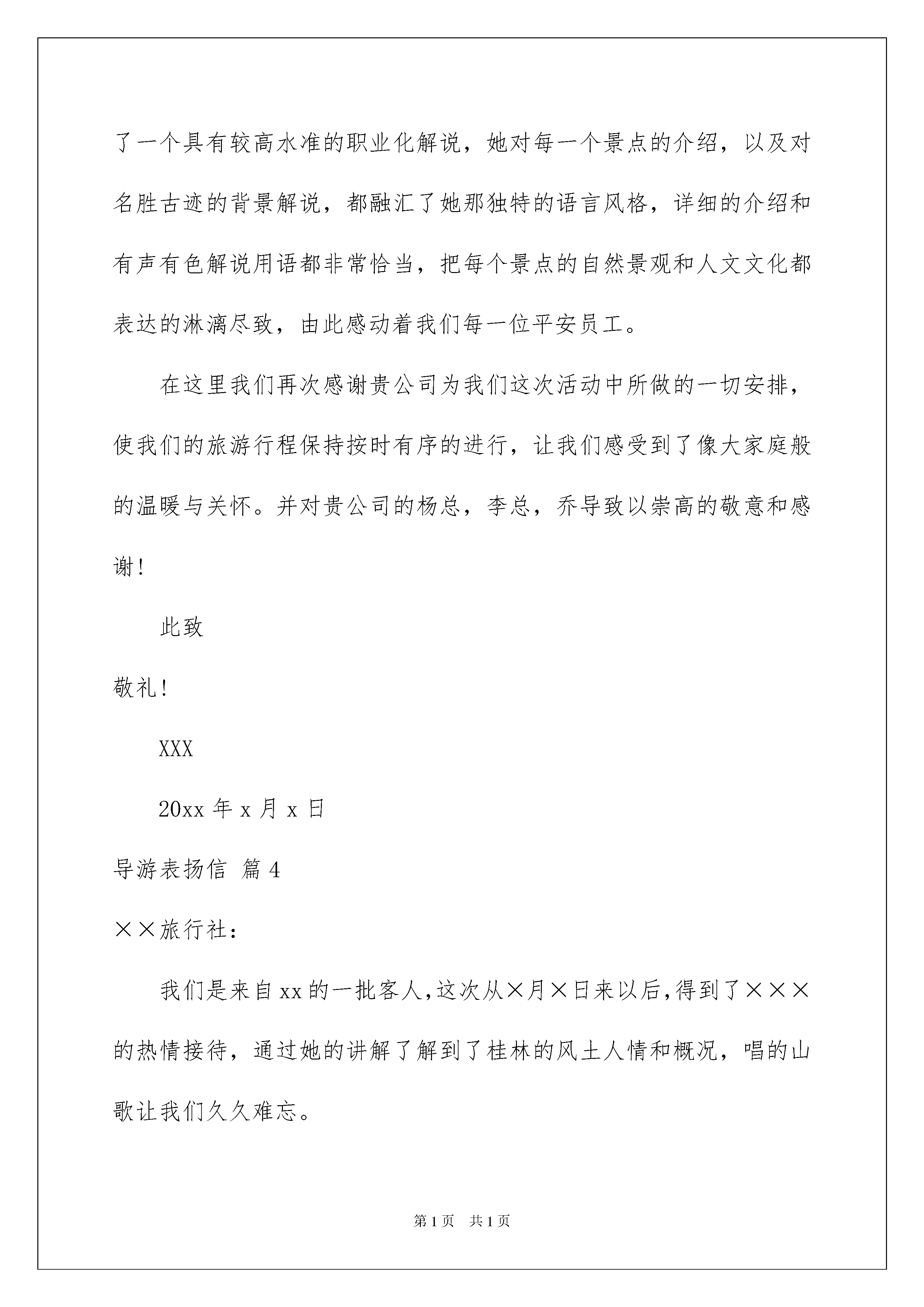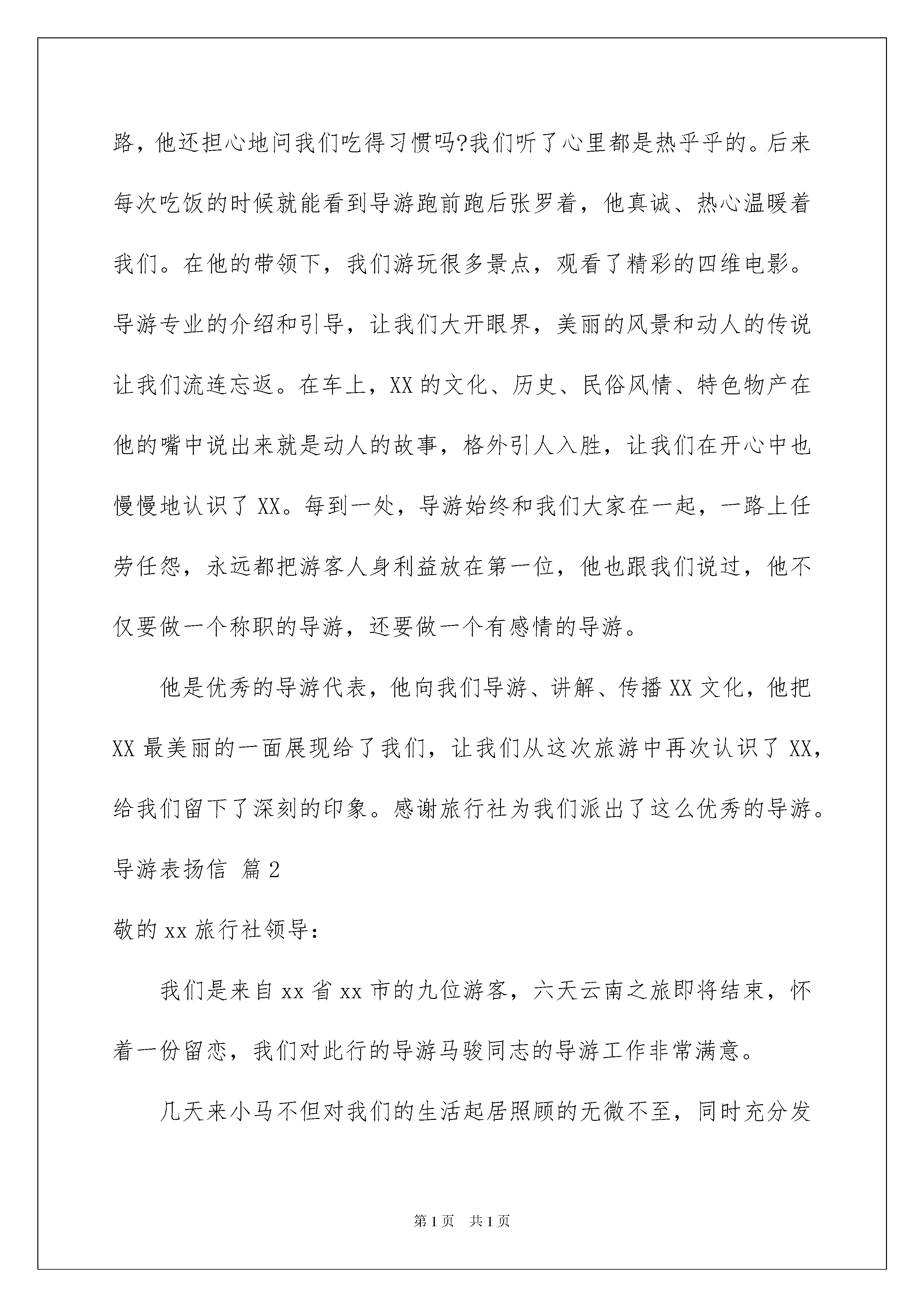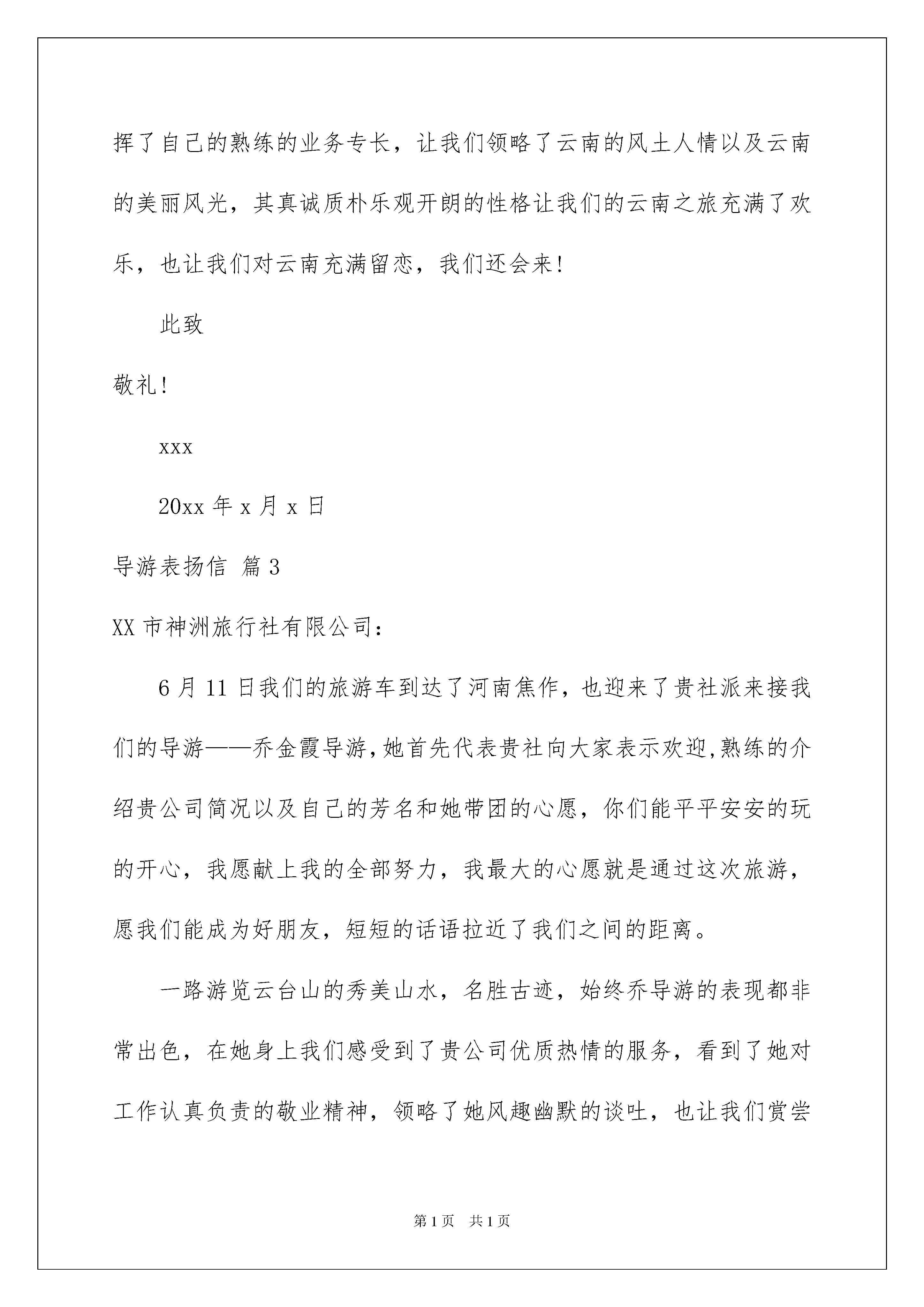 2022导游表扬信范文合集7篇导游表扬信现如今,表扬信与我们的生活息息相关,在写作上,表扬信有一定的书写规范。表扬信的注意事项有许多,你确定会写吗?以下是我整理的导游表扬信7篇,欢迎大家借鉴与参考,希望对大家有所帮助。导游表扬信篇1XX旅游航空服务公司的导游:你们好!我在去年暑假参加了XX的旅游团。来到美丽的XX,得到了旅行社导游热情、周到、耐心地接待,他对我们吃、住、行、游、购、娱都安排得非常周到、贴心,让我们真切感受到了“在家千日好,出门也不难”。我们非常满意导游的工作,特写信以表谢意。导游见到我们后,不但赠送了我们一份精致的纪念品,还特别为我们准备了精彩的节目,幽默风趣的开场白让我们在笑声中把全身的疲惫抛到了九霄云外,大家在瞬间放松了心情。在导游的带领下,我们在酒店吃了早餐,早餐也挺好的,还有水果品尝。用完餐我们上车赶路,他还担心地问我们吃得习惯吗?我们听了心里都是热乎乎的。后来每次吃饭的时候就能看到导游跑前跑后张罗着,他真诚、热心温暖着我们。在他的带领下,我们游玩很多景点,观看了精彩的四维电影。导游专业的介绍和引导,让我们大开眼界,美丽的风景和动人的传说让我们流连忘返。在车上,XX的文化、历史、民俗风情、特色物产在他的嘴中说出来就是动人的故事,格外引人入胜,让我们在开心中也慢慢地认识了XX。每到一处,导游始终和我们大家在一起,一路上任劳任怨,永远都把游客人身利益放在第一位,他也跟我们说过,他不仅要做一个称职的导游,还要做一个有感情的导游。他是优秀的导游代表,他向我们导游、讲解、传播XX文化,他把XX最美丽的一面展现给了我们,让我们从这次旅游中再次认识了XX,给我们留下了深刻的印象。感谢旅行社为我们派出了这么优秀的导游。导游表扬信篇2敬的xx旅行社领导:我们是来自xx省xx市的九位游客,六天云南之旅即将结束,怀着一份留恋,我们对此行的导游马骏同志的导游工作非常满意。几天来小马不但对我们的生活起居照顾的无微不至,同时充分发挥了自己的熟练的业务专长,让我们领略了云南的风土人情以及云南的美丽风光,其真诚质朴乐观开朗的性格让我们的云南之旅充满了欢乐,也让我们对云南充满留恋,我们还会来!此致敬礼!xxx20xx年x月x日导游表扬信篇3XX市神洲旅行社有限公司:6月11日我们的旅游车到达了河南焦作,也迎来了贵社派来接我们的导游——乔金霞导游,她首先代表贵社向大家表示欢迎,熟练的介绍贵公司简况以及自己的芳名和她带团的心愿,你们能平平安安的玩的开心,我愿献上我的全部努力,我最大的心愿就是通过这次旅游,愿我们能成为好朋友,短短的话语拉近了我们之间的距离。一路游览云台山的秀美山水,名胜古迹,始终乔导游的表现都非常出色,在她身上我们感受到了贵公司优质热情的服务,看到了她对工作认真负责的敬业精神,领略了她风趣幽默的谈吐,也让我们赏尝了一个具有较高水准的职业化解说,她对每一个景点的介绍,以及对名胜古迹的背景解说,都融汇了她那独特的语言风格,详细的介绍和有声有色解说用语都非常恰当,把每个景点的自然景观和人文文化都表达的淋漓尽致,由此感动着我们每一位平安员工。在这里我们再次感谢贵公司为我们这次活动中所做的一切安排,使我们的旅游行程保持按时有序的进行,让我们感受到了像大家庭般的温暖与关怀。并对贵公司的杨总,李总,乔导致以崇高的敬意和感谢!此致敬礼!XXX20xx年x月x日导游表扬信篇4××旅行社:我们是来自xx的一批客人,这次从×月×日来以后,得到了×××的热情接待,通过她的讲解了解到了桂林的风土人情和概况,唱的山歌让我们久久难忘。这次桂林之行是我们最开心的一站,非常满意×××的工作,再次表扬!此致敬礼!xxx20xx年x月x日导游表扬信篇5尊敬的xx旅行社领导:我们是来自河北省黄骅市的九位游客,六天云南之旅即将结束,怀着一份留恋,我们对此行的导游马骏同志的导游工作非常满意。几天来小马不但对我们的生活起居照顾的无微不至,同时充分发挥了自己的熟练的业务专长,让我们领略了云南的`风土人情以及云南的美丽风光,其真诚质朴乐观开朗的性格让我们的云南之旅充满了欢乐,也让我们对云南充满留恋,我们还会来!此致敬礼!xx20xx年x月x日导游表扬信篇6凯撒旅游公司领导:您好!我们一家三口利用孩子假期参加凯撒旅游历时十一天的欧洲之旅即将结束,我们受益匪浅,玩得开心。这十一天来,虽在异国它乡,但也有在家的感觉,这得感谢我们的领队尚越,是他的悉心照顾,比如:就餐、住宿都尽量安排我们一家就近,各个环节都考虑的非常周到。特别是尚导细致入微的讲解让我们对欧洲的风土人情及历史有了更进一步的了解。尚导能做到对团员有问必答而且不厌其