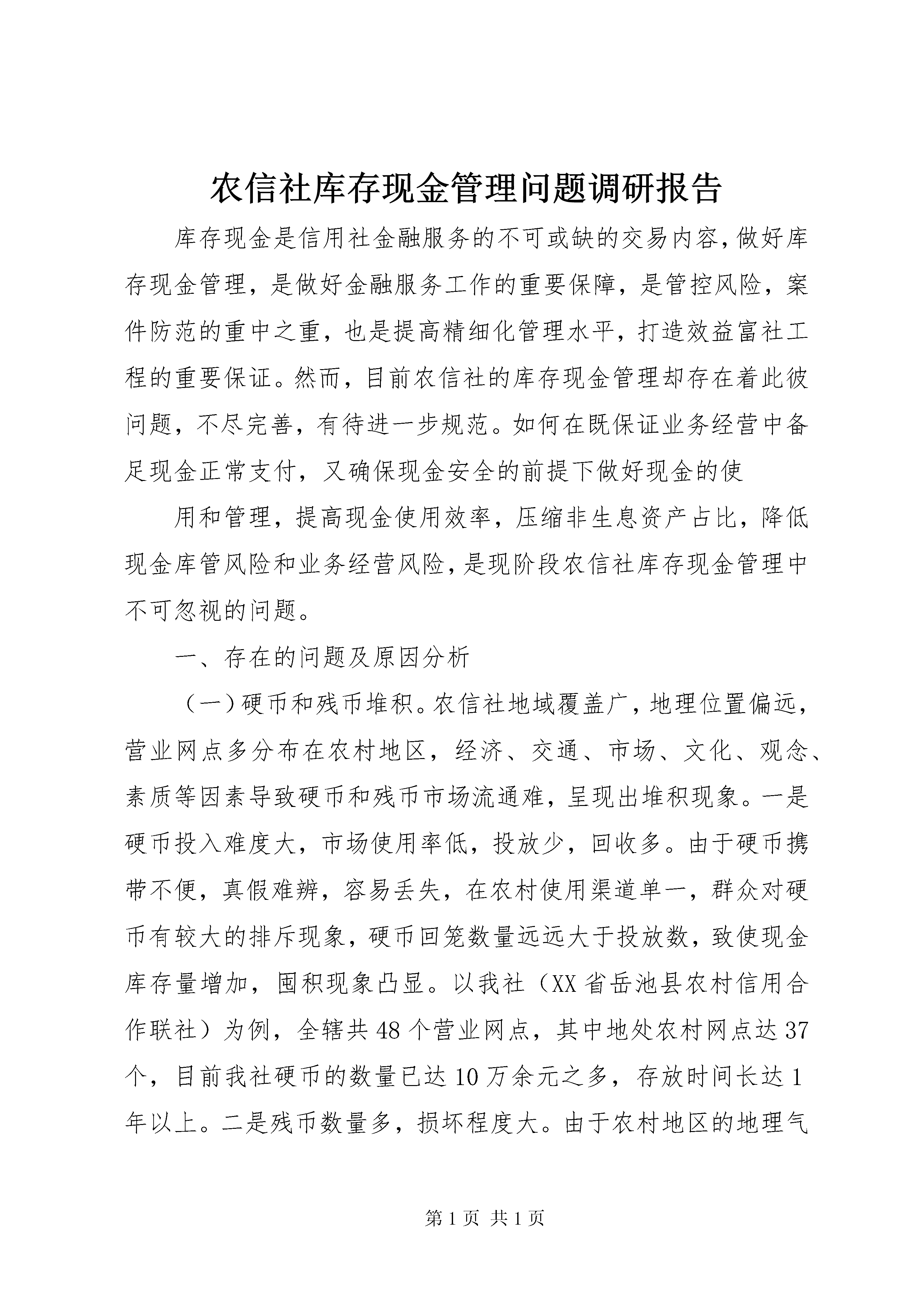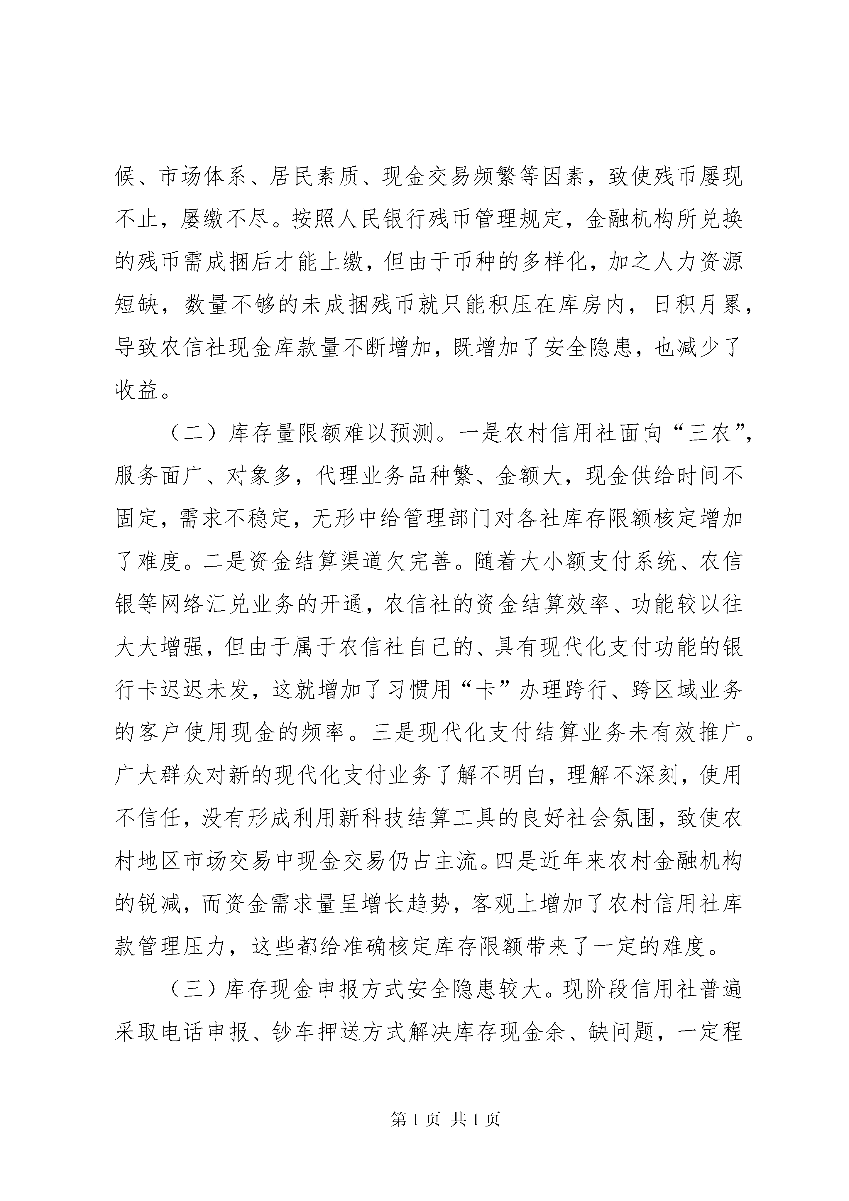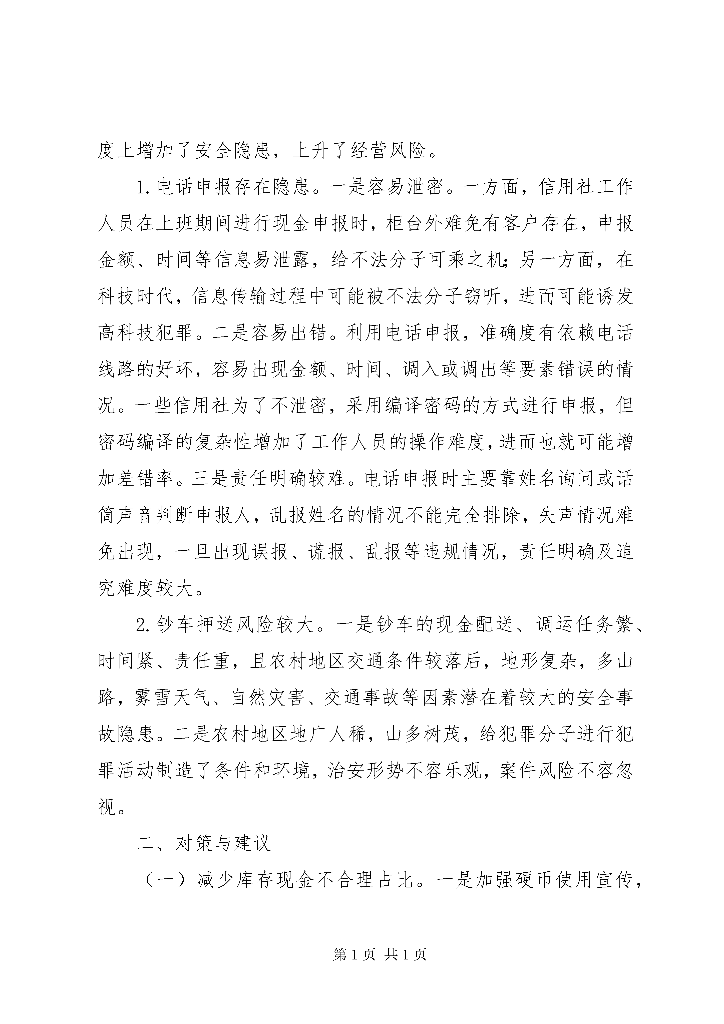 农信社库存现金管理问题调研报告库存现金是信用社金融服务的不可或缺的交易内容,做好库存现金管理,是做好金融服务工作的重要保障,是管控风险,案件防范的重中之重,也是提高精细化管理水平,打造效益富社工程的重要保证。然而,目前农信社的库存现金管理却存在着此彼问题,不尽完善,有待进一步规范。如何在既保证业务经营中备足现金正常支付,又确保现金安全的前提下做好现金的使用和管理,提高现金使用效率,压缩非生息资产占比,降低现金库管风险和业务经营风险,是现阶段农信社库存现金管理中不可忽视的问题。一、存在的问题及原因分析(一)硬币和残币堆积。农信社地域覆盖广,地理位置偏远,营业网点多分布在农村地区,经济、交通、市场、文化、观念、素质等因素导致硬币和残币市场流通难,呈现出堆积现象。一是硬币投入难度大,市场使用率低,投放少,回收多。由于硬币携带不便,真假难辨,容易丢失,在农村使用渠道单一,群众对硬币有较大的排斥现象,硬币回笼数量远远大于投放数,致使现金库存量增加,囤积现象凸显。以我社(XX省岳池县农村信用合作联社)为例,全辖共48个营业网点,其中地处农村网点达37个,目前我社硬币的数量已达10万余元之多,存放时间长达1年以上。二是残币数量多,损坏程度大。由于农村地区的地理气候、市场体系、居民素质、现金交易频繁等因素,致使残币屡现不止,屡缴不尽。按照人民银行残币管理规定,金融机构所兑换的残币需成捆后才能上缴,但由于币种的多样化,加之人力资源短缺,数量不够的未成捆残币就只能积压在库房内,日积月累,导致农信社现金库款量不断增加,既增加了安全隐患,也减少了收益。(二)库存量限额难以预测。一是农村信用社面向“三农”,服务面广、对象多,代理业务品种繁、金额大,现金供给时间不固定,需求不稳定,无形中给管理部门对各社库存限额核定增加了难度。二是资金结算渠道欠完善。随着大小额支付系统、农信银等网络汇兑业务的开通,农信社的资金结算效率、功能较以往大大增强,但由于属于农信社自己的、具有现代化支付功能的银行卡迟迟未发,这就增加了习惯用“卡”办理跨行、跨区域业务的客户使用现金的频率。三是现代化支付结算业务未有效推广。广大群众对新的现代化支付业务了解不明白,理解不深刻,使用不信任,没有形成利用新科技结算工具的良好社会氛围,致使农村地区市场交易中现金交易仍占主流。四是近年来农村金融机构的锐减,而资金需求量呈增长趋势,客观上增加了农村信用社库款管理压力,这些都给准确核定库存限额带来了一定的难度。(三)库存现金申报方式安全隐患较大。现阶段信用社普遍采取电话申报、钞车押送方式解决库存现金余、缺问题,一定程度上增加了安全隐患,上升了经营风险。1.电话申报存在隐患。一是容易泄密。一方面,信用社工作人员在上班期间进行现金申报时,柜台外难免有客户存在,申报金额、时间等信息易泄露,给不法分子可乘之机;另一方面,在科技时代,信息传输过程中可能被不法分子窃听,进而可能诱发高科技犯罪。二是容易出错。利用电话申报,准确度有依赖电话线路的好坏,容易出现金额、时间、调入或调出等要素错误的情况。一些信用社为了不泄密,采用编译密码的方式进行申报,但密码编译的复杂性增加了工作人员的操作难度,进而也就可能增加差错率。三是责任明确较难。电话申报时主要靠姓名询问或话筒声音判断申报人,乱报姓名的情况不能完全排除,失声情况难免出现,一旦出现误报、谎报、乱报等违规情况,责任明确及追究难度较大。2.钞车押送风险较大。一是钞车的现金配送、调运任务繁、时间紧、责任重,且农村地区交通条件较落后,地形复杂,多山路,雾雪天气、自然灾害、交通事故等因素潜在着较大的安全事故隐患。二是农村地区地广人稀,山多树茂,给犯罪分子进行犯罪活动制造了条件和环境,治安形势不容乐观,案件风险不容忽视。二、对策与建议(一)减少库存现金不合理占比。一是加强硬币使用宣传,发挥社会各界联动作用,提高广大群众对硬币的认知度和信任度,形成“硬币纸币都一样,同样都是人民币”的观念认识,积极为硬币流通创造良好的市场环境和社会氛围,实现农村地区纸币单一流通进一步向纸、硬币混合流通转变。二是加强硬币调剂管理,根据库款的票面结构,及时向人民银行反映征求支持,帮助把硬币向经济发达地区、大都市进行输送流通。三是加强残币的整点和回笼工作,对成捆的残币及时上缴,确保准确性和时效性;对未成捆的进行规范化清理和搁置,提高库款管理水平,优化库款现金结构。(二)按季核定库存限额。农业生产季节性较强,使信用社的现金收支状况呈现出规律性特征,如春耕时节现金投放多,回笼少;秋收时分现金回笼多,投放少。为减少不生息资金的占比,根据现金收支的规律性特征,分析撑握规律,科学统筹,合理规划,改变信用社库