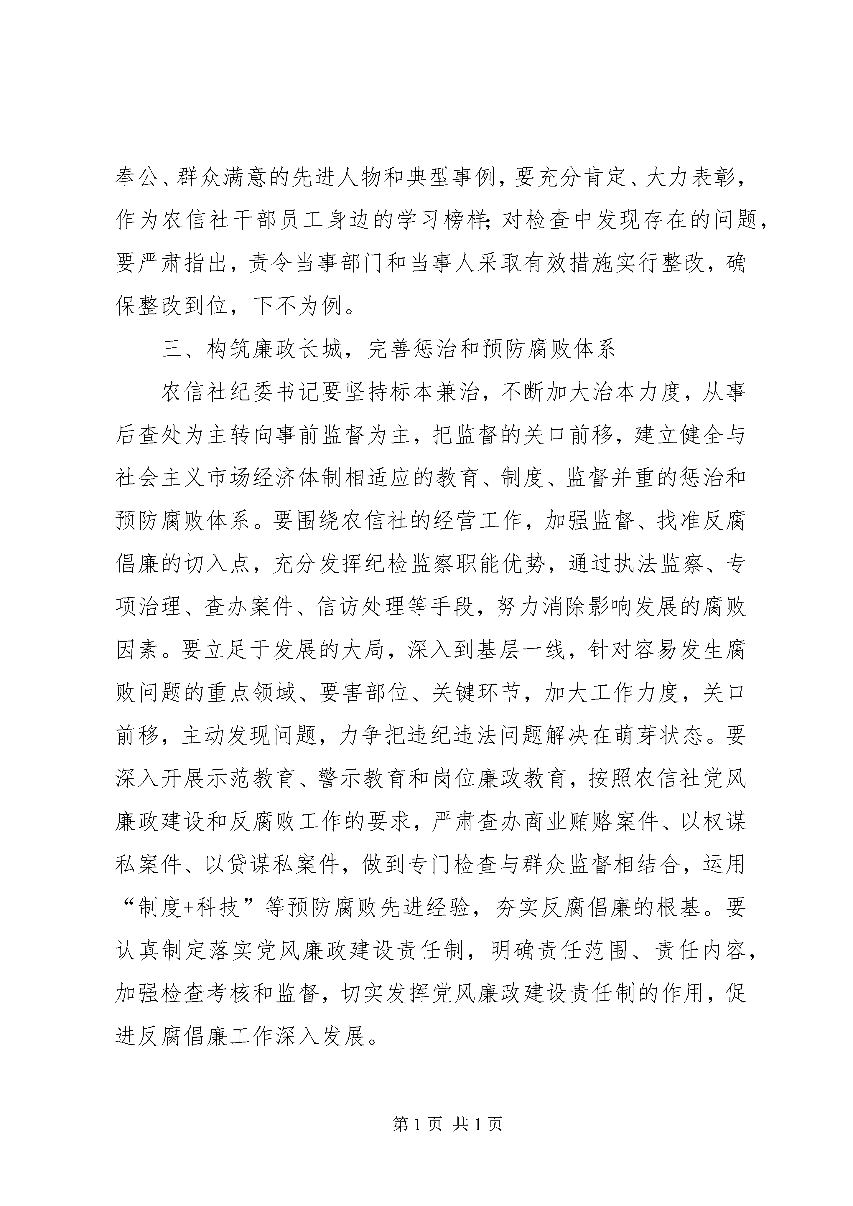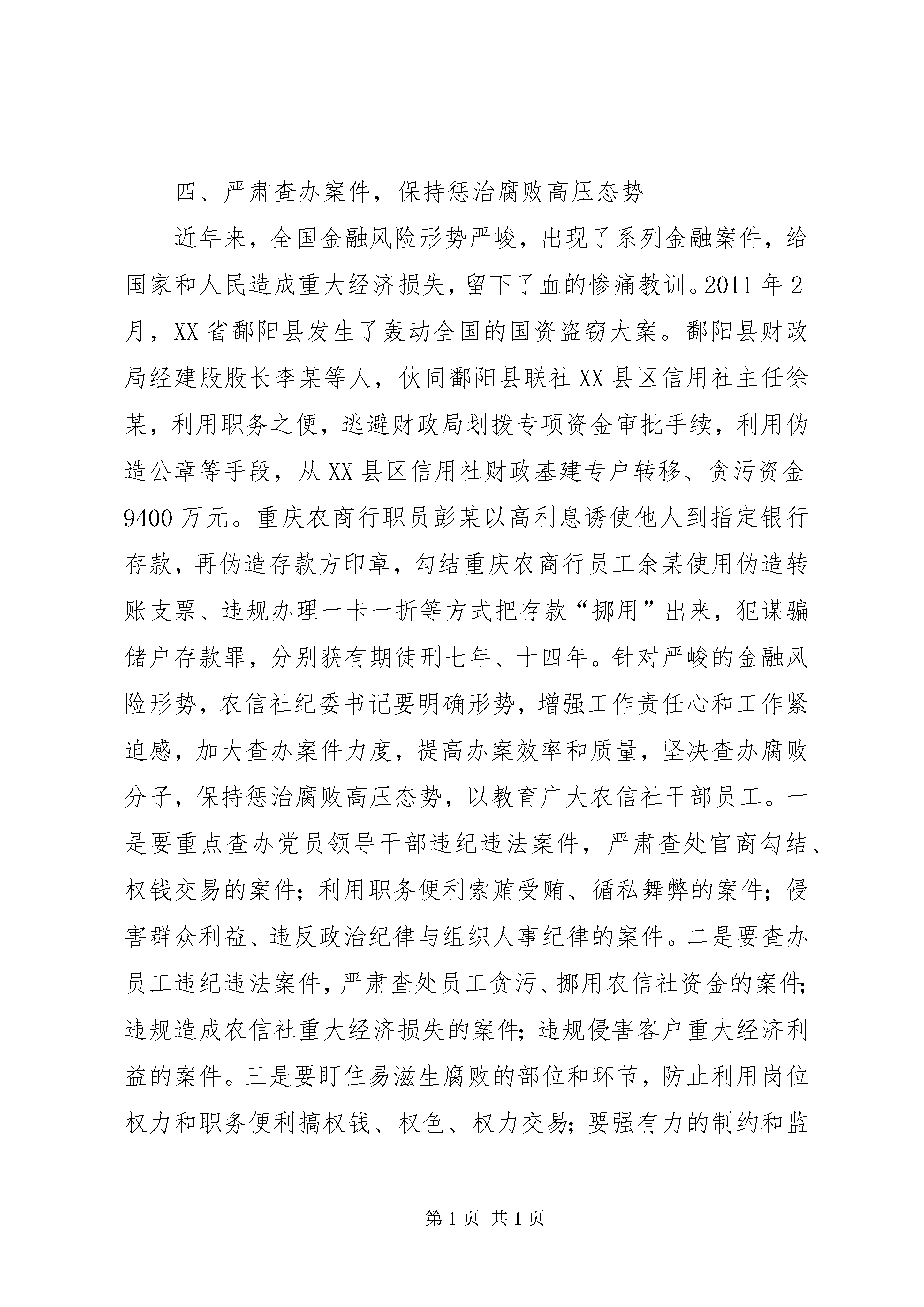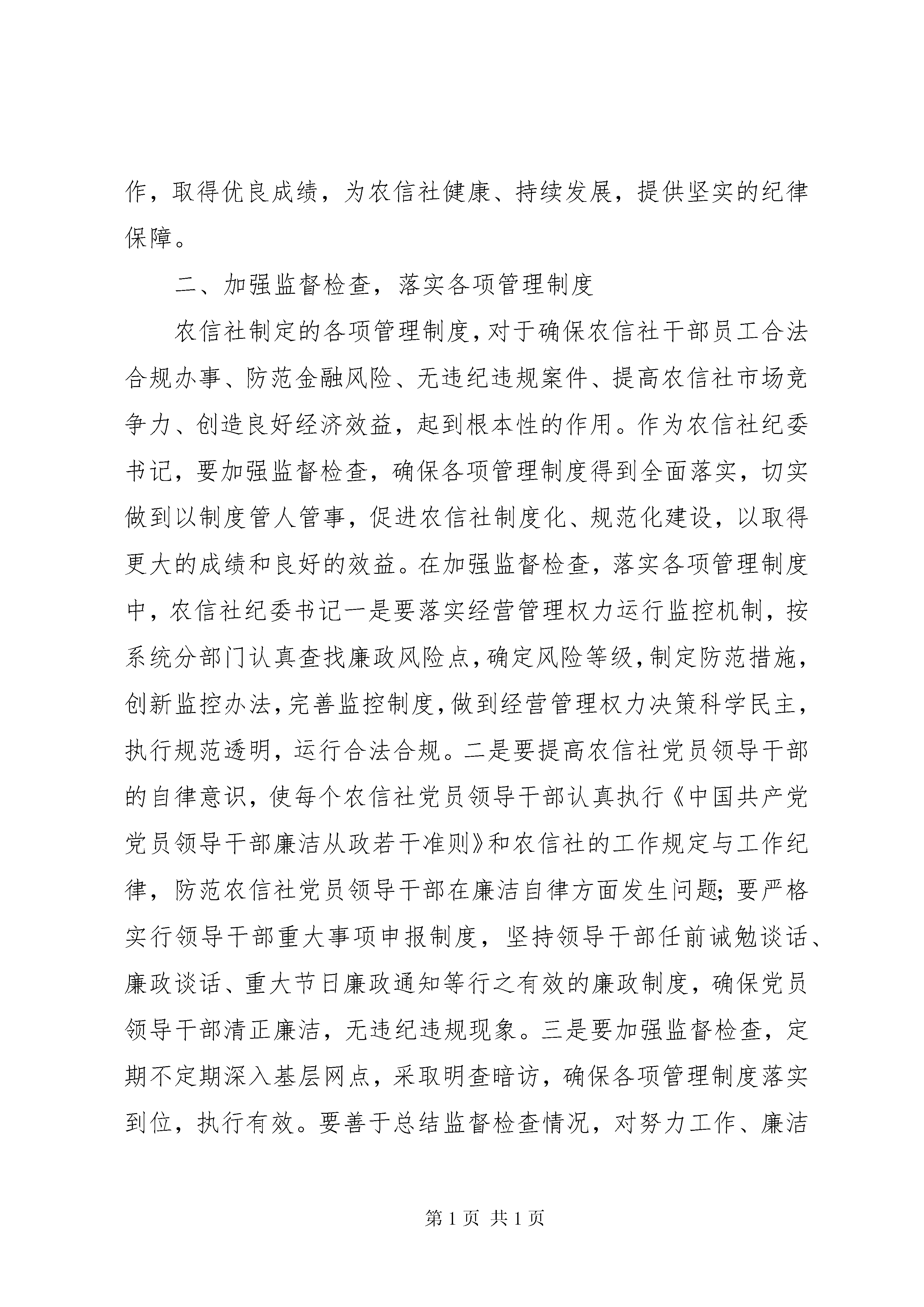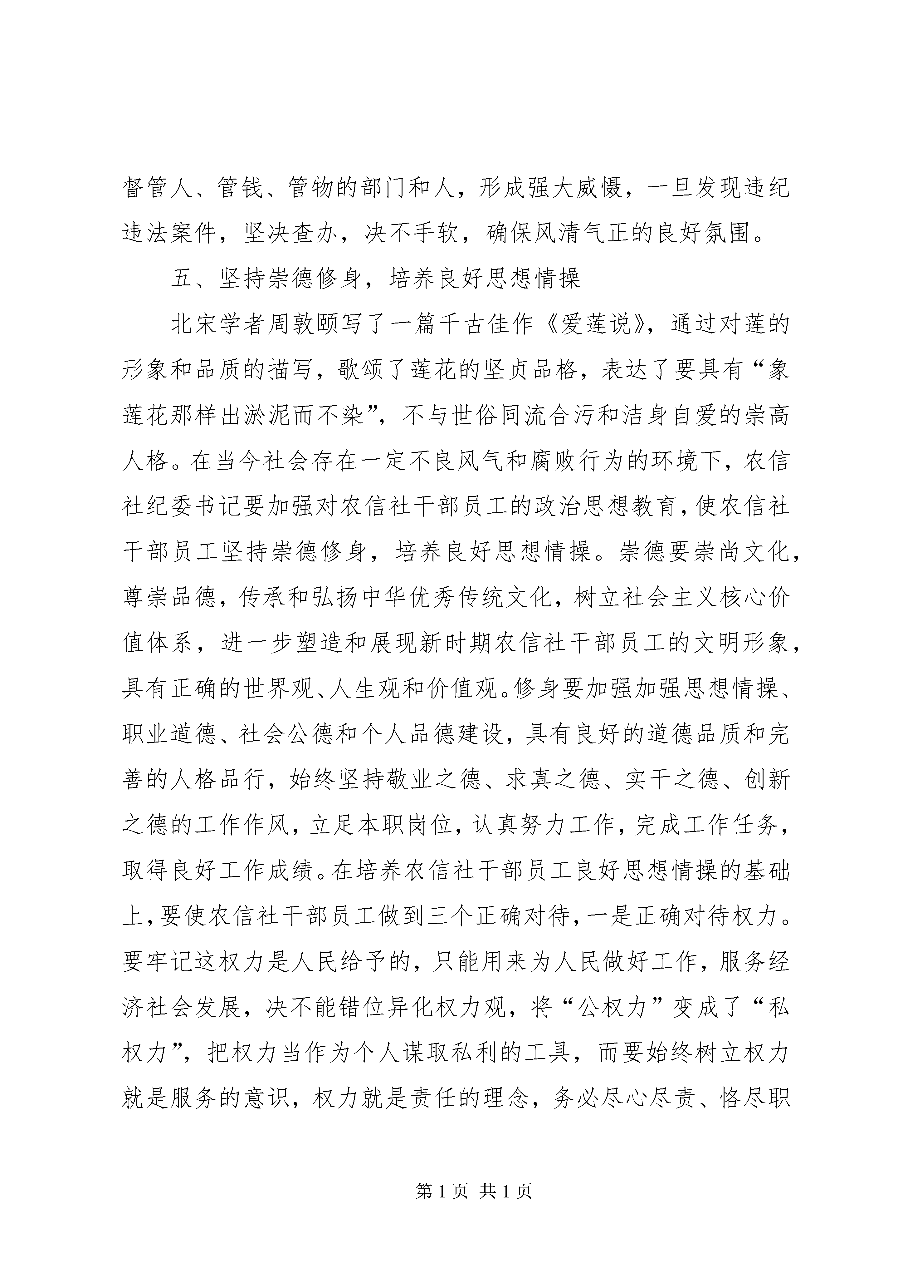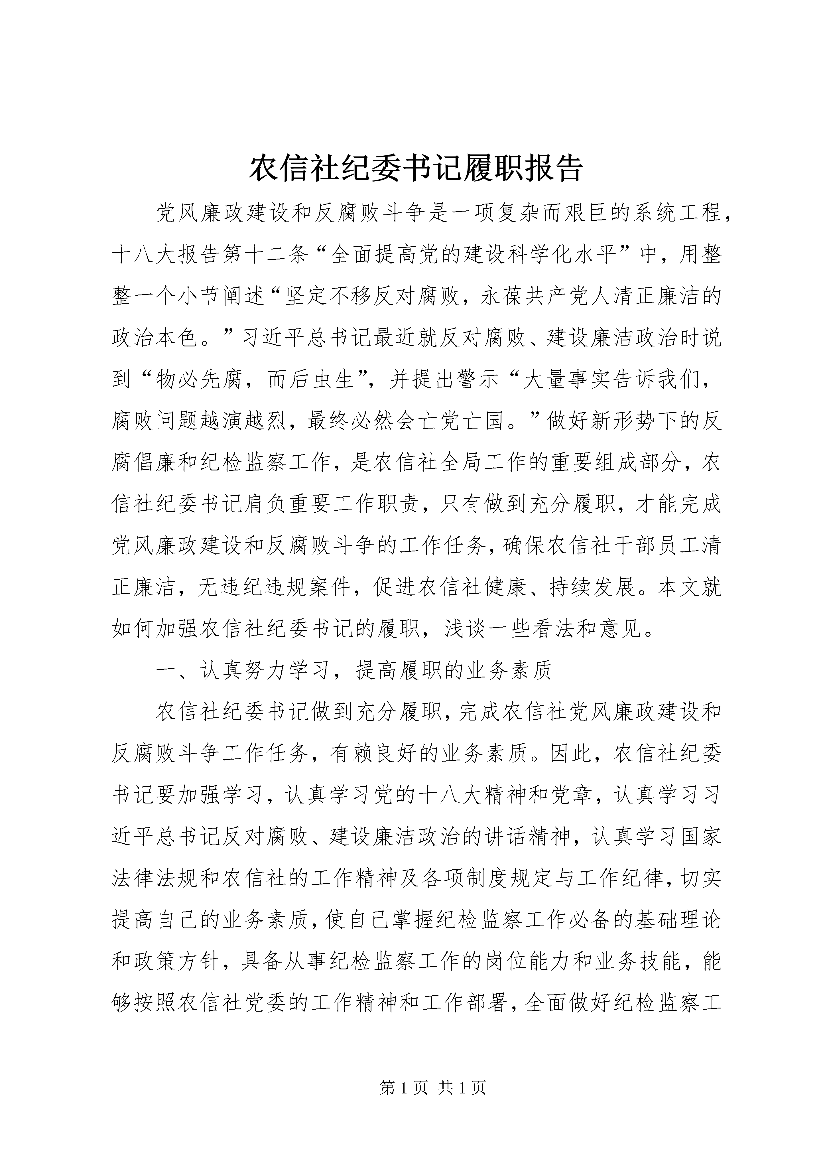 农信社纪委书记履职报告党风廉政建设和反腐败斗争是一项复杂而艰巨的系统工程,十八大报告第十二条“全面提高党的建设科学化水平”中,用整整一个小节阐述“坚定不移反对腐败,永葆共产党人清正廉洁的政治本色。”习近平总书记最近就反对腐败、建设廉洁政治时说到“物必先腐,而后虫生”,并提出警示“大量事实告诉我们,腐败问题越演越烈,最终必然会亡党亡国。”做好新形势下的反腐倡廉和纪检监察工作,是农信社全局工作的重要组成部分,农信社纪委书记肩负重要工作职责,只有做到充分履职,才能完成党风廉政建设和反腐败斗争的工作任务,确保农信社干部员工清正廉洁,无违纪违规案件,促进农信社健康、持续发展。本文就如何加强农信社纪委书记的履职,浅谈一些看法和意见。一、认真努力学习,提高履职的业务素质农信社纪委书记做到充分履职,完成农信社党风廉政建设和反腐败斗争工作任务,有赖良好的业务素质。因此,农信社纪委书记要加强学习,认真学习党的十八大精神和党章,认真学习习近平总书记反对腐败、建设廉洁政治的讲话精神,认真学习国家法律法规和农信社的工作精神及各项制度规定与工作纪律,切实提高自己的业务素质,使自己掌握纪检监察工作必备的基础理论和政策方针,具备从事纪检监察工作的岗位能力和业务技能,能够按照农信社党委的工作精神和工作部署,全面做好纪检监察工作,取得优良成绩,为农信社健康、持续发展,提供坚实的纪律保障。二、加强监督检查,落实各项管理制度农信社制定的各项管理制度,对于确保农信社干部员工合法合规办事、防范金融风险、无违纪违规案件、提高农信社市场竞争力、创造良好经济效益,起到根本性的作用。作为农信社纪委书记,要加强监督检查,确保各项管理制度得到全面落实,切实做到以制度管人管事,促进农信社制度化、规范化建设,以取得更大的成绩和良好的效益。在加强监督检查,落实各项管理制度中,农信社纪委书记一是要落实经营管理权力运行监控机制,按系统分部门认真查找廉政风险点,确定风险等级,制定防范措施,创新监控办法,完善监控制度,做到经营管理权力决策科学民主,执行规范透明,运行合法合规。二是要提高农信社党员领导干部的自律意识,使每个农信社党员领导干部认真执行《中国共产党党员领导干部廉洁从政若干准则》和农信社的工作规定与工作纪律,防范农信社党员领导干部在廉洁自律方面发生问题;要严格实行领导干部重大事项申报制度,坚持领导干部任前诫勉谈话、廉政谈话、重大节日廉政通知等行之有效的廉政制度,确保党员领导干部清正廉洁,无违纪违规现象。三是要加强监督检查,定期不定期深入基层网点,采取明查暗访,确保各项管理制度落实到位,执行有效。要善于总结监督检查情况,对努力工作、廉洁奉公、群众满意的先进人物和典型事例,要充分肯定、大力表彰,作为农信社干部员工身边的学习榜样;对检查中发现存在的问题,要严肃指出,责令当事部门和当事人采取有效措施实行整改,确保整改到位,下不为例。三、构筑廉政长城,完善惩治和预防腐败体系农信社纪委书记要坚持标本兼治,不断加大治本力度,从事后查处为主转向事前监督为主,把监督的关口前移,建立健全与社会主义市场经济体制相适应的教育、制度、监督并重的惩治和预防腐败体系。要围绕农信社的经营工作,加强监督、找准反腐倡廉的切入点,充分发挥纪检监察职能优势,通过执法监察、专项治理、查办案件、信访处理等手段,努力消除影响发展的腐败因素。要立足于发展的大局,深入到基层一线,针对容易发生腐败问题的重点领域、要害部位、关键环节,加大工作力度,关口前移,主动发现问题,力争把违纪违法问题解决在萌芽状态。要深入开展示范教育、警示教育和岗位廉政教育,按照农信社党风廉政建设和反腐败工作的要求,严肃查办商业贿赂案件、以权谋私案件、以贷谋私案件,做到专门检查与群众监督相结合,运用“制度+科技”等预防腐败先进经验,夯实反腐倡廉的根基。要认真制定落实党风廉政建设责任制,明确责任范围、责任内容,加强检查考核和监督,切实发挥党风廉政建设责任制的作用,促进反腐倡廉工作深入发展。四、严肃查办案件,保持惩治腐败高压态势近年来,全国金融风险形势严峻,出现了系列金融案件,给国家和人民造成重大经济损失,留下了血的惨痛教训。2011年2月,XX省鄱阳县发生了轰动全国的国资盗窃大案。鄱阳县财政局经建股股长李某等人,伙同鄱阳县联社XX县区信用社主任徐某,利用职务之便,逃避财政局划拨专项资金审批手续,利用伪造公章等手段,从XX县区信用社财政基建专户转移、贪污资金9400万元。重庆农商行职员彭某以高利息诱使他人到指定银行存款,再伪造存款方印章,勾结重庆农商行员工余某使用伪造转账支票、违规办理一卡一折等方式把存款“挪用”出来,犯谋骗储户存款罪,分别获有期徒刑七年、十四年。针对严峻的金融风险形势,农信社纪委书记要明确形势,增强工作责任心和工作紧迫感,加大查