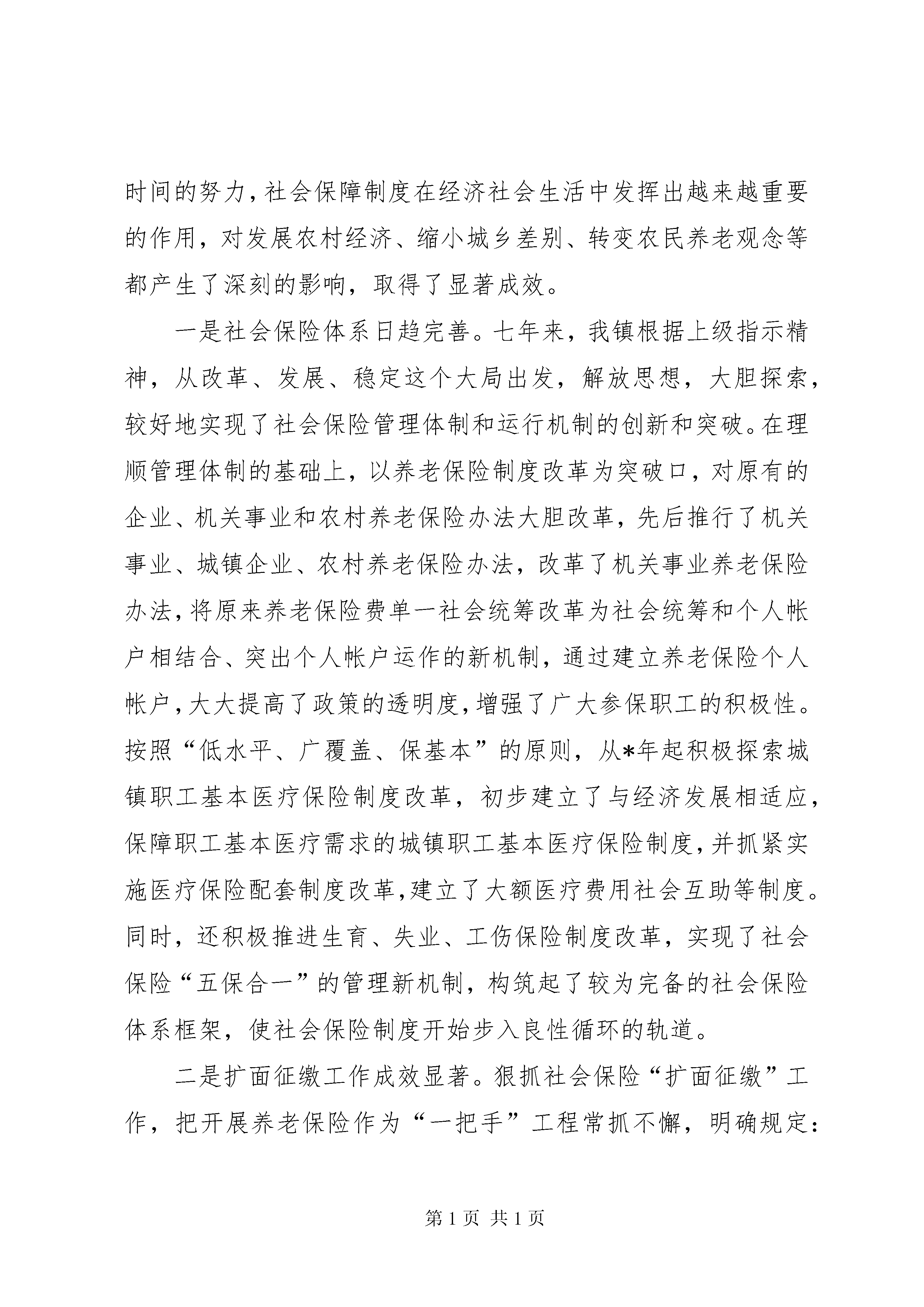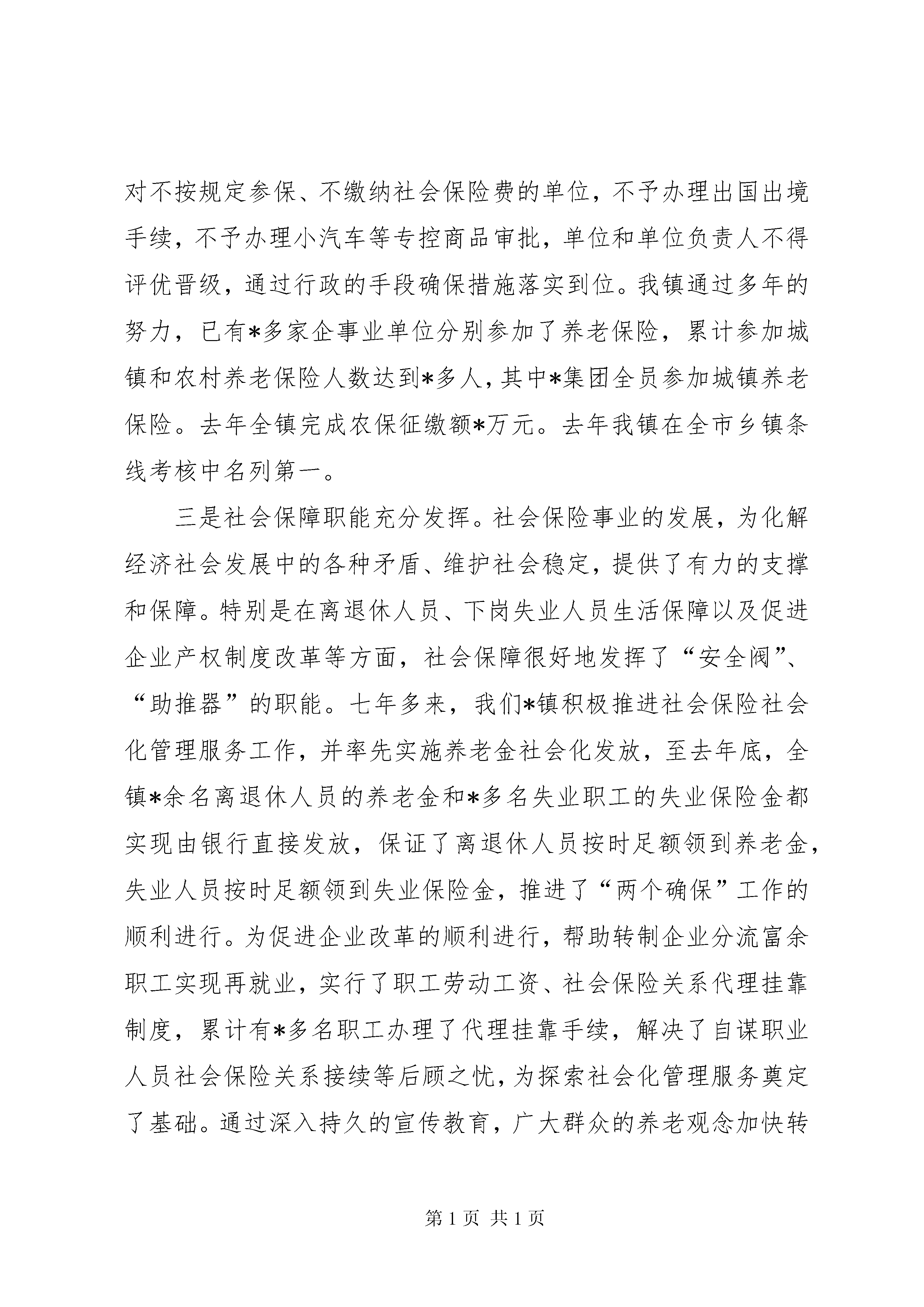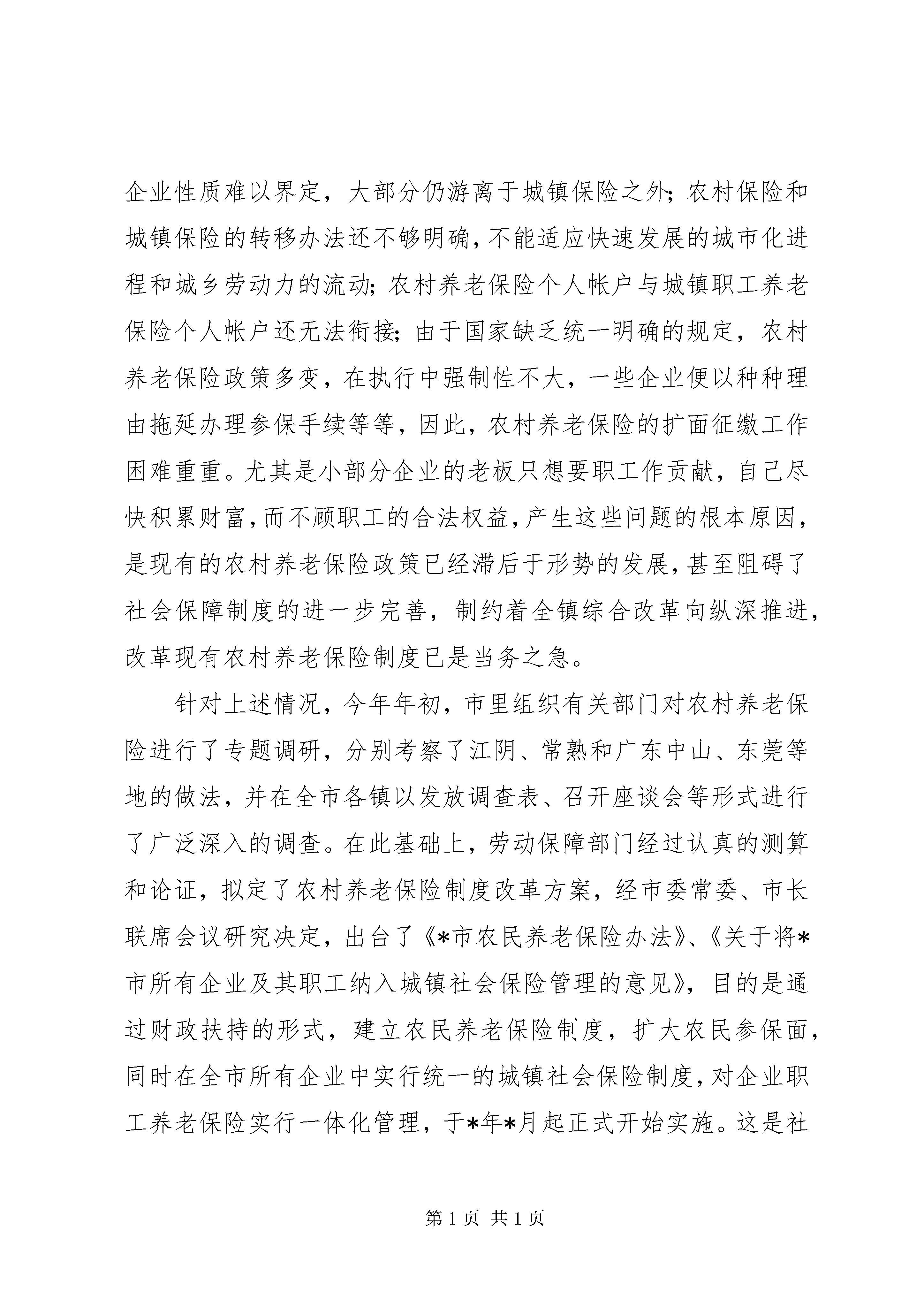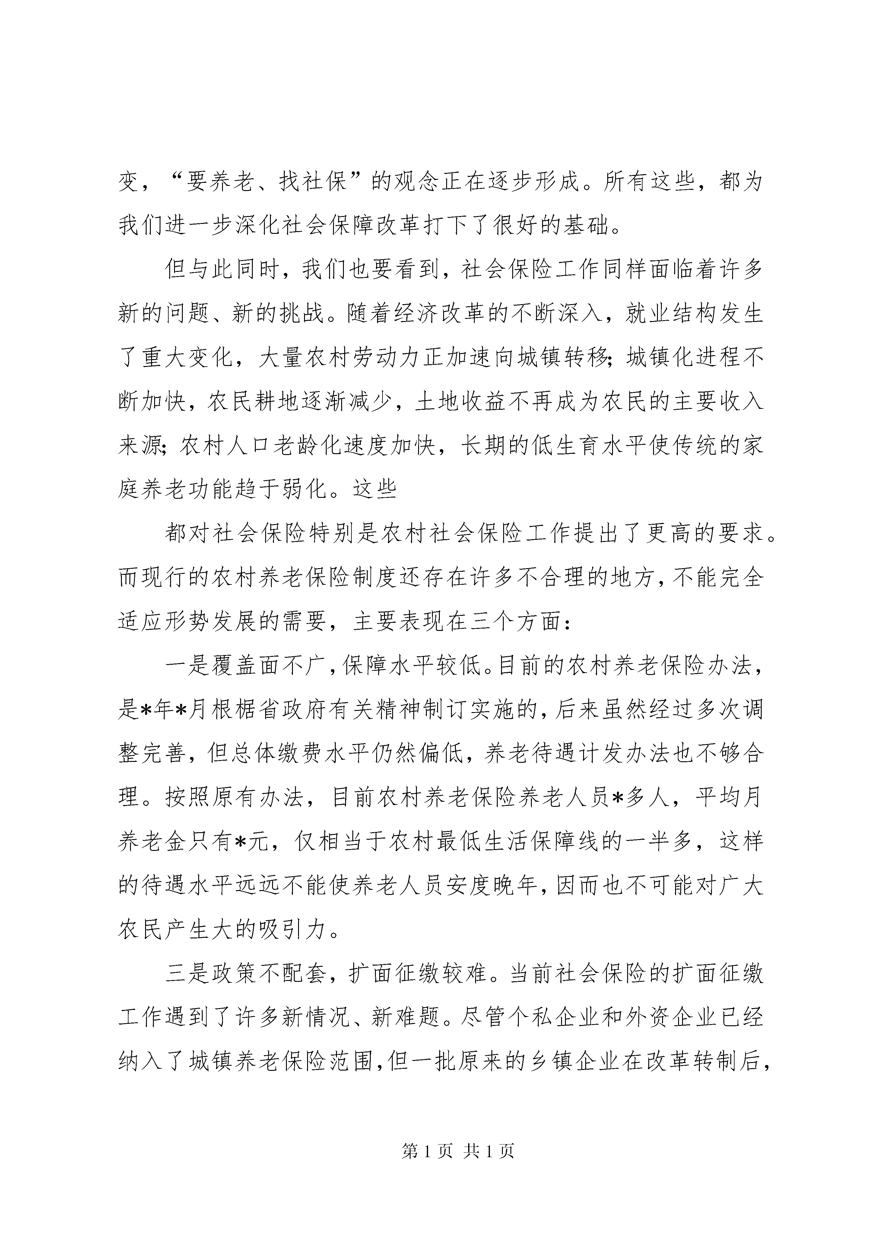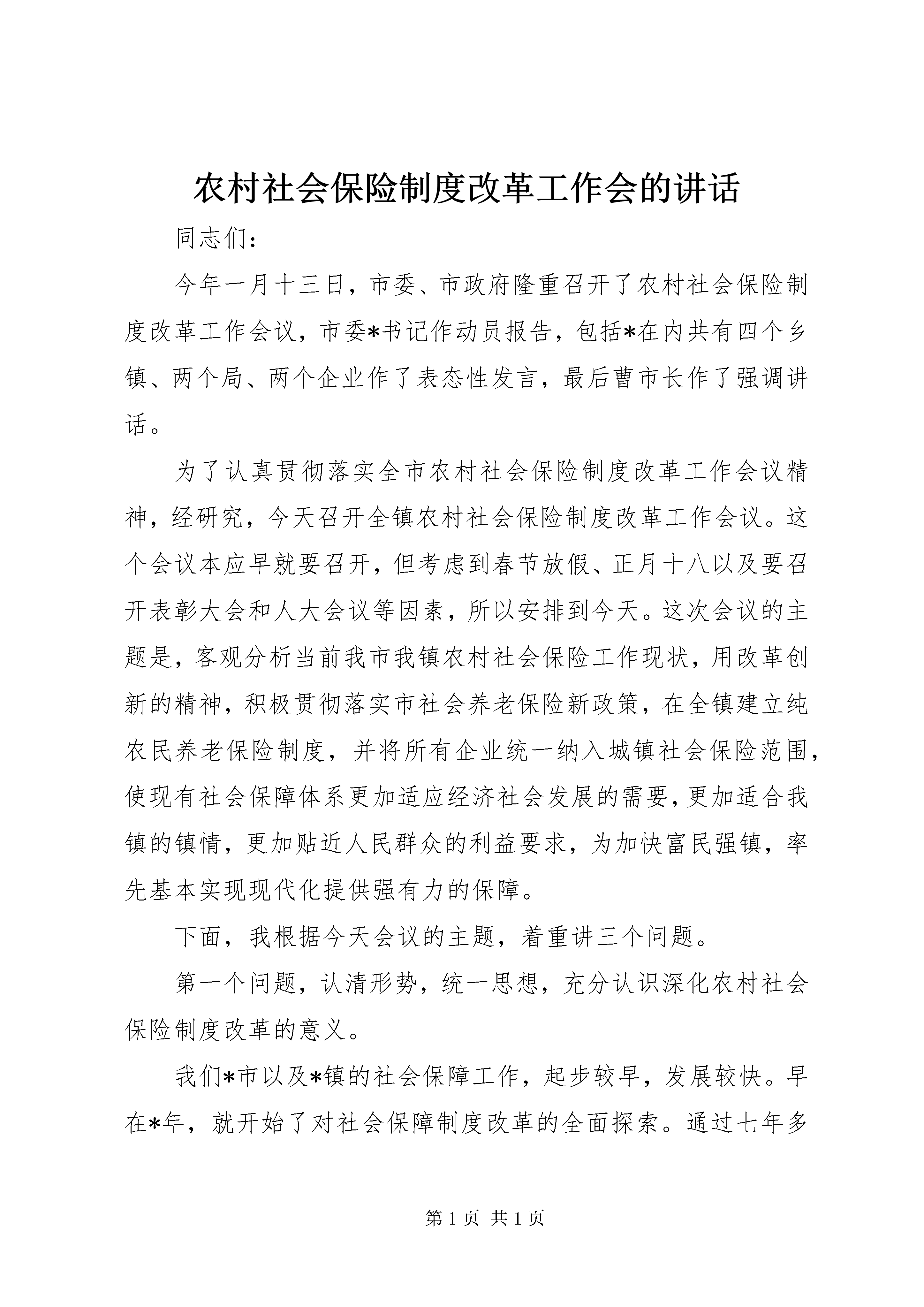 农村社会保险制度改革工作会的讲话同志们:今年一月十三日,市委、市政府隆重召开了农村社会保险制度改革工作会议,市委*书记作动员报告,包括*在内共有四个乡镇、两个局、两个企业作了表态性发言,最后曹市长作了强调讲话。为了认真贯彻落实全市农村社会保险制度改革工作会议精神,经研究,今天召开全镇农村社会保险制度改革工作会议。这个会议本应早就要召开,但考虑到春节放假、正月十八以及要召开表彰大会和人大会议等因素,所以安排到今天。这次会议的主题是,客观分析当前我市我镇农村社会保险工作现状,用改革创新的精神,积极贯彻落实市社会养老保险新政策,在全镇建立纯农民养老保险制度,并将所有企业统一纳入城镇社会保险范围,使现有社会保障体系更加适应经济社会发展的需要,更加适合我镇的镇情,更加贴近人民群众的利益要求,为加快富民强镇,率先基本实现现代化提供强有力的保障。下面,我根据今天会议的主题,着重讲三个问题。第一个问题,认清形势,统一思想,充分认识深化农村社会保险制度改革的意义。我们*市以及*镇的社会保障工作,起步较早,发展较快。早在*年,就开始了对社会保障制度改革的全面探索。通过七年多时间的努力,社会保障制度在经济社会生活中发挥出越来越重要的作用,对发展农村经济、缩小城乡差别、转变农民养老观念等都产生了深刻的影响,取得了显著成效。一是社会保险体系日趋完善。七年来,我镇根据上级指示精神,从改革、发展、稳定这个大局出发,解放思想,大胆探索,较好地实现了社会保险管理体制和运行机制的创新和突破。在理顺管理体制的基础上,以养老保险制度改革为突破口,对原有的企业、机关事业和农村养老保险办法大胆改革,先后推行了机关事业、城镇企业、农村养老保险办法,改革了机关事业养老保险办法,将原来养老保险费单一社会统筹改革为社会统筹和个人帐户相结合、突出个人帐户运作的新机制,通过建立养老保险个人帐户,大大提高了政策的透明度,增强了广大参保职工的积极性。按照“低水平、广覆盖、保基本”的原则,从*年起积极探索城镇职工基本医疗保险制度改革,初步建立了与经济发展相适应,保障职工基本医疗需求的城镇职工基本医疗保险制度,并抓紧实施医疗保险配套制度改革,建立了大额医疗费用社会互助等制度。同时,还积极推进生育、失业、工伤保险制度改革,实现了社会保险“五保合一”的管理新机制,构筑起了较为完备的社会保险体系框架,使社会保险制度开始步入良性循环的轨道。二是扩面征缴工作成效显著。狠抓社会保险“扩面征缴”工作,把开展养老保险作为“一把手”工程常抓不懈,明确规定:对不按规定参保、不缴纳社会保险费的单位,不予办理出国出境手续,不予办理小汽车等专控商品审批,单位和单位负责人不得评优晋级,通过行政的手段确保措施落实到位。我镇通过多年的努力,已有*多家企事业单位分别参加了养老保险,累计参加城镇和农村养老保险人数达到*多人,其中*集团全员参加城镇养老保险。去年全镇完成农保征缴额*万元。去年我镇在全市乡镇条线考核中名列第一。三是社会保障职能充分发挥。社会保险事业的发展,为化解经济社会发展中的各种矛盾、维护社会稳定,提供了有力的支撑和保障。特别是在离退休人员、下岗失业人员生活保障以及促进企业产权制度改革等方面,社会保障很好地发挥了“安全阀”、“助推器”的职能。七年多来,我们*镇积极推进社会保险社会化管理服务工作,并率先实施养老金社会化发放,至去年底,全镇*余名离退休人员的养老金和*多名失业职工的失业保险金都实现由银行直接发放,保证了离退休人员按时足额领到养老金,失业人员按时足额领到失业保险金,推进了“两个确保”工作的顺利进行。为促进企业改革的顺利进行,帮助转制企业分流富余职工实现再就业,实行了职工劳动工资、社会保险关系代理挂靠制度,累计有*多名职工办理了代理挂靠手续,解决了自谋职业人员社会保险关系接续等后顾之忧,为探索社会化管理服务奠定了基础。通过深入持久的宣传教育,广大群众的养老观念加快转变,“要养老、找社保”的观念正在逐步形成。所有这些,都为我们进一步深化社会保障改革打下了很好的基础。但与此同时,我们也要看到,社会保险工作同样面临着许多新的问题、新的挑战。随着经济改革的不断深入,就业结构发生了重大变化,大量农村劳动力正加速向城镇转移;城镇化进程不断加快,农民耕地逐渐减少,土地收益不再成为农民的主要收入来源;农村人口老龄化速度加快,长期的低生育水平使传统的家庭养老功能趋于弱化。这些都对社会保险特别是农村社会保险工作提出了更高的要求。而现行的农村养老保险制度还存在许多不合理的地方,不能完全适应形势发展的需要,主要表现在三个方面:一是覆盖面不广,保障水平较低。目前的农村养老保险办法,是*年*月根椐省政府有关精神制订实施的,后来虽然经过多次调整完善,但总体缴费水平仍然偏低,养老待遇计发办法也不够合理。按照原