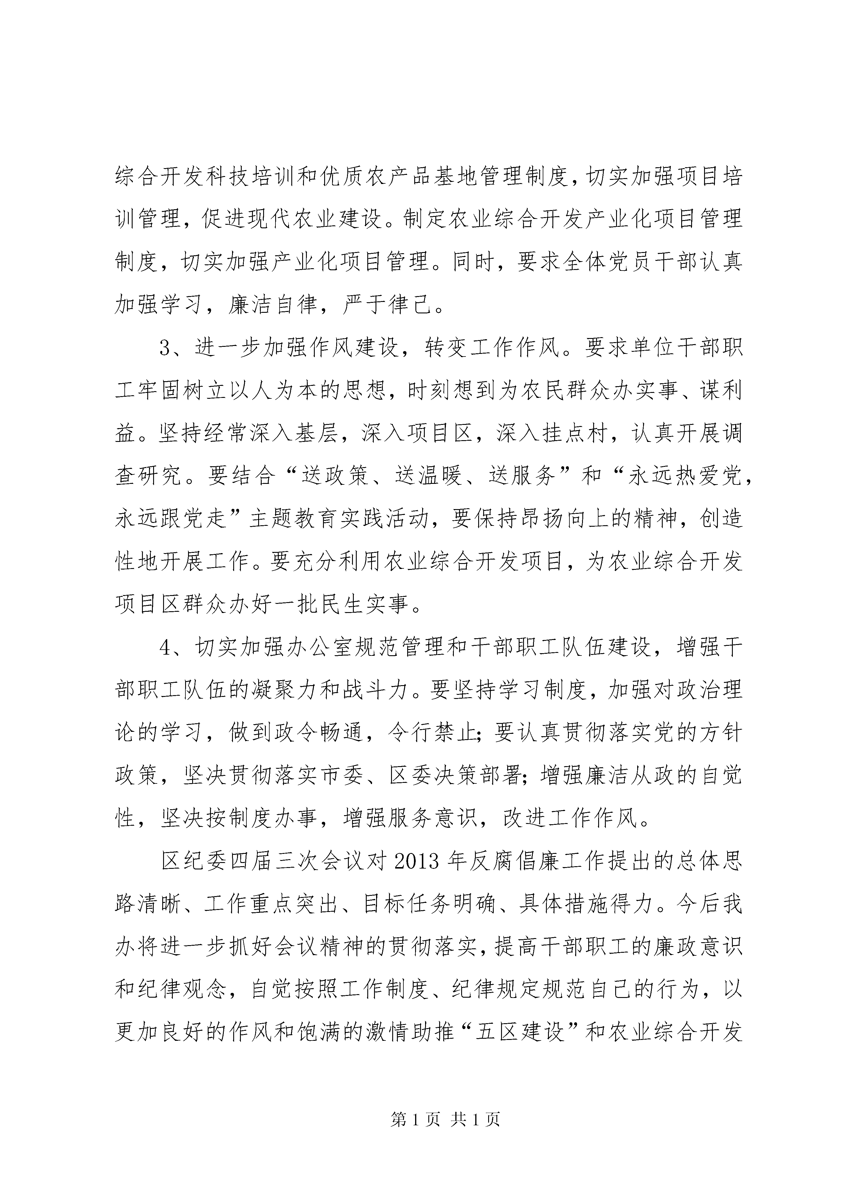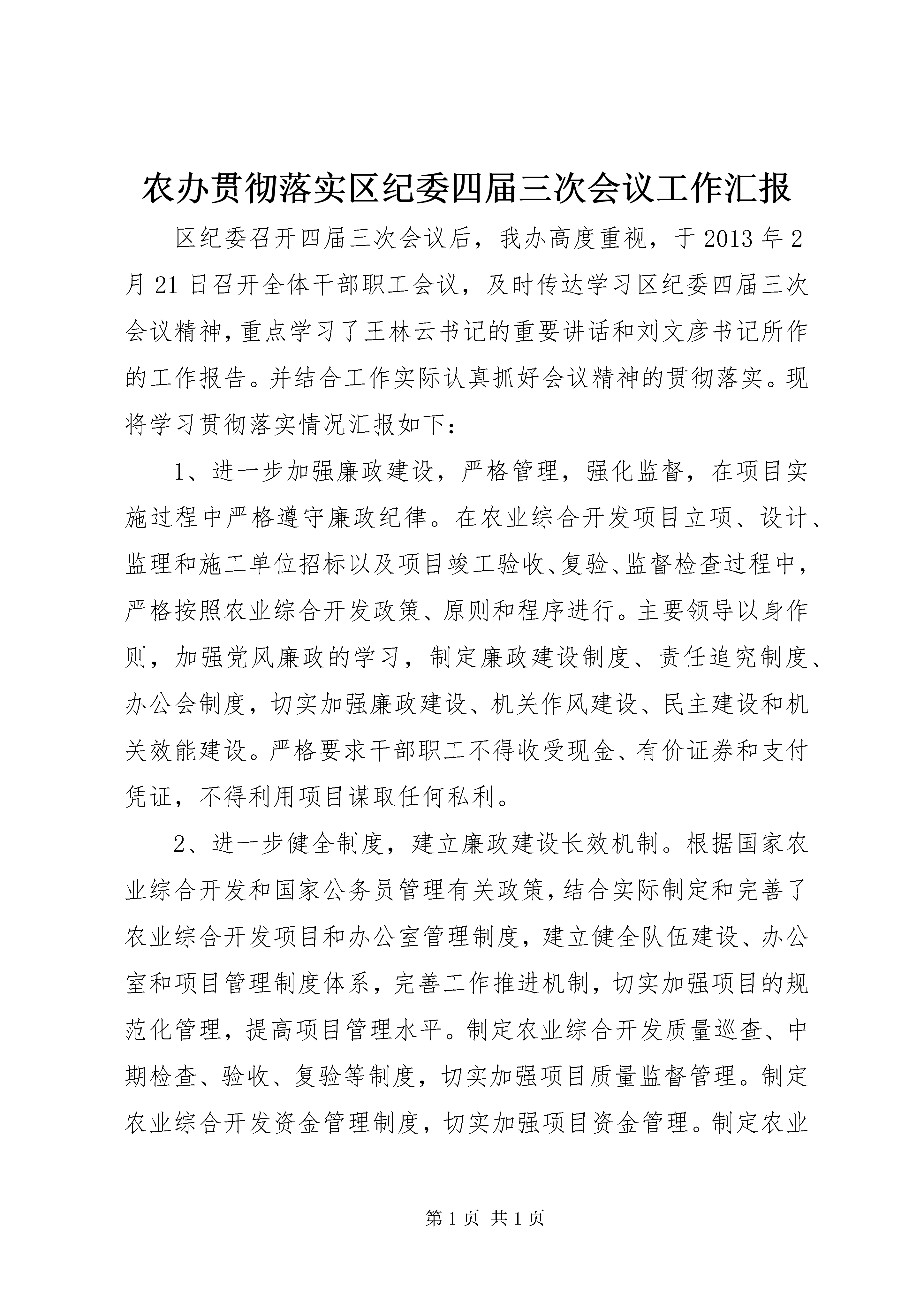 农办贯彻落实区纪委四届三次会议工作汇报区纪委召开四届三次会议后,我办高度重视,于2013年2月21日召开全体干部职工会议,及时传达学习区纪委四届三次会议精神,重点学习了王林云书记的重要讲话和刘文彦书记所作的工作报告。并结合工作实际认真抓好会议精神的贯彻落实。现将学习贯彻落实情况汇报如下:1、进一步加强廉政建设,严格管理,强化监督,在项目实施过程中严格遵守廉政纪律。在农业综合开发项目立项、设计、监理和施工单位招标以及项目竣工验收、复验、监督检查过程中,严格按照农业综合开发政策、原则和程序进行。主要领导以身作则,加强党风廉政的学习,制定廉政建设制度、责任追究制度、办公会制度,切实加强廉政建设、机关作风建设、民主建设和机关效能建设。严格要求干部职工不得收受现金、有价证券和支付凭证,不得利用项目谋取任何私利。2、进一步健全制度,建立廉政建设长效机制。根据国家农业综合开发和国家公务员管理有关政策,结合实际制定和完善了农业综合开发项目和办公室管理制度,建立健全队伍建设、办公室和项目管理制度体系,完善工作推进机制,切实加强项目的规范化管理,提高项目管理水平。制定农业综合开发质量巡查、中期检查、验收、复验等制度,切实加强项目质量监督管理。制定农业综合开发资金管理制度,切实加强项目资金管理。制定农业综合开发科技培训和优质农产品基地管理制度,切实加强项目培训管理,促进现代农业建设。制定农业综合开发产业化项目管理制度,切实加强产业化项目管理。同时,要求全体党员干部认真加强学习,廉洁自律,严于律己。3、进一步加强作风建设,转变工作作风。要求单位干部职工牢固树立以人为本的思想,时刻想到为农民群众办实事、谋利益。坚持经常深入基层,深入项目区,深入挂点村,认真开展调查研究。要结合“送政策、送温暖、送服务”和“永远热爱党,永远跟党走”主题教育实践活动,要保持昂扬向上的精神,创造性地开展工作。要充分利用农业综合开发项目,为农业综合开发项目区群众办好一批民生实事。4、切实加强办公室规范管理和干部职工队伍建设,增强干部职工队伍的凝聚力和战斗力。要坚持学习制度,加强对政治理论的学习,做到政令畅通,令行禁止;要认真贯彻落实党的方针政策,坚决贯彻落实市委、区委决策部署;增强廉洁从政的自觉性,坚决按制度办事,增强服务意识,改进工作作风。区纪委四届三次会议对2013年反腐倡廉工作提出的总体思路清晰、工作重点突出、目标任务明确、具体措施得力。今后我办将进一步抓好会议精神的贯彻落实,提高干部职工的廉政意识和纪律观念,自觉按照工作制度、纪律规定规范自己的行为,以更加良好的作风和饱满的激情助推“五区建设”和农业综合开发工作的开展。
