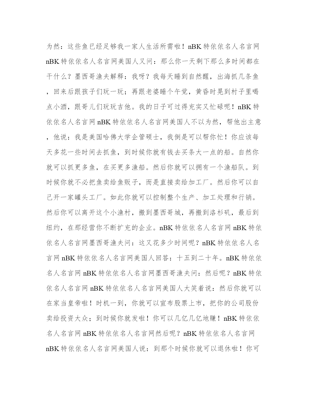 告诉孩子人的一生应追求什么告诉孩子人的一生应追求什么nBK特依依名人名言网nBK特依依名人名言网故事一:nBK特依依名人名言网nBK特依依名人名言网英国某小镇。nBK特依依名人名言网nBK特依依名人名言网这儿,有一个青年人,整日以沿街为小镇的人说唱为生;这儿,有一个华人妇女,远离家人,在这儿打工。nBK特依依名人名言网nBK特依依名人名言网他们总是在同一个小餐馆用餐,于是他们屡屡相遇。nBK特依依名人名言网nBK特依依名人名言网时间长了,彼此已十分的熟悉。有一日,我们的女同胞,关切地对那个小伙子说:“不要沿街卖唱了,去做一个正当的职业吧。我介绍你到中国去教书,在那儿,你完全可以拿到比你现在高得多的薪水。”nBK特依依名人名言网nBK特依依名人名言网小伙子听后,先是一愣,然后反问道:“难道我现在从事的不是正当的职业吗?我喜欢这个职业,它给我,也给其他人带来欢乐。有什么不好?我何必要远渡重洋,抛弃亲人,抛弃家园,去做我并不喜欢的工作?”nBK特依依名人名言网nBK特依依名人名言网邻桌的英国人,无论老人孩子,也都为之愕然。他们不明白,仅仅为了多挣几张钞票,抛弃家人,远离幸福,有什么可以值得羡慕的。在他们的眼中,家人团聚,平平安安,才是最大的幸福。它与财富的多少,地位的贵贱无关。nBK特依依名人名言网nBK特依依名人名言网于是,小镇上的人,开始可怜我们的女同胞了。nBK特依依名人名言网nBK特依依名人名言网故事二:nBK特依依名人名言网nBK特依依名人名言网中国山东,有这样一对夫妇。nBK特依依名人名言网nBK特依依名人名言网刚刚结婚时,妻子在济宁,丈夫在枣庄;过了若干年,妻子调到了枣庄,丈夫却一纸调令到了菏泽。若干年后,妻子又费尽周折,调到了菏泽,但不久,丈夫又被提拔到了省城济南。妻子又托关系找熟人,好不容易调到了济南。可是不到一年,丈夫又被国家电业总公司调到重庆。于是,她所有的朋友,就给她开玩笑——你们俩呀,天生就是牛郎织女的命。要我们说呀,你也别追了,干脆辞职,跟着你们家老张算了。nBK特依依名人名言网nBK特依依名人名言网但是,她以及公婆、父母,都一致反对。“干了这么多年,马上就退休了,再说,你的单位效益这么好,辞职多可惜。要丢掉多少钱呀!再干几年吧,也给孩子多挣一些。”nBK特依依名人名言网nBK特依依名人名言网其实,他们家的经济条件已经非常优越。早已是中层阶级,但是他们仍然惦念着那一点退休金。nBK特依依名人名言网nBK特依依名人名言网于是,夫妻两个至今依然是牛郎织女。nBK特依依名人名言网nBK特依依名人名言网我们,是一个尚义轻利的民族。中国人一直是为了某种自己未必真正明白的主义而活着。nBK特依依名人名言网nBK特依依名人名言网于是,中国人,不能在没有目标的生活中活着。而这个目标,可以是工作,可以是理想,可以是金钱,可以是孩子,可以是老人……但是,唯一不可能是的,就是自己。nBK特依依名人名言网nBK特依依名人名言网中国人,可以很委屈的活着。可以是工作上的极不顺心,可以是婚姻上的勉强维持,可以是人际关系上的强作笑颜,可以是所有欲望的极端压制,可以是为了一个所谓的户口……哪怕牺牲自己一生的幸福,也在所不惜。nBK特依依名人名言网nBK特依依名人名言网中国人,可以过异常艰难的日子,但并不能安贫乐道,他所遭受的一切不幸,必定有一个近乎玩笑的借口;中国人,可以把高官厚禄当作成功,中国人可以把身家百万当作理想,中国人可以抛却天伦之乐四海飘荡,但是,中国人唯一不认可的成功——就是家庭的和睦,人生的平淡。nBK特依依名人名言网nBK特依依名人名言网于是,一个有着五千年文明历史的国度,把爱国、崇高、献身、成功、立业的情结推向了极致——他们要么在大公无私,其实是舍本逐末的漩涡里苦苦挣扎,要么在肩负重任,其实是徒有其名的怪圈里受尽折磨……唯一遗漏的就是自由和自我。nBK特依依名人名言网nBK特依依名人名言网于是,在外国,妇孺皆知的道理;在中国,没人能整明白。nBK特依依名人名言网nBK特依依名人名言网故事三:nBK特依依名人名言网nBK特依依名人名言网有一个美国商人坐在墨西哥海边一个小渔村的码头上,看着一个墨西哥渔夫划着一艘小船靠岸,小船上有好几尾大黄鳍鲔鱼。nBK特依依名人名言网nBK特依依名人名言网这个美国商人对墨西哥渔夫能抓这么高档的鱼恭维了一番,还问要多少时间才能抓这么多?墨西哥渔夫说,才一会儿功夫就抓到了。nBK特依依名人名言网nBK特依依名人名言网美国人再问,你为什么不待久一点,好多抓一些鱼?墨西哥渔夫觉得不以为然:这些鱼已经足够我一家人生活所需啦!nBK特依依名人名言网nBK特依依名人名言网美国人又问:那么你一天剩下那么多时间都在干什么?墨西哥渔夫解释:我呀?我每天睡到自然醒,出海抓几条鱼,回来后跟孩子们玩一玩;再跟老婆睡个