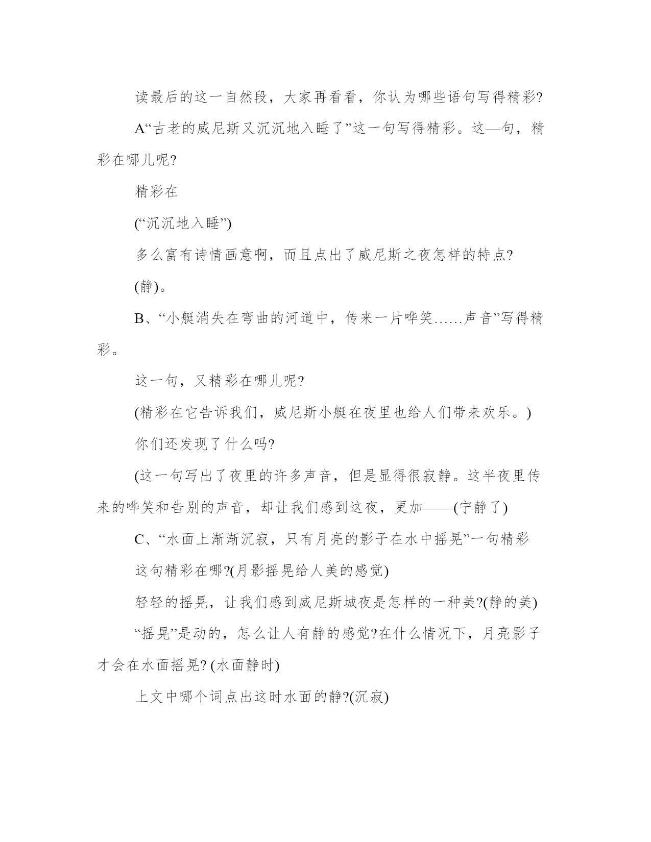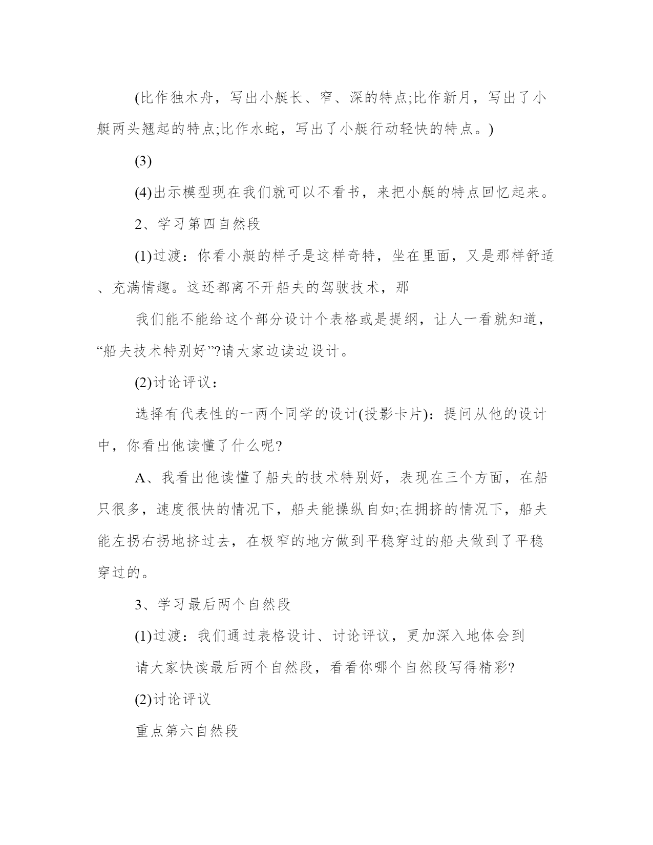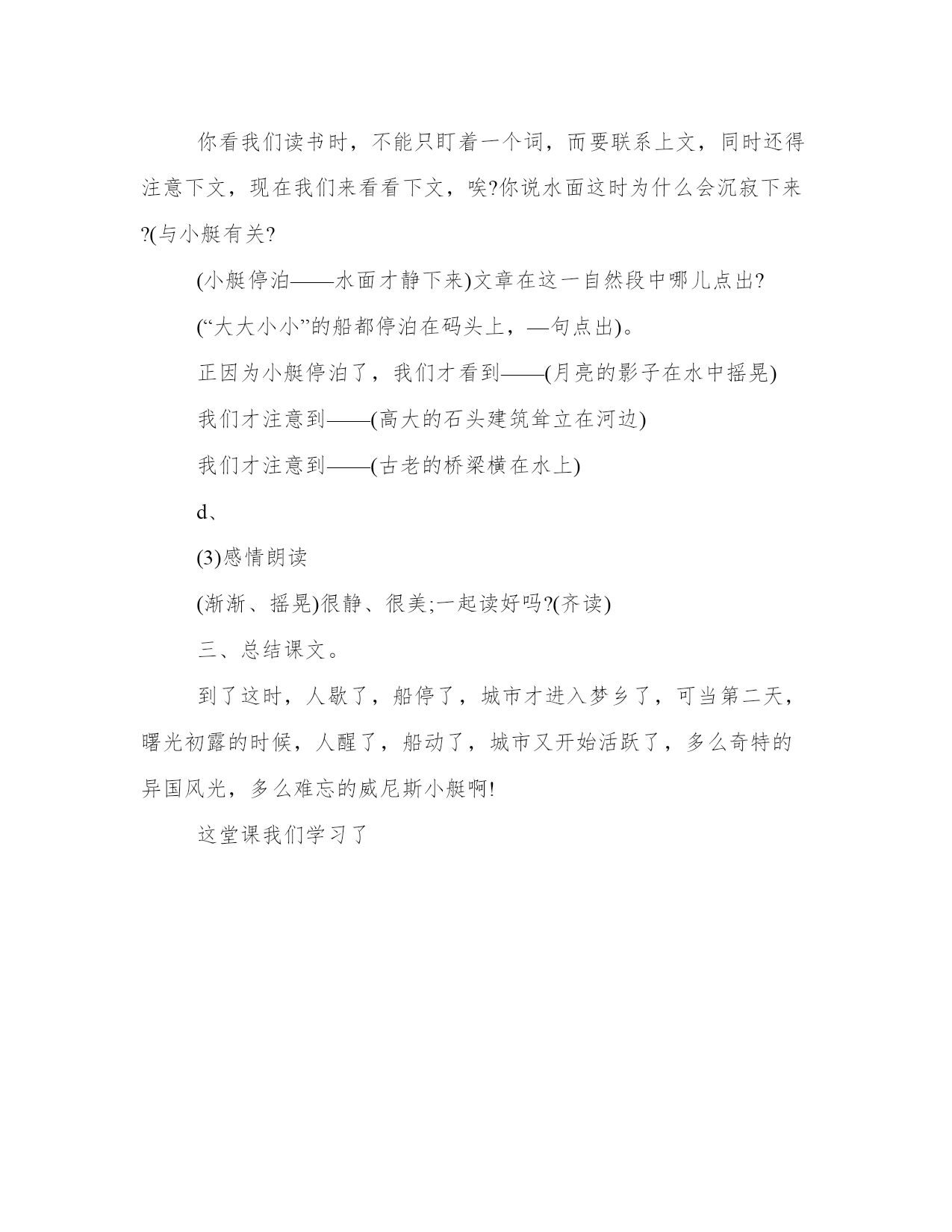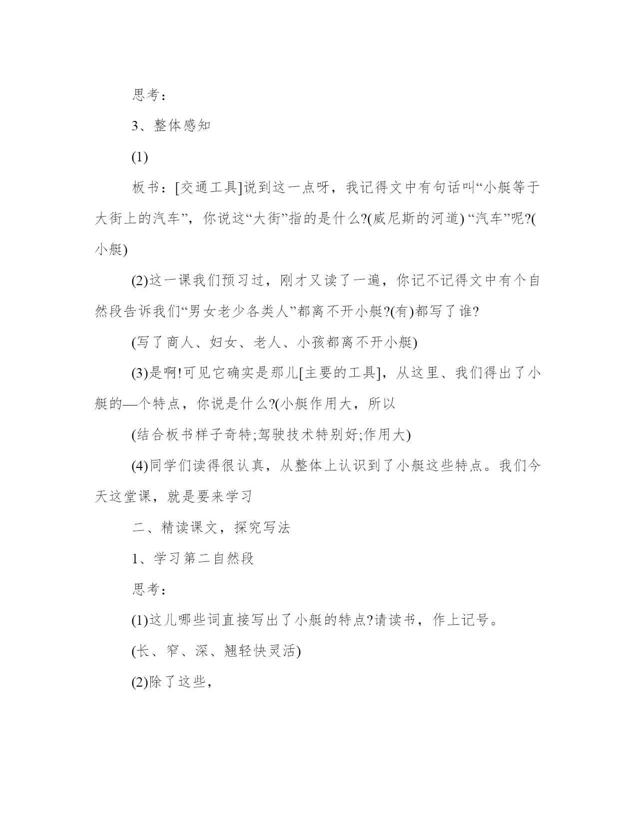【威尼斯的小艇教学设计第二课时】威尼斯的小艇教学设计大全威尼斯的小艇是马克·吐温撰写的文章,以下是本站分享的威尼斯的小艇教学设计大全,希望能帮助到大家!威尼斯的小艇教学设计教学目标:2、了解小艇的特点及它同威尼斯水城的关系,领会抓住事物特点写的表达方法。3、学会本课生字,认识生词。4、朗读课文,背诵课文前四个自然段。教学准备:教学课件,实物展示台。一、整体感知,初读课文。1、录像导入同学们,大家能不能用最响亮的声音把课题读一遍?(威尼斯的小艇)这“威尼斯”,你去过吗?好,我们现在就到威尼斯,去领略—下那儿独特的异国风光,好吗?[放录像]游览了威尼斯,你都见到了些什么?这些啊,美国著名的大作家马克·吐温,也就是本文的2、初读课文思考:3、整体感知(1)板书:[交通工具]说到这一点呀,我记得文中有句话叫“小艇等于大街上的汽车”,你说这“大街”指的是什么?(威尼斯的河道)“汽车”呢?(小艇)(2)这一课我们预习过,刚才又读了一遍,你记不记得文中有个自然段告诉我们“男女老少各类人”都离不开小艇?(有)都写了谁?(写了商人、妇女、老人、小孩都离不开小艇)(3)是啊!可见它确实是那儿[主要的工具],从这里、我们得出了小艇的—个特点,你说是什么?(小艇作用大,所以(结合板书样子奇特;驾驶技术特别好;作用大)(4)同学们读得很认真,从整体上认识到了小艇这些特点。我们今天这堂课,就是要来学习二、精读课文,探究写法1、学习第二自然段思考:(1)这儿哪些词直接写出了小艇的特点?请读书,作上记号。(长、窄、深、翘轻快灵活)(2)除了这些,(比作独木舟,写出小艇长、窄、深的特点;比作新月,写出了小艇两头翘起的特点;比作水蛇,写出了小艇行动轻快的特点。)(3)(4)出示模型现在我们就可以不看书,来把小艇的特点回忆起来。2、学习第四自然段(1)过渡:你看小艇的样子是这样奇特,坐在里面,又是那样舒适、充满情趣。这还都离不开船夫的驾驶技术,那我们能不能给这个部分设计个表格或是提纲,让人一看就知道,“船夫技术特别好”?请大家边读边设计。(2)讨论评议:选择有代表性的一两个同学的设计(投影卡片):提问从他的设计中,你看出他读懂了什么呢?A、我看出他读懂了船夫的技术特别好,表现在三个方面,在船只很多,速度很快的情况下,船夫能操纵自如;在拥挤的情况下,船夫能左拐右拐地挤过去,在极窄的地方做到平稳穿过的船夫做到了平稳穿过的。3、学习最后两个自然段(1)过渡:我们通过表格设计、讨论评议,更加深入地体会到请大家快读最后两个自然段,看看你哪个自然段写得精彩?(2)讨论评议重点第六自然段读最后的这一自然段,大家再看看,你认为哪些语句写得精彩?A“古老的威尼斯又沉沉地入睡了”这一句写得精彩。这—句,精彩在哪儿呢?精彩在(“沉沉地入睡”)多么富有诗情画意啊,而且点出了威尼斯之夜怎样的特点?(静)。B、“小艇消失在弯曲的河道中,传来一片哗笑……声音”写得精彩。这一句,又精彩在哪儿呢?(精彩在它告诉我们,威尼斯小艇在夜里也给人们带来欢乐。)你们还发现了什么吗?(这一句写出了夜里的许多声音,但是显得很寂静。这半夜里传来的哗笑和告别的声音,却让我们感到这夜,更加——(宁静了)C、“水面上渐渐沉寂,只有月亮的影子在水中摇晃”一句精彩这句精彩在哪?(月影摇晃给人美的感觉)轻轻的摇晃,让我们感到威尼斯城夜是怎样的一种美?(静的美)“摇晃”是动的,怎么让人有静的感觉?在什么情况下,月亮影子才会在水面摇晃?(水面静时)上文中哪个词点出这时水面的静?(沉寂)你看我们读书时,不能只盯着一个词,而要联系上文,同时还得注意下文,现在我们来看看下文,唉?你说水面这时为什么会沉寂下来?(与小艇有关?(小艇停泊——水面才静下来)文章在这一自然段中哪儿点出?(“大大小小”的船都停泊在码头上,—句点出)。正因为小艇停泊了,我们才看到——(月亮的影子在水中摇晃)我们才注意到——(高大的石头建筑耸立在河边)我们才注意到——(古老的桥梁横在水上)d、(3)感情朗读(渐渐、摇晃)很静、很美;一起读好吗?(齐读)三、总结课文。到了这时,人歇了,船停了,城市才进入梦乡了,可当第二天,曙光初露的时候,人醒了,船动了,城市又开始活跃了,多么奇特的异国风光,多么难忘的威尼斯小艇啊!这堂课我们学习了