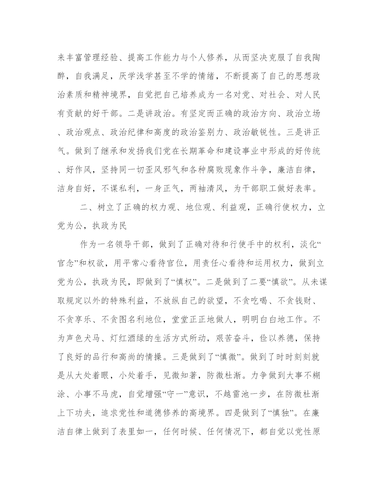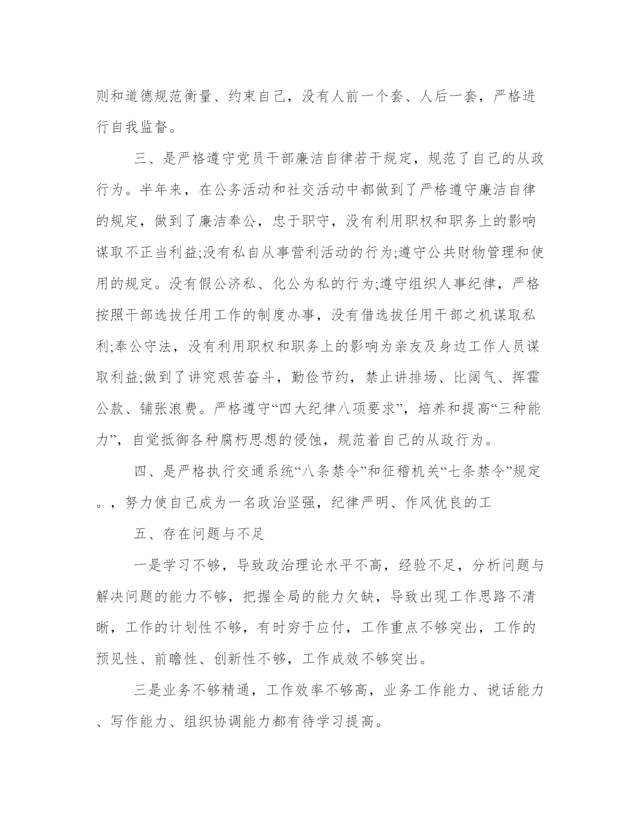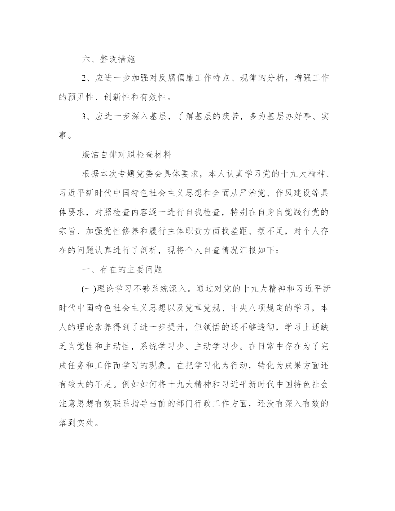 廉洁自律对照检查材料廉洁自律既是一个永恒的话题,又是一个终身的课题,是党员干部的立身之本、处事之道和为政之要。习近平总书记在谈到领导干部要始终做到心中有戒的问题时,语重心长地说:“廉洁自律是共产党人为官从政的底线。本站为大家整理的相关的廉洁自律对照检查材料,供大家参考选择。廉洁自律对照检查材料作为一名征稽所的所长,做到了按照党章和中国共产党党员领导干部廉洁从政若干准则(试行),牢固树立起了廉洁从政的意识,严格遵守党员干部廉洁自律各项规定,正确行使手中的权利,做到了清正廉洁,两袖清风,一身正气,做到了堂堂正正做人,踏踏实实做事,清清白白做官,并自觉与各种腐败现象作坚决斗争。现将自己的廉洁自律情况报告如下:一、始终做到了讲学习、讲政治、讲正气,始终保持共产党人的蓬勃朝气、昂扬锐气、浩然正气。一是讲学习。按照江泽民同志强调的各级领导干部要学习、学习再学习的要求,并根据客观实际和形势的需要,做到不断丰富和充实自己,不断地学习邓小平理论、“三个代表”重要思想和教育、经济、法律、科技、管理等方面的知识。特别要做到的是,在学习各种理论知识的同时,十分注意党纪政纪条规的学习,还通过自觉加强学习,来丰富管理经验、提高工作能力与个人修养,从而坚决克服了自我陶醉,自我满足,厌学浅学甚至不学的情绪,不断提高了自己的思想政治素质和精神境界,自觉把自己培养成为一名对党、对社会、对人民有贡献的好干部。二是讲政治。有坚定而正确的政治方向、政治立场、政治观点、政治纪律和高度的政治鉴别力、政治敏锐性。三是讲正气。做到了继承和发扬我们党在长期革命和建设事业中形成的好传统、好作风,坚持同一切歪风邪气和各种腐败现象作斗争,廉洁自律,洁身自好,不谋私利,一身正气,两袖清风,为干部职工做好表率。二、树立了正确的权力观、地位观、利益观,正确行使权力,立党为公,执政为民作为一名领导干部,做到了正确对待和行使手中的权利,淡化“官念”和权欲,用平常心看待官位,用责任心看待和运用权力,做到立党为公,执政为民,即做到了“慎权”。二是做到了二要“慎欲”。从未谋取规定以外的特殊利益,不放纵自己的欲望,不贪吃喝、不贪钱财、不贪享乐、不贪图名利地位,堂堂正正地做人,明明白白地工作。不为声色犬马、灯红酒绿的生活方式所动,艰苦奋斗,俭以养德,保持了良好的品行和高尚的情操。三是做到了“慎微”。做到了时时刻刻就是从大处着眼,小处着手,见微知著,防微杜渐。力争做到大事不糊涂、小事不马虎,自觉增强“守一”意识,不越雷池一步,在防微杜渐上下功夫,追求党性和道德修养的高境界。四是做到了“慎独”。在廉洁自律上做到了表里如一,任何时候、任何情况下,都自觉以党性原则和道德规范衡量、约束自己,没有人前一个套、人后一套,严格进行自我监督。三、是严格遵守党员干部廉洁自律若干规定,规范了自己的从政行为。半年来,在公务活动和社交活动中都做到了严格遵守廉洁自律的规定,做到了廉洁奉公,忠于职守,没有利用职权和职务上的影响谋取不正当利益;没有私自从事营利活动的行为;遵守公共财物管理和使用的规定。没有假公济私、化公为私的行为;遵守组织人事纪律,严格按照干部选拔任用工作的制度办事,没有借选拔任用干部之机谋取私利;奉公守法,没有利用职权和职务上的影响为亲友及身边工作人员谋取利益;做到了讲究艰苦奋斗,勤俭节约,禁止讲排场、比阔气、挥霍公款、铺张浪费。严格遵守“四大纪律八项要求”,培养和提高“三种能力”,自觉抵御各种腐朽思想的侵蚀,规范着自己的从政行为。四、是严格执行交通系统“八条禁令”和征稽机关“七条禁令”规定。,努力使自己成为一名政治坚强,纪律严明、作风优良的工五、存在问题与不足一是学习不够,导致政治理论水平不高,经验不足,分析问题与解决问题的能力不够,把握全局的能力欠缺,导致出现工作思路不清晰,工作的计划性不够,有时穷于应付,工作重点不够突出,工作的预见性、前瞻性、创新性不够,工作成效不够突出。三是业务不够精通,工作效率不够高,业务工作能力、说话能力、写作能力、组织协调能力都有待学习提高。六、整改措施2、应进一步加强对反腐倡廉工作特点、规律的分析,增强工作的预见性、创新性和有效性。3、应进一步深入基层,了解基层的疾苦,多为基层办好事、实事。廉洁自律对照检查材料根据本次专题党委会具体要求,本人认真学习党的十九大精神、习近平新时代中国特色社会主义思想和全面从严治党、作风建设等具体要求,对照检查内容逐一进行自我检查,特别在自身自觉践行党的宗旨、加强党性修养和履行主体职责方面找差距、摆不足,对个人存在的问题认真进行了剖析,现将个人自查情况汇报如下:一、存在的主要问题(一)理论学习不够系统深入。通过对党的十九大精神和习近平新时代中国特色社会主义思想以及党章党规、中央八项规定的学习,本人的理论素养得到了进一步提升,但领悟的还不够透彻,学习上还缺