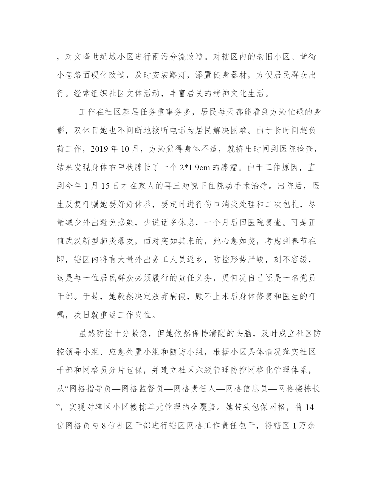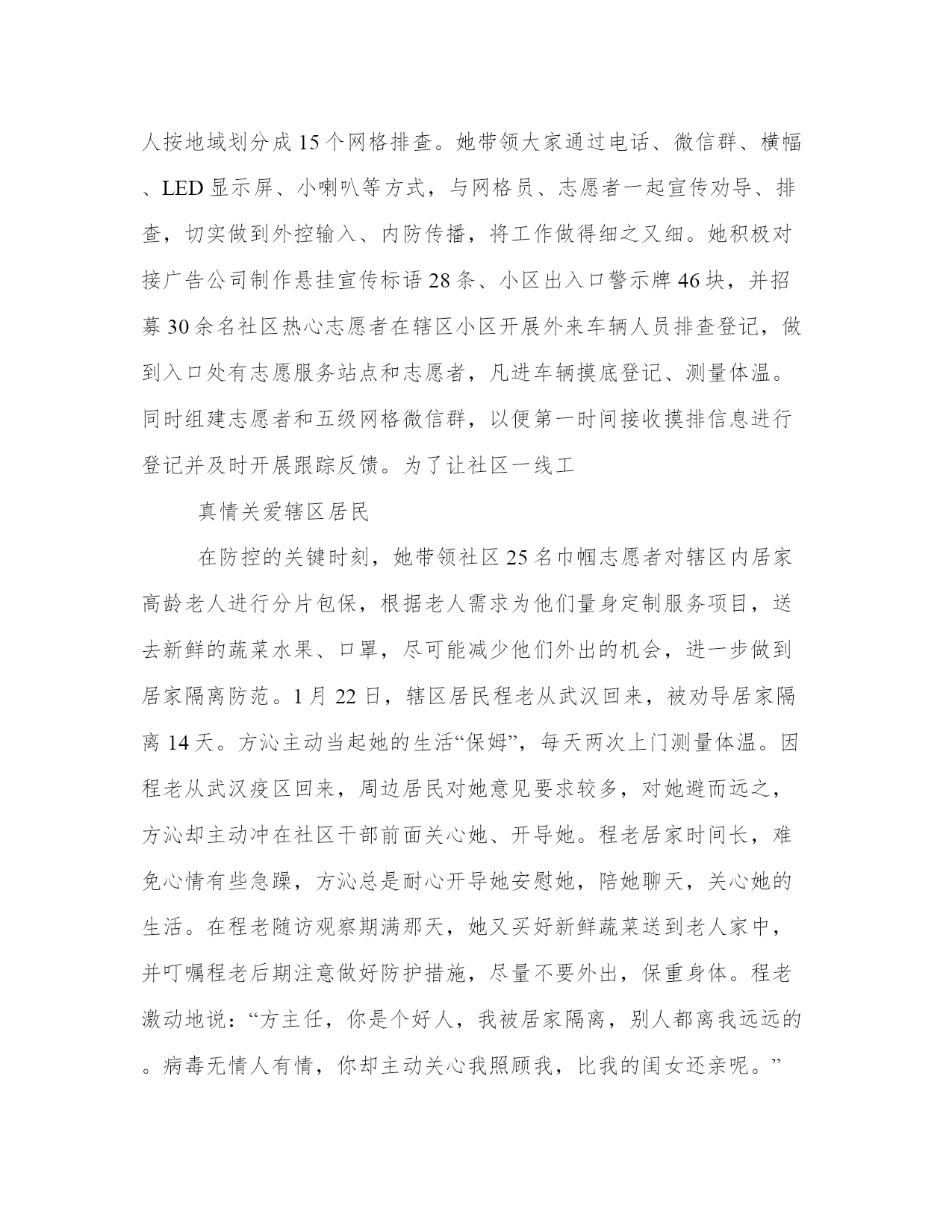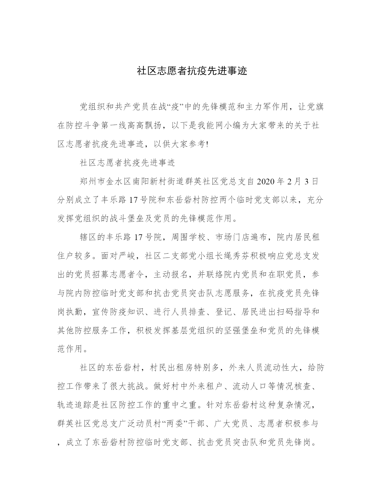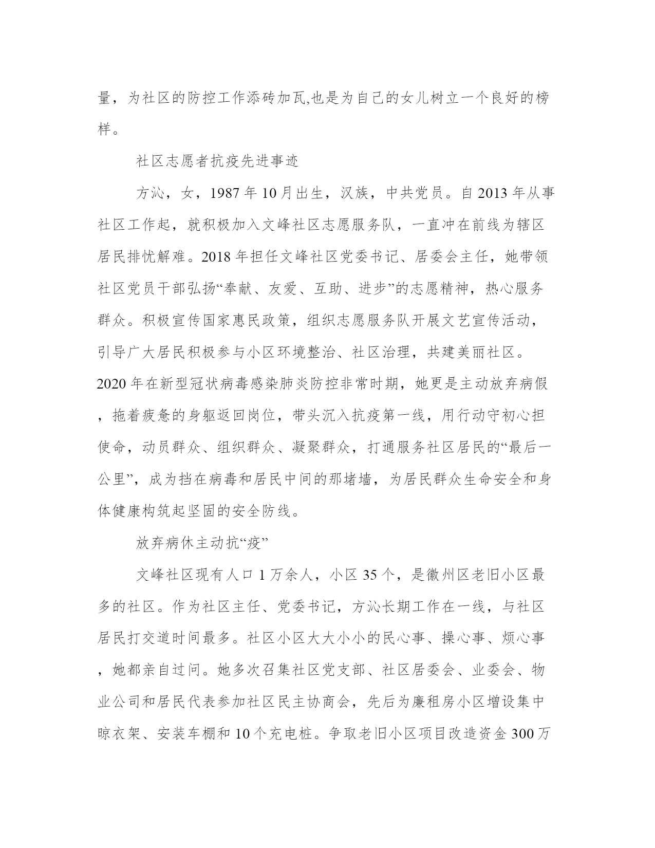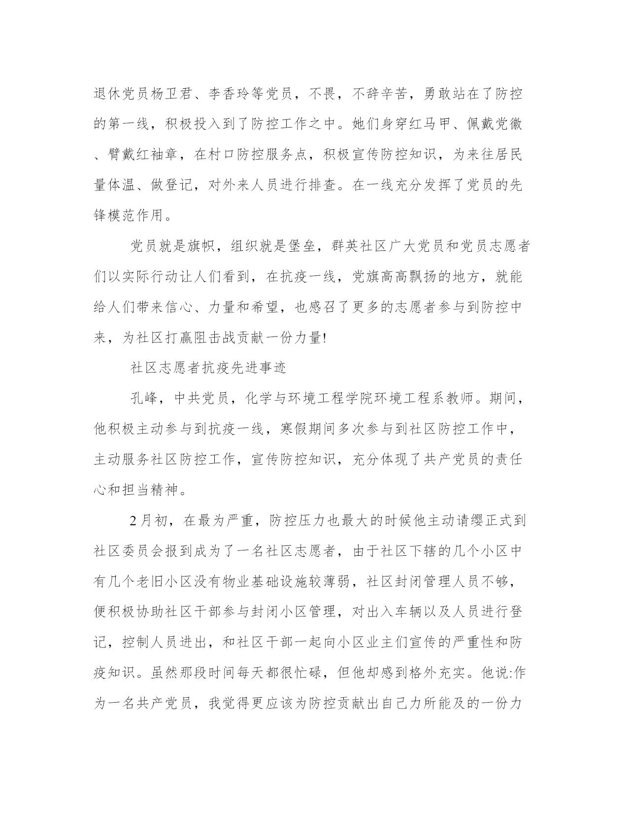 社区志愿者抗疫先进事迹党组织和共产党员在战“疫”中的先锋模范和主力军作用,让党旗在防控斗争第一线高高飘扬,以下是我能网小编为大家带来的关于社区志愿者抗疫先进事迹,以供大家参考!社区志愿者抗疫先进事迹郑州市金水区南阳新村街道群英社区党总支自2020年2月3日分别成立了丰乐路17号院和东岳砦村防控两个临时党支部以来,充分发挥党组织的战斗堡垒及党员的先锋模范作用。辖区的丰乐路17号院,周围学校、市场门店遍布,院内居民租住户较多。面对严峻,社区二支部党小组长绳秀芬积极响应党总支发出的党员招募志愿者令,主动报名,并联络院内党员和在职党员,参与院内防控临时党支部和抗击党员突击队志愿服务,在抗疫党员先锋岗执勤,宣传防疫知识、进行人员排查、登记、居民进出扫码指导和其他防控服务工作,积极发挥基层党组织的坚强堡垒和党员的先锋模范作用。社区的东岳砦村,村民出租房特别多,外来人员流动性大,给防控工作带来了很大挑战。做好村中外来租户、流动人口等情况核查、轨迹追踪是社区防控工作的重中之重。针对东岳砦村这种复杂情况,群英社区党总支广泛动员村“两委”干部、广大党员、志愿者积极参与,成立了东岳砦村防控临时党支部、抗击党员突击队和党员先锋岗。退休党员杨卫君、李香玲等党员,不畏,不辞辛苦,勇敢站在了防控的第一线,积极投入到了防控工作之中。她们身穿红马甲、佩戴党徽、臂戴红袖章,在村口防控服务点,积极宣传防控知识,为来往居民量体温、做登记,对外来人员进行排查。在一线充分发挥了党员的先锋模范作用。党员就是旗帜,组织就是堡垒,群英社区广大党员和党员志愿者们以实际行动让人们看到,在抗疫一线,党旗高高飘扬的地方,就能给人们带来信心、力量和希望,也感召了更多的志愿者参与到防控中来,为社区打赢阻击战贡献一份力量!社区志愿者抗疫先进事迹孔峰,中共党员,化学与环境工程学院环境工程系教师。期间,他积极主动参与到抗疫一线,寒假期间多次参与到社区防控工作中,主动服务社区防控工作,宣传防控知识,充分体现了共产党员的责任心和担当精神。2月初,在最为严重,防控压力也最大的时候他主动请缨正式到社区委员会报到成为了一名社区志愿者,由于社区下辖的几个小区中有几个老旧小区没有物业基础设施较薄弱,社区封闭管理人员不够,便积极协助社区干部参与封闭小区管理,对出入车辆以及人员进行登记,控制人员进出,和社区干部一起向小区业主们宣传的严重性和防疫知识。虽然那段时间每天都很忙碌,但他却感到格外充实。他说:作为一名共产党员,我觉得更应该为防控贡献出自己力所能及的一份力量,为社区的防控工作添砖加瓦,也是为自己的女儿树立一个良好的榜样。社区志愿者抗疫先进事迹方沁,女,1987年10月出生,汉族,中共党员。自2013年从事社区工作起,就积极加入文峰社区志愿服务队,一直冲在前线为辖区居民排忧解难。2018年担任文峰社区党委书记、居委会主任,她带领社区党员干部弘扬“奉献、友爱、互助、进步”的志愿精神,热心服务群众。积极宣传国家惠民政策,组织志愿服务队开展文艺宣传活动,引导广大居民积极参与小区环境整治、社区治理,共建美丽社区。2020年在新型冠状病毒感染肺炎防控非常时期,她更是主动放弃病假,拖着疲惫的身躯返回岗位,带头沉入抗疫第一线,用行动守初心担使命,动员群众、组织群众、凝聚群众,打通服务社区居民的“最后一公里”,成为挡在病毒和居民中间的那堵墙,为居民群众生命安全和身体健康构筑起坚固的安全防线。放弃病休主动抗“疫”文峰社区现有人口1万余人,小区35个,是徽州区老旧小区最多的社区。作为社区主任、党委书记,方沁长期工作在一线,与社区居民打交道时间最多。社区小区大大小小的民心事、操心事、烦心事,她都亲自过问。她多次召集社区党支部、社区居委会、业委会、物业公司和居民代表参加社区民主协商会,先后为廉租房小区增设集中晾衣架、安装车棚和10个充电桩。争取老旧小区项目改造资金300万,对文峰世纪城小区进行雨污分流改造。对辖区内的老旧小区、背街小巷路面硬化改造,及时安装路灯,添置健身器材,方便居民群众出行。经常组织社区文体活动,丰富居民的精神文化生活。工作在社区基层任务重事务多,居民每天都能看到方沁忙碌的身影,双休日她也不间断地接听电话为居民解决困难。由于长时间超负荷工作,2019年10月,方沁觉得身体不适,就挤出时间到医院检查,结果发现身体右甲状腺长了一个2*1.9cm的腺瘤。由于工作原因,直到今年1月15日才在家人的再三劝说下住院动手术治疗。出院后,医生反复叮嘱她要好好休养,要定时进行伤口消炎处理和二次包扎,尽量减少外出避免感染,少说话多休息,一个月后回医院复查。可是正值武汉新型肺炎爆发,面对突如其来的,她心急如焚,考虑到春节在即,辖区内将有大量外出务工人员返乡,防控形势严峻,刻不容缓,这是每一位居民群众必须履行的责任义务,更何况自己还是一