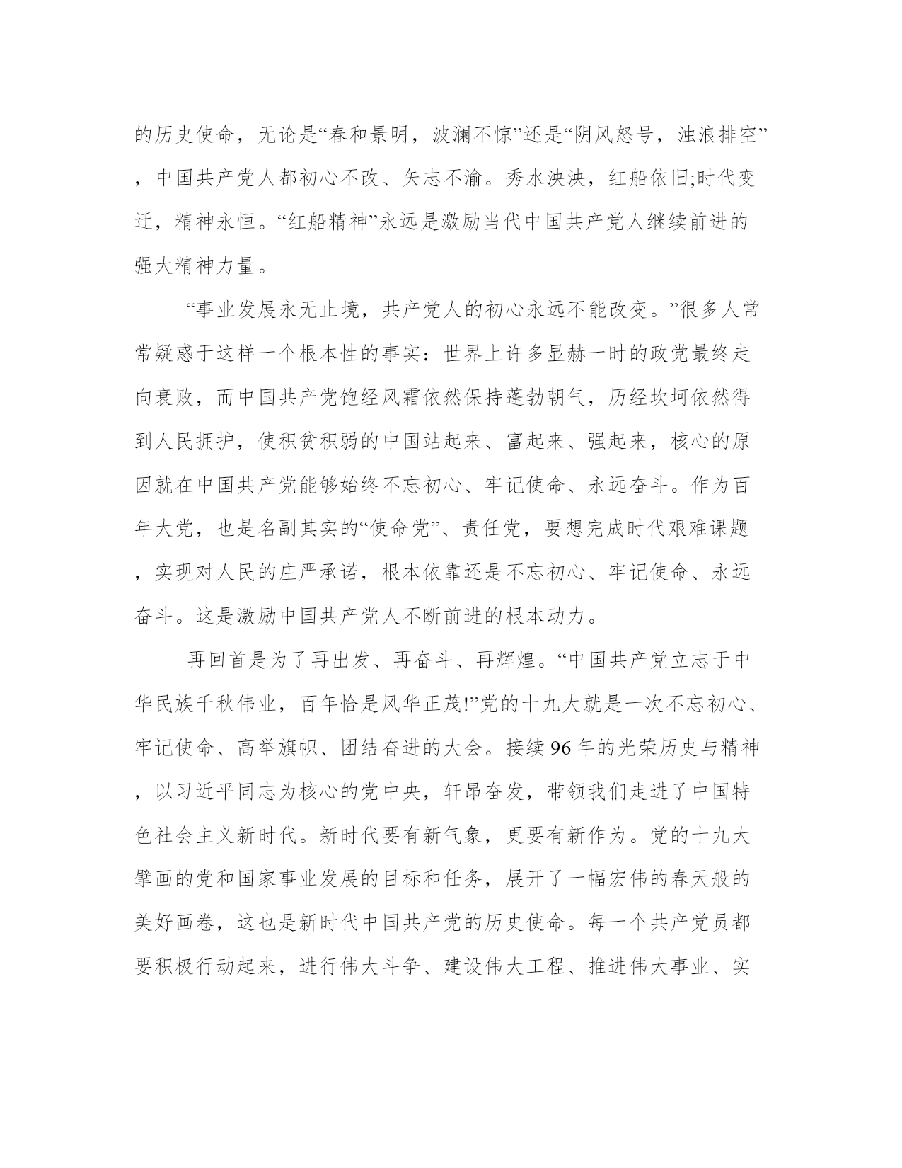 不忘初心牢记使命专题党课讲稿3篇不忘初心,牢记使命。作为一名党员,我们要提高自身的党性修养,做到思想上纯洁、政治上坚定,心中有定力、行为有规范,处处发挥先锋模范作用,为他人树立榜样,为社会主义建设贡献自己的一份力量。下面是本站为大家整理的不忘初心牢记使命专题党课讲稿,供大家参考。不忘初心牢记使命专题党课讲稿“不忘初心,牢记使命。”“中国共产党人的初心和使命,就是为中国人民谋幸福,为中华民族谋复兴。”干部队伍是我们的骨干力量,更应该时刻牢记在心。“中国共产党员的初心,就是为中国人民谋幸福,为中华民族谋复兴。”在十九大开幕会上,习近平总书记多次提到中国共产党员的初心,响彻在人民大会堂,也回荡在辽阔的神州大地上。我们要把学习贯彻党的十九大精神作为首要政治任务,更加牢固树立“四个意识”,更加坚决维护习近平总书记的核心地位,更加自觉用习近平新时代中国特色社会主义思想武装头脑,维护党中央权威,就有党的团结统一,我们的党、我们的国家、我们的人民、我们的事业就有了前进的方向标和无穷力量。深入学习贯彻落实习近平新时代中国特色社会主义思想和党的十九大精神作为当前和今后一个时期的首要政治任务,我们不仅要认真学习领会习近平新时代中国特色社会主义思想,深刻领会时代背景和历史贡献,掌握核心要义和丰富内涵,在学懂弄通做实上下功夫,把学习成果真正融入到工作实践中,不忘初心、牢记使命,锐意进取、埋头苦干,为社会事业发展而努力奋斗。党的十九大顺应我国经济社会新发展和广大人民群众新期待,赋予“全面小康”更高的标准和更丰富的内涵。“坚持不忘初心、继续前进,就要统筹推进“五位一体”总体布局,协调推进“四个全面”战略布局,全力推进全面建成小康社会进程,不断把实现“两个一百年”奋斗目标推向前进。”不忘初心牢记使命专题党课讲稿“中国共产党人的初心和使命,就是为中国人民谋幸福,为中华民族谋复兴。”这是习近平总书记在党的十九大上的鲜明宣示。党的十九大闭幕不久,习近平总书记就带领中共中央政治局常委,来到我们党梦想起航的地方,回首峥嵘岁月,重温入党誓词,号召全党同志不忘初心、牢记使命、永远奋斗。“我们党的全部历史都是从中共一大开启的,我们走得再远都不能忘记来时的路。”饱经沧桑的石库门的老屋,烟雨朦胧的南湖上的红船,是中国共产党的诞生地,是我们党梦想起航的地方,是党的根脉,也是中国共产党人的精神家园。96年前,代表着全国50多名党员的13名代表,从这里播撒中国革命的火种,从这里开启跨世纪伟大航程的出征,从这里走向全国执政。96年来,为了实现中华民族伟大复兴的历史使命,无论是“春和景明,波澜不惊”还是“阴风怒号,浊浪排空”,中国共产党人都初心不改、矢志不渝。秀水泱泱,红船依旧;时代变迁,精神永恒。“红船精神”永远是激励当代中国共产党人继续前进的强大精神力量。“事业发展永无止境,共产党人的初心永远不能改变。”很多人常常疑惑于这样一个根本性的事实:世界上许多显赫一时的政党最终走向衰败,而中国共产党饱经风霜依然保持蓬勃朝气,历经坎坷依然得到人民拥护,使积贫积弱的中国站起来、富起来、强起来,核心的原因就在中国共产党能够始终不忘初心、牢记使命、永远奋斗。作为百年大党,也是名副其实的“使命党”、责任党,要想完成时代艰难课题,实现对人民的庄严承诺,根本依靠还是不忘初心、牢记使命、永远奋斗。这是激励中国共产党人不断前进的根本动力。再回首是为了再出发、再奋斗、再辉煌。“中国共产党立志于中华民族千秋伟业,百年恰是风华正茂!”党的十九大就是一次不忘初心、牢记使命、高举旗帜、团结奋进的大会。接续96年的光荣历史与精神,以习近平同志为核心的党中央,轩昂奋发,带领我们走进了中国特色社会主义新时代。新时代要有新气象,更要有新作为。党的十九大擘画的党和国家事业发展的目标和任务,展开了一幅宏伟的春天般的美好画卷,这也是新时代中国共产党的历史使命。每一个共产党员都要积极行动起来,进行伟大斗争、建设伟大工程、推进伟大事业、实现伟大梦想,以党的坚强领导和顽强奋斗,激励全体中华儿女不断奋进,同心共筑中国梦。不忘初心、牢记使命、永远奋斗,就要不畏艰难、不怕牺牲,保持永不懈怠的精神状态和一往无前的奋斗姿态。必须以更高的境界、更强的本领、更优的作风、更好的精神状态,积极有效应对重大挑战、抵御重大风险、克服重大阻力、解决重大矛盾。既要有担当的宽肩膀,还得有成事的真本领,扎实有效推动各项事业大步向前迈进。不忘初心、牢记使命、永远奋斗,就要勇于直面问题,敢于刮骨疗毒,把我们党建设成为始终走在时代前列、人民衷心拥护、勇于自我革命、经得起各种风浪考验、朝气蓬勃的马克思主义执政党。新的时代必须有新的思想武装。这就要用习近平新时代中国特色社会主义思想武装头脑、指导工作、推动实践。全面从严治党永远在路上,不能有任何喘口气、歇歇脚的念头,要通过不断地