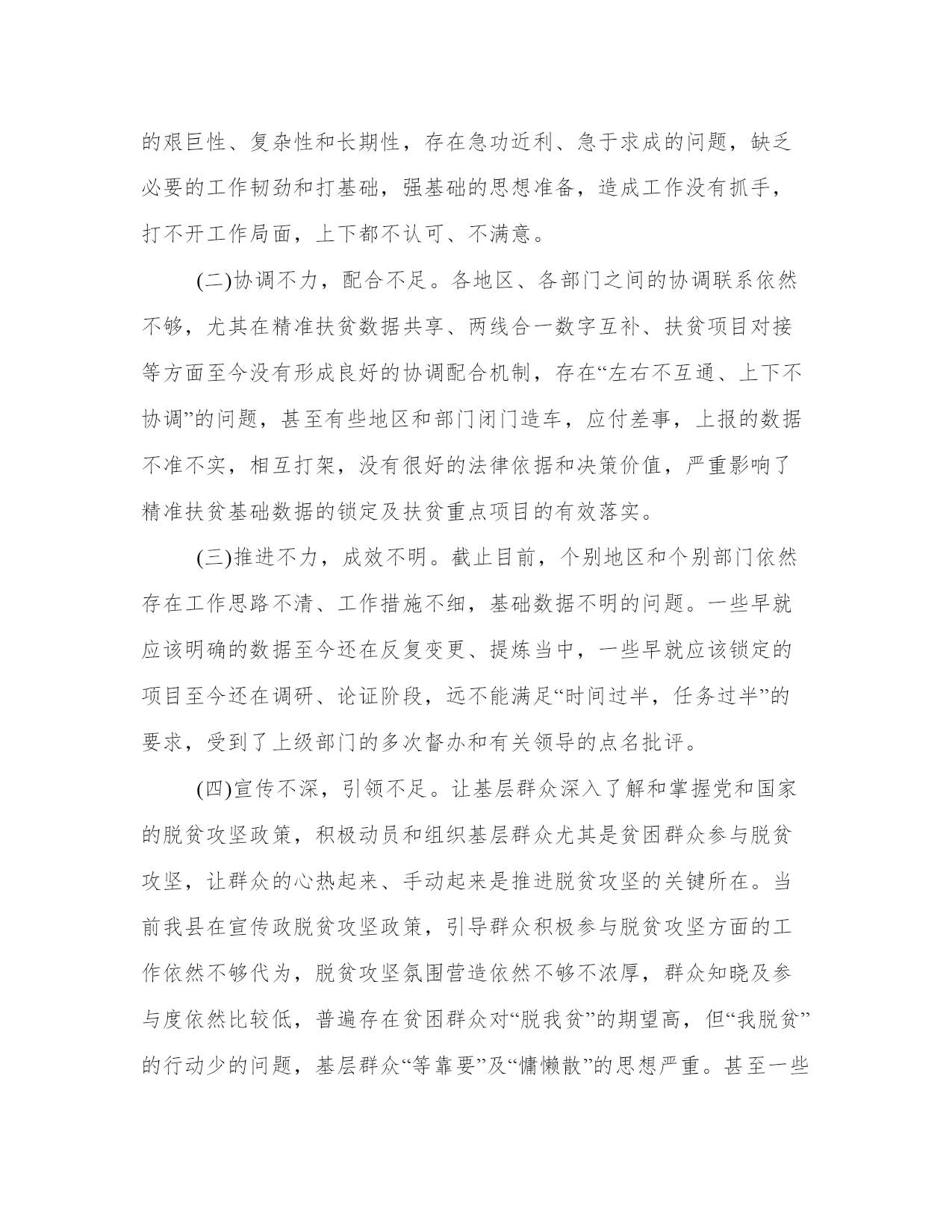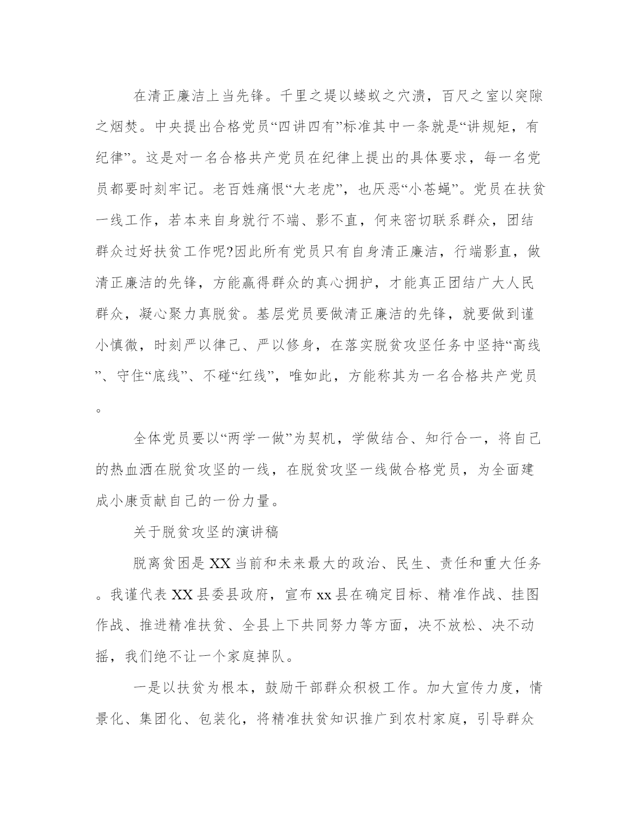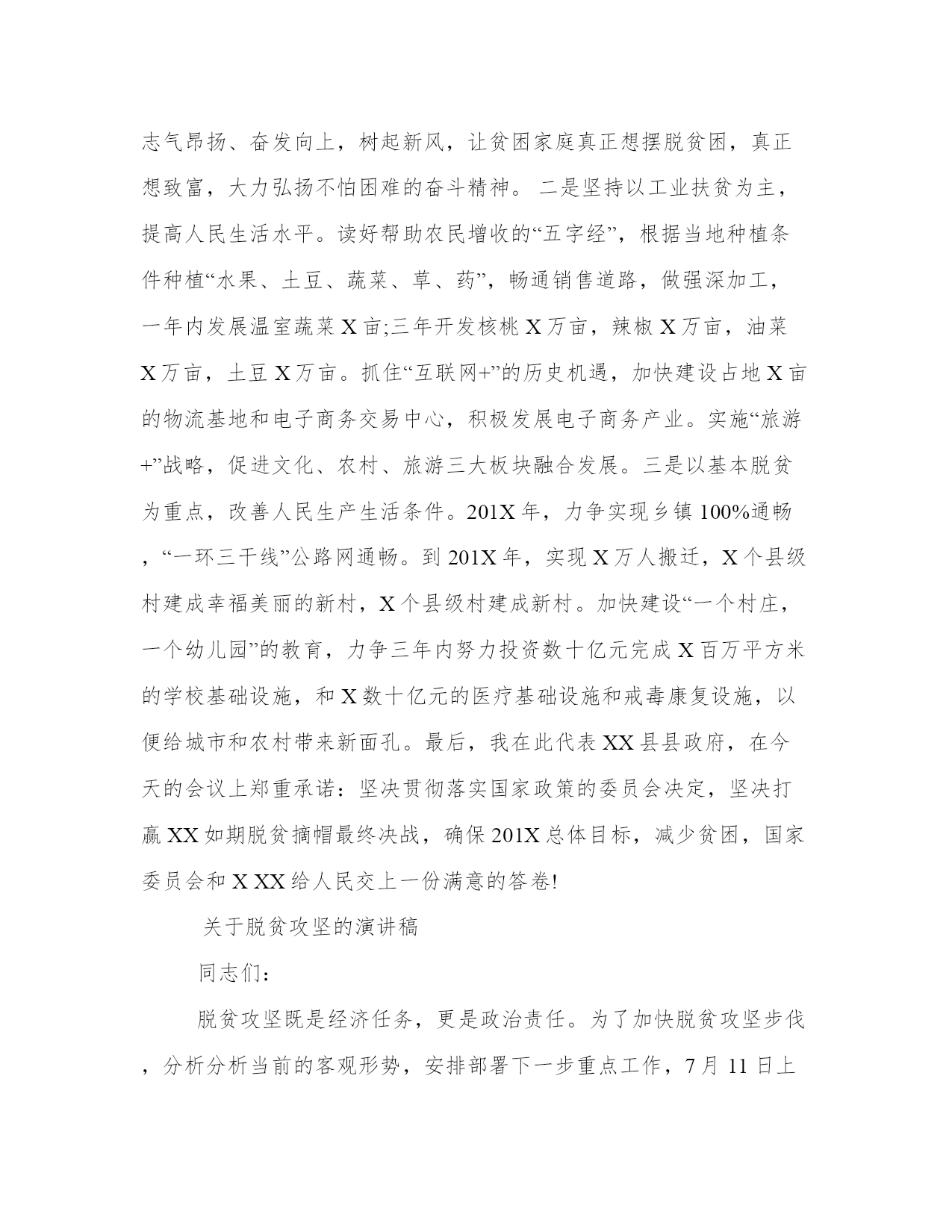 关于脱贫攻坚的演讲稿精准脱贫攻坚工作是一项功在当代、利在千秋的伟大事业,任务艰巨,使命光荣。以下是我能网小编为大家带来的关于关于脱贫攻坚的,以供大家参考!练就敢于担当的铁肩膀。保证我们事业的发展,关键在党、关键在各级党组织和广大党员。打赢脱贫攻坚战决定着我们全面建成小康社会,伟大复兴中国梦的实现。基层党员要胸怀大局、把握大势、着眼大事,当前党和国家的头等大事之一就是脱贫攻坚、决胜小康。大事难事看担当。基层共产党员做合格党员首先是要用自己的铁肩,扛起基层脱贫攻坚的政治责任,敢于担当。工作奋斗在脱贫攻坚一线,在一线干出成绩、有所作为。成长为攻坚克难的多面手。基层工作千万条线,事事涉及的都是人民群众的大事。脱贫致富奔向小康是基层群众的最大期望。然而脱贫工作并非一朝一夕之功、并非一蹴而就,而是要久久为功,长抓不懈。贫困户脱贫也并非扶贫干部做一两件事就能完成,而是一个系统工作,需要基层党员掌握好各种工作方法,成长为处理基层工作的多面手。比如在遇到群众之间的矛盾时,要做善于化解矛盾的“和事佬”,遇到不懂政策的要做好政策方针的“宣传员”“小喇叭”,遇到群众与政府沟通困难时要做党和政府的“连心桥”。在清正廉洁上当先锋。千里之堤以蝼蚁之穴溃,百尺之室以突隙之烟焚。中央提出合格党员“四讲四有”标准其中一条就是“讲规矩,有纪律”。这是对一名合格共产党员在纪律上提出的具体要求,每一名党员都要时刻牢记。老百姓痛恨“大老虎”,也厌恶“小苍蝇”。党员在扶贫一线工作,若本来自身就行不端、影不直,何来密切联系群众,团结群众过好扶贫工作呢?因此所有党员只有自身清正廉洁,行端影直,做清正廉洁的先锋,方能赢得群众的真心拥护,才能真正团结广大人民群众,凝心聚力真脱贫。基层党员要做清正廉洁的先锋,就要做到谨小慎微,时刻严以律己、严以修身,在落实脱贫攻坚任务中坚持“高线”、守住“底线”、不碰“红线”,唯如此,方能称其为一名合格共产党员。全体党员要以“两学一做”为契机,学做结合、知行合一,将自己的热血洒在脱贫攻坚的一线,在脱贫攻坚一线做合格党员,为全面建成小康贡献自己的一份力量。关于脱贫攻坚的演讲稿脱离贫困是XX当前和未来最大的政治、民生、责任和重大任务。我谨代表XX县委县政府,宣布xx县在确定目标、精准作战、挂图作战、推进精准扶贫、全县上下共同努力等方面,决不放松、决不动摇,我们绝不让一个家庭掉队。一是以扶贫为根本,鼓励干部群众积极工作。加大宣传力度,情景化、集团化、包装化,将精准扶贫知识推广到农村家庭,引导群众志气昂扬、奋发向上,树起新风,让贫困家庭真正想摆脱贫困,真正想致富,大力弘扬不怕困难的奋斗精神。二是坚持以工业扶贫为主,提高人民生活水平。读好帮助农民增收的“五字经”,根据当地种植条件种植“水果、土豆、蔬菜、草、药”,畅通销售道路,做强深加工,一年内发展温室蔬菜X亩;三年开发核桃X万亩,辣椒X万亩,油菜X万亩,土豆X万亩。抓住“互联网+”的历史机遇,加快建设占地X亩的物流基地和电子商务交易中心,积极发展电子商务产业。实施“旅游+”战略,促进文化、农村、旅游三大板块融合发展。三是以基本脱贫为重点,改善人民生产生活条件。201X年,力争实现乡镇100%通畅,“一环三干线”公路网通畅。到201X年,实现X万人搬迁,X个县级村建成幸福美丽的新村,X个县级村建成新村。加快建设“一个村庄,一个幼儿园”的教育,力争三年内努力投资数十亿元完成X百万平方米的学校基础设施,和X数十亿元的医疗基础设施和戒毒康复设施,以便给城市和农村带来新面孔。最后,我在此代表XX县县政府,在今天的会议上郑重承诺:坚决贯彻落实国家政策的委员会决定,坚决打赢XX如期脱贫摘帽最终决战,确保201X总体目标,减少贫困,国家委员会和XXX给人民交上一份满意的答卷!关于脱贫攻坚的演讲稿同志们:脱贫攻坚既是经济任务,更是政治责任。为了加快脱贫攻坚步伐,分析分析当前的客观形势,安排部署下一步重点工作,7月11日上午省上召开了全省脱贫攻坚工作推进电视电话会议,省委副书记王建军主持会议并作重要讲话,副省长严金海对全省脱贫攻坚工作进行了再动员、再安排、再部署。7月17日下午,州委、州政府召开全州脱贫攻坚工作推进会议,州委书记吴德军和才让太州长出席会议,并分别作了重要讲话。会议对全州脱贫攻坚工作进行了细化安排,对每一项工作任务都提出了时限要求。刚才,智明龙珠副县长就脱贫攻坚、两线合一等相关数据进行了通报,从通报的情况来看,我们当前面临的问题依然不少,需要推进的工作依然不少,希望各部门、各乡镇务必引起高度重视,以问题为导向、以目标为动力,全力以赴抓好工作任务的推进落实工作。下面,我就结合我县实际和省州要求,讲两点意见:一、正视问题不足,切实增强抓好脱贫攻坚工作的紧迫感和责任感。不管从我县当前脱贫攻坚工作推进情况来看,还是从省、