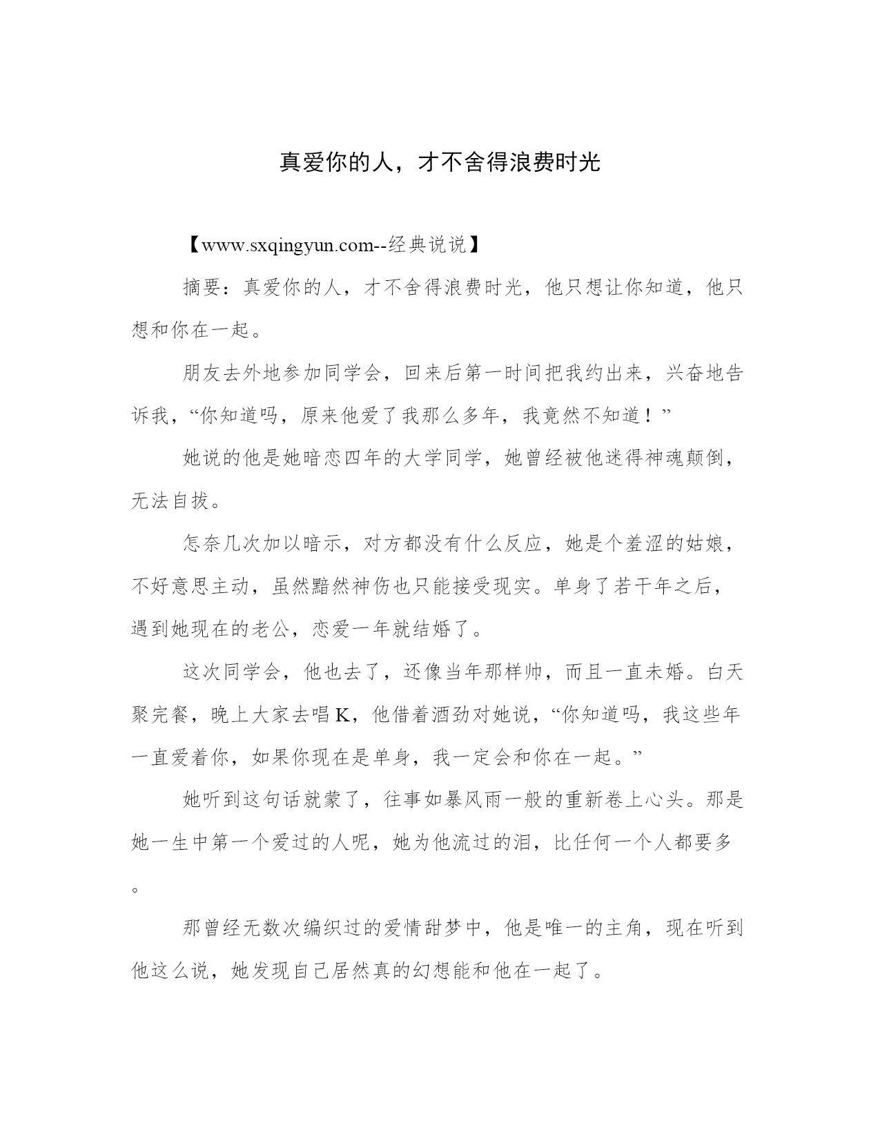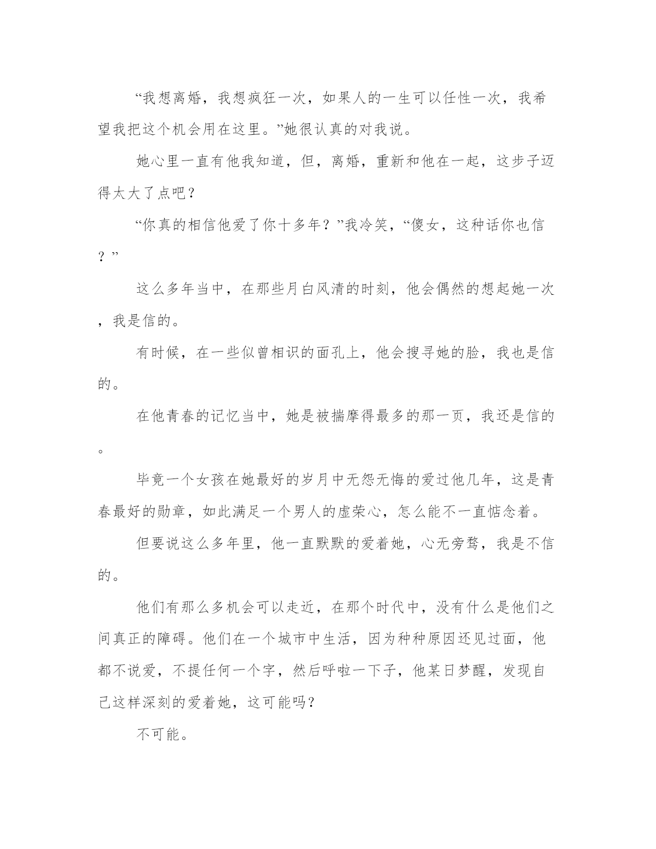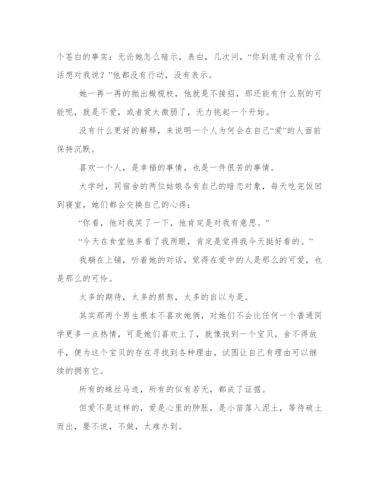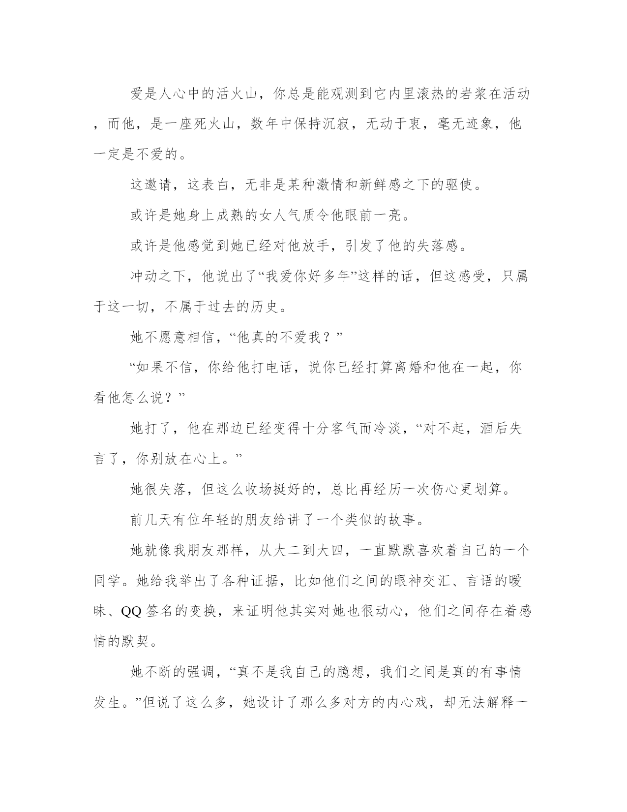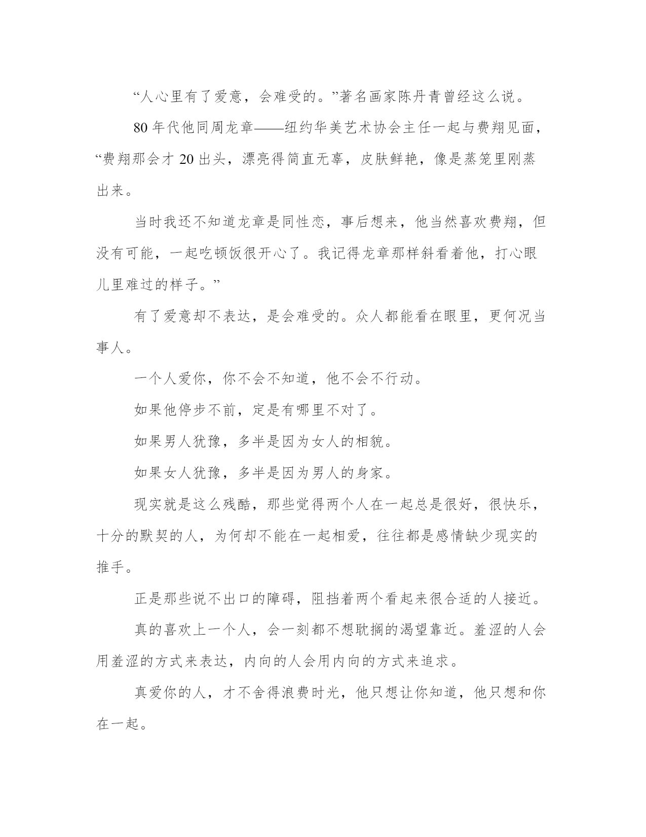 真爱你的人,才不舍得浪费时光【www.sxqingyun.com--经典说说】摘要:真爱你的人,才不舍得浪费时光,他只想让你知道,他只想和你在一起。朋友去外地参加同学会,回来后第一时间把我约出来,兴奋地告诉我,“你知道吗,原来他爱了我那么多年,我竟然不知道!”她说的他是她暗恋四年的大学同学,她曾经被他迷得神魂颠倒,无法自拔。怎奈几次加以暗示,对方都没有什么反应,她是个羞涩的姑娘,不好意思主动,虽然黯然神伤也只能接受现实。单身了若干年之后,遇到她现在的老公,恋爱一年就结婚了。这次同学会,他也去了,还像当年那样帅,而且一直未婚。白天聚完餐,晚上大家去唱K,他借着酒劲对她说,“你知道吗,我这些年一直爱着你,如果你现在是单身,我一定会和你在一起。”她听到这句话就蒙了,往事如暴风雨一般的重新卷上心头。那是她一生中第一个爱过的人呢,她为他流过的泪,比任何一个人都要多。那曾经无数次编织过的爱情甜梦中,他是唯一的主角,现在听到他这么说,她发现自己居然真的幻想能和他在一起了。“我想离婚,我想疯狂一次,如果人的一生可以任性一次,我希望我把这个机会用在这里。”她很认真的对我说。她心里一直有他我知道,但,离婚,重新和他在一起,这步子迈得太大了点吧?“你真的相信他爱了你十多年?”我冷笑,“傻女,这种话你也信?”这么多年当中,在那些月白风清的时刻,他会偶然的想起她一次,我是信的。有时候,在一些似曾相识的面孔上,他会搜寻她的脸,我也是信的。在他青春的记忆当中,她是被揣摩得最多的那一页,我还是信的。毕竟一个女孩在她最好的岁月中无怨无悔的爱过他几年,这是青春最好的勋章,如此满足一个男人的虚荣心,怎么能不一直惦念着。但要说这么多年里,他一直默默的爱着她,心无旁骛,我是不信的。他们有那么多机会可以走近,在那个时代中,没有什么是他们之间真正的障碍。他们在一个城市中生活,因为种种原因还见过面,他都不说爱,不提任何一个字,然后呼啦一下子,他某日梦醒,发现自己这样深刻的爱着她,这可能吗?不可能。爱是人心中的活火山,你总是能观测到它内里滚热的岩浆在活动,而他,是一座死火山,数年中保持沉寂,无动于衷,毫无迹象,他一定是不爱的。这邀请,这表白,无非是某种激情和新鲜感之下的驱使。或许是她身上成熟的女人气质令他眼前一亮。或许是他感觉到她已经对他放手,引发了他的失落感。冲动之下,他说出了“我爱你好多年”这样的话,但这感受,只属于这一切,不属于过去的历史。她不愿意相信,“他真的不爱我?”“如果不信,你给他打电话,说你已经打算离婚和他在一起,你看他怎么说?”她打了,他在那边已经变得十分客气而冷淡,“对不起,酒后失言了,你别放在心上。”她很失落,但这么收场挺好的,总比再经历一次伤心更划算。前几天有位年轻的朋友给讲了一个类似的故事。她就像我朋友那样,从大二到大四,一直默默喜欢着自己的一个同学。她给我举出了各种证据,比如他们之间的眼神交汇、言语的暧昧、QQ签名的变换,来证明他其实对她也很动心,他们之间存在着感情的默契。她不断的强调,“真不是我自己的臆想,我们之间是真的有事情发生。”但说了这么多,她设计了那么多对方的内心戏,却无法解释一个苍白的事实:无论她怎么暗示,表白,几次问,“你到底有没有什么话想对我说?”他都没有行动,没有表示。她一再一再的抛出橄榄枝,他就是不接招,那还能有什么别的可能呢,就是不爱,或者爱太微弱了,无力挑起一个开始。没有什么更好的解释,来说明一个人为何会在自己“爱”的人面前保持沉默。喜欢一个人,是幸福的事情,也是一件很苦的事情。大学时,同宿舍的两位姑娘各有自己的暗恋对象,每天吃完饭回到寝室,她们都会交换自己的心得:“你看,他对我笑了一下,他肯定是对我有意思。”“今天在食堂他多看了我两眼,肯定是觉得我今天挺好看的。”我躺在上铺,听着她的对话,觉得在爱中的人是那么的可爱,也是那么的可怜。太多的期待,太多的煎熬,太多的自以为是。其实那两个男生根本不喜欢她俩,对她们不会比任何一个普通同学更多一点热情,可是她们喜欢上了,就像找到一个宝贝,舍不得放手,便为这个宝贝的存在寻找到各种理由,试图让自己有理由可以继续的拥有它。所有的蛛丝马迹,所有的似有若无,都成了证据。但爱不是这样的,爱是心里的肿胀,是小苗落入泥土,等待破土而出,要不说,不做,太难办到。“人心里有了爱意,会难受的。”著名画家陈丹青曾经这么说。80年代他同周龙章——纽约华美艺术协会主任一起与费翔见面,“费翔那会才20出头,漂亮得简直无辜,皮肤鲜艳,像是蒸笼里刚蒸出来。当时我还不知道龙章是同性恋,事后想来,他当然喜欢费翔,但没有可能,一起吃顿饭很开心了。我记得龙章那样斜看着他,打心眼儿里难过的样子。”有了爱意却不表达,是会难受的。众人都能看在眼里,更何况当事人。一个人爱你,你不会不知道,他不会不行动。如果他停步不前,定是有哪里不对