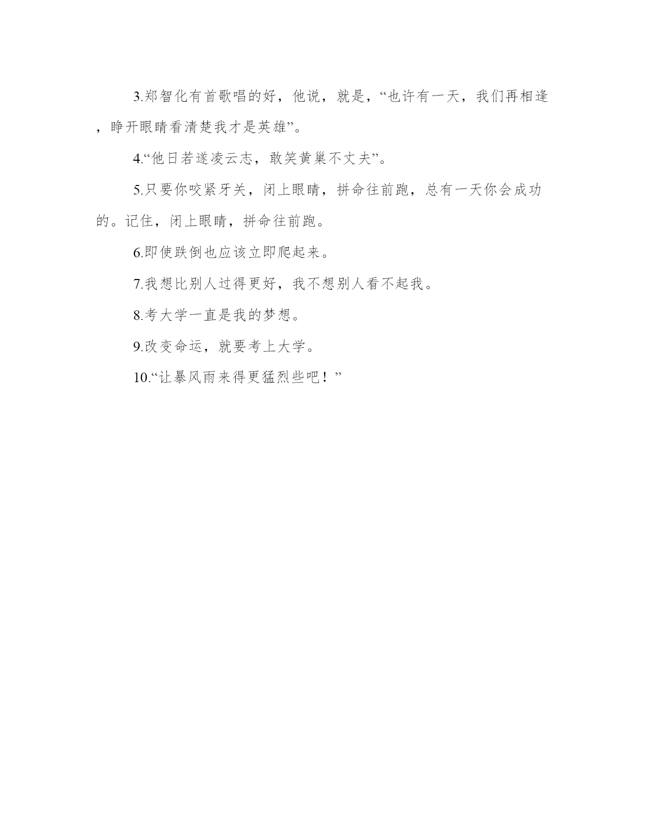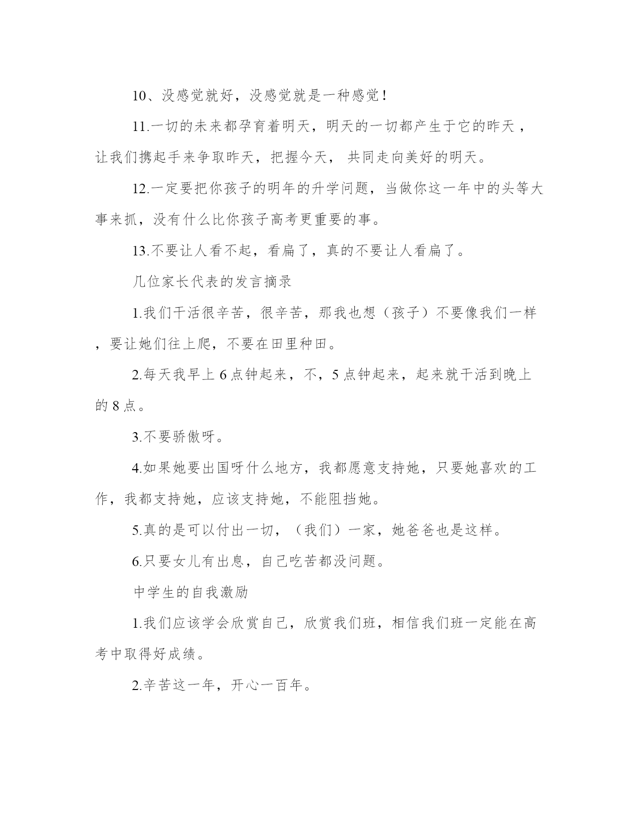 给高三同学的一些意味深长的话【www.sxqingyun.com--高三励志】给高三同学的一些意味深长的话1、如果我是你这个家境,我就像《北方的狼》里面唱的那样,我只有咬紧冷冷的牙,抱以两声长啸。2、人最大的敌人就是自己,你要战胜自己才有出息。3、你不要去问接下去会怎么样,你只需要去付出。4、我只要你给我拿出半条命来读高三就好,不要你一条命!5、我不去想是否能够成功,既然选择了远方,便只顾风雨兼程。我不去想身后会不会袭来寒风冷雨,既然目标是地平线,留给世界的只能是背影。6、不要去想家境什么的,穷人的孩子,老天可能会更关爱一点。7、如果高考结束了,你说复读可以,现在离高考还有那么远,什么都没有出来,你谈什么复读?你不觉得可笑吗?8、对平时成绩比较好、自信心很强的同学,现在要记住八个字:志在必得、舍我其谁?我考不上,还有谁考得上?我上不了北大,你上北大?笑死了!9、成绩一般,自信心不是很强的同学,要想到“吉人自有天相”,记住四个字:豁出去了!失望惧我,我还惧什么?10、没感觉就好,没感觉就是一种感觉!11.一切的未来都孕育着明天,明天的一切都产生于它的昨天,让我们携起手来争取昨天,把握今天,共同走向美好的明天。12.一定要把你孩子的明年的升学问题,当做你这一年中的头等大事来抓,没有什么比你孩子高考更重要的事。13.不要让人看不起,看扁了,真的不要让人看扁了。几位家长代表的发言摘录1.我们干活很辛苦,很辛苦,那我也想(孩子)不要像我们一样,要让她们往上爬,不要在田里种田。2.每天我早上6点钟起来,不,5点钟起来,起来就干活到晚上的8点。3.不要骄傲呀。4.如果她要出国呀什么地方,我都愿意支持她,只要她喜欢的工作,我都支持她,应该支持她,不能阻挡她。5.真的是可以付出一切,(我们)一家,她爸爸也是这样。6.只要女儿有出息,自己吃苦都没问题。中学生的自我激励1.我们应该学会欣赏自己,欣赏我们班,相信我们班一定能在高考中取得好成绩。2.辛苦这一年,开心一百年。3.郑智化有首歌唱的好,他说,就是,“也许有一天,我们再相逢,睁开眼睛看清楚我才是英雄”。4.“他日若遂凌云志,敢笑黄巢不丈夫”。5.只要你咬紧牙关,闭上眼睛,拼命往前跑,总有一天你会成功的。记住,闭上眼睛,拼命往前跑。6.即使跌倒也应该立即爬起来。7.我想比别人过得更好,我不想别人看不起我。8.考大学一直是我的梦想。9.改变命运,就要考上大学。10.“让暴风雨来得更猛烈些吧!”