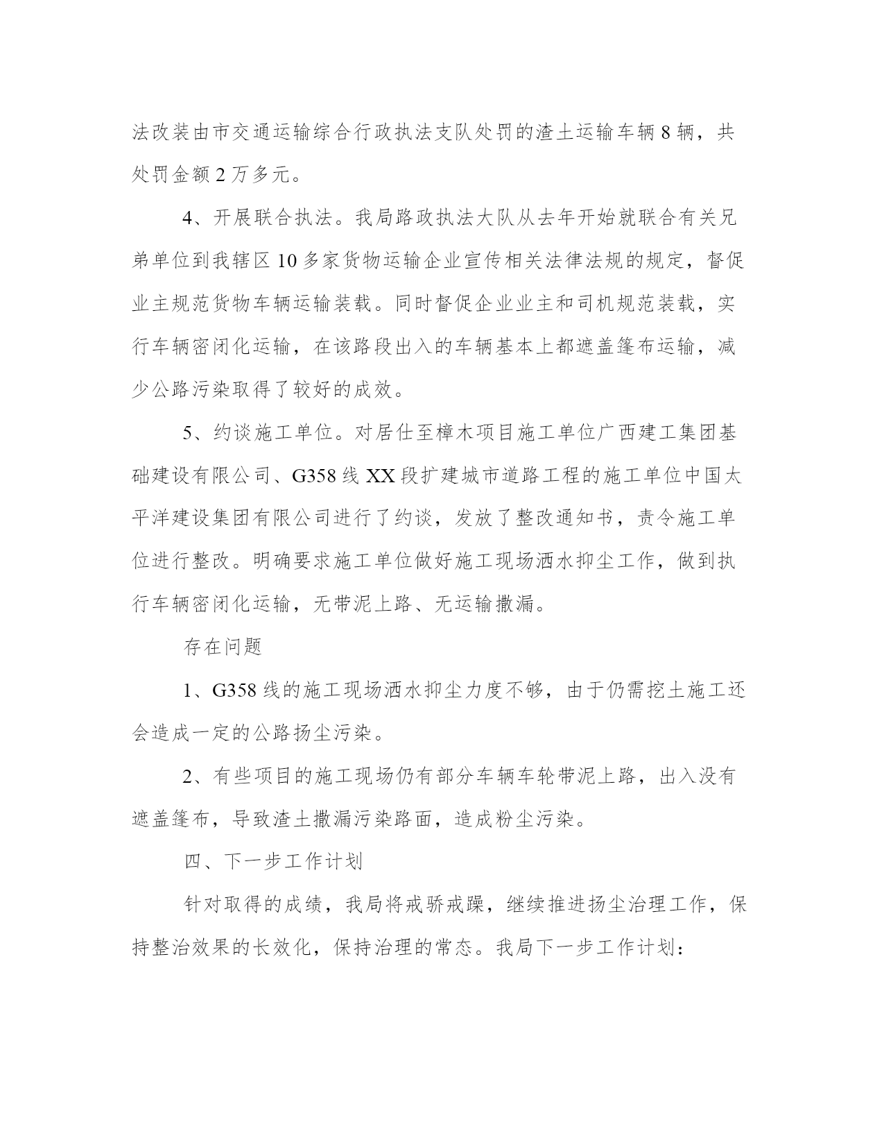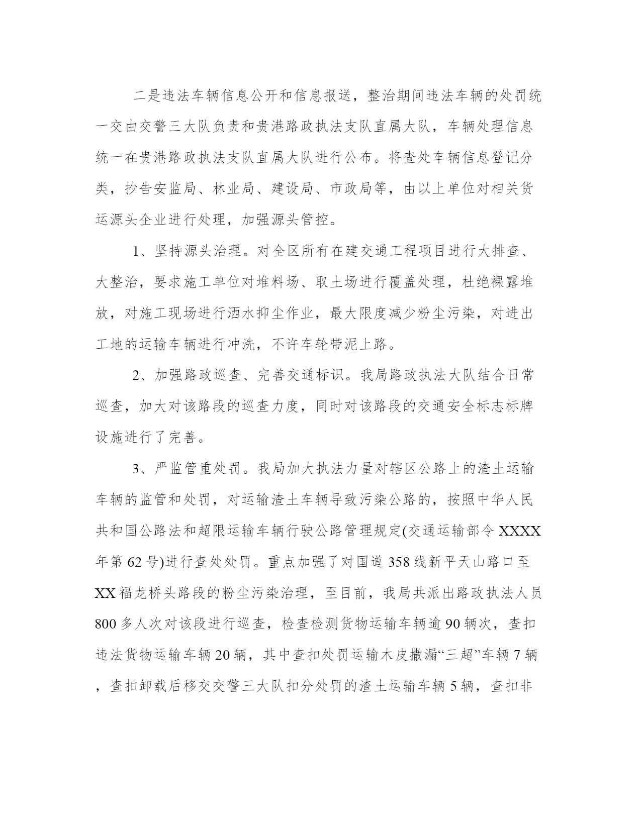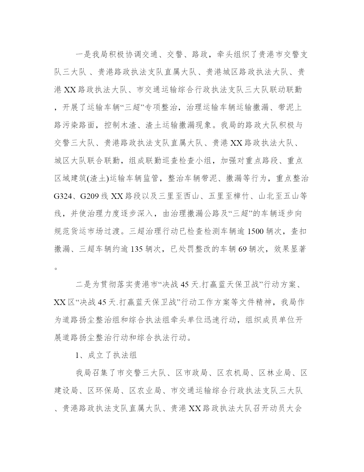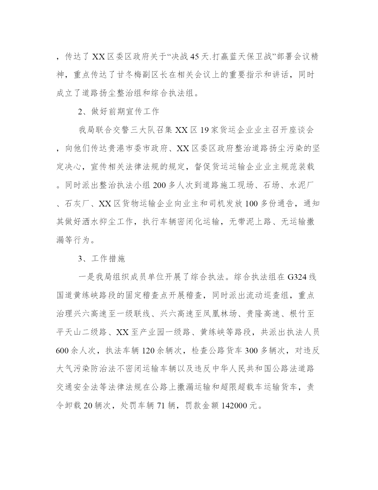 区交通局环保工作总结区交通局环保工作总结根据关于成立XX区环境保护委员会及明确其成员单位职责的通知中规定的本单位的环保职责,现将我局开展环保工作总结如下:一、领导重视,精心筹划,统一安排根据XX区委、区政府有关会议精神及文件要求,明确了大气污染防治工作对于贵港市和XX区发展的重要意义,结合我局的工作职能及实际情况,我局制定了扬尘治理的工作实施方案,成立了工作领导小组,庞贵廷局长亲自对全局人员进行动员部署有关扬尘治理工作,确保了我局在开展扬尘治理行动中思想、认识上的高度统一,提升工作效率,也确保了全区扬尘治理行动顺利开展。二、大力宣传,广泛宣传为了扎实做好我局扬尘治理工作,我局进行了广泛的宣传,发放了宣传资料,一方面每年都走访了XX区辖区石场、运输公司,宣传有关扬尘治理行动,告知其实行车辆密闭化运输,严禁渣土车辆带泥上路,污染公路;另一方面,在XX辖区国省县道向过往货物运输车辆发放宣传资料,大力宣传规范装载依法营运等相关知识,为后续工作开展打下了良好的基础。三、具体实施措施及成效一是我局积极协调交通、交警、路政,牵头组织了贵港市交警支队三大队、贵港路政执法支队直属大队、贵港城区路政执法大队、贵港XX路政执法大队、市交通运输综合行政执法支队三大队联动联勤,开展了运输车辆“三超”专项整治,治理运输车辆运输撒漏、带泥上路污染路面,控制木渣、渣土运输撒漏现象。我局的路政大队积极与交警三大队、贵港路政执法支队直属大队、贵港XX路政执法大队、城区大队联合联勤,组成联勤巡查检查小组,加强对重点路段、重点区域建筑(渣土)运输车辆监管,整治车辆带泥、撒漏等行为,重点整治G324、G209线XX路段以及三里至西山、五里至樟竹、山北至五山等线,并使治理力度逐步深入,由治理撒漏公路及“三超”的车辆逐步向规范货运市场过渡。三超治理行动已检查检测车辆逾1500辆次,查扣撒漏、三超车辆约逾135辆次,已处罚整改的车辆69辆次,效果显著。二是为贯彻落实贵港市“决战45天.打赢蓝天保卫战”行动方案、XX区“决战45天.打赢蓝天保卫战”行动工作方案等文件精神,我局作为道路扬尘整治组和综合执法组牵头单位迅速行动,组织成员单位开展道路扬尘整治行动和综合执法行动。1、成立了执法组我局召集了市交警三大队、区市政局、区农机局、区林业局、区建设局、区环保局、区农业局、市交通运输综合行政执法支队三大队、贵港路政执法支队直属大队、贵港XX路政执法大队召开动员大会,传达了XX区委区政府关于“决战45天.打赢蓝天保卫战”部署会议精神,重点传达了甘冬梅副区长在相关会议上的重要指示和讲话,同时成立了道路扬尘整治组和综合执法组。2、做好前期宣传工作我局联合交警三大队召集XX区19家货运企业业主召开座谈会,向他们传达贵港市委市政府、XX区委区政府整治道路扬尘污染的坚定决心,宣传相关法律法规的规定,督促货运运输企业业主规范装载。同时派出整治执法小组200多人次到道路施工现场、石场、水泥厂、石灰厂、XX区货物运输企业向业主和司机发放100多份通告,通知其做好洒水抑尘工作,执行车辆密闭化运输,无带泥上路、无运输撒漏等行为。3、工作措施一是我局组织成员单位开展了综合执法。综合执法组在G324线国道黄练峡路段的固定稽查点开展稽查,同时派出流动巡查组,重点治理兴六高速至一级联线、兴六高速至凤凰林场、贵隆高速、根竹至平天山二级路、XX至产业园一级路、黄练峡等路段,共派出执法人员600余人次,执法车辆120余辆次,检查公路货车300多辆次,对违反大气污染防治法不密闭运输车辆以及违反中华人民共和国公路法道路交通安全法等法律法规在公路上撒漏运输和超限超载车运输货车,责令卸载20辆次,处罚车辆71辆,罚款金额142000元。二是违法车辆信息公开和信息报送,整治期间违法车辆的处罚统一交由交警三大队负责和贵港路政执法支队直属大队,车辆处理信息统一在贵港路政执法支队直属大队进行公布。将查处车辆信息登记分类,抄告安监局、林业局、建设局、市政局等,由以上单位对相关货运源头企业进行处理,加强源头管控。1、坚持源头治理。对全区所有在建交通工程项目进行大排查、大整治,要求施工单位对堆料场、取土场进行覆盖处理,杜绝裸露堆放,对施工现场进行洒水抑尘作业,最大限度减少粉尘污染,对进出工地的运输车辆进行冲洗,不许车轮带泥上路。2、加强路政巡查、完善交通标识。我局路政执法大队结合日常巡查,加大对该路段的巡查力度,同时对该路段的交通安全标志标牌设施进行了完善。3、严监管重处罚。我局加大执法力量对辖区公路上的渣土运输车辆的监管和处罚,对运输渣土车辆导致污染公路的,按照中华人民共和国公路法和超限运输车辆行驶公路管理规定(交通运输部令XXXX年第62号)进行查处处罚。重点加强了对国道358线新平天山路口至XX福龙桥头路段的粉尘污染治理,至目前,我