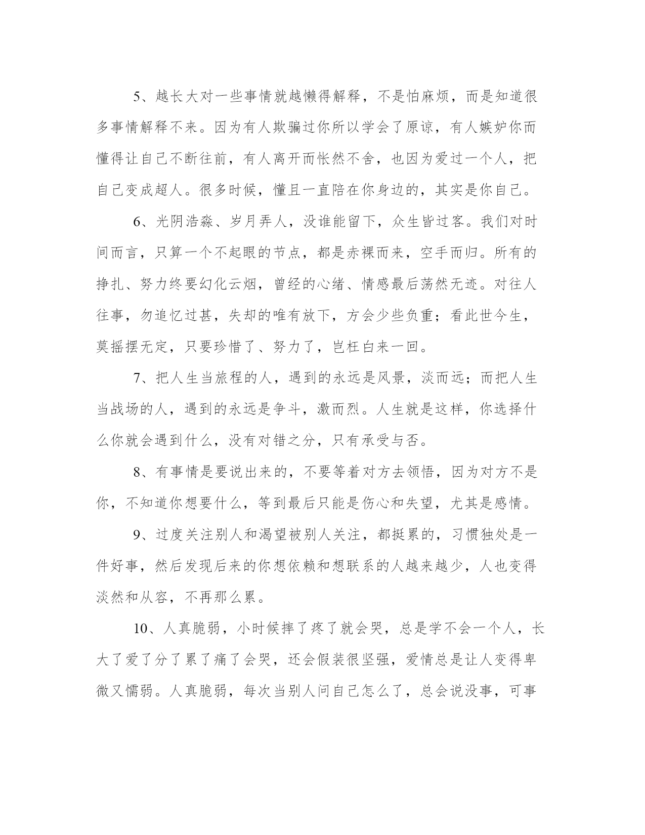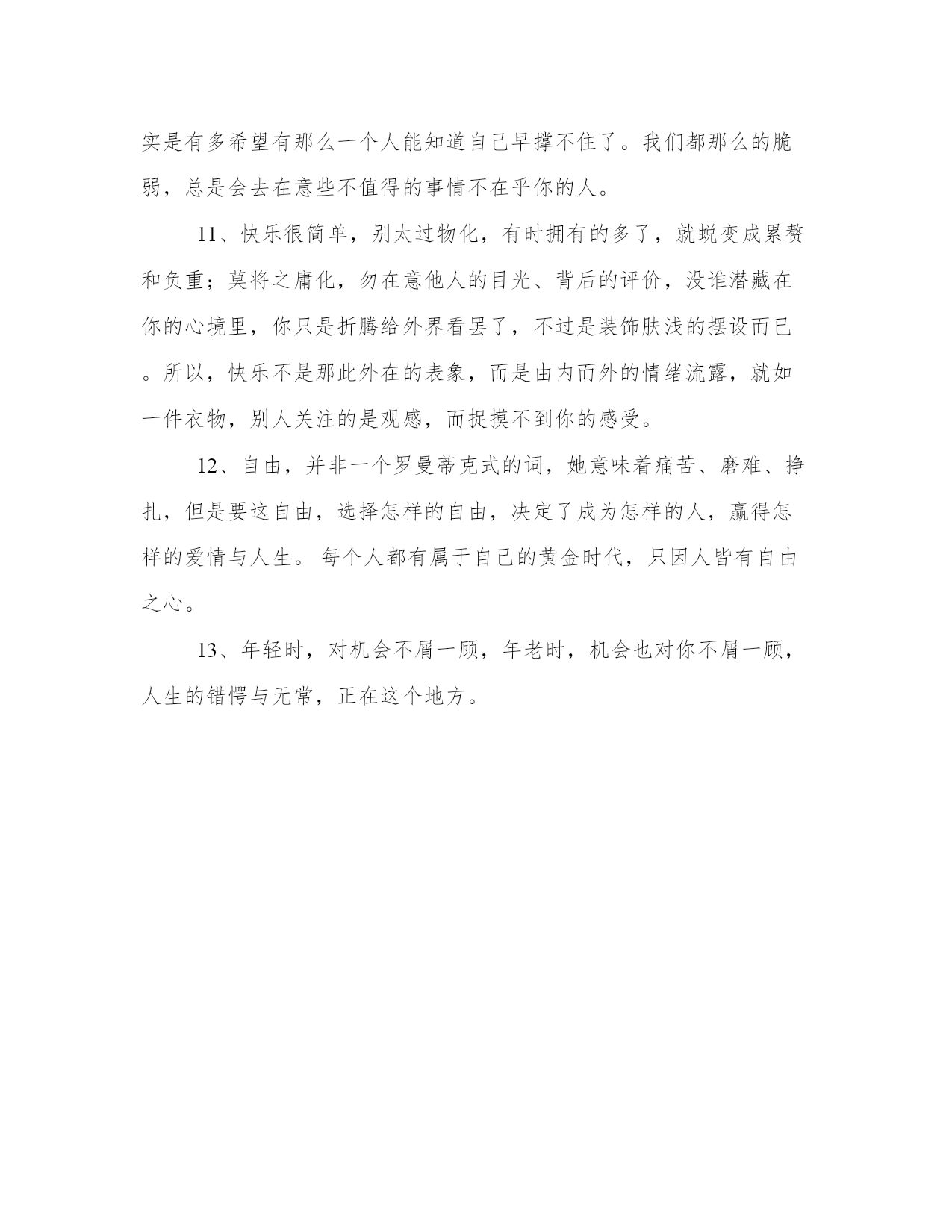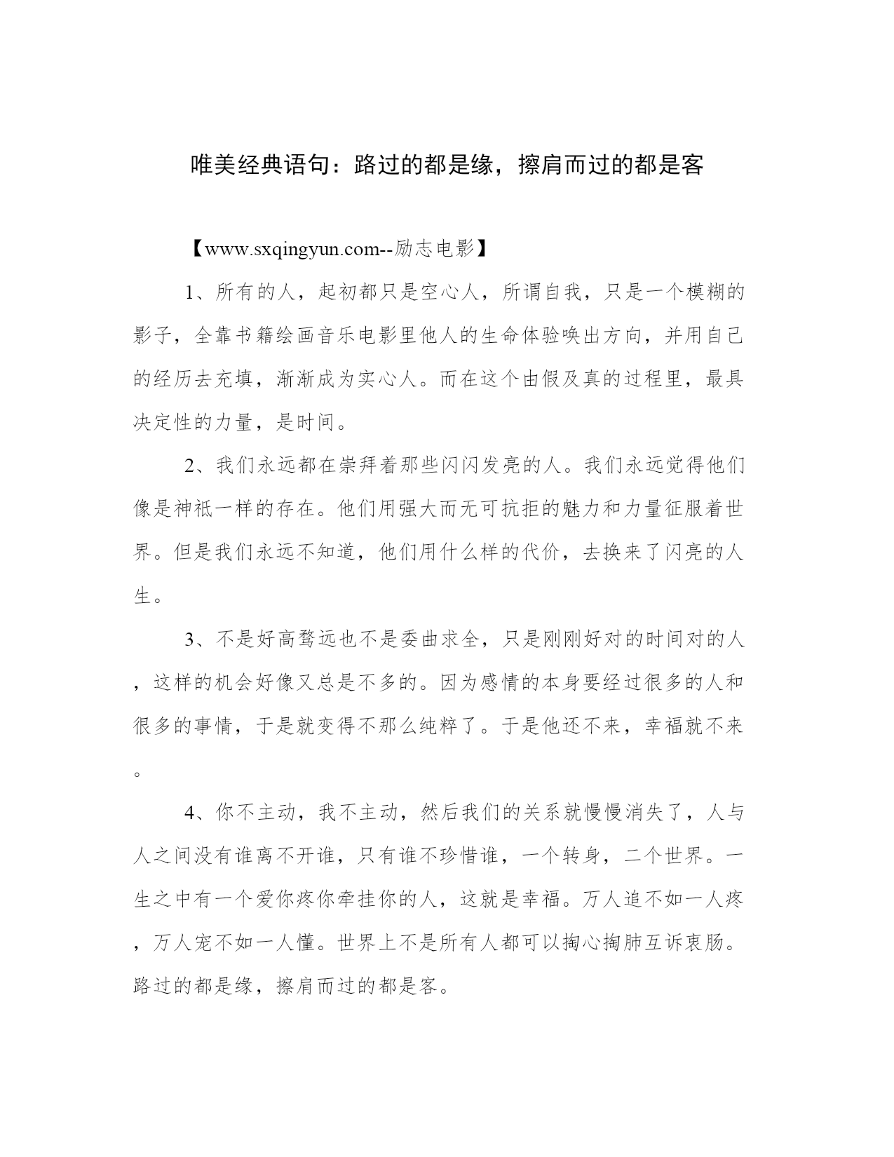 唯美经典语句:路过的都是缘,擦肩而过的都是客【www.sxqingyun.com--励志电影】1、所有的人,起初都只是空心人,所谓自我,只是一个模糊的影子,全靠书籍绘画音乐电影里他人的生命体验唤出方向,并用自己的经历去充填,渐渐成为实心人。而在这个由假及真的过程里,最具决定性的力量,是时间。2、我们永远都在崇拜着那些闪闪发亮的人。我们永远觉得他们像是神祗一样的存在。他们用强大而无可抗拒的魅力和力量征服着世界。但是我们永远不知道,他们用什么样的代价,去换来了闪亮的人生。3、不是好高骛远也不是委曲求全,只是刚刚好对的时间对的人,这样的机会好像又总是不多的。因为感情的本身要经过很多的人和很多的事情,于是就变得不那么纯粹了。于是他还不来,幸福就不来。4、你不主动,我不主动,然后我们的关系就慢慢消失了,人与人之间没有谁离不开谁,只有谁不珍惜谁,一个转身,二个世界。一生之中有一个爱你疼你牵挂你的人,这就是幸福。万人追不如一人疼,万人宠不如一人懂。世界上不是所有人都可以掏心掏肺互诉衷肠。路过的都是缘,擦肩而过的都是客。5、越长大对一些事情就越懒得解释,不是怕麻烦,而是知道很多事情解释不来。因为有人欺骗过你所以学会了原谅,有人嫉妒你而懂得让自己不断往前,有人离开而怅然不舍,也因为爱过一个人,把自己变成超人。很多时候,懂且一直陪在你身边的,其实是你自己。6、光阴浩淼、岁月弄人,没谁能留下,众生皆过客。我们对时间而言,只算一个不起眼的节点,都是赤裸而来,空手而归。所有的挣扎、努力终要幻化云烟,曾经的心绪、情感最后荡然无迹。对往人往事,勿追忆过甚,失却的唯有放下,方会少些负重;看此世今生,莫摇摆无定,只要珍惜了、努力了,岂枉白来一回。7、把人生当旅程的人,遇到的永远是风景,淡而远;而把人生当战场的人,遇到的永远是争斗,激而烈。人生就是这样,你选择什么你就会遇到什么,没有对错之分,只有承受与否。8、有事情是要说出来的,不要等着对方去领悟,因为对方不是你,不知道你想要什么,等到最后只能是伤心和失望,尤其是感情。9、过度关注别人和渴望被别人关注,都挺累的,习惯独处是一件好事,然后发现后来的你想依赖和想联系的人越来越少,人也变得淡然和从容,不再那么累。10、人真脆弱,小时候摔了疼了就会哭,总是学不会一个人,长大了爱了分了累了痛了会哭,还会假装很坚强,爱情总是让人变得卑微又懦弱。人真脆弱,每次当别人问自己怎么了,总会说没事,可事实是有多希望有那么一个人能知道自己早撑不住了。我们都那么的脆弱,总是会去在意些不值得的事情不在乎你的人。11、快乐很简单,别太过物化,有时拥有的多了,就蜕变成累赘和负重;莫将之庸化,勿在意他人的目光、背后的评价,没谁潜藏在你的心境里,你只是折腾给外界看罢了,不过是装饰肤浅的摆设而已。所以,快乐不是那此外在的表象,而是由内而外的情绪流露,就如一件衣物,别人关注的是观感,而捉摸不到你的感受。12、自由,并非一个罗曼蒂克式的词,她意味着痛苦、磨难、挣扎,但是要这自由,选择怎样的自由,决定了成为怎样的人,赢得怎样的爱情与人生。每个人都有属于自己的黄金时代,只因人皆有自由之心。13、年轻时,对机会不屑一顾,年老时,机会也对你不屑一顾,人生的错愕与无常,正在这个地方。