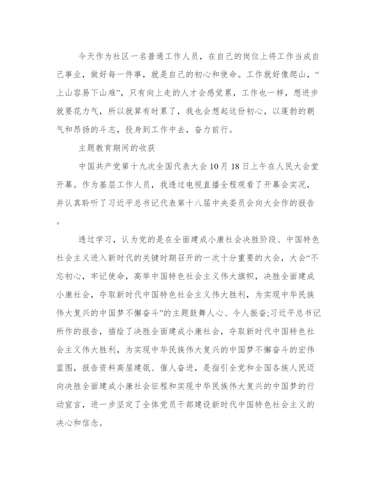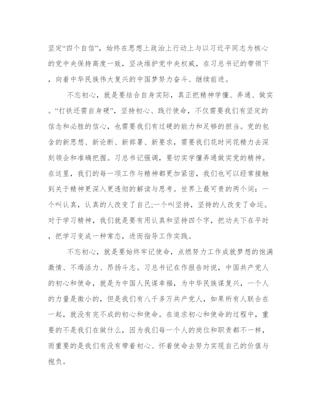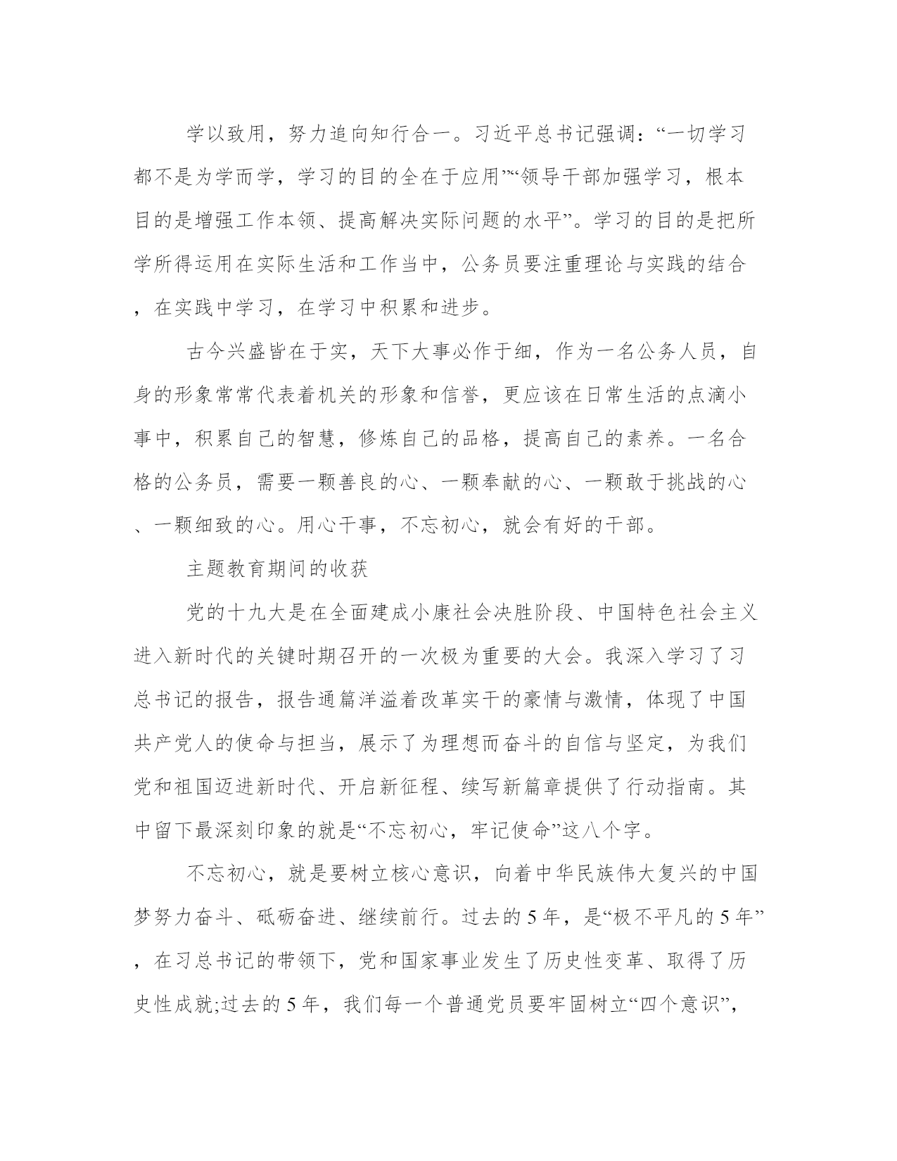主题教育期间的收获不忘初心、牢记使命,主题活动开展以来,全党上下都在学习。开展主题最重要的任务,就是用习近平新时代中国特色社会主义思想武装全党,深入贯彻党的十九大精神,推动全党更加自觉地为实现新时代党的历史使命不懈奋斗。本站精心为大家整理了主题教育期间的收获,希望对你有帮助。主题教育期间的收获公务员是行使国家行政权力、执行国家公务的人员,基本的职责就是为人民服务。公务员在工作岗位上要如何行使好自身权力,如何当好人民公仆事关人民群众的切身利益,如何当好一名合格的公务员至关重要。习近平总书记在“不忘初心,牢记使命”主题教育会上指出,开展主题教育要牢牢把握守初心、担使命、找差距、抓落实的总要求。在新时代的新要求下,一名公务员的初心是什么应当细细思量。敢于挑战,努力提升综合能力。顺应新时代的要求,公务人员应具备各方面的素质,能够胜任多个角色的工作,这就需要公务员在学习的过程中注重知识面的扩展,做到全面发展综合提高。因此,公务员要勇于面对一切挑战,勇于直面遇到的所有问题,要在解决困难的过程中学会思考,才能有所收获、取得进步。学以致用,努力追向知行合一。习近平总书记强调:“一切学习都不是为学而学,学习的目的全在于应用”“领导干部加强学习,根本目的是增强工作本领、提高解决实际问题的水平”。学习的目的是把所学所得运用在实际生活和工作当中,公务员要注重理论与实践的结合,在实践中学习,在学习中积累和进步。古今兴盛皆在于实,天下大事必作于细,作为一名公务人员,自身的形象常常代表着机关的形象和信誉,更应该在日常生活的点滴小事中,积累自己的智慧,修炼自己的品格,提高自己的素养。一名合格的公务员,需要一颗善良的心、一颗奉献的心、一颗敢于挑战的心、一颗细致的心。用心干事,不忘初心,就会有好的干部。主题教育期间的收获党的十九大是在全面建成小康社会决胜阶段、中国特色社会主义进入新时代的关键时期召开的一次极为重要的大会。我深入学习了习总书记的报告,报告通篇洋溢着改革实干的豪情与激情,体现了中国共产党人的使命与担当,展示了为理想而奋斗的自信与坚定,为我们党和祖国迈进新时代、开启新征程、续写新篇章提供了行动指南。其中留下最深刻印象的就是“不忘初心,牢记使命”这八个字。不忘初心,就是要树立核心意识,向着中华民族伟大复兴的中国梦努力奋斗、砥砺奋进、继续前行。过去的5年,是“极不平凡的5年”,在习总书记的带领下,党和国家事业发生了历史性变革、取得了历史性成就;过去的5年,我们每一个普通党员要牢固树立“四个意识”,坚定“四个自信”,始终在思想上政治上行动上与以习近平同志为核心的党中央保持高度一致,坚决维护党中央权威,在习总书记的带领下,向着中华民族伟大复兴的中国梦努力奋斗、继续前进。不忘初心,就是要结合自身实际,真正把精神学懂、弄通、做实。“打铁还需自身硬”,坚持初心、践行使命,不仅需要我们有坚定的信念和必胜的信心,也需要我们有过硬的能力和足够的担当。党的包含的新思想、新论断、新部署、新要求,需要我们花时间花精力去深刻领会和准确把握。习总书记强调,要切实学懂弄通做实党的精神。在这里,我们的每一项工作与精神都更加紧密,我们也可以经常接触到关于精神更深入更透彻的解读与思考。世界上最可贵的两个词:一个叫认真,认真的人改变了自己;一个叫坚持,坚持的人改变了命运。对于学习精神,我们就是要有用认真和坚持四个字,把功夫下在平时,把学习变成一种常态,进而指导工作实践。不忘初心,就是要始终牢记使命,点燃努力工作成就梦想的饱满激情、不竭活力、昂扬斗志。习总书记在作报告时说,中国共产党人的初心和使命,就是为中国人民谋幸福,为中华民族谋复兴,一个人的力量是微小的,但是我们有八千多万共产党人,如果所有人联合在一起,就没有完不成的初心和使命。在追求初心和使命的过程中,重要的不是我们在做什么,因为我们每一个人的岗位和职责都不一样,而重要的是我们有没有带着初心、怀着使命去努力实现自己的价值与抱负。今天作为社区一名普通工作人员,在自己的岗位上将工作当成自己事业,做好每一件事,就是自己的初心和使命。工作就好像爬山,“上山容易下山难”,只有向上走的人才会感觉累,工作也一样,想进步就要花力气,所以就算有时累了,我也会想起这份初心,以蓬勃的朝气和昂扬的斗志,投身到工作中去,奋力前行。主题教育期间的收获中国共产党第十九次全国代表大会10月18日上午在人民大会堂开幕。作为基层工作人员,我透过电视直播全程观看了开幕会实况,并认真聆听了习近平总书记代表第十八届中央委员会向大会作的报告。透过学习,认为党的是在全面建成小康社会决胜阶段、中国特色社会主义进入新时代的关键时期召开的一次十分重要的大会,大会“不忘初心,牢记使命,高举中国特色社会主义伟大旗帜,决胜全面建成小康社会,夺取新时代中国特色社会主义伟大胜利,为实现中华民族伟大
