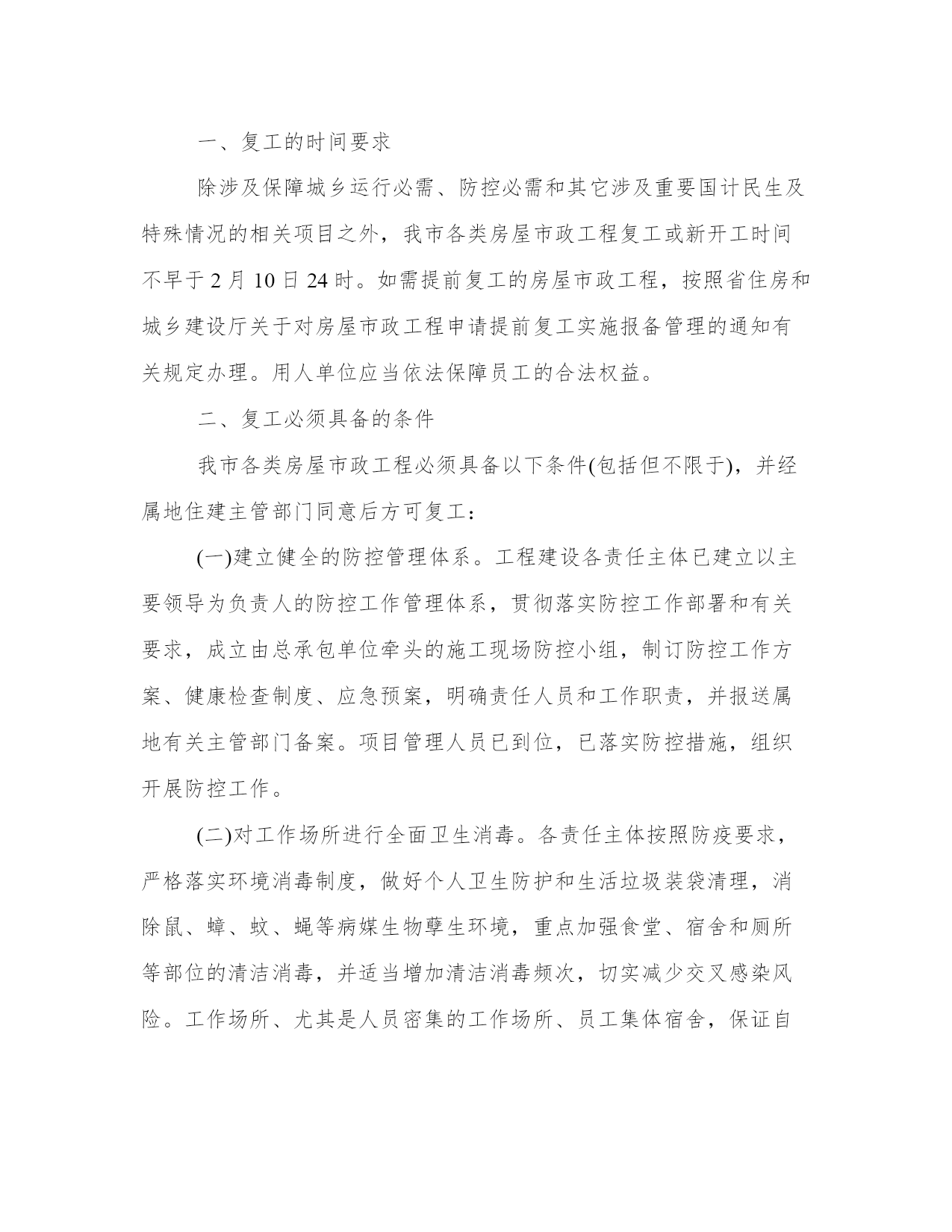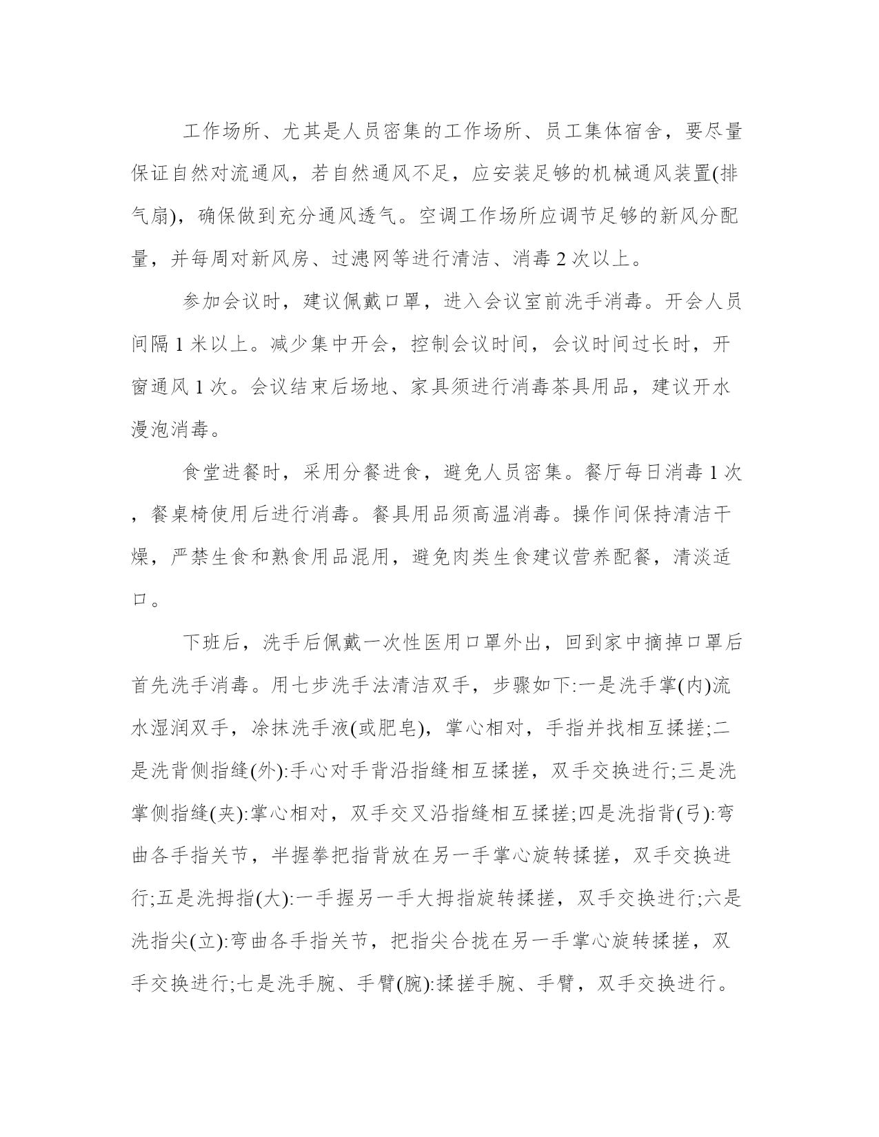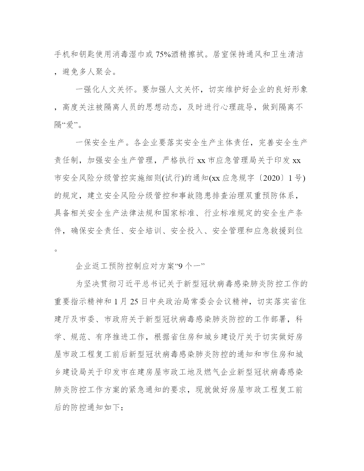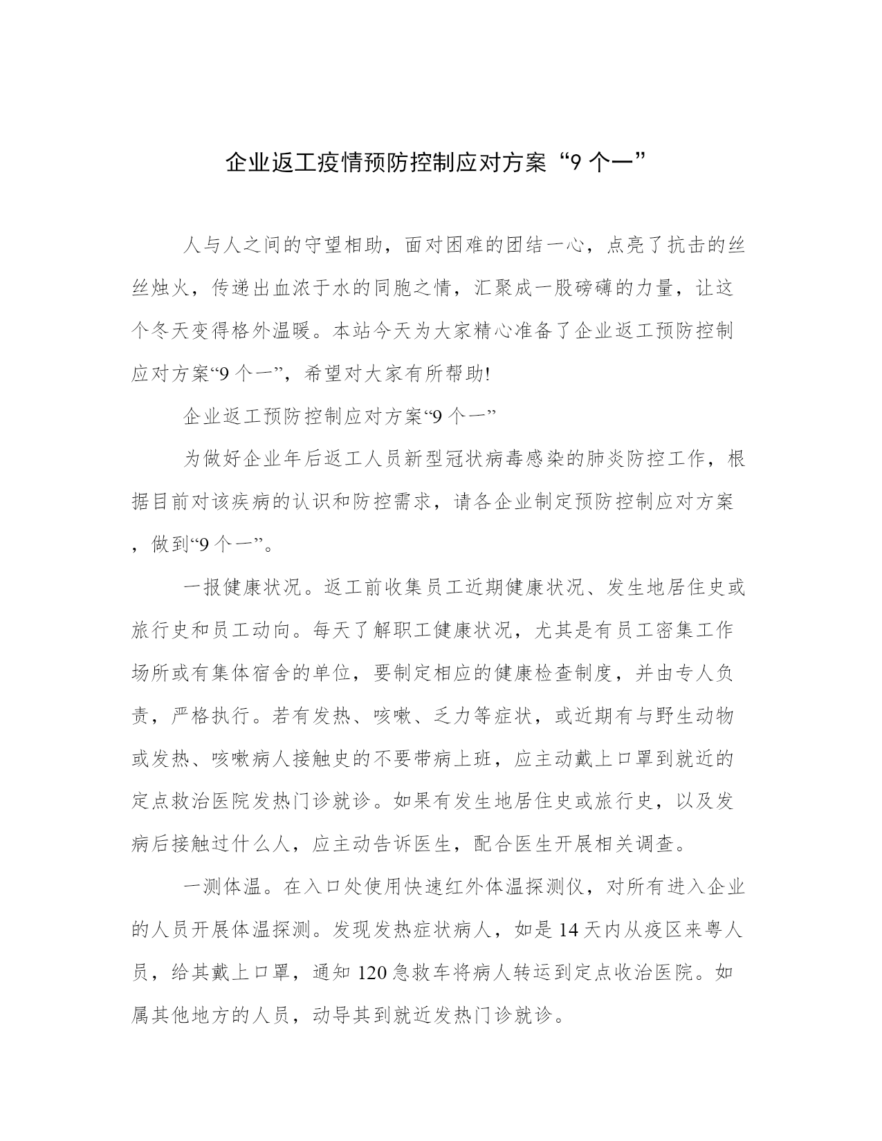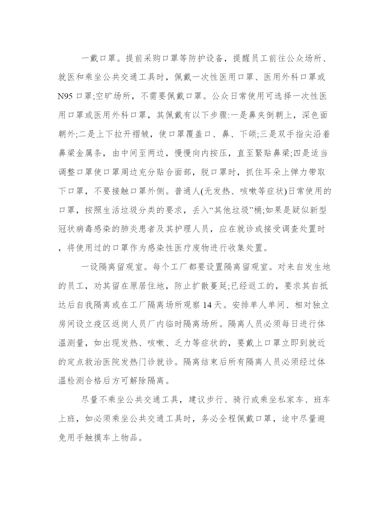 企业返工疫情预防控制应对方案“9个一”人与人之间的守望相助,面对困难的团结一心,点亮了抗击的丝丝烛火,传递出血浓于水的同胞之情,汇聚成一股磅礴的力量,让这个冬天变得格外温暖。本站今天为大家精心准备了企业返工预防控制应对方案“9个一”,希望对大家有所帮助!企业返工预防控制应对方案“9个一”为做好企业年后返工人员新型冠状病毒感染的肺炎防控工作,根据目前对该疾病的认识和防控需求,请各企业制定预防控制应对方案,做到“9个一”。一报健康状况。返工前收集员工近期健康状况、发生地居住史或旅行史和员工动向。每天了解职工健康状况,尤其是有员工密集工作场所或有集体宿舍的单位,要制定相应的健康检查制度,并由专人负责,严格执行。若有发热、咳嗽、乏力等症状,或近期有与野生动物或发热、咳嗽病人接触史的不要带病上班,应主动戴上口罩到就近的定点救治医院发热门诊就诊。如果有发生地居住史或旅行史,以及发病后接触过什么人,应主动告诉医生,配合医生开展相关调查。一测体温。在入口处使用快速红外体温探测仪,对所有进入企业的人员开展体温探测。发现发热症状病人,如是14天内从疫区来粤人员,给其戴上口罩,通知120急救车将病人转运到定点收治医院。如属其他地方的人员,动导其到就近发热门诊就诊。一戴口罩。提前采购口罩等防护设备,提醒员工前往公众场所、就医和乘坐公共交通工具时,佩戴一次性医用口罩、医用外科口罩或N95口罩;空旷场所,不需要佩戴口罩。公众日常使用可选择一次性医用口罩或医用外科口罩,其佩戴有以下步骤:一是鼻夹倒朝上,深色面朝外;二是上下拉开褶皱,使口罩覆盖口、鼻、下颌;三是双手指尖沿着鼻梁金属条,由中间至两边,慢慢向内按压,直至緊贴鼻梁;四是适当调整口罩使口罩周边充分贴合面部,脱口罩时,抓住耳朵上弹力带取下口罩,不要接触口罩外侧。普通人(无发热、咳嗽等症状)日常使用的口罩,按照生活垃圾分类的要求,丢入“其他垃圾”桶;如果是疑似新型冠状病毒感染的肺炎患者及其护理人员,应在就诊或接受调查处置时,将使用过的口罩作为感染性医疗废物进行收集处置。一设隔离留观室。每个工厂都要设置隔离留观室。对来自发生地的员工,劝其留在原居住地,防止扩散蔓延;已经返工的,要求其自抵达后自我隔离或在工厂隔离场所观察14天。安排单人单间、相对独立房间设立疫区返岗人员厂内临时隔离场所。隔离人员必须每日进行体温测量,如出现发热、咳嗽、乏力等症状的,要戴上口罩立即到就近的定点救治医院发热门诊就诊。隔离结束后所有隔离人员必须经过体温检测合格后方可解除隔离。尽量不乘坐公共交通工具,建议步行、骑行或乘坐私家车、班车上班,如必须乘坐公共交通工具时,务必全程佩戴口罩,途中尽量避免用手触摸车上物品。工作场所、尤其是人员密集的工作场所、员工集体宿舍,要尽量保证自然对流通风,若自然通风不足,应安装足够的机械通风装置(排气扇),确保做到充分通风透气。空调工作场所应调节足够的新风分配量,并每周对新风房、过漶网等进行清洁、消毒2次以上。参加会议时,建议佩戴口罩,进入会议室前洗手消毒。开会人员间隔1米以上。减少集中开会,控制会议时间,会议时间过长时,开窗通风1次。会议结束后场地、家具须进行消毒茶具用品,建议开水漫泡消毒。食堂进餐时,采用分餐进食,避免人员密集。餐厅每日消毒1次,餐桌椅使用后进行消毒。餐具用品须高温消毒。操作间保持清洁干燥,严禁生食和熟食用品混用,避免肉类生食建议营养配餐,清淡适口。下班后,洗手后佩戴一次性医用口罩外出,回到家中摘掉口罩后首先洗手消毒。用七步洗手法清洁双手,步骤如下:一是洗手掌(内)流水湿润双手,凃抹洗手液(或肥皂),掌心相对,手指并找相互揉搓;二是洗背侧指缝(外):手心对手背沿指缝相互揉搓,双手交换进行;三是洗掌侧指缝(夹):掌心相对,双手交叉沿指缝相互揉搓;四是洗指背(弓):弯曲各手指关节,半握拳把指背放在另一手掌心旋转揉搓,双手交换进行;五是洗拇指(大):一手握另一手大拇指旋转揉搓,双手交换进行;六是洗指尖(立):弯曲各手指关节,把指尖合拢在另一手掌心旋转揉搓,双手交换进行;七是洗手腕、手臂(腕):揉搓手腕、手臂,双手交换进行。手机和钥匙使用消毒湿巾或75%酒精擦拭。居室保持通风和卫生清洁,避免多人聚会。一强化人文关怀。要加强人文关怀,切实维护好企业的良好形象,高度关注被隔离人员的思想动态,及时进行心理疏导,做到隔离不隔“爱”。一保安全生产。各企业要落实安全生产主体责任,完善安全生产责任制,加强安全生产管理,严格执行xx市应急管理局关于印发xx市安全风险分级管控实施细则(试行)的通知(xx应急规字〔2020〕1号)的规定,建立安全风险分级管控和事故隐患排查治理双重预防体系,具备相关安全生产法律法规和国家标准、行业标准规定的安全生产条件,确保安全责任、安全培训、安全投入、安全管理和应急救援到位。企业
