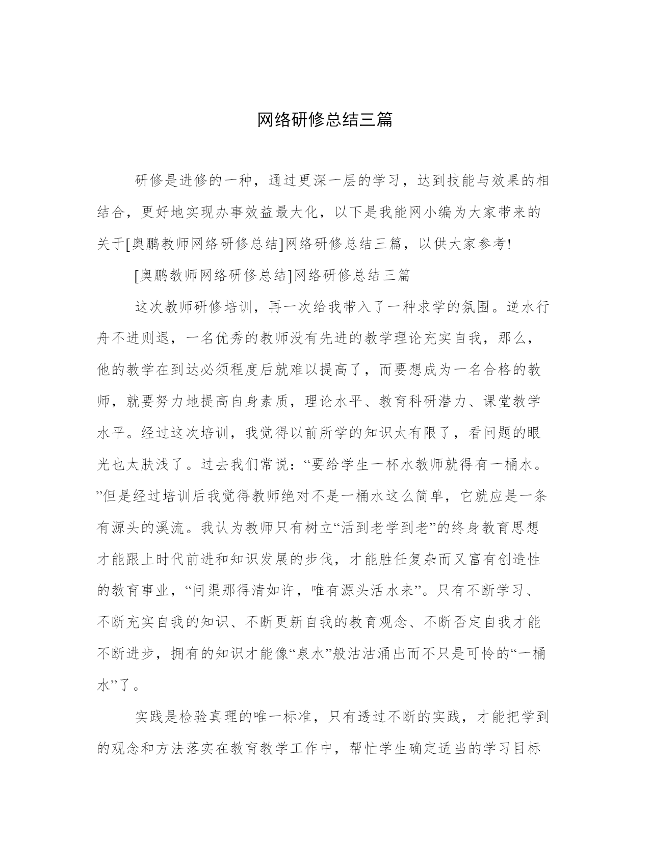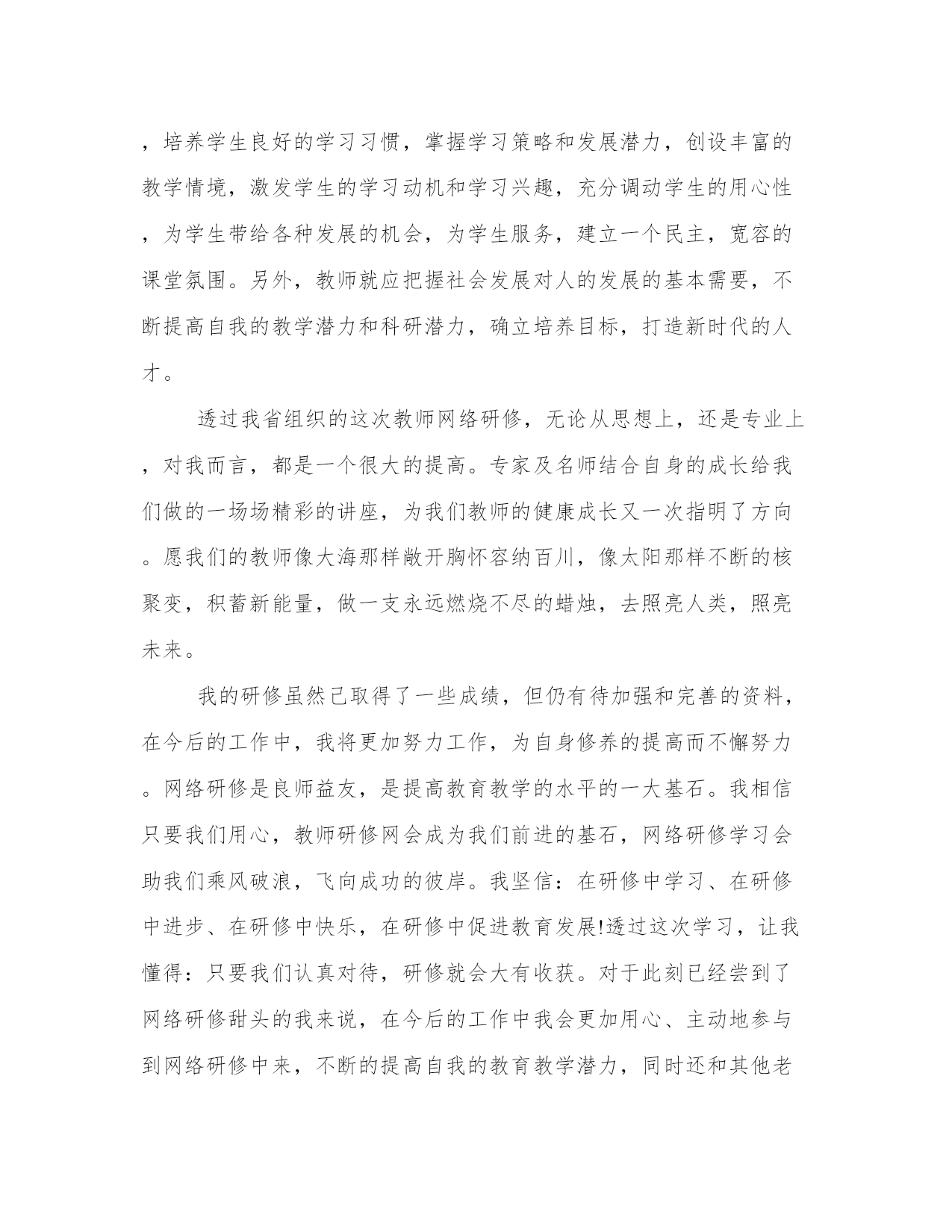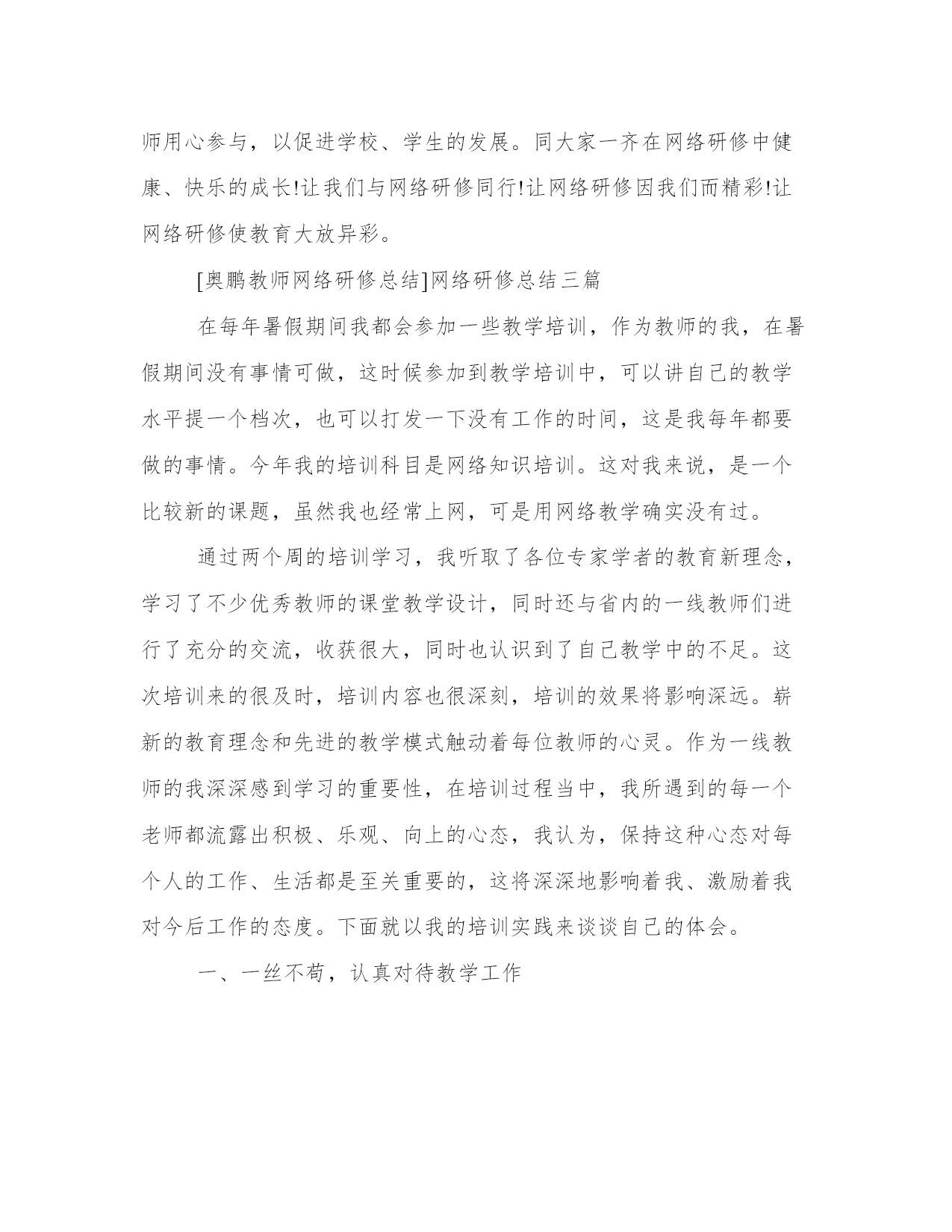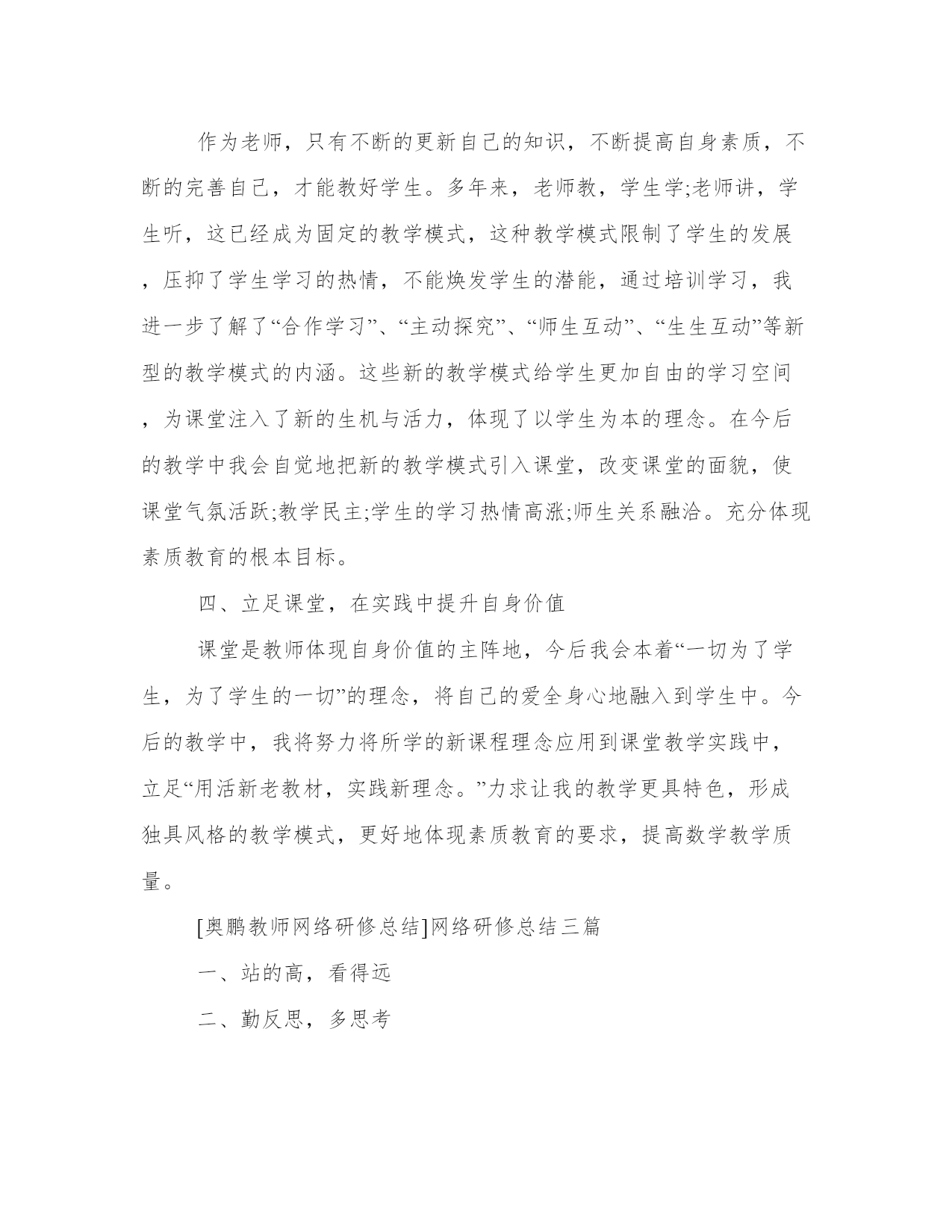 网络研修总结三篇研修是进修的一种,通过更深一层的学习,达到技能与效果的相结合,更好地实现办事效益最大化,以下是我能网小编为大家带来的关于[奥鹏教师网络研修总结]网络研修总结三篇,以供大家参考![奥鹏教师网络研修总结]网络研修总结三篇这次教师研修培训,再一次给我带入了一种求学的氛围。逆水行舟不进则退,一名优秀的教师没有先进的教学理论充实自我,那么,他的教学在到达必须程度后就难以提高了,而要想成为一名合格的教师,就要努力地提高自身素质,理论水平、教育科研潜力、课堂教学水平。经过这次培训,我觉得以前所学的知识太有限了,看问题的眼光也太肤浅了。过去我们常说:“要给学生一杯水教师就得有一桶水。”但是经过培训后我觉得教师绝对不是一桶水这么简单,它就应是一条有源头的溪流。我认为教师只有树立“活到老学到老”的终身教育思想才能跟上时代前进和知识发展的步伐,才能胜任复杂而又富有创造性的教育事业,“问渠那得清如许,唯有源头活水来”。只有不断学习、不断充实自我的知识、不断更新自我的教育观念、不断否定自我才能不断进步,拥有的知识才能像“泉水”般沽沽涌出而不只是可怜的“一桶水”了。实践是检验真理的唯一标准,只有透过不断的实践,才能把学到的观念和方法落实在教育教学工作中,帮忙学生确定适当的学习目标,培养学生良好的学习习惯,掌握学习策略和发展潜力,创设丰富的教学情境,激发学生的学习动机和学习兴趣,充分调动学生的用心性,为学生带给各种发展的机会,为学生服务,建立一个民主,宽容的课堂氛围。另外,教师就应把握社会发展对人的发展的基本需要,不断提高自我的教学潜力和科研潜力,确立培养目标,打造新时代的人才。透过我省组织的这次教师网络研修,无论从思想上,还是专业上,对我而言,都是一个很大的提高。专家及名师结合自身的成长给我们做的一场场精彩的讲座,为我们教师的健康成长又一次指明了方向。愿我们的教师像大海那样敞开胸怀容纳百川,像太阳那样不断的核聚变,积蓄新能量,做一支永远燃烧不尽的蜡烛,去照亮人类,照亮未来。我的研修虽然己取得了一些成绩,但仍有待加强和完善的资料,在今后的工作中,我将更加努力工作,为自身修养的提高而不懈努力。网络研修是良师益友,是提高教育教学的水平的一大基石。我相信只要我们用心,教师研修网会成为我们前进的基石,网络研修学习会助我们乘风破浪,飞向成功的彼岸。我坚信:在研修中学习、在研修中进步、在研修中快乐,在研修中促进教育发展!透过这次学习,让我懂得:只要我们认真对待,研修就会大有收获。对于此刻已经尝到了网络研修甜头的我来说,在今后的工作中我会更加用心、主动地参与到网络研修中来,不断的提高自我的教育教学潜力,同时还和其他老师用心参与,以促进学校、学生的发展。同大家一齐在网络研修中健康、快乐的成长!让我们与网络研修同行!让网络研修因我们而精彩!让网络研修使教育大放异彩。[奥鹏教师网络研修总结]网络研修总结三篇在每年暑假期间我都会参加一些教学培训,作为教师的我,在暑假期间没有事情可做,这时候参加到教学培训中,可以讲自己的教学水平提一个档次,也可以打发一下没有工作的时间,这是我每年都要做的事情。今年我的培训科目是网络知识培训。这对我来说,是一个比较新的课题,虽然我也经常上网,可是用网络教学确实没有过。通过两个周的培训学习,我听取了各位专家学者的教育新理念,学习了不少优秀教师的课堂教学设计,同时还与省内的一线教师们进行了充分的交流,收获很大,同时也认识到了自己教学中的不足。这次培训来的很及时,培训内容也很深刻,培训的效果将影响深远。崭新的教育理念和先进的教学模式触动着每位教师的心灵。作为一线教师的我深深感到学习的重要性,在培训过程当中,我所遇到的每一个老师都流露出积极、乐观、向上的心态,我认为,保持这种心态对每个人的工作、生活都是至关重要的,这将深深地影响着我、激励着我对今后工作的态度。下面就以我的培训实践来谈谈自己的体会。一、一丝不苟,认真对待教学工作(1)爱岗敬业。要热爱教育事业,要对教育事业尽心尽力,积极进取,努力创新。尽心尽责地完成每一项教学任务,不求最好,但求更好。(2)尊重学生。每一位学生都渴望得到老师的理解和尊重。我们要把学生当作平等的人看待,不能把学生当下级随便呵斥。只有我们把学生看重了,学生得到老师的尊重了,他们才会尊重老师,愿意学习这个老师所传授的各种知识。(3)要有强烈的责任心。作为一个人民教师,有强烈的责任心是最基本的,这种责任心主要体现在对全体学生负责。教师教书育人应是面对全体学生。我们当教师一踏进校门的那一天起,便对每一位学生负起责任,必须关爱学生,尊重学生人格,促进他们在品德、智力、体质各方面都得到发展。(4)以身作则。教师的言行对学生的思想、行为和品质具有潜移默化的影响,教师的一言一行,学生均喜欢模仿,这将给学生成长带来一生的影响。因此