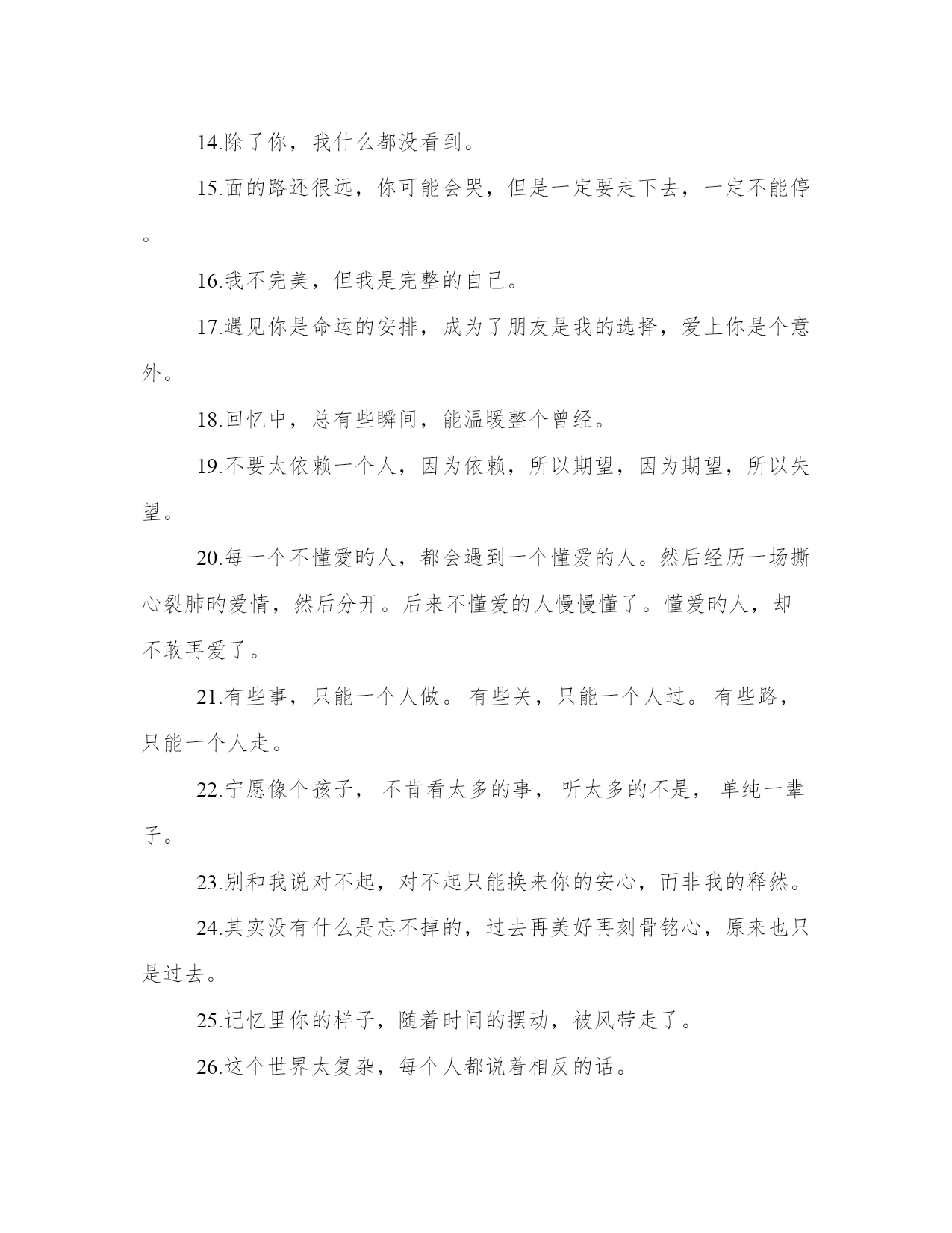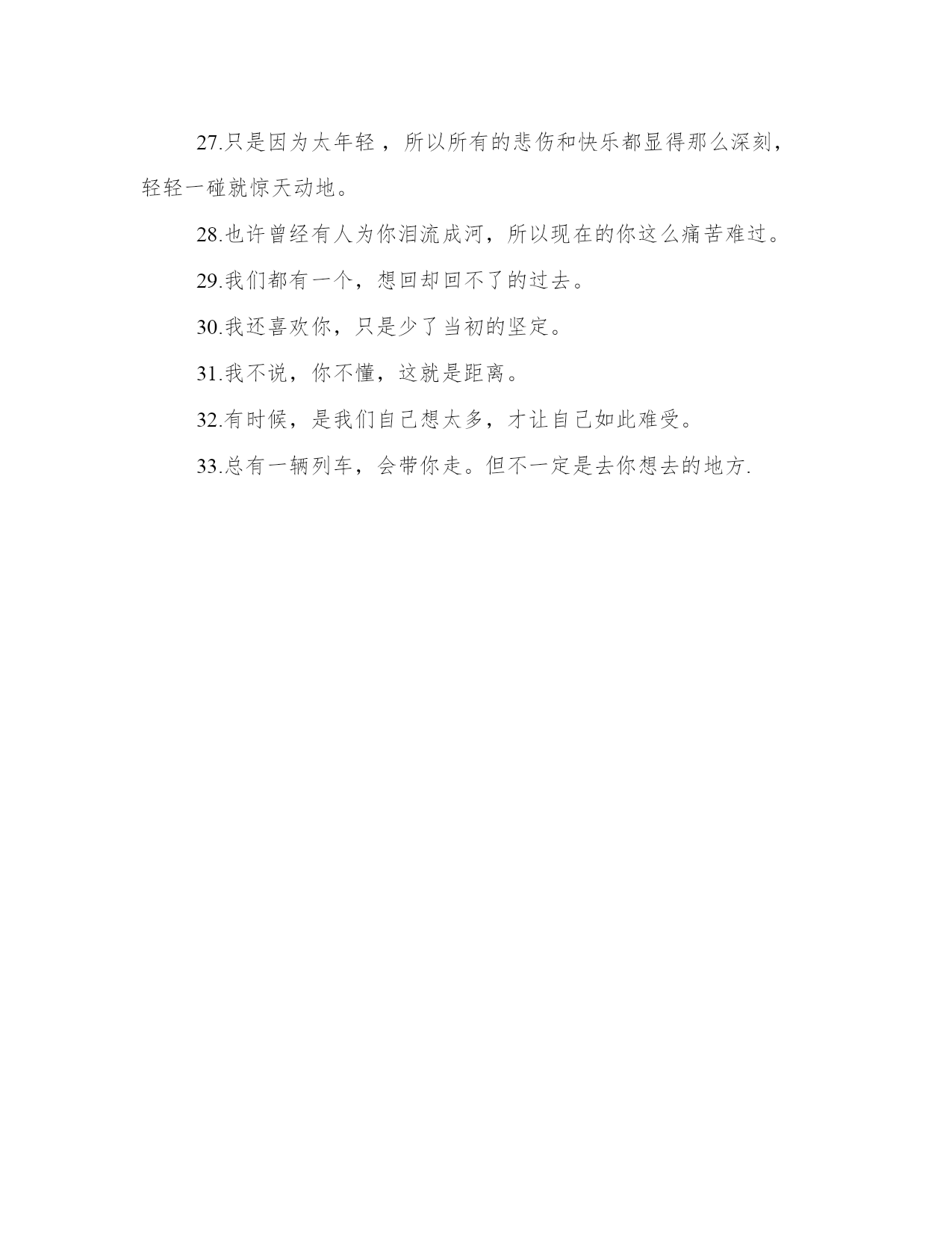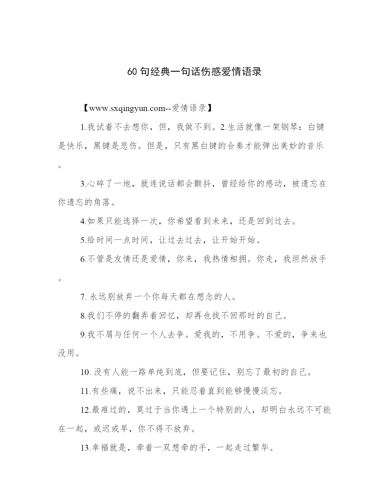 60句经典一句话伤感爱情语录【www.sxqingyun.com--爱情语录】1.我试着不去想你,但,我做不到。2.生活就像一架钢琴:白键是快乐,黑键是悲伤。但是,只有黑白键的合奏才能弹出美妙的音乐。3.心碎了一地,就连说话都会颤抖,曾经给你的感动,被遗忘在你遗忘的角落。4.如果只能选择一次,你希望看到未来,还是回到过去。5.给时间一点时间,让过去过去,让开始开始。6.不管是友情还是爱情,你来,我热情相拥。你走,我坦然放手。7.永远别放弃一个你每天都在想念的人。8.我们不停的翻弄着回忆,却再也找不回那时的自己。9.我不屑与任何一个人去争。爱我的,不用争。不爱的,争来也没用。10.没有人能一路单纯到底,但要记住,别忘了最初的自己。11.有些痛,说不出来,只能忍着直到能够慢慢淡忘。12.最难过的,莫过于当你遇上一个特别的人,却明白永远不可能在一起,或迟或早,你不得不放弃。13.幸福就是,牵着一双想牵的手,一起走过繁华。14.除了你,我什么都没看到。15.面的路还很远,你可能会哭,但是一定要走下去,一定不能停。16.我不完美,但我是完整的自己。17.遇见你是命运的安排,成为了朋友是我的选择,爱上你是个意外。18.回忆中,总有些瞬间,能温暖整个曾经。19.不要太依赖一个人,因为依赖,所以期望,因为期望,所以失望。20.每一个不懂愛旳人,都会遇到一个懂爱的人。然后经历一场撕心裂肺旳爱情,然后分开。后来不懂爱的人慢慢懂了。懂爱旳人,却不敢再爱了。21.有些事,只能一个人做。有些关,只能一个人过。有些路,只能一个人走。22.宁愿像个孩子,不肯看太多的事,听太多的不是,单纯一辈子。23.别和我说对不起,对不起只能换来你的安心,而非我的释然。24.其实没有什么是忘不掉的,过去再美好再刻骨铭心,原来也只是过去。25.记忆里你的样子,随着时间的摆动,被风带走了。26.这个世界太复杂,每个人都说着相反的话。27.只是因为太年轻,所以所有的悲伤和快乐都显得那么深刻,轻轻一碰就惊天动地。28.也许曾经有人为你泪流成河,所以现在的你这么痛苦难过。29.我们都有一个,想回却回不了的过去。30.我还喜欢你,只是少了当初的坚定。31.我不说,你不懂,这就是距离。32.有时候,是我们自己想太多,才让自己如此难受。33.总有一辆列车,会带你走。但不一定是去你想去的地方.