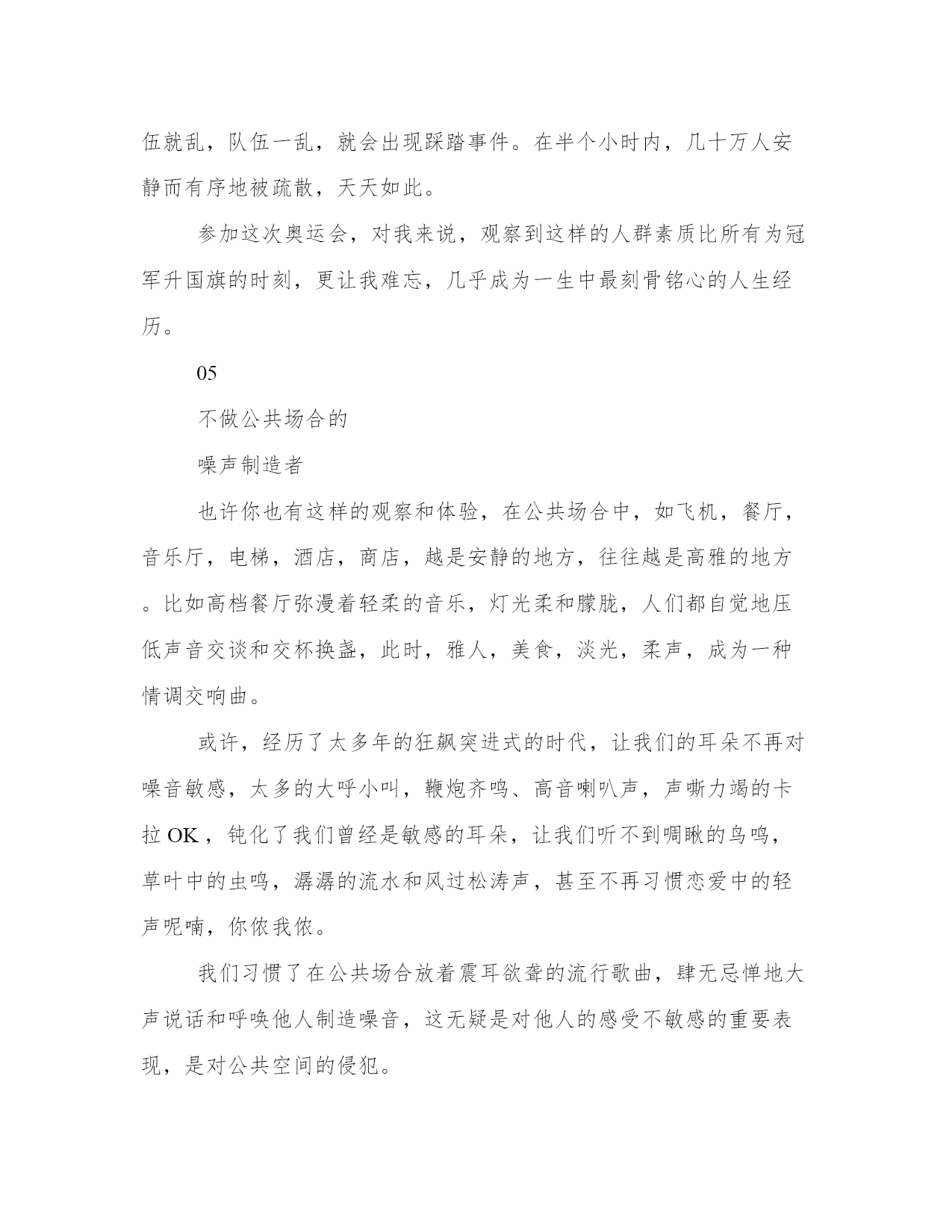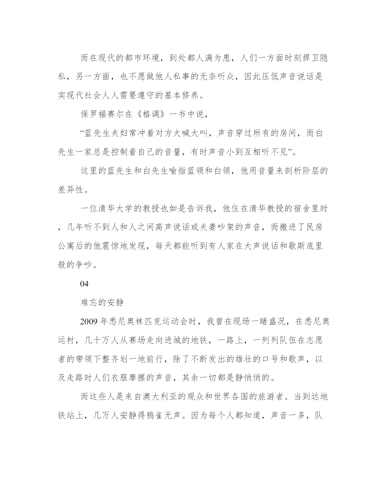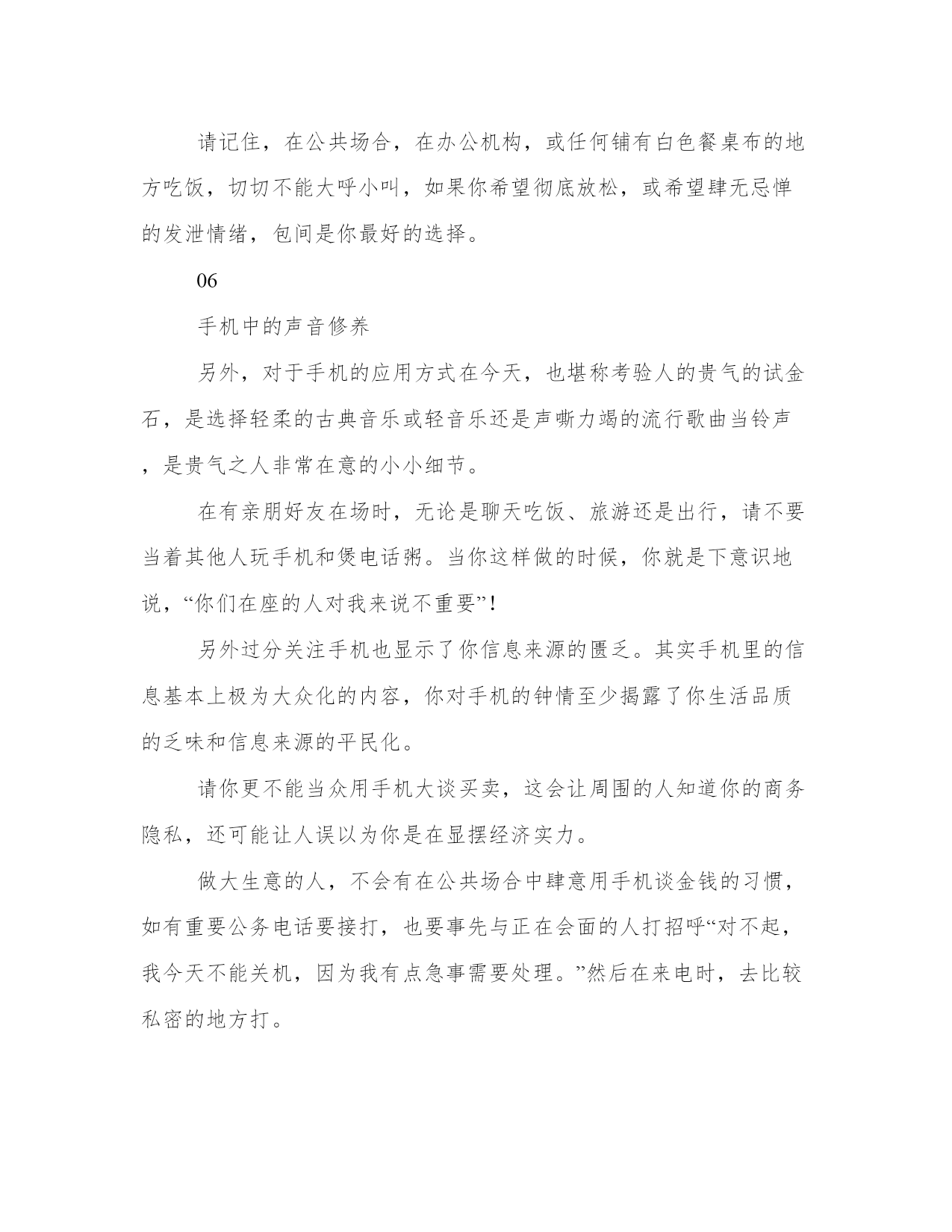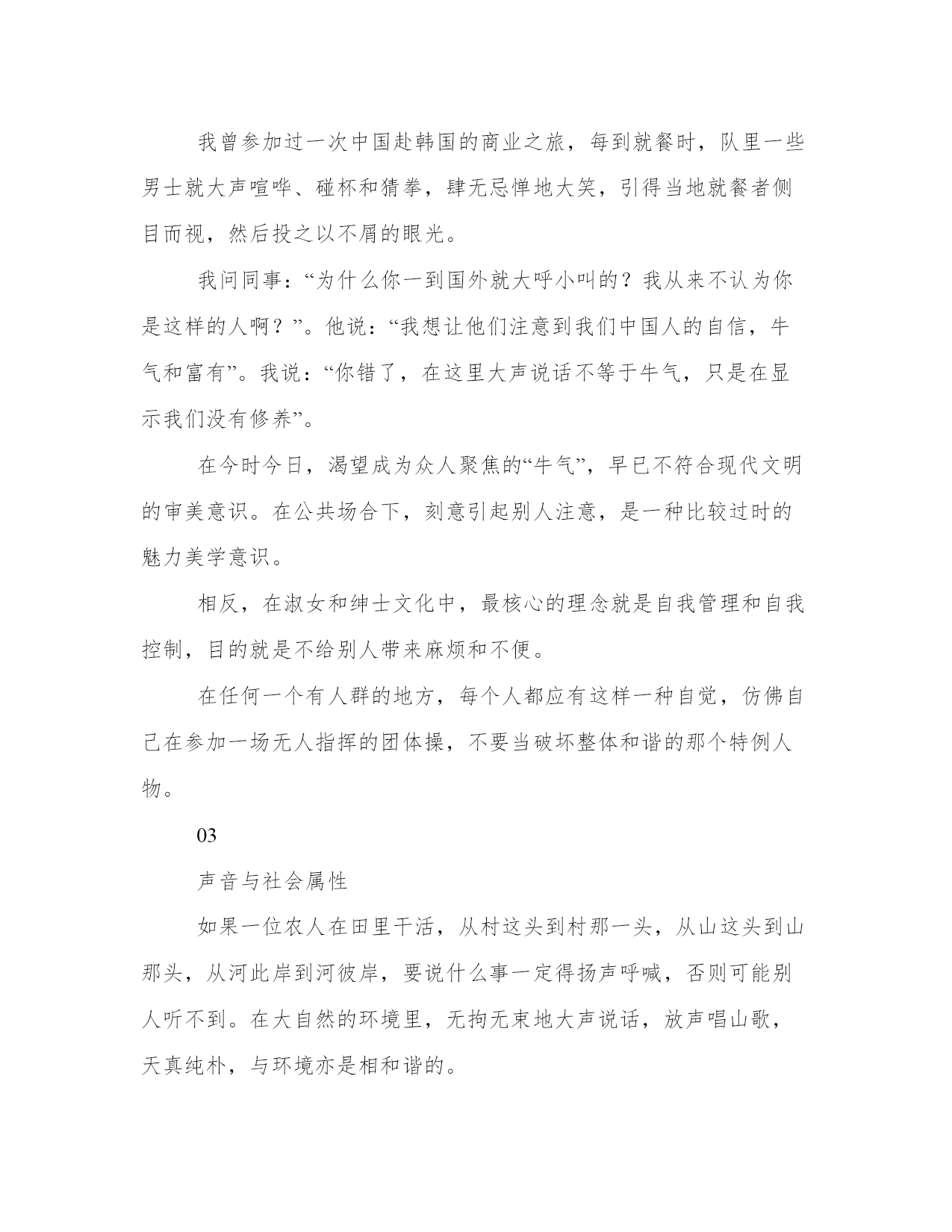 别让你的音量暴露了你的修养【www.sxqingyun.com--经典说说】的确,有人说话轻声细语,就有人天生大嗓门。但是一个有教养人无论嗓音如何,都一定知道在特定的场合尽量压低自己的声音以防打扰到他人。不分时间场合地点大呼小叫的人不叫大嗓门,而是没教养。01压低声音,贵人风范梁文道在《常识》一书中发问:“是什么让香港人在十年后让自己在餐桌前说话的音量降了下来?”其原因无疑是源于香港人变得越来越富有,越来越文明,人均受教育的程度越来越高,加之社会长期的对公民进行教育的综合结果。所以,别小觑了声音对人的贵气的影响,俗话说得好“自古贵人声音低”。因为重要的人物所谈论的内容,经常牵涉国家的机密,名人的隐私,因此压低声音自然是绝对必要的。除此之外,贵人往往是些敏感聪明之人,相互交流,不费劲,更用不着大力气嚷。02音量高≠实力强我曾参加过一次中国赴韩国的商业之旅,每到就餐时,队里一些男士就大声喧哗、碰杯和猜拳,肆无忌惮地大笑,引得当地就餐者侧目而视,然后投之以不屑的眼光。我问同事:“为什么你一到国外就大呼小叫的?我从来不认为你是这样的人啊?”。他说:“我想让他们注意到我们中国人的自信,牛气和富有”。我说:“你错了,在这里大声说话不等于牛气,只是在显示我们没有修养”。在今时今日,渴望成为众人聚焦的“牛气”,早已不符合现代文明的审美意识。在公共场合下,刻意引起别人注意,是一种比较过时的魅力美学意识。相反,在淑女和绅士文化中,最核心的理念就是自我管理和自我控制,目的就是不给别人带来麻烦和不便。在任何一个有人群的地方,每个人都应有这样一种自觉,仿佛自己在参加一场无人指挥的团体操,不要当破坏整体和谐的那个特例人物。03声音与社会属性如果一位农人在田里干活,从村这头到村那一头,从山这头到山那头,从河此岸到河彼岸,要说什么事一定得扬声呼喊,否则可能别人听不到。在大自然的环境里,无拘无束地大声说话,放声唱山歌,天真纯朴,与环境亦是相和谐的。而在现代的都市环境,到处都人满为患,人们一方面时刻捍卫隐私,另一方面,也不愿做他人私事的无奈听众,因此压低声音说话是实现代社会人人需要遵守的基本修养。保罗福赛尔在《格调》一书中说,“蓝先生夫妇常冲着对方大喊大叫,声音穿过所有的房间,而白先生一家总是控制着自己的音量,有时声音小到互相听不见”。这里的蓝先生和白先生喻指蓝领和白领,他用音量来剖析阶层的差异性。一位清华大学的教授也如是告诉我,他住在清华教授的宿舍里时,几年听不到人和人之间高声说话或夫妻吵架的声音,而搬进了民房公寓后的他震惊地发现,每天都能听到有人家在大声说话和歇斯底里般的争吵。04难忘的安静2009年悉尼奥林匹克运动会时,我曾在现场一睹盛况,在悉尼奥运村,几十万人从赛场走向进城的地铁,一路上,一列列队伍在志愿者的带领下整齐划一地前行,除了不断发出的雄壮的口号和歌声,以及走路时人们衣服摩擦的声音,其余一切都是静悄悄的。而这些人是来自澳大利亚的观众和世界各国的旅游者。当到达地铁站上,几万人安静得鸦雀无声。因为每个人都知道,声音一多,队伍就乱,队伍一乱,就会出现踩踏事件。在半个小时内,几十万人安静而有序地被疏散,天天如此。参加这次奥运会,对我来说,观察到这样的人群素质比所有为冠军升国旗的时刻,更让我难忘,几乎成为一生中最刻骨铭心的人生经历。05不做公共场合的噪声制造者也许你也有这样的观察和体验,在公共场合中,如飞机,餐厅,音乐厅,电梯,酒店,商店,越是安静的地方,往往越是高雅的地方。比如高档餐厅弥漫着轻柔的音乐,灯光柔和朦胧,人们都自觉地压低声音交谈和交杯换盏,此时,雅人,美食,淡光,柔声,成为一种情调交响曲。或许,经历了太多年的狂飙突进式的时代,让我们的耳朵不再对噪音敏感,太多的大呼小叫,鞭炮齐鸣、高音喇叭声,声嘶力竭的卡拉OK,钝化了我们曾经是敏感的耳朵,让我们听不到啁瞅的鸟鸣,草叶中的虫鸣,潺潺的流水和风过松涛声,甚至不再习惯恋爱中的轻声呢喃,你侬我侬。我们习惯了在公共场合放着震耳欲聋的流行歌曲,肆无忌惮地大声说话和呼唤他人制造噪音,这无疑是对他人的感受不敏感的重要表现,是对公共空间的侵犯。请记住,在公共场合,在办公机构,或任何铺有白色餐桌布的地方吃饭,切切不能大呼小叫,如果你希望彻底放松,或希望肆无忌惮的发泄情绪,包间是你最好的选择。06手机中的声音修养另外,对于手机的应用方式在今天,也堪称考验人的贵气的试金石,是选择轻柔的古典音乐或轻音乐还是声嘶力竭的流行歌曲当铃声,是贵气之人非常在意的小小细节。在有亲朋好友在场时,无论是聊天吃饭、旅游还是出行,请不要当着其他人玩手机和煲电话粥。当你这样做的时候,你就是下意识地说,“你们在座的人对我来说不重要”!另外过分关注手机也显示了你信息来源的匮乏。其实手机里的信息基本上极为大众化的内容,你对手机的钟情至少揭露了你生