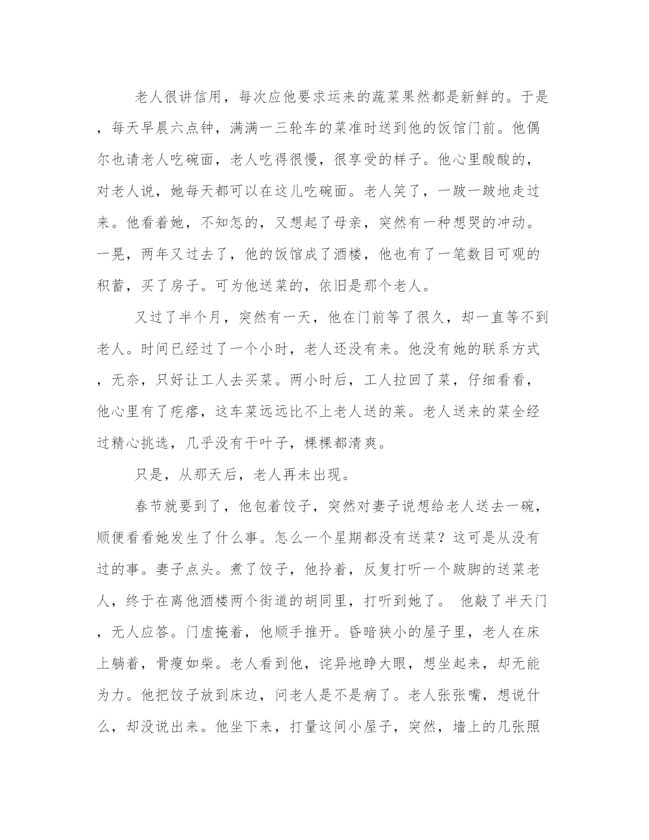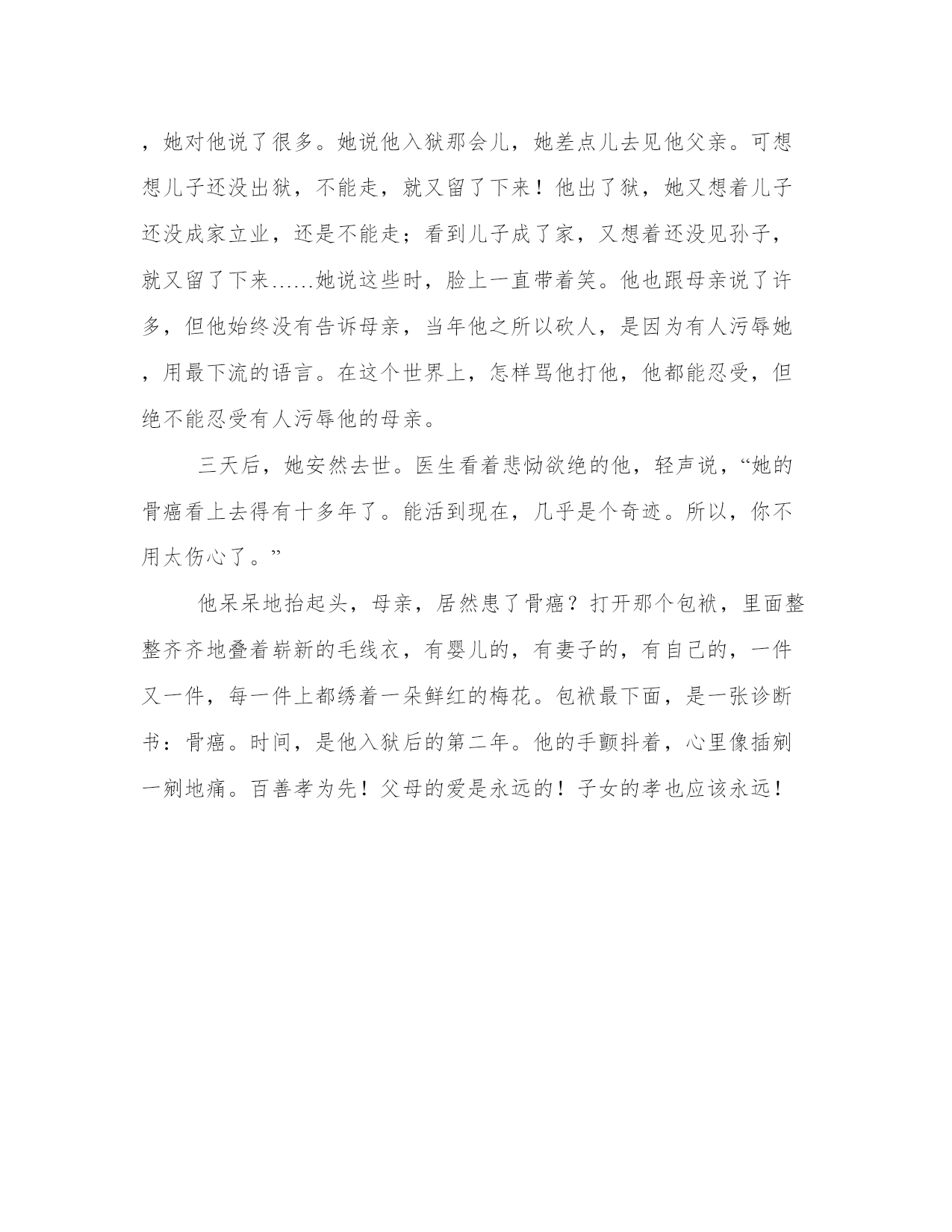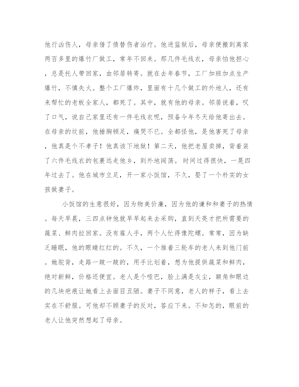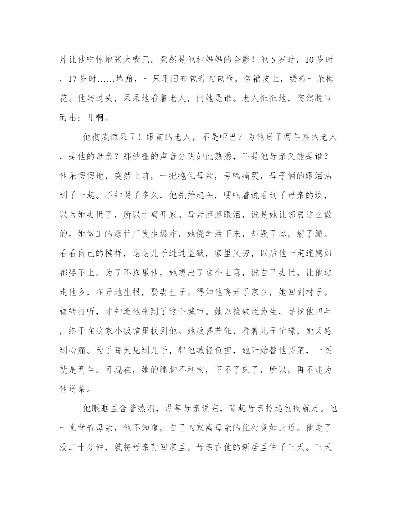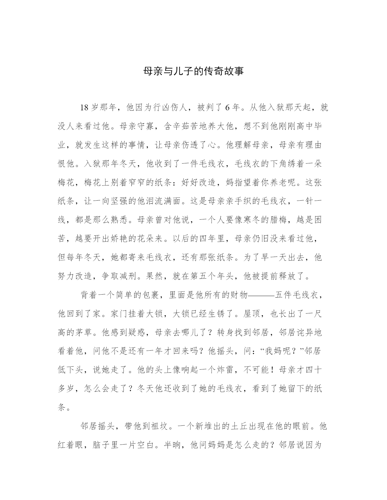 母亲与儿子的传奇故事18岁那年,他因为行凶伤人,被判了6年。从他入狱那天起,就没人来看过他。母亲守寡,含辛茹苦地养大他,想不到他刚刚高中毕业,就发生这样的事情,让母亲伤透了心。他理解母亲,母亲有理由恨他。入狱那年冬天,他收到了一件毛线衣,毛线衣的下角绣着一朵梅花,梅花上别着窄窄的纸条:好好改造,妈指望着你养老呢。这张纸条,让一向坚强的他泪流满面。这是母亲亲手织的毛线衣,一针一线,都是那么熟悉。母亲曾对他说,一个人要像寒冬的腊梅,越是困苦,越要开出娇艳的花朵来。以后的四年里,母亲仍旧没来看过他,但每年冬天,她都寄来毛线衣,还有那张纸条。为了早一天出去,他努力改造,争取减刑。果然,就在第五个年头,他被提前释放了。背着一个简单的包裹,里面是他所有的财物———五件毛线衣,他回到了家。家门挂着大锁,大锁已经生锈了。屋顶,也长出了一尺高的茅草。他感到疑惑,母亲去哪儿了?转身找到邻居,邻居诧异地看着他,问他不是还有一年才回来吗?他摇头,问:“我妈呢?”邻居低下头,说她走了。他的头上像响起一个炸雷,不可能!母亲才四十多岁,怎么会走了?冬天他还收到了她的毛线衣,看到了她留下的纸条。邻居摇头,带他到祖坟。一个新堆出的土丘出现在他的眼前。他红着眼,脑子里一片空白。半晌,他问妈妈是怎么走的?邻居说因为他行凶伤人,母亲借了债替伤者治疗。他进监狱后,母亲便搬到离家两百多里的爆竹厂做工,常年不回来。那几件毛线衣,母亲怕他担心,总是托人带回家,由邻居转寄。就在去年春节,工厂加班加点生产爆竹,不慎失火。整个工厂爆炸,里面有十几个做工的外地人,还有来帮忙的老板全家人,都死了。其中,就有他的母亲。邻居说着,叹了口气,说自己家里还有一件毛线衣呢,预备今年冬天给他寄出去。在母亲的坟前,他捶胸顿足,痛哭不已。全都怪他,是他害死了母亲,他真是个不孝子!他真该下地狱!第二天,他把老屋卖掉,背着装了六件毛线衣的包裹远走他乡,到外地闯荡。时间过得很快,一晃四年过去了。他在城市立足,开一家小饭馆,不久,娶了一个朴实的女孩做妻子。小饭馆的生意很好,因为物美价廉,因为他的谦和和妻子的热情。每天早晨,三四点钟他就早早起来去采购,直到天亮才把所需要的蔬菜、鲜肉拉回家。没有雇人手,两个人忙得像陀螺。常常,因为缺乏睡眠,他的眼睛红红的。不久,一个推着三轮车的老人来到他门前。她驼背,走路一跛一跛的,用手比划着,想为他提供蔬菜和鲜肉,绝对新鲜,价格还便宜。老人是个哑巴,脸上满是灰尘,额角和眼边的几块疤痕让她看上去面目丑陋。妻子不同意,老人的样子,看上去实在不舒服。可他却不顾妻子的反对,答应下来。不知怎的,眼前的老人让他突然想起了母亲。老人很讲信用,每次应他要求运来的蔬菜果然都是新鲜的。于是,每天早晨六点钟,满满一三轮车的菜准时送到他的饭馆门前。他偶尔也请老人吃碗面,老人吃得很慢,很享受的样子。他心里酸酸的,对老人说,她每天都可以在这儿吃碗面。老人笑了,一跛一跛地走过来。他看着她,不知怎的,又想起了母亲,突然有一种想哭的冲动。一晃,两年又过去了,他的饭馆成了酒楼,他也有了一笔数目可观的积蓄,买了房子。可为他送菜的,依旧是那个老人。又过了半个月,突然有一天,他在门前等了很久,却一直等不到老人。时间已经过了一个小时,老人还没有来。他没有她的联系方式,无奈,只好让工人去买菜。两小时后,工人拉回了菜,仔细看看,他心里有了疙瘩,这车菜远远比不上老人送的莱。老人送来的菜全经过精心挑选,几乎没有干叶子,棵棵都清爽。只是,从那天后,老人再未出现。春节就要到了,他包着饺子,突然对妻子说想给老人送去一碗,顺便看看她发生了什么事。怎么一个星期都没有送菜?这可是从没有过的事。妻子点头。煮了饺子,他拎着,反复打听一个跛脚的送菜老人,终于在离他酒楼两个街道的胡同里,打听到她了。他敲了半天门,无人应答。门虚掩着,他顺手推开。昏暗狭小的屋子里,老人在床上躺着,骨瘦如柴。老人看到他,诧异地睁大眼,想坐起来,却无能为力。他把饺子放到床边,问老人是不是病了。老人张张嘴,想说什么,却没说出来。他坐下来,打量这间小屋子,突然,墙上的几张照片让他吃惊地张大嘴巴。竟然是他和妈妈的合影!他5岁时,10岁时,17岁时……墙角,一只用旧布包着的包袱,包袱皮上,绣着一朵梅花。他转过头,呆呆地看着老人,问她是谁。老人怔怔地,突然脱口而出:儿啊。他彻底惊呆了!眼前的老人,不是哑巴?为他送了两年菜的老人,是他的母亲?那沙哑的声音分明如此熟悉,不是他母亲又能是谁?他呆愣愣地,突然上前,一把抱住母亲,号啕痛哭,母子俩的眼泪沾到了一起。不知哭了多久,他先抬起头,哽咽着说看到了母亲的坟,以为她去世了,所以才离开家。母亲擦擦眼泪,说是她让邻居这么做的。她做工的爆竹厂发生爆炸,她侥幸活下来,却毁了容,瘸了腿。看看自己的模样,想想儿子进过监狱,家里又穷,以后他一定连媳妇