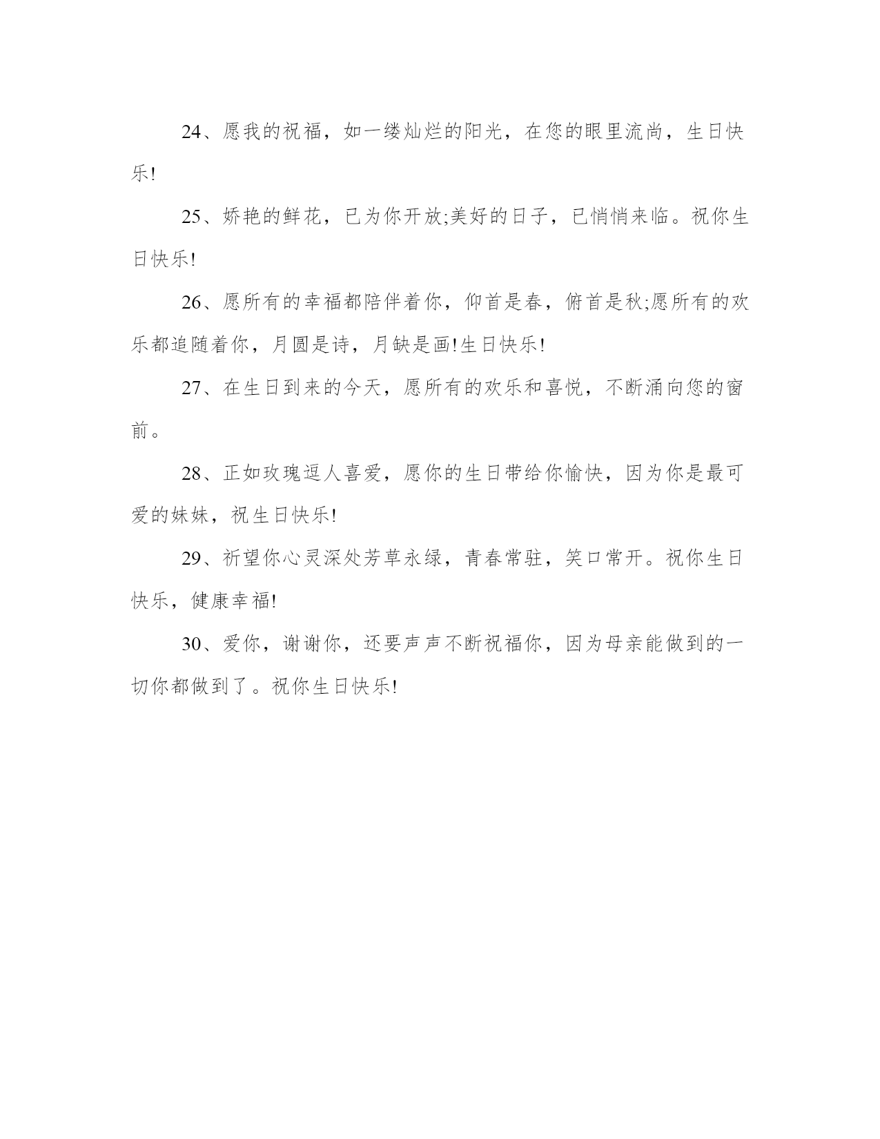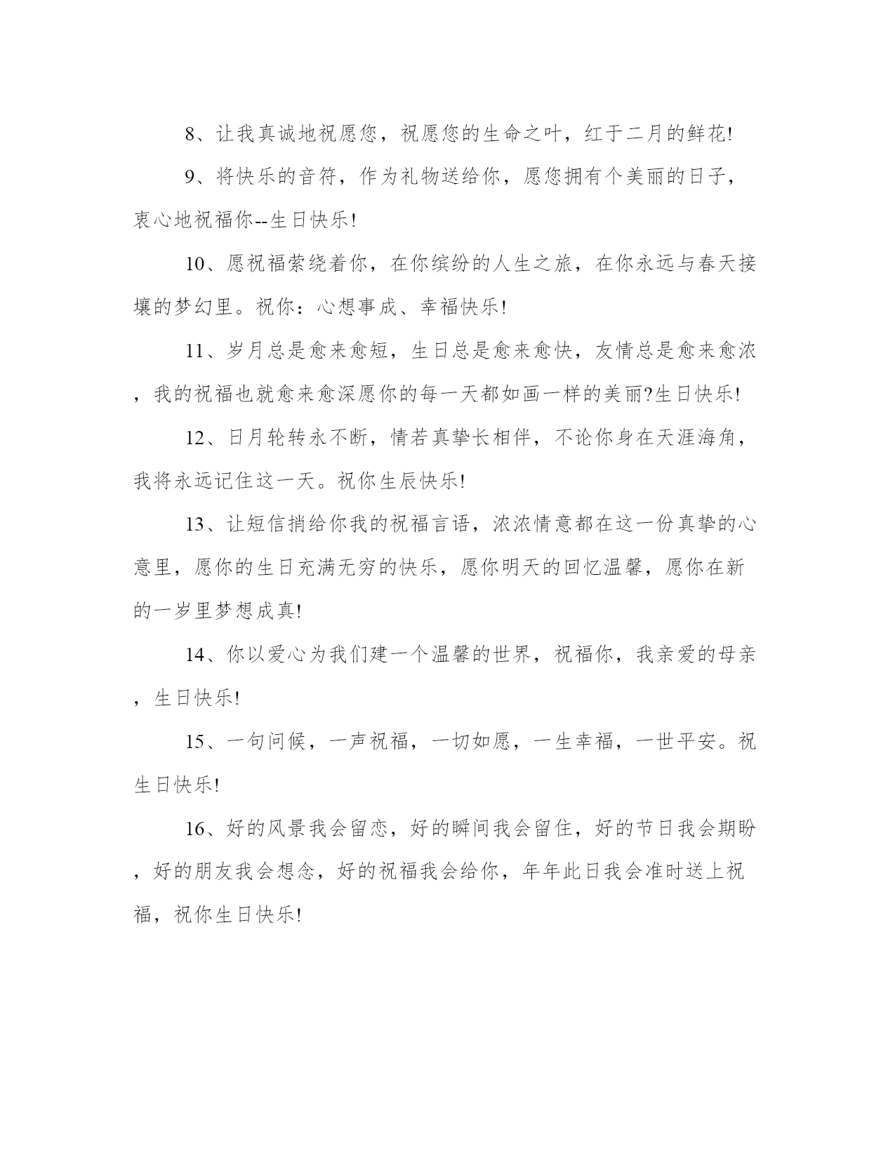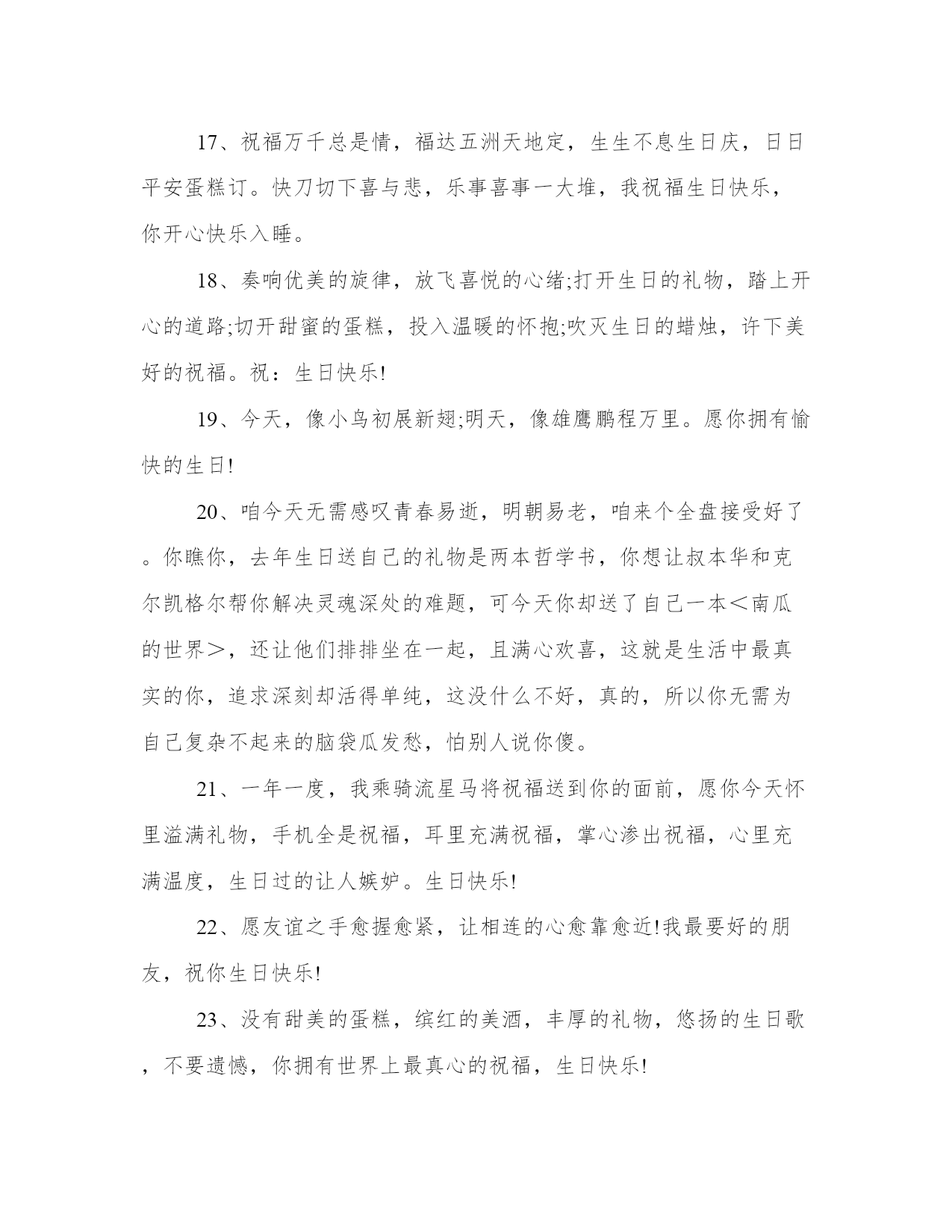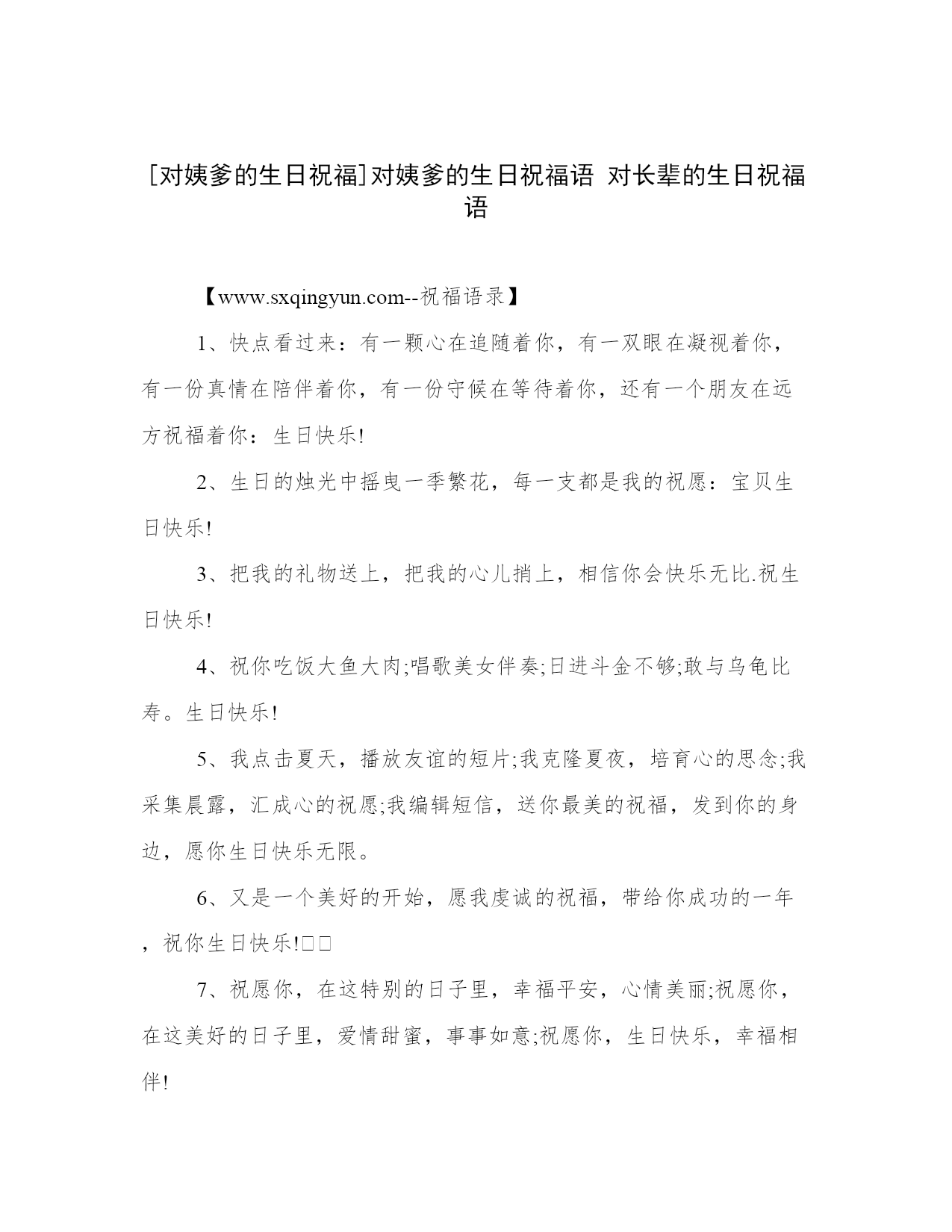 [对姨爹的生日祝福]对姨爹的生日祝福语对长辈的生日祝福语【www.sxqingyun.com--祝福语录】1、快点看过来:有一颗心在追随着你,有一双眼在凝视着你,有一份真情在陪伴着你,有一份守候在等待着你,还有一个朋友在远方祝福着你:生日快乐!2、生日的烛光中摇曳一季繁花,每一支都是我的祝愿:宝贝生日快乐!3、把我的礼物送上,把我的心儿捎上,相信你会快乐无比.祝生日快乐!4、祝你吃饭大鱼大肉;唱歌美女伴奏;日进斗金不够;敢与乌龟比寿。生日快乐!5、我点击夏天,播放友谊的短片;我克隆夏夜,培育心的思念;我采集晨露,汇成心的祝愿;我编辑短信,送你最美的祝福,发到你的身边,愿你生日快乐无限。6、又是一个美好的开始,愿我虔诚的祝福,带给你成功的一年,祝你生日快乐!7、祝愿你,在这特别的日子里,幸福平安,心情美丽;祝愿你,在这美好的日子里,爱情甜蜜,事事如意;祝愿你,生日快乐,幸福相伴!8、让我真诚地祝愿您,祝愿您的生命之叶,红于二月的鲜花!9、将快乐的音符,作为礼物送给你,愿您拥有个美丽的日子,衷心地祝福你--生日快乐!10、愿祝福萦绕着你,在你缤纷的人生之旅,在你永远与春天接壤的梦幻里。祝你:心想事成、幸福快乐!11、岁月总是愈来愈短,生日总是愈来愈快,友情总是愈来愈浓,我的祝福也就愈来愈深愿你的每一天都如画一样的美丽?生日快乐!12、日月轮转永不断,情若真挚长相伴,不论你身在天涯海角,我将永远记住这一天。祝你生辰快乐!13、让短信捎给你我的祝福言语,浓浓情意都在这一份真挚的心意里,愿你的生日充满无穷的快乐,愿你明天的回忆温馨,愿你在新的一岁里梦想成真!14、你以爱心为我们建一个温馨的世界,祝福你,我亲爱的母亲,生日快乐!15、一句问候,一声祝福,一切如愿,一生幸福,一世平安。祝生日快乐!16、好的风景我会留恋,好的瞬间我会留住,好的节日我会期盼,好的朋友我会想念,好的祝福我会给你,年年此日我会准时送上祝福,祝你生日快乐!17、祝福万千总是情,福达五洲天地定,生生不息生日庆,日日平安蛋糕订。快刀切下喜与悲,乐事喜事一大堆,我祝福生日快乐,你开心快乐入睡。18、奏响优美的旋律,放飞喜悦的心绪;打开生日的礼物,踏上开心的道路;切开甜蜜的蛋糕,投入温暖的怀抱;吹灭生日的蜡烛,许下美好的祝福。祝:生日快乐!19、今天,像小鸟初展新翅;明天,像雄鹰鹏程万里。愿你拥有愉快的生日!20、咱今天无需感叹青春易逝,明朝易老,咱来个全盘接受好了。你瞧你,去年生日送自己的礼物是两本哲学书,你想让叔本华和克尔凯格尔帮你解决灵魂深处的难题,可今天你却送了自己一本<南瓜的世界>,还让他们排排坐在一起,且满心欢喜,这就是生活中最真实的你,追求深刻却活得单纯,这没什么不好,真的,所以你无需为自己复杂不起来的脑袋瓜发愁,怕别人说你傻。21、一年一度,我乘骑流星马将祝福送到你的面前,愿你今天怀里溢满礼物,手机全是祝福,耳里充满祝福,掌心渗出祝福,心里充满温度,生日过的让人嫉妒。生日快乐!22、愿友谊之手愈握愈紧,让相连的心愈靠愈近!我最要好的朋友,祝你生日快乐!23、没有甜美的蛋糕,缤红的美酒,丰厚的礼物,悠扬的生日歌,不要遗憾,你拥有世界上最真心的祝福,生日快乐!24、愿我的祝福,如一缕灿烂的阳光,在您的眼里流尚,生日快乐!25、娇艳的鲜花,已为你开放;美好的日子,已悄悄来临。祝你生日快乐!26、愿所有的幸福都陪伴着你,仰首是春,俯首是秋;愿所有的欢乐都追随着你,月圆是诗,月缺是画!生日快乐!27、在生日到来的今天,愿所有的欢乐和喜悦,不断涌向您的窗前。28、正如玫瑰逗人喜爱,愿你的生日带给你愉快,因为你是最可爱的妹妹,祝生日快乐!29、祈望你心灵深处芳草永绿,青春常驻,笑口常开。祝你生日快乐,健康幸福!30、爱你,谢谢你,还要声声不断祝福你,因为母亲能做到的一切你都做到了。祝你生日快乐!