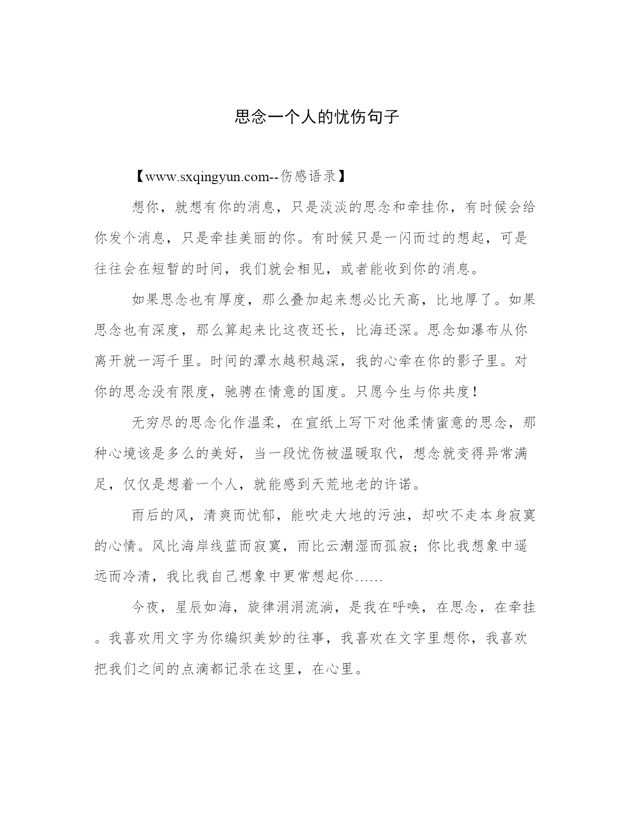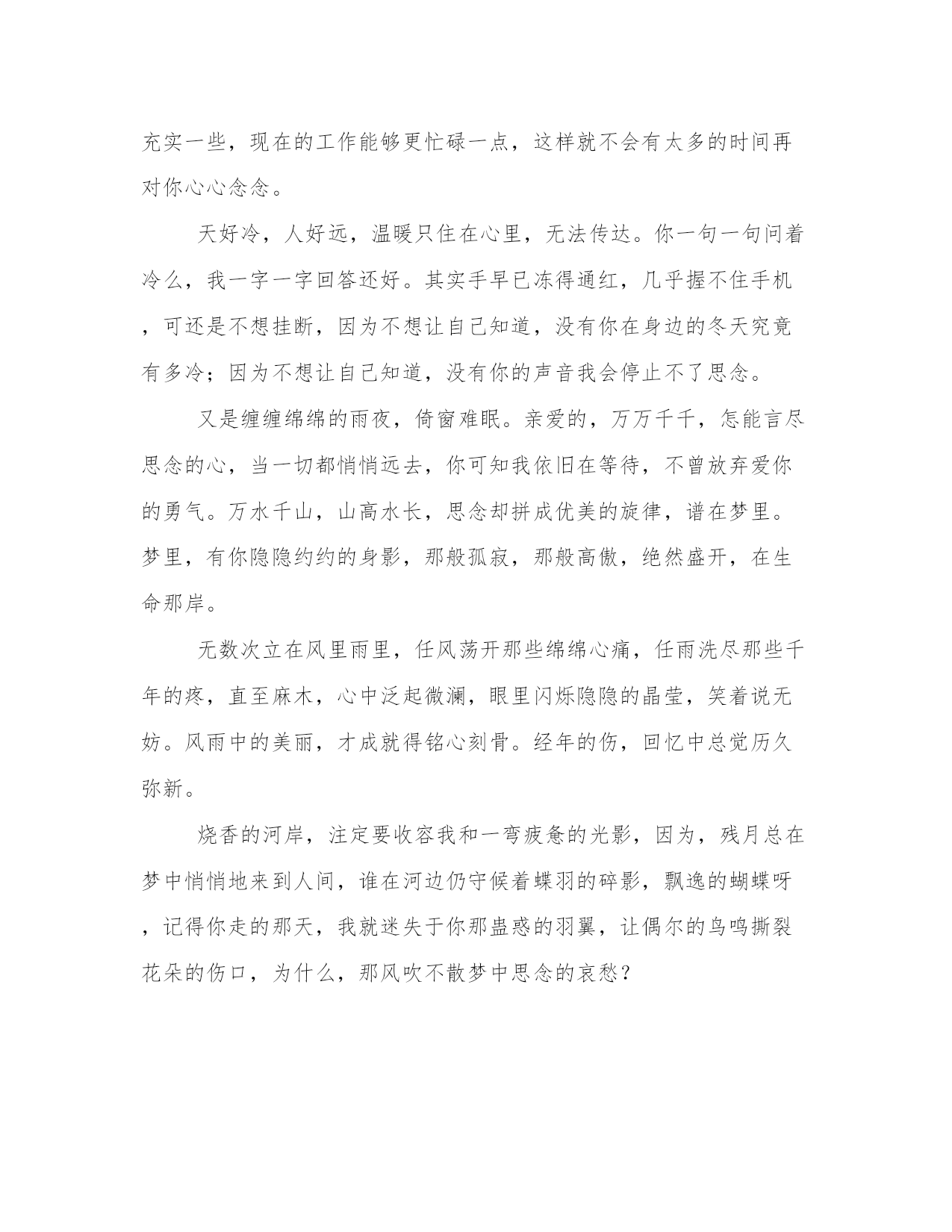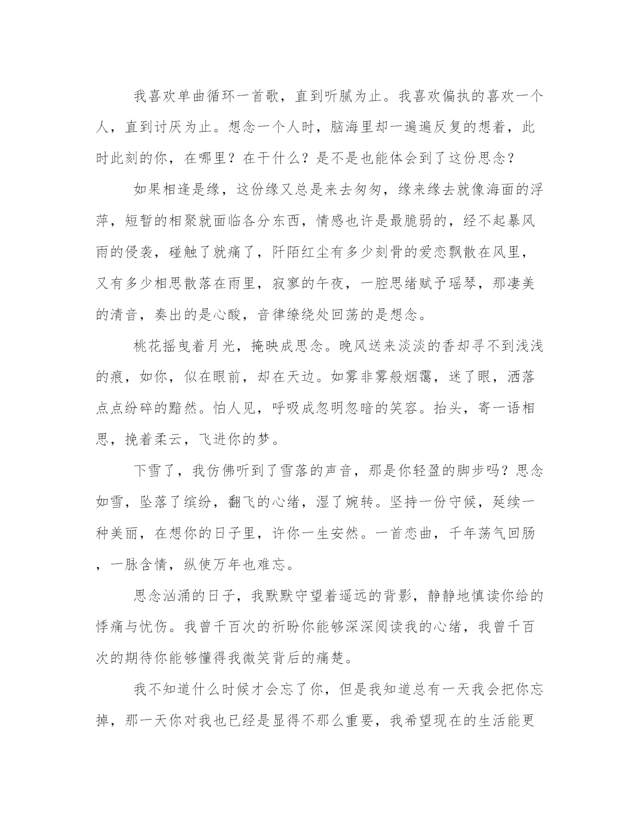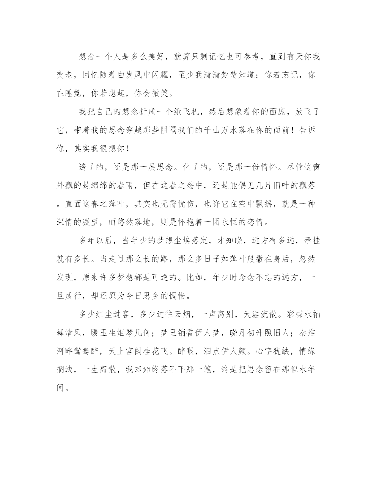 思念一个人的忧伤句子【www.sxqingyun.com--伤感语录】想你,就想有你的消息,只是淡淡的思念和牵挂你,有时候会给你发个消息,只是牵挂美丽的你。有时候只是一闪而过的想起,可是往往会在短暂的时间,我们就会相见,或者能收到你的消息。如果思念也有厚度,那么叠加起来想必比天高,比地厚了。如果思念也有深度,那么算起来比这夜还长,比海还深。思念如瀑布从你离开就一泻千里。时间的潭水越积越深,我的心牵在你的影子里。对你的思念没有限度,驰骋在情意的国度。只愿今生与你共度!无穷尽的思念化作温柔,在宣纸上写下对他柔情蜜意的思念,那种心境该是多么的美好,当一段忧伤被温暖取代,想念就变得异常满足,仅仅是想着一个人,就能感到天荒地老的许诺。雨后的风,清爽而忧郁,能吹走大地的污浊,却吹不走本身寂寞的心情。风比海岸线蓝而寂寞,雨比云潮湿而孤寂;你比我想象中遥远而冷清,我比我自己想象中更常想起你……今夜,星辰如海,旋律涓涓流淌,是我在呼唤,在思念,在牵挂。我喜欢用文字为你编织美妙的往事,我喜欢在文字里想你,我喜欢把我们之间的点滴都记录在这里,在心里。我喜欢单曲循环一首歌,直到听腻为止。我喜欢偏执的喜欢一个人,直到讨厌为止。想念一个人时,脑海里却一遍遍反复的想着,此时此刻的你,在哪里?在干什么?是不是也能体会到了这份思念?如果相逢是缘,这份缘又总是来去匆匆,缘来缘去就像海面的浮萍,短暂的相聚就面临各分东西,情感也许是最脆弱的,经不起暴风雨的侵袭,碰触了就痛了,阡陌红尘有多少刻骨的爱恋飘散在风里,又有多少相思散落在雨里,寂寥的午夜,一腔思绪赋予瑶琴,那凄美的清音,奏出的是心酸,音律缭绕处回荡的是想念。桃花摇曳着月光,掩映成思念。晚风送来淡淡的香却寻不到浅浅的痕,如你,似在眼前,却在天边。如雾非雾般烟霭,迷了眼,洒落点点纷碎的黯然。怕人见,呼吸成忽明忽暗的笑容。抬头,寄一语相思,挽着柔云,飞进你的梦。下雪了,我仿佛听到了雪落的声音,那是你轻盈的脚步吗?思念如雪,坠落了缤纷,翻飞的心绪,湿了婉转。坚持一份守候,延续一种美丽,在想你的日子里,许你一生安然。一首恋曲,千年荡气回肠,一脉含情,纵使万年也难忘。思念汹涌的日子,我默默守望着遥远的背影,静静地慎读你给的悸痛与忧伤。我曾千百次的祈盼你能够深深阅读我的心绪,我曾千百次的期待你能够懂得我微笑背后的痛楚。我不知道什么时候才会忘了你,但是我知道总有一天我会把你忘掉,那一天你对我也已经是显得不那么重要,我希望现在的生活能更充实一些,现在的工作能够更忙碌一点,这样就不会有太多的时间再对你心心念念。天好冷,人好远,温暖只住在心里,无法传达。你一句一句问着冷么,我一字一字回答还好。其实手早已冻得通红,几乎握不住手机,可还是不想挂断,因为不想让自己知道,没有你在身边的冬天究竟有多冷;因为不想让自己知道,没有你的声音我会停止不了思念。又是缠缠绵绵的雨夜,倚窗难眠。亲爱的,万万千千,怎能言尽思念的心,当一切都悄悄远去,你可知我依旧在等待,不曾放弃爱你的勇气。万水千山,山高水长,思念却拼成优美的旋律,谱在梦里。梦里,有你隐隐约约的身影,那般孤寂,那般高傲,绝然盛开,在生命那岸。无数次立在风里雨里,任风荡开那些绵绵心痛,任雨洗尽那些千年的疼,直至麻木,心中泛起微澜,眼里闪烁隐隐的晶莹,笑着说无妨。风雨中的美丽,才成就得铭心刻骨。经年的伤,回忆中总觉历久弥新。烧香的河岸,注定要收容我和一弯疲惫的光影,因为,残月总在梦中悄悄地来到人间,谁在河边仍守候着蝶羽的碎影,飘逸的蝴蝶呀,记得你走的那天,我就迷失于你那蛊惑的羽翼,让偶尔的鸟鸣撕裂花朵的伤口,为什么,那风吹不散梦中思念的哀愁?想念一个人是多么美好,就算只剩记忆也可参考,直到有天你我变老,回忆随着白发风中闪耀,至少我清清楚楚知道:你若忘记,你在睡觉,你若想起,你会微笑。我把自己的想念折成一个纸飞机,然后想象着你的面庞,放飞了它,带着我的思念穿越那些阻隔我们的千山万水落在你的面前!告诉你,其实我很想你!透了的,还是那一层思念。化了的,还是那一份情怀。尽管这窗外飘的是绵绵的春雨,但在这春之殇中,还是能偶见几片旧叶的飘落。直面这春之落叶,其实也无需忧伤,也许它在空中飘摇,就是一种深情的凝望,而悠然落地,则是怀抱着一团永恒的恋情。多年以后,当年少的梦想尘埃落定,才知晓,远方有多远,牵挂就有多长。当走过那么长的路,那么多日子如落叶般撒在身后,忽然发现,原来许多梦想都是可逆的。比如,年少时念念不忘的远方,一旦成行,却还原为今日思乡的惆怅。多少红尘过客,多少过往云烟,一声离别,天涯流散。彩蝶水袖舞清风,暖玉生烟琴几何;梦里销香伊人梦,晓月初升照旧人;秦淮河畔鸳鸯醉,天上宫阙桂花飞。醉眼,泪点伊人颜。心字犹缺,情缘搁浅,一生离散,我却始终落不下那一笔,终是把思念留在那似水年间。走在时光的沙滩上,思