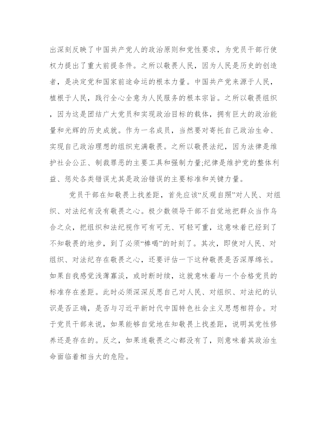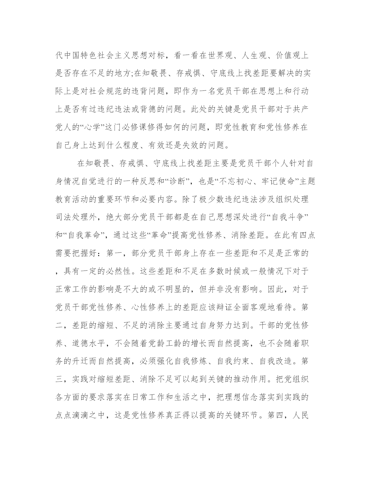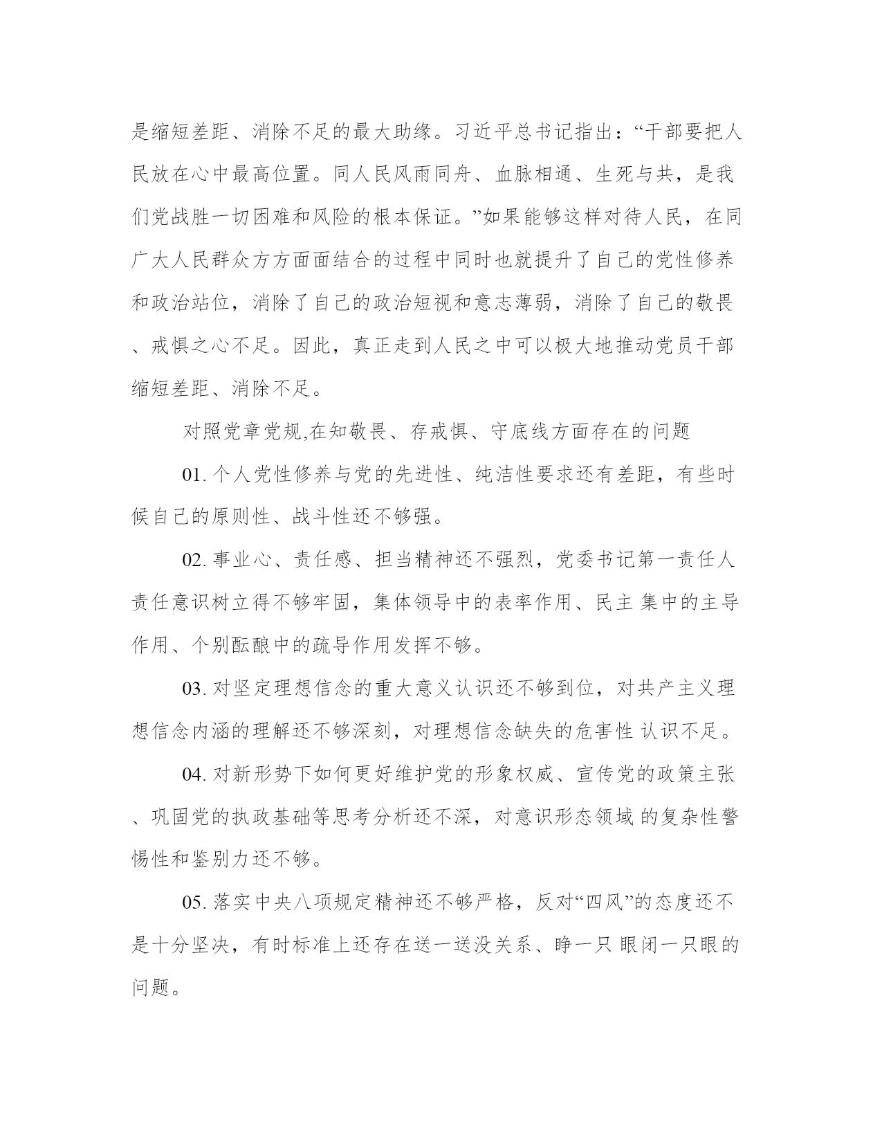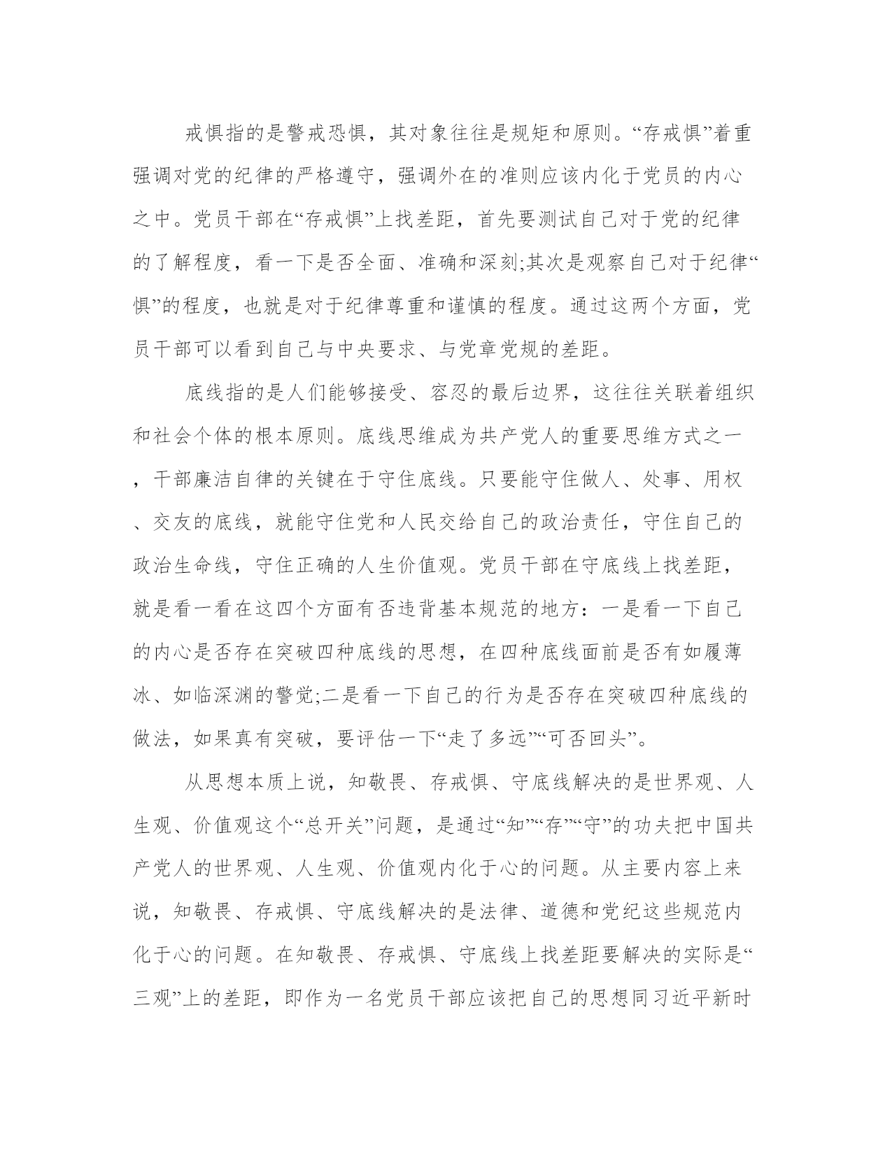 对照党章党规,在知敬畏、存戒惧、守底线方面存在的问题三篇按照民主生活会的要求,我认真学习了“两准则四条例”、习近平关于全面从严治党的论述摘编,深入领会了“六大纪律”和中央八项规定的具体要求。本人对照要求认真查摆问题,形成了对照材料、问题清单和问题整改清单,按照“知敬畏、存戒惧、守底线”纪律教育活动的要求,制订整改方案。本站为大家整理的相关的对照党章党规,在知敬畏、存戒惧、守底线方面存在的问题,供大家参考选择。对照党章党规,在知敬畏、存戒惧、守底线方面存在的问题“不忘初心、牢记使命”主题教育活动四项总要求的第三项是“找差距”。这要求党员干部对照习近平新时代中国特色社会主义思想和党中央决策部署,对照党章党规,对照人民群众新期待,对照先进典型、身边榜样,认真观察和寻找自己身上的不足和欠缺。着眼于政治规矩的严格遵守和内心深处党性修养的增强,找一找在知敬畏、存戒惧、守底线方面存在哪些差距。“敬畏”是中国传统典籍中常用的一个概念,今天中国共产党人强调的敬畏对象与古代对个人的敬畏有所区别。习近平总书记指出:“各级领导干部要牢固树立正确权力观,保持高尚精神追求,敬畏人民、敬畏组织、敬畏法纪,做到公正用权、依法用权、为民用权、廉洁用权,永葆共产党人拒腐蚀、永不沾的政治本色。”这三种敬畏对象的提出深刻反映了中国共产党人的政治原则和党性要求,为党员干部行使权力提出了重大前提条件。之所以敬畏人民,因为人民是历史的创造者,是决定党和国家前途命运的根本力量。中国共产党来源于人民,植根于人民,践行全心全意为人民服务的根本宗旨。之所以敬畏组织,因为这是团结广大党员和实现政治目标的载体,拥有巨大的政治能量和光辉的历史成就。作为一名成员,当然要对寄托自己政治生命、实现自己政治理想的组织充满敬畏。之所以敬畏法纪,因为法律是维护社会公正、制裁罪恶的主要工具和强制力量;纪律是维护党的整体利益、惩处各类错误尤其是政治错误的主要标准和关键力量。党员干部在知敬畏上找差距,首先应该“反观自照”对人民、对组织、对法纪有没有敬畏之心。极少数领导干部不自觉地把群众当作乌合之众,把组织和法纪视作可有可无、可轻可重,这意味着已经到了不知敬畏的地步,到了必须“棒喝”的时刻了。其次,即使对人民、对组织、对法纪存在敬畏之心,还要评估一下这种敬畏是否深厚绵长。如果自我感觉浅薄寡淡,或时断时续,这就意味着与一个合格党员的标准存在差距。此时必须深深反思自己对人民、对组织、对法纪的认识是否正确,是否与习近平新时代中国特色社会主义思想相符合。对于党员干部来说,如果能够自觉地在知敬畏上找差距,说明其党性修养还是存在的。反之,如果连敬畏之心都没有了,则意味着其政治生命面临着相当大的危险。戒惧指的是警戒恐惧,其对象往往是规矩和原则。“存戒惧”着重强调对党的纪律的严格遵守,强调外在的准则应该内化于党员的内心之中。党员干部在“存戒惧”上找差距,首先要测试自己对于党的纪律的了解程度,看一下是否全面、准确和深刻;其次是观察自己对于纪律“惧”的程度,也就是对于纪律尊重和谨慎的程度。通过这两个方面,党员干部可以看到自己与中央要求、与党章党规的差距。底线指的是人们能够接受、容忍的最后边界,这往往关联着组织和社会个体的根本原则。底线思维成为共产党人的重要思维方式之一,干部廉洁自律的关键在于守住底线。只要能守住做人、处事、用权、交友的底线,就能守住党和人民交给自己的政治责任,守住自己的政治生命线,守住正确的人生价值观。党员干部在守底线上找差距,就是看一看在这四个方面有否违背基本规范的地方:一是看一下自己的内心是否存在突破四种底线的思想,在四种底线面前是否有如履薄冰、如临深渊的警觉;二是看一下自己的行为是否存在突破四种底线的做法,如果真有突破,要评估一下“走了多远”“可否回头”。从思想本质上说,知敬畏、存戒惧、守底线解决的是世界观、人生观、价值观这个“总开关”问题,是通过“知”“存”“守”的功夫把中国共产党人的世界观、人生观、价值观内化于心的问题。从主要内容上来说,知敬畏、存戒惧、守底线解决的是法律、道德和党纪这些规范内化于心的问题。在知敬畏、存戒惧、守底线上找差距要解决的实际是“三观”上的差距,即作为一名党员干部应该把自己的思想同习近平新时代中国特色社会主义思想对标,看一看在世界观、人生观、价值观上是否存在不足的地方;在知敬畏、存戒惧、守底线上找差距要解决的实际上是对社会规范的违背问题,即作为一名党员干部在思想上和行动上是否有过违纪违法或背德的问题。此处的关键是党员干部对于共产党人的“心学”这门必修课修得如何的问题,即党性教育和党性修养在自己身上达到什么程度、有效还是失效的问题。在知敬畏、存戒惧、守底线上找差距主要是党员干部个人针对自身情况自觉进行的一种反思和“诊断”,也是“不忘初心、牢记使命”主题教育活动的重要环节和必要内