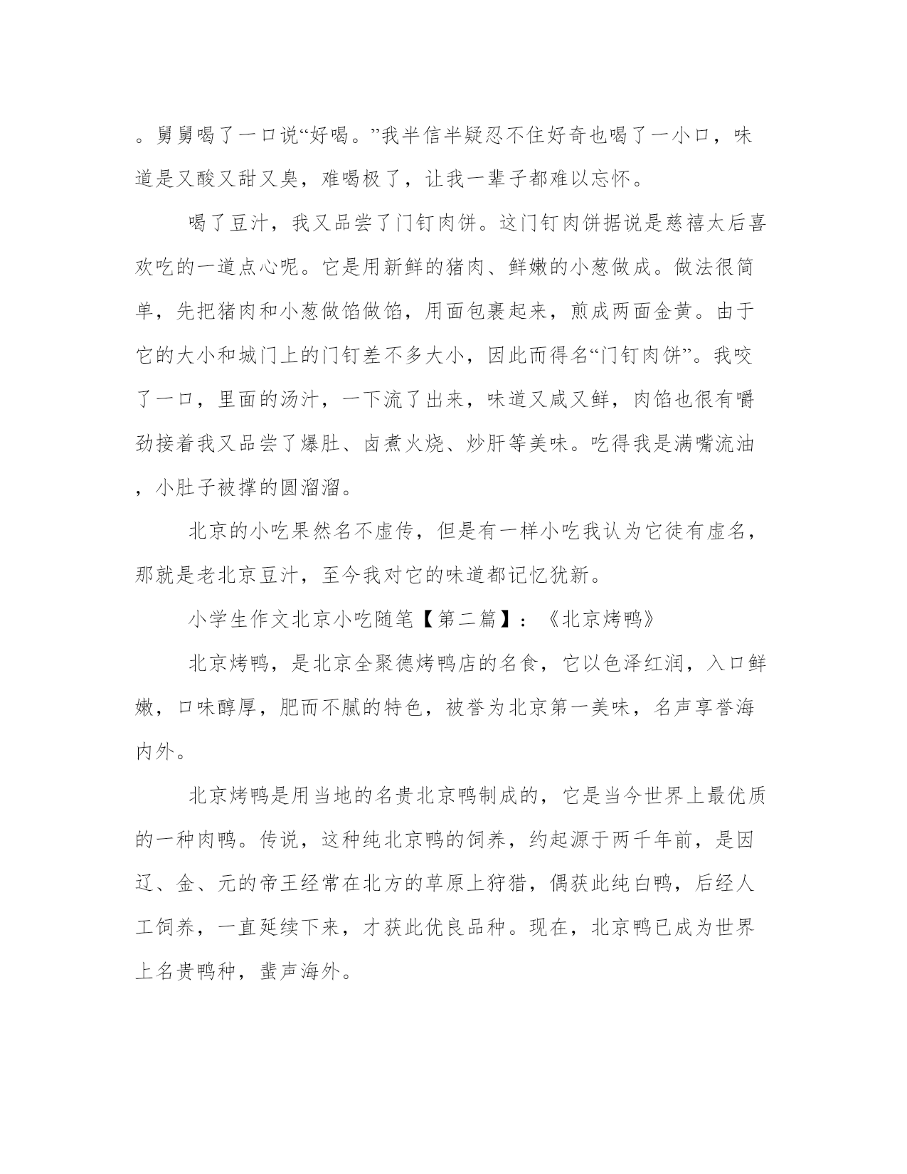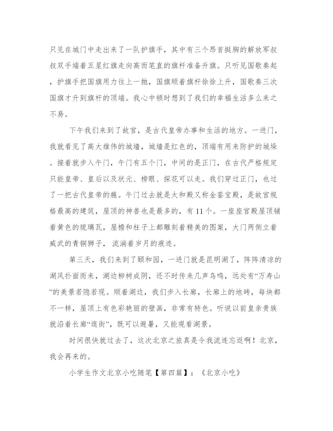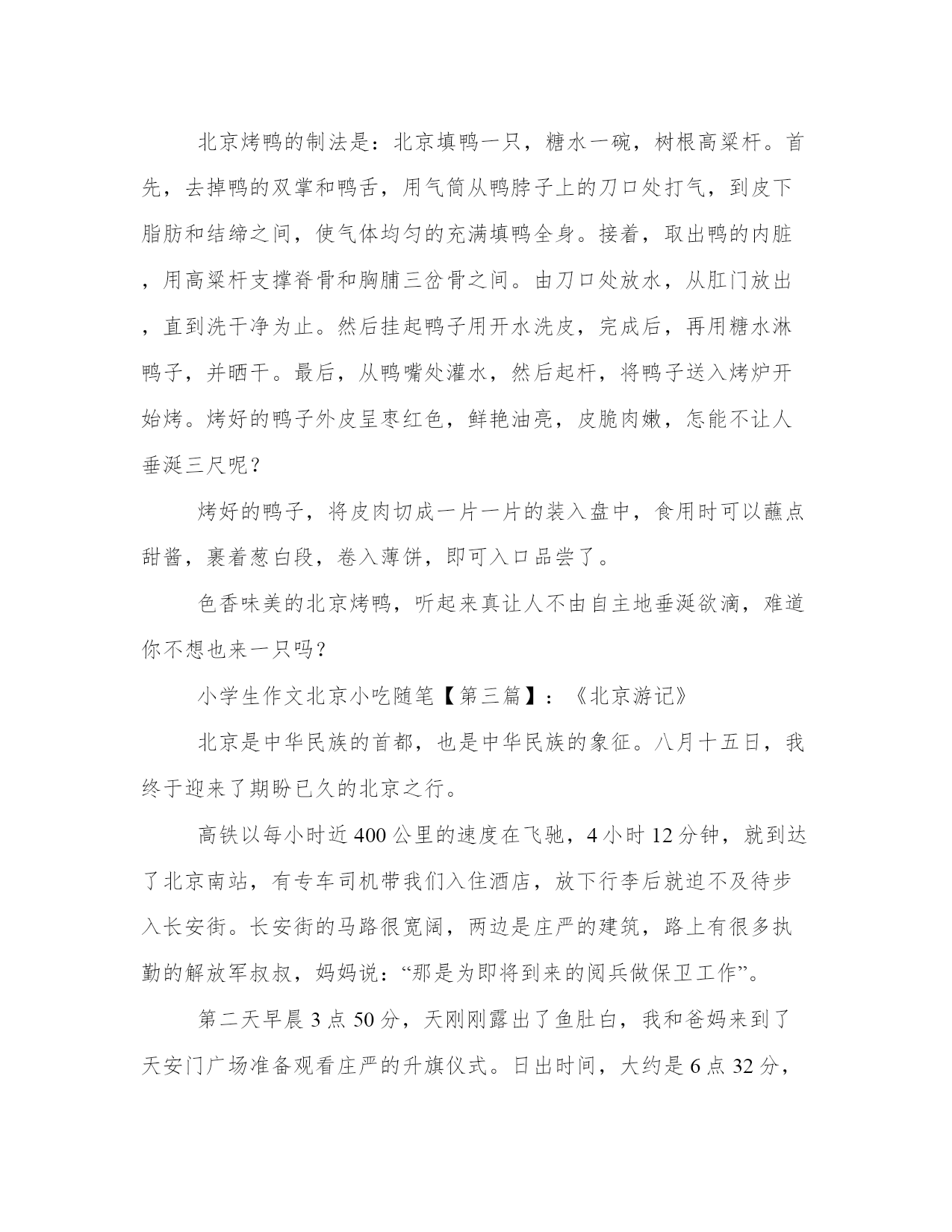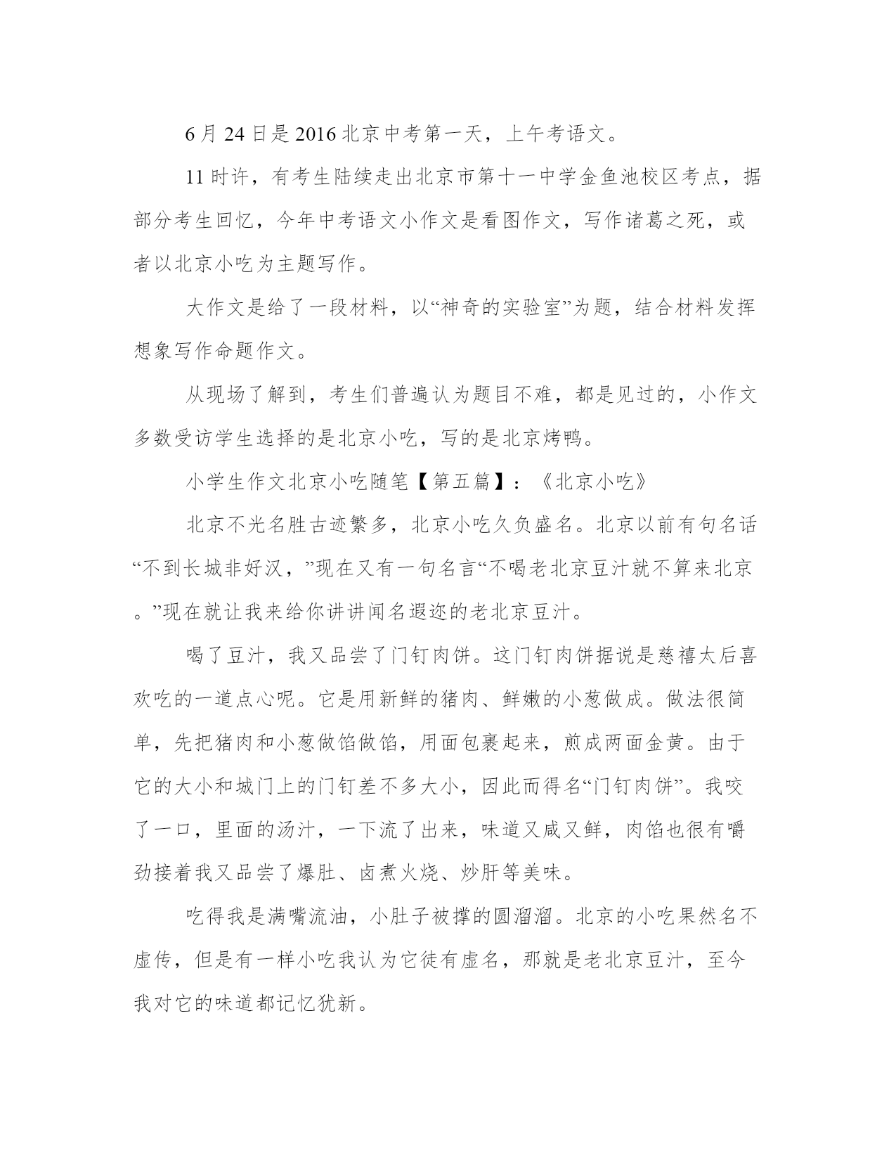 小学生作文北京小吃随笔【www.sxqingyun.com--小学作文】在这个复杂的社会上,我们要象开心的活下去,就要活得简单。吃喝玩乐等,该放松时就应该放开自我。不知道有多久了,我们只顾着低头走自己的路,抱怨着,埋怨着,其实最美好得风景就在我们身边,只要我们抬头。下面是随笔网小编整理的《小学生作文北京小吃随笔》,欢迎阅读。小学生作文北京小吃随笔【第一篇】:《北京小吃》北京不光名胜古迹繁多,北京小吃久负盛名。北京以前有句名话“不到长城非好汉,”现在又有一句名言“不喝老北京豆汁就不算来北京。”现在就让我来给你讲讲闻名遐迩的老北京豆汁。“四九城”小吃城,它坐落于十里河天桥市场内。这里的小吃不仅品种繁多,就连里面的摆设,也是按照老北京茶楼以前的模样建造的。里面设有一个大戏台,两边都摆满了各种各样特色小吃。戏台下摆放着十几张桌子、板凳,游客们可以一边吃小吃一边看台上的精彩表演。奶奶给我点了豆汁、焦圈、门钉肉饼、爆肚……`不一会儿就摆满了整整一桌北京小吃,让我垂涎三尺。老北京人说:“喝口豆汁儿,来口焦脆的焦圈,在吃上一口小咸菜,那真是有滋有味。”看着碗里的豆汁它和我们平常喝得豆汁不太一样。我们平常喝的豆汁颜色是乳白色的,而这里的豆汁却是灰白色,远远的就能闻到一股又酸又馊的气味。舅舅喝了一口说“好喝。”我半信半疑忍不住好奇也喝了一小口,味道是又酸又甜又臭,难喝极了,让我一辈子都难以忘怀。喝了豆汁,我又品尝了门钉肉饼。这门钉肉饼据说是慈禧太后喜欢吃的一道点心呢。它是用新鲜的猪肉、鲜嫩的小葱做成。做法很简单,先把猪肉和小葱做馅做馅,用面包裹起来,煎成两面金黄。由于它的大小和城门上的门钉差不多大小,因此而得名“门钉肉饼”。我咬了一口,里面的汤汁,一下流了出来,味道又咸又鲜,肉馅也很有嚼劲接着我又品尝了爆肚、卤煮火烧、炒肝等美味。吃得我是满嘴流油,小肚子被撑的圆溜溜。北京的小吃果然名不虚传,但是有一样小吃我认为它徒有虚名,那就是老北京豆汁,至今我对它的味道都记忆犹新。小学生作文北京小吃随笔【第二篇】:《北京烤鸭》北京烤鸭,是北京全聚德烤鸭店的名食,它以色泽红润,入口鲜嫩,口味醇厚,肥而不腻的特色,被誉为北京第一美味,名声享誉海内外。北京烤鸭是用当地的名贵北京鸭制成的,它是当今世界上最优质的一种肉鸭。传说,这种纯北京鸭的饲养,约起源于两千年前,是因辽、金、元的帝王经常在北方的草原上狩猎,偶获此纯白鸭,后经人工饲养,一直延续下来,才获此优良品种。现在,北京鸭已成为世界上名贵鸭种,蜚声海外。北京烤鸭的制法是:北京填鸭一只,糖水一碗,树根高粱杆。首先,去掉鸭的双掌和鸭舌,用气筒从鸭脖子上的刀口处打气,到皮下脂肪和结缔之间,使气体均匀的充满填鸭全身。接着,取出鸭的内脏,用高粱杆支撑脊骨和胸脯三岔骨之间。由刀口处放水,从肛门放出,直到洗干净为止。然后挂起鸭子用开水洗皮,完成后,再用糖水淋鸭子,并晒干。最后,从鸭嘴处灌水,然后起杆,将鸭子送入烤炉开始烤。烤好的鸭子外皮呈枣红色,鲜艳油亮,皮脆肉嫩,怎能不让人垂涎三尺呢?烤好的鸭子,将皮肉切成一片一片的装入盘中,食用时可以蘸点甜酱,裹着葱白段,卷入薄饼,即可入口品尝了。色香味美的北京烤鸭,听起来真让人不由自主地垂涎欲滴,难道你不想也来一只吗?小学生作文北京小吃随笔【第三篇】:《北京游记》北京是中华民族的首都,也是中华民族的象征。八月十五日,我终于迎来了期盼已久的北京之行。高铁以每小时近400公里的速度在飞驰,4小时12分钟,就到达了北京南站,有专车司机带我们入住酒店,放下行李后就迫不及待步入长安街。长安街的马路很宽阔,两边是庄严的建筑,路上有很多执勤的解放军叔叔,妈妈说:“那是为即将到来的阅兵做保卫工作”。第二天早晨3点50分,天刚刚露出了鱼肚白,我和爸妈来到了天安门广场准备观看庄严的升旗仪式。日出时间,大约是6点32分,只见在城门中走出来了一队护旗手,其中有三个昂首挺胸的解放军叔叔双手端着五星红旗走向高而笔直的旗杆准备升旗。只听见国歌奏起,护旗手把国旗用力往上一抛,国旗顺着旗杆徐徐上升,国歌奏三次国旗才升到旗杆的顶端。我心中顿时想到了我们的幸福生活多么来之不易。下午我们来到了故宫,是古代皇帝办事和生活的地方。一进门,我就看见了高大雄伟的城墙,城墙是红色的,顶端有用来防护的城垛。接着就步入午门,午门有五个门,中间的是正门,在古代严格规定只能皇帝、皇后以及状元、榜眼、探花可以走。我们穿过正门,也过了一把古代皇帝的瘾。午门过去就是太和殿又称金銮宝殿,是故宫规格最高的建筑,屋顶的神兽也是最多的,有11个。一座座宫殿屋顶铺着黄色的琉璃瓦,屋檐和柱子上都雕刻着精美的图案,大门两侧立着威武的青铜狮子,流淌着岁月的痕迹。第三天,我们来到了颐和园,一进门就是昆明湖了,阵阵清凉的湖风扑面而来,湖边柳树成阴,还不时传来几声鸟鸣,远处