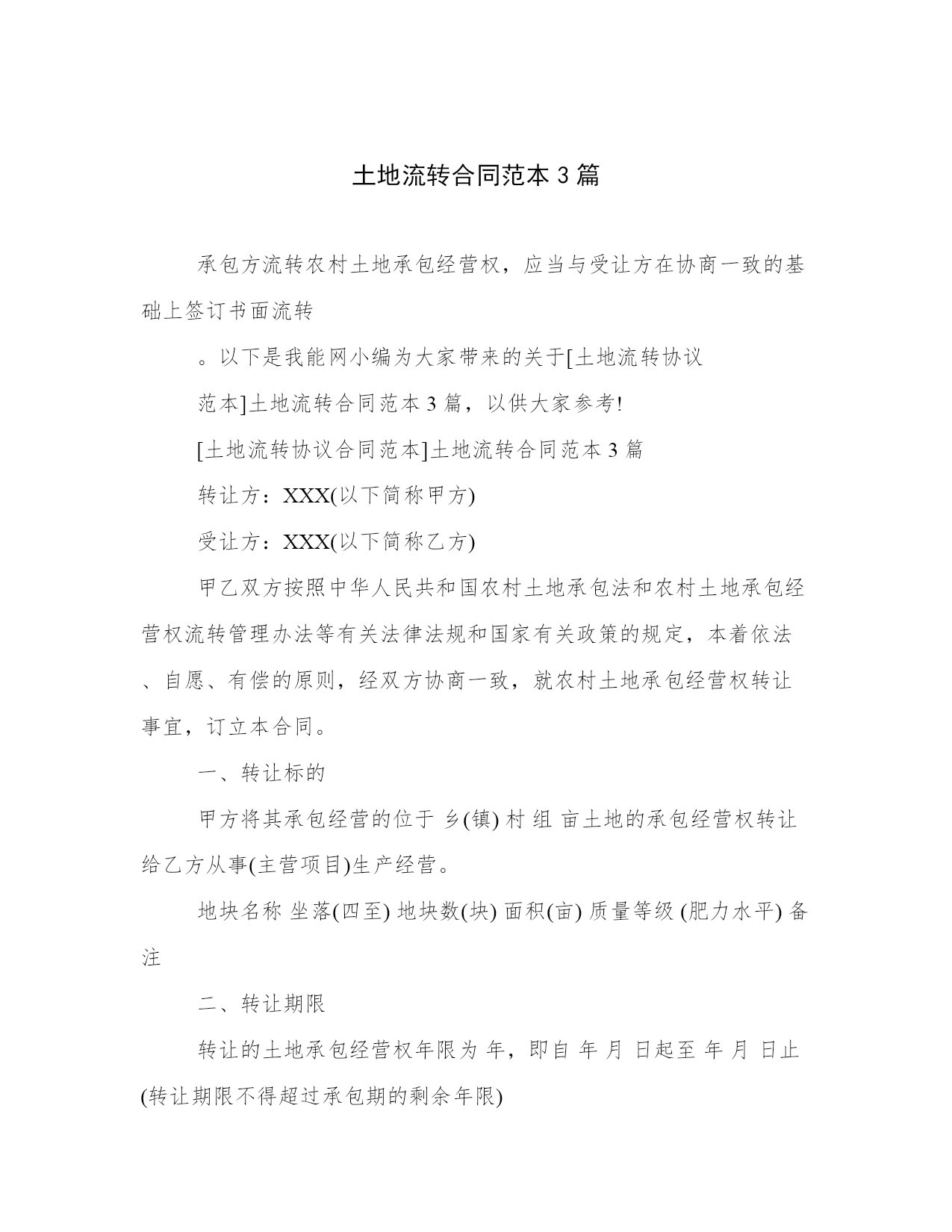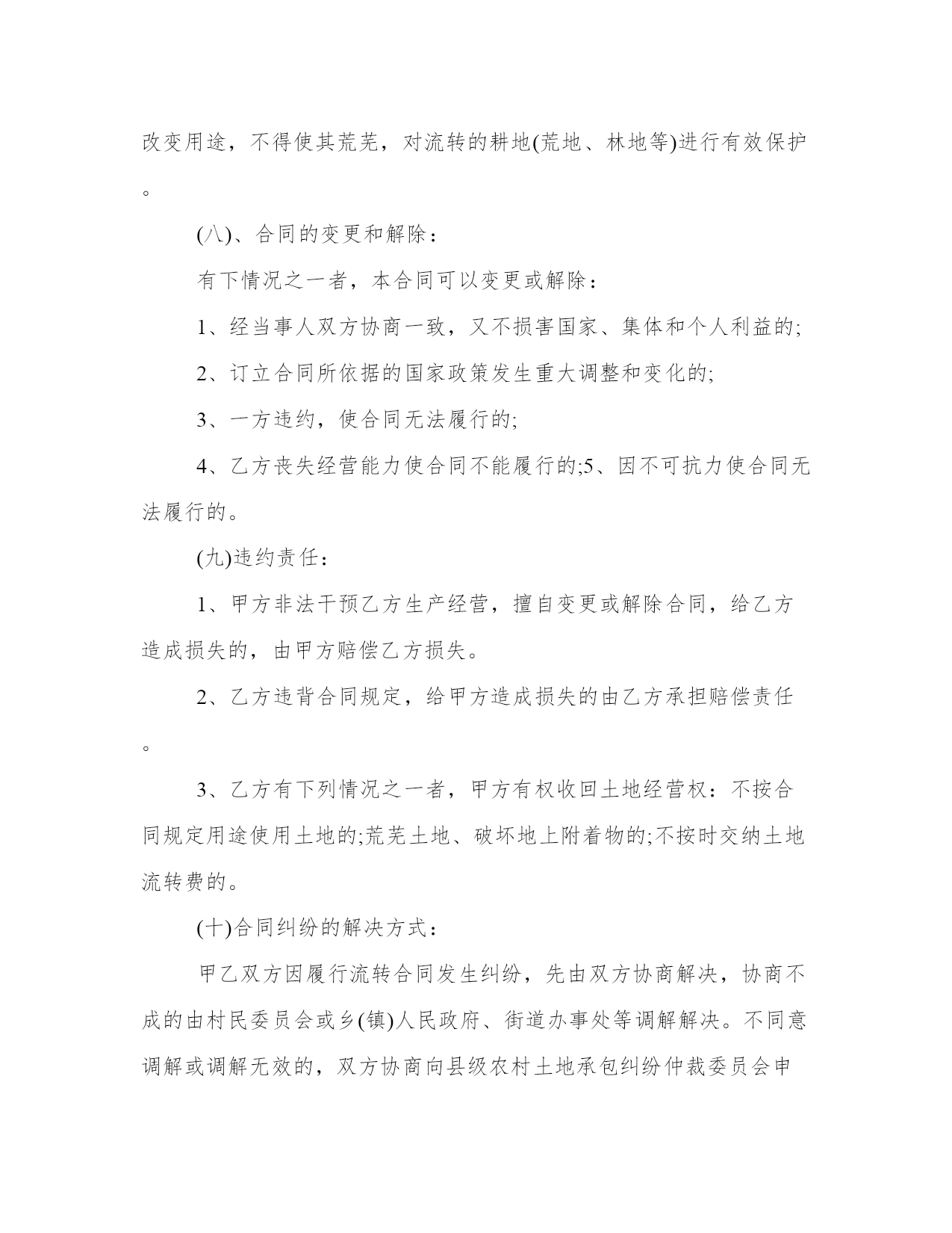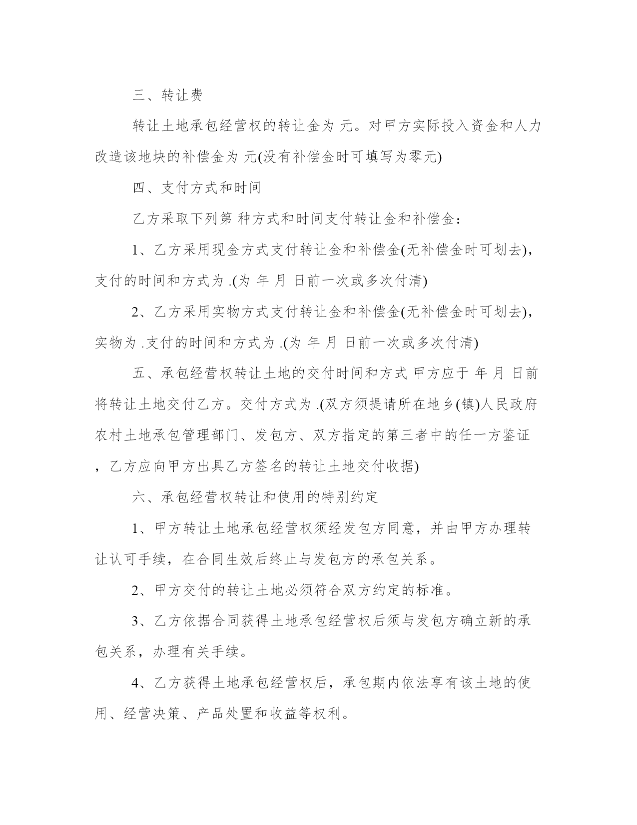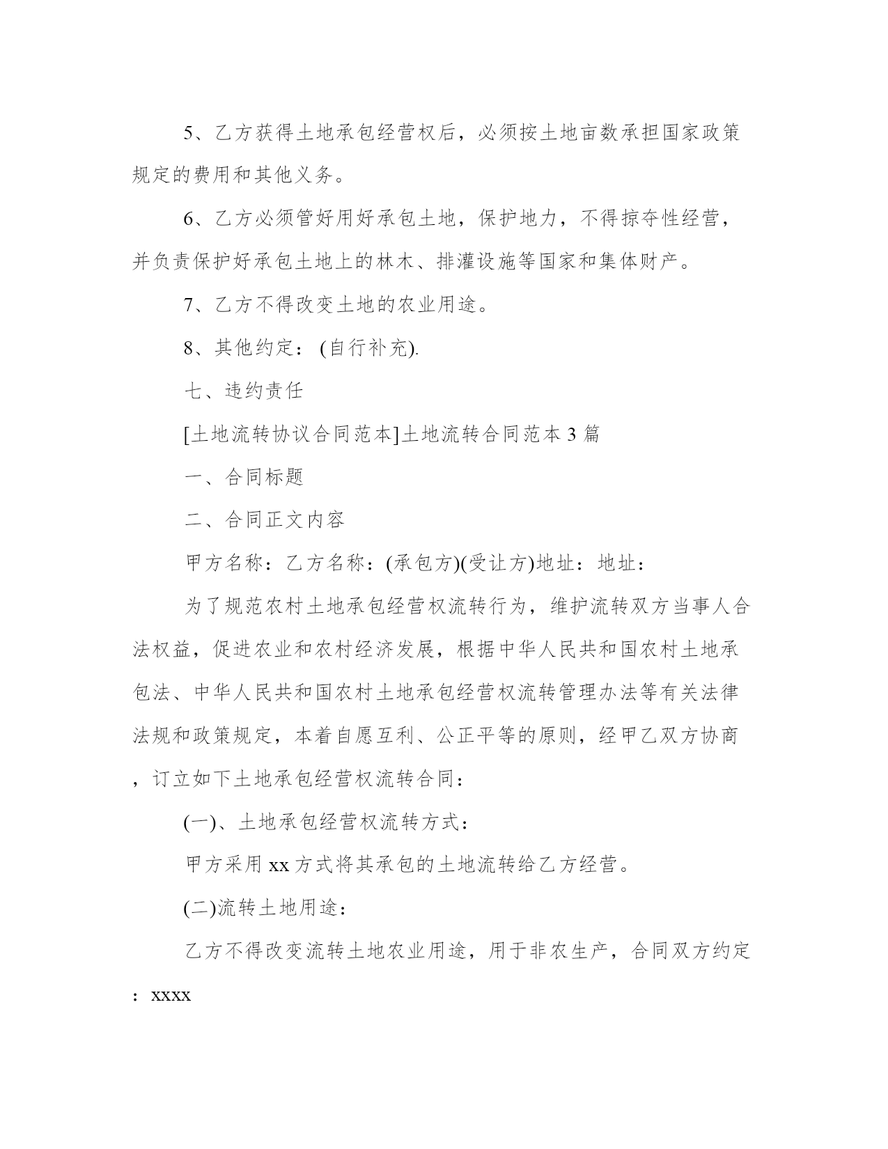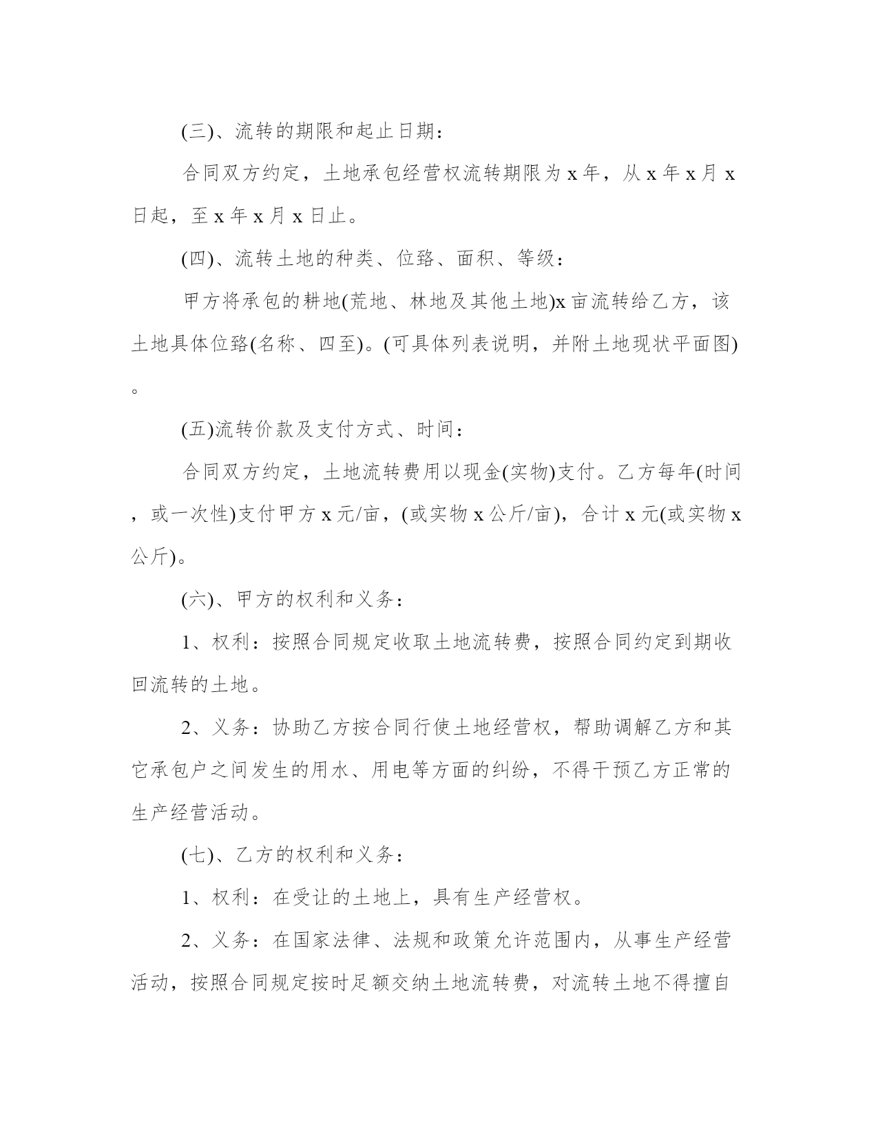 土地流转合同范本3篇承包方流转农村土地承包经营权,应当与受让方在协商一致的基础上签订书面流转。以下是我能网小编为大家带来的关于[土地流转协议范本]土地流转合同范本3篇,以供大家参考![土地流转协议合同范本]土地流转合同范本3篇转让方:XXX(以下简称甲方)受让方:XXX(以下简称乙方)甲乙双方按照中华人民共和国农村土地承包法和农村土地承包经营权流转管理办法等有关法律法规和国家有关政策的规定,本着依法、自愿、有偿的原则,经双方协商一致,就农村土地承包经营权转让事宜,订立本合同。一、转让标的甲方将其承包经营的位于乡(镇)村组亩土地的承包经营权转让给乙方从事(主营项目)生产经营。地块名称坐落(四至)地块数(块)面积(亩)质量等级(肥力水平)备注二、转让期限转让的土地承包经营权年限为年,即自年月日起至年月日止(转让期限不得超过承包期的剩余年限)三、转让费转让土地承包经营权的转让金为元。对甲方实际投入资金和人力改造该地块的补偿金为元(没有补偿金时可填写为零元)四、支付方式和时间乙方采取下列第种方式和时间支付转让金和补偿金:1、乙方采用现金方式支付转让金和补偿金(无补偿金时可划去),支付的时间和方式为.(为年月日前一次或多次付清)2、乙方采用实物方式支付转让金和补偿金(无补偿金时可划去),实物为.支付的时间和方式为.(为年月日前一次或多次付清)五、承包经营权转让土地的交付时间和方式甲方应于年月日前将转让土地交付乙方。交付方式为.(双方须提请所在地乡(镇)人民政府农村土地承包管理部门、发包方、双方指定的第三者中的任一方鉴证,乙方应向甲方出具乙方签名的转让土地交付收据)六、承包经营权转让和使用的特别约定1、甲方转让土地承包经营权须经发包方同意,并由甲方办理转让认可手续,在合同生效后终止与发包方的承包关系。2、甲方交付的转让土地必须符合双方约定的标准。3、乙方依据合同获得土地承包经营权后须与发包方确立新的承包关系,办理有关手续。4、乙方获得土地承包经营权后,承包期内依法享有该土地的使用、经营决策、产品处置和收益等权利。5、乙方获得土地承包经营权后,必须按土地亩数承担国家政策规定的费用和其他义务。6、乙方必须管好用好承包土地,保护地力,不得掠夺性经营,并负责保护好承包土地上的林木、排灌设施等国家和集体财产。7、乙方不得改变土地的农业用途。8、其他约定:(自行补充).七、违约责任[土地流转协议合同范本]土地流转合同范本3篇一、合同标题二、合同正文内容甲方名称:乙方名称:(承包方)(受让方)地址:地址:为了规范农村土地承包经营权流转行为,维护流转双方当事人合法权益,促进农业和农村经济发展,根据中华人民共和国农村土地承包法、中华人民共和国农村土地承包经营权流转管理办法等有关法律法规和政策规定,本着自愿互利、公正平等的原则,经甲乙双方协商,订立如下土地承包经营权流转合同:(一)、土地承包经营权流转方式:甲方采用xx方式将其承包的土地流转给乙方经营。(二)流转土地用途:乙方不得改变流转土地农业用途,用于非农生产,合同双方约定:xxxx(三)、流转的期限和起止日期:合同双方约定,土地承包经营权流转期限为x年,从x年x月x日起,至x年x月x日止。(四)、流转土地的种类、位臵、面积、等级:甲方将承包的耕地(荒地、林地及其他土地)x亩流转给乙方,该土地具体位臵(名称、四至)。(可具体列表说明,并附土地现状平面图)。(五)流转价款及支付方式、时间:合同双方约定,土地流转费用以现金(实物)支付。乙方每年(时间,或一次性)支付甲方x元/亩,(或实物x公斤/亩),合计x元(或实物x公斤)。(六)、甲方的权利和义务:1、权利:按照合同规定收取土地流转费,按照合同约定到期收回流转的土地。2、义务:协助乙方按合同行使土地经营权,帮助调解乙方和其它承包户之间发生的用水、用电等方面的纠纷,不得干预乙方正常的生产经营活动。(七)、乙方的权利和义务:1、权利:在受让的土地上,具有生产经营权。2、义务:在国家法律、法规和政策允许范围内,从事生产经营活动,按照合同规定按时足额交纳土地流转费,对流转土地不得擅自改变用途,不得使其荒芜,对流转的耕地(荒地、林地等)进行有效保护。(八)、合同的变更和解除:有下情况之一者,本合同可以变更或解除:1、经当事人双方协商一致,又不损害国家、集体和个人利益的;2、订立合同所依据的国家政策发生重大调整和变化的;3、一方违约,使合同无法履行的;4、乙方丧失经营能力使合同不能履行的;5、因不可抗力使合同无法履行的。(九)违约责任:1、甲方非法干预乙方生产经营,擅自变更或解除合同,给乙方造成损失的,由甲方赔偿乙方损失。2、乙方违背合同规定,给甲方造成损失的由乙方承担赔偿责任。3、乙方有下列情况之一者,甲方有权收回土地经营权:不按合同规定用途使用土地的;荒芜土地、破