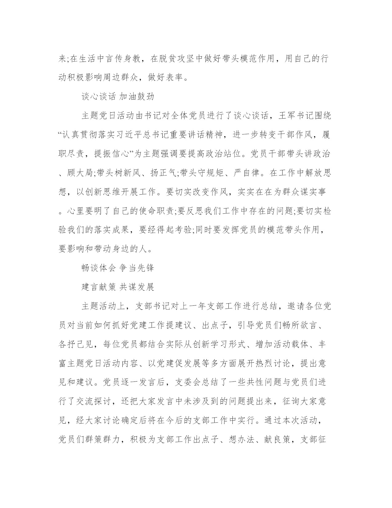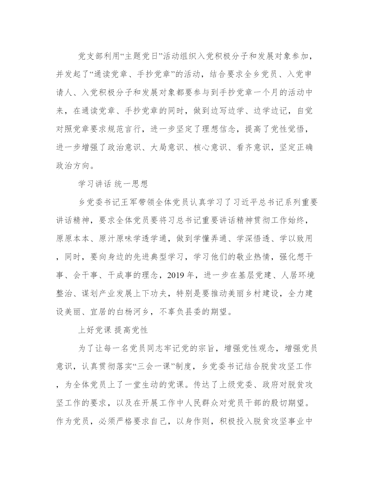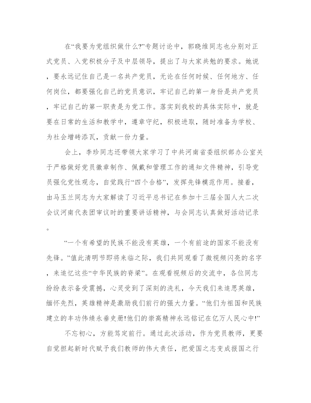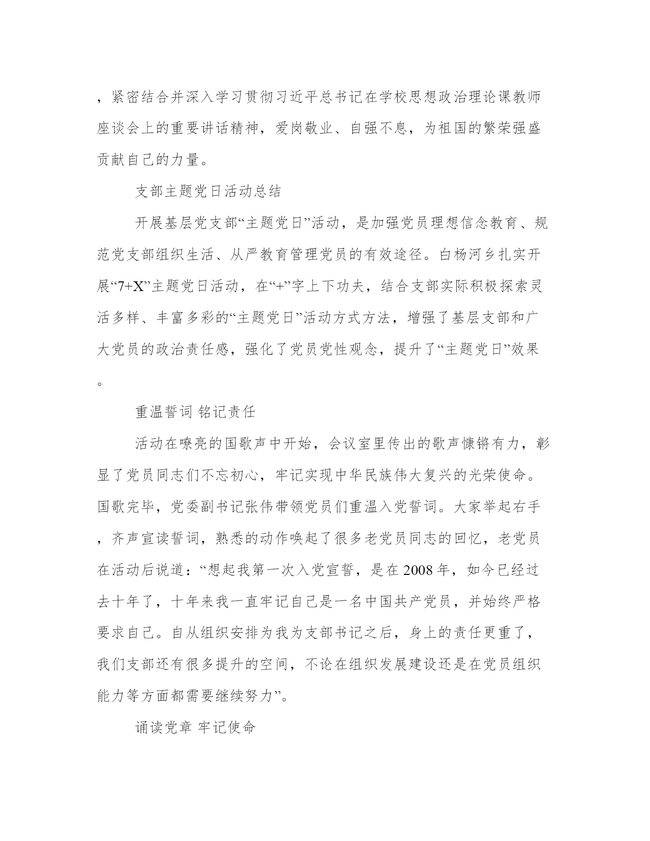 支部主题党日活动总结主题党日活动是推进“活力人社,惠民先锋”党建品牌的重要抓手。习近平总书记指出,党的工作最坚实的力量支撑在基层,最突出的矛盾问题也在基层,必须把抓基层打基础作为长远之计和固本之举。总书记还强调,党的基层组织建设制度改革,着力点是使每个基层党组织都成为战斗堡垒。本站为大家整理的相关的支部主题党日活动总结,供大家参考选择。支部主题党日活动总结根据中共浚县县委组织部2019年4月份“支部主题党日”活动派遣单要求,我校党支部于4月4日上午在党员活动室召开“缅怀先烈、不忘初心、牢记使命”支部主题党日活动,活动由党支部书记郭晓维同志主持,全体党员及入党积极分子、各中层领导无一缺席。活动开始前,由支部书记郭晓维同志现场点名,与会党员答到。点名严肃认真,答到干脆利落,唤醒了党员肩负的使命感和责任感。活动正式开始后,全体党员在支部书记郭晓维同志的带领下,面向党旗重温了入党誓词。她强调,将入党誓词烂熟于心,是对党员最基本的要求,作为领导干部,还要以更高、更严的标准要求自己,她希望党支部的每一名党员对自己进行帮助和监督,同时,大家一起加强学习,提高认识,推动工作更好更快的进行。在“我要为党组织做什么?”专题讨论中,郭晓维同志也分别对正式党员、入党积极分子及中层领导,提出了与大家共勉的要求。她说,要永远记住自己是一名共产党员,无论在任何时候、任何地方、任何岗位,都要强化自己的党员意识,牢记自己的第一身份是共产党员,牢记自己的第一职责是为党工作。落实到我校的具体实际中,就是要在日常的生活和教学中,遵章守纪,积极进取,随时准备为学校、为社会增砖添瓦,贡献一份力量。会上,李珍同志还带领大家学习了中共河南省委组织部办公室关于严格做好党员徽章制作、佩戴和管理工作的通知文件精神,引导党员强化党性观念,自觉践行“四个合格”,发挥先锋模范作用。接着,由马玉兰同志为大家解读了习近平总书记在参加十三届全国人大二次会议河南代表团审议时的重要讲话精神,与会同志认真做好活动记录。“一个有希望的民族不能没有英雄,一个有前途的国家不能没有先锋。”值此清明节即将来临之际,我们共同观看了微视频闪亮的名字,来追忆这些“中华民族的脊梁”。在观看视频后的交流中,各位同志纷纷表示备受震撼,心灵受到了深刻的洗礼,今天我们来追思英雄,缅怀先烈,英雄精神是激励我们前行的强大力量。“他们为祖国和民族建立的丰功伟绩永垂史册!他们的崇高精神永远铭记在亿万人民心中!”不忘初心,方能笃定前行。通过此次活动,作为党员教师,更要自觉担起新时代赋予我们教师的伟大责任,把爱国之志变成报国之行,紧密结合并深入学习贯彻习近平总书记在学校思想政治理论课教师座谈会上的重要讲话精神,爱岗敬业、自强不息,为祖国的繁荣强盛贡献自己的力量。支部主题党日活动总结开展基层党支部“主题党日”活动,是加强党员理想信念教育、规范党支部组织生活、从严教育管理党员的有效途径。白杨河乡扎实开展“7+X”主题党日活动,在“+”字上下功夫,结合支部实际积极探索灵活多样、丰富多彩的“主题党日”活动方式方法,增强了基层支部和广大党员的政治责任感,强化了党员党性观念,提升了“主题党日”效果。重温誓词铭记责任活动在嘹亮的国歌声中开始,会议室里传出的歌声慷锵有力,彰显了党员同志们不忘初心,牢记实现中华民族伟大复兴的光荣使命。国歌完毕,党委副书记张伟带领党员们重温入党誓词。大家举起右手,齐声宣读誓词,熟悉的动作唤起了很多老党员同志的回忆,老党员在活动后说道:“想起我第一次入党宣誓,是在2008年,如今已经过去十年了,十年来我一直牢记自己是一名中国共产党员,并始终严格要求自己。自从组织安排为我为支部书记之后,身上的责任更重了,我们支部还有很多提升的空间,不论在组织发展建设还是在党员组织能力等方面都需要继续努力”。诵读党章牢记使命党支部利用“主题党日”活动组织入党积极分子和发展对象参加,并发起了“通读党章、手抄党章”的活动,结合要求全乡党员、入党申请人、入党积极分子和发展对象都要参与到手抄党章一个月的活动中来,在通读党章、手抄党章的同时,做到边写边学、边学边记,自觉对照党章要求规范言行,进一步坚定了理想信念,提高了党性觉悟,进一步增强了政治意识、大局意识、核心意识、看齐意识,坚定正确政治方向。学习讲话统一思想乡党委书记王军带领全体党员认真学习了习近平总书记系列重要讲话精神,要求全体党员要将习总书记重要讲话精神贯彻工作始终,原原本本、原汁原味学透学通,做到学懂弄通、学深悟透、学以致用,同时,要向身边的先进典型学习,学习他们的敬业热情,强化想干事、会干事、干成事的理念,2019年,进一步在基层党建、人居环境整治、谋划产业发展上下功夫,特别是要推动美丽乡村建设,全力建设美丽、宜居的白杨河乡,不辜负县委的期望。上好党课提高党性为了让每一名党员同志牢记党的宗