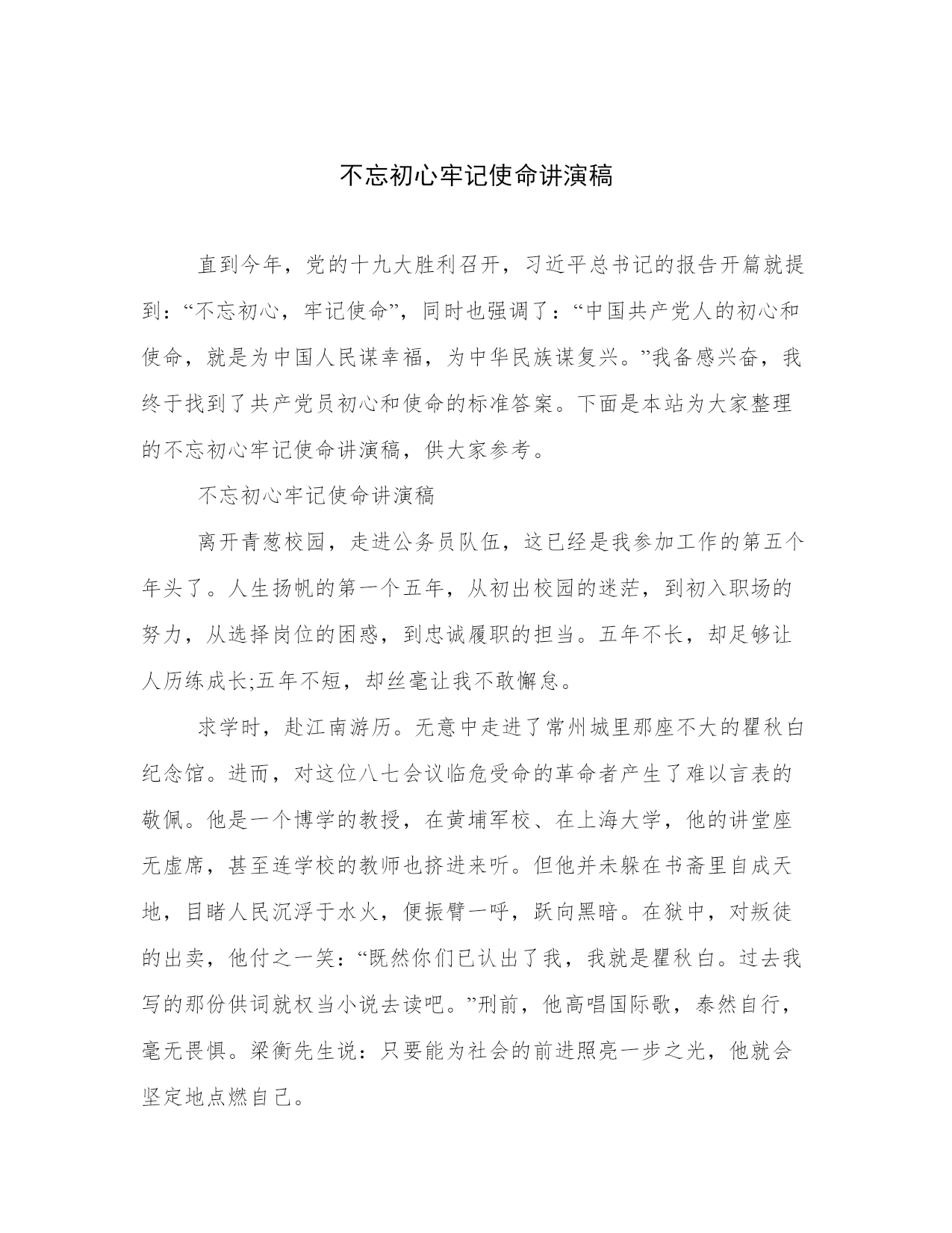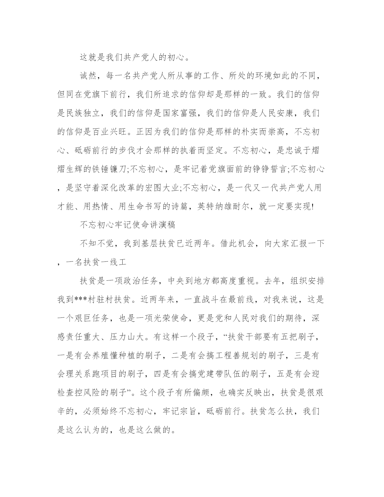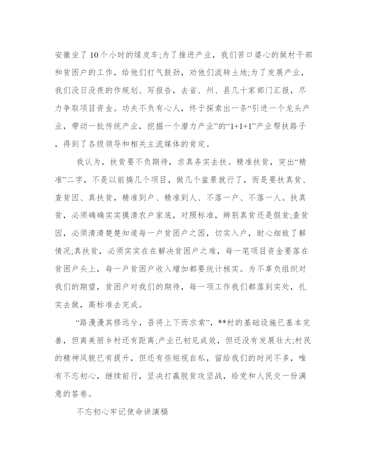 不忘初心牢记使命讲演稿直到今年,党的十九大胜利召开,习近平总书记的报告开篇就提到:“不忘初心,牢记使命”,同时也强调了:“中国共产党人的初心和使命,就是为中国人民谋幸福,为中华民族谋复兴。”我备感兴奋,我终于找到了共产党员初心和使命的标准答案。下面是本站为大家整理的不忘初心牢记使命讲演稿,供大家参考。不忘初心牢记使命讲演稿离开青葱校园,走进公务员队伍,这已经是我参加工作的第五个年头了。人生扬帆的第一个五年,从初出校园的迷茫,到初入职场的努力,从选择岗位的困惑,到忠诚履职的担当。五年不长,却足够让人历练成长;五年不短,却丝毫让我不敢懈怠。求学时,赴江南游历。无意中走进了常州城里那座不大的瞿秋白纪念馆。进而,对这位八七会议临危受命的革命者产生了难以言表的敬佩。他是一个博学的教授,在黄埔军校、在上海大学,他的讲堂座无虚席,甚至连学校的教师也挤进来听。但他并未躲在书斋里自成天地,目睹人民沉浮于水火,便振臂一呼,跃向黑暗。在狱中,对叛徒的出卖,他付之一笑:“既然你们已认出了我,我就是瞿秋白。过去我写的那份供词就权当小说去读吧。”刑前,他高唱国际歌,泰然自行,毫无畏惧。梁衡先生说:只要能为社会的前进照亮一步之光,他就会坚定地点燃自己。这就是我们共产党人的初心。诚然,每一名共产党人所从事的工作、所处的环境如此的不同,但同在党旗下前行,我们所追求的信仰却是那样的一致。我们的信仰是民族独立,我们的信仰是国家富强,我们的信仰是人民安康,我们的信仰是百业兴旺。正因为我们的信仰是那样的朴实而崇高,不忘初心、砥砺前行的步伐才会那样的执着而坚定。不忘初心,是忠诚于熠熠生辉的铁锤镰刀;不忘初心,是牢记着党旗面前的铮铮誓言;不忘初心,是坚守着深化改革的宏图大业;不忘初心,是一代又一代共产党人用才能、用热情、用生命书写的诗篇,英特纳雄耐尔,就一定要实现!不忘初心牢记使命讲演稿不知不觉,我到基层扶贫已近两年。借此机会,向大家汇报一下,一名扶贫一线工扶贫是一项政治任务,中央到地方都高度重视。去年,组织安排我到***村驻村扶贫。近两年来,一直战斗在最前线,对我来说,这是一个艰巨任务,也是一项光荣使命,更是党和人民对我们的期待,深感责任重大、压力山大。有这样一个段子,“扶贫干部要有五把刷子,一是有会养殖懂种植的刷子,二是有会搞工程善规划的刷子,三是有会理关系跑项目的刷子,四是有会搞党建带队伍的刷子,五是有会迎检查控风险的刷子”。这个段子有所偏颇,也确实反映出,扶贫是很艰辛的,必须始终不忘初心,牢记宗旨,砥砺前行。扶贫怎么扶,我们是这么认为的,也是这么做的。我认为,扶贫要不忘初心,带着感情去扶。我们刚来时,生活条件简陋,吃饭、出行都是问题,很多工作一片空白,需要重头开始,基础工作方面,**村有贫困户93户400人,要每户一档一册,每户档案有二十多张表格,还要适时调整;基础设施方面,水、电、路、网等基础条件极为缺乏;产业方面,没有特色产业、没有致富能人、没有可持续增收的路径。再加上,对家人的牵挂,对爱人和小孩的愧疚,一度让我产生消极情绪。但当我看到**村的贫穷落后,贫困户简陋的房屋、原始的生活条件,看到那期盼的眼神、渴望脱贫的热情,我的心融化了,慢慢的融入到工作中去,融入到村民中去,心中渐渐装满扶贫,带着一名共产党人的信念,走村入户,听取村情民意,掌握村里最需、群众最盼的事项,谋划切合实际的目标,与干部群众凝心聚力,一步一个脚印去改变当地面貌。全身心的付出是有回报的,回报就是村民感激的笑容。我认为,扶贫要不辱使命,敢于担当去扶。贫困户不增收,工作没有说服力,而要实现贫困户可持续增收,只有发展产业,但发展产业问题很多、阻力很大、风险很高。我也可以用扶贫资金搞几个大棚,然后用表格来脱贫,用资料来迎检,这样没风险,工作也轻松,3年一晃就过去了,但是对不起组织的信任,对不起村民的信任,也对不起自己的良心。所以,我们从刚开始就把产业做为帮扶重心,为了规划产业,我们走遍了木里的山山水水、每家每户,实地查看自然条件;为了引进产业,我们多次到外地考察,招商引资,反复论证,一次到安徽坐了10个小时的绿皮车;为了推进产业,我们苦口婆心的做村干部和贫困户的工作,给他们打气鼓劲,劝他们流转土地;为了发展产业,我们没日没夜的作规划、写报告,去省、州、县几十家部门汇报,尽力争取项目资金。功夫不负有心人,终于探索出一条“引进一个龙头产业,带动一批传统产业,挖掘一个潜力产业”的“1+1+1”产业帮扶路子,得到了各级领导和相关主流媒体的肯定。我认为,扶贫要不负期待,求真务实去扶。精准扶贫,突出“精准”二字,不是以前搞几个项目,做几个盆景就行了,而是要扶真贫、查贫因、真扶贫,精准到户、精准到人、不落一户、不落一人。扶真贫,必须确确实实摸清农户家底,对照标准,辨别真贫还是假贫;查贫因,必须清清楚楚知道每一户贫