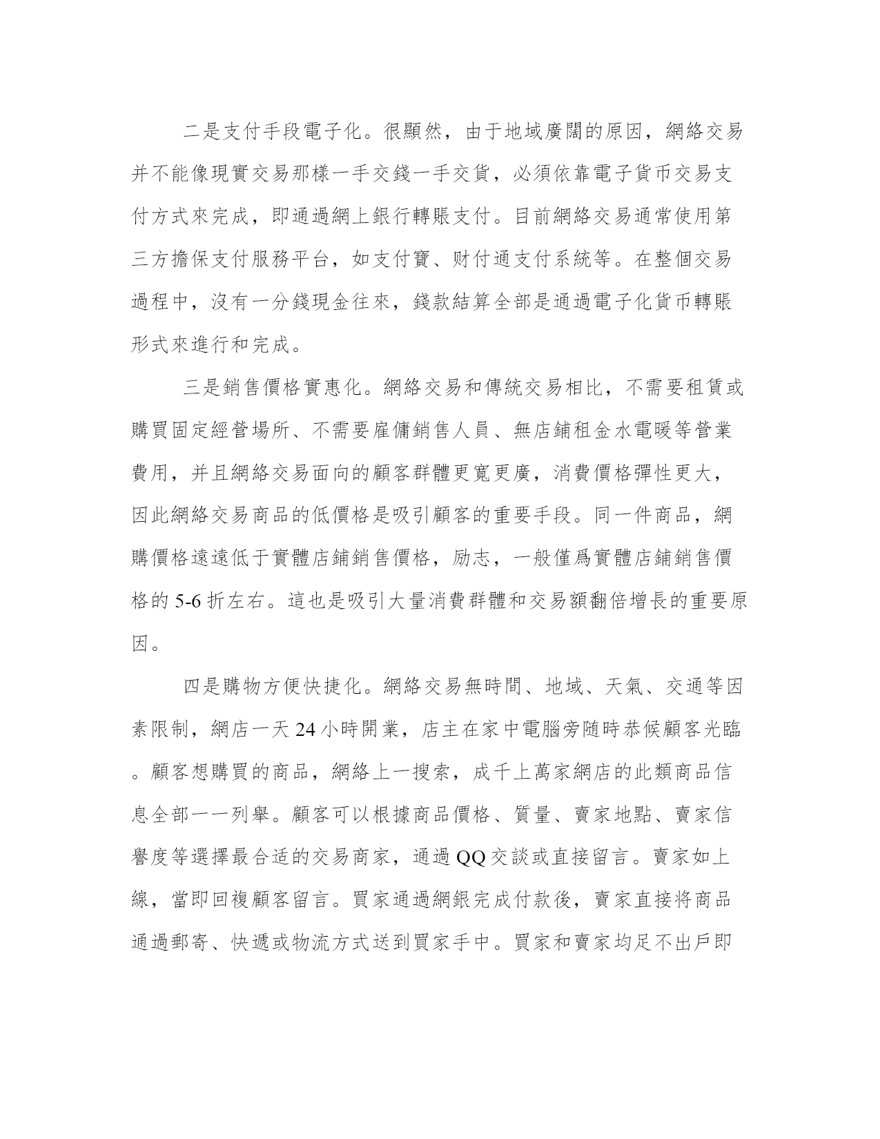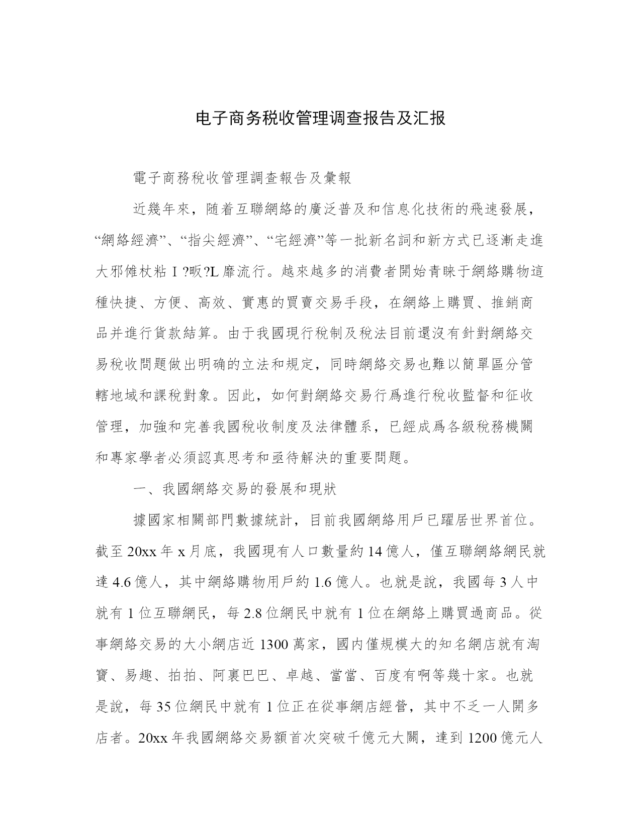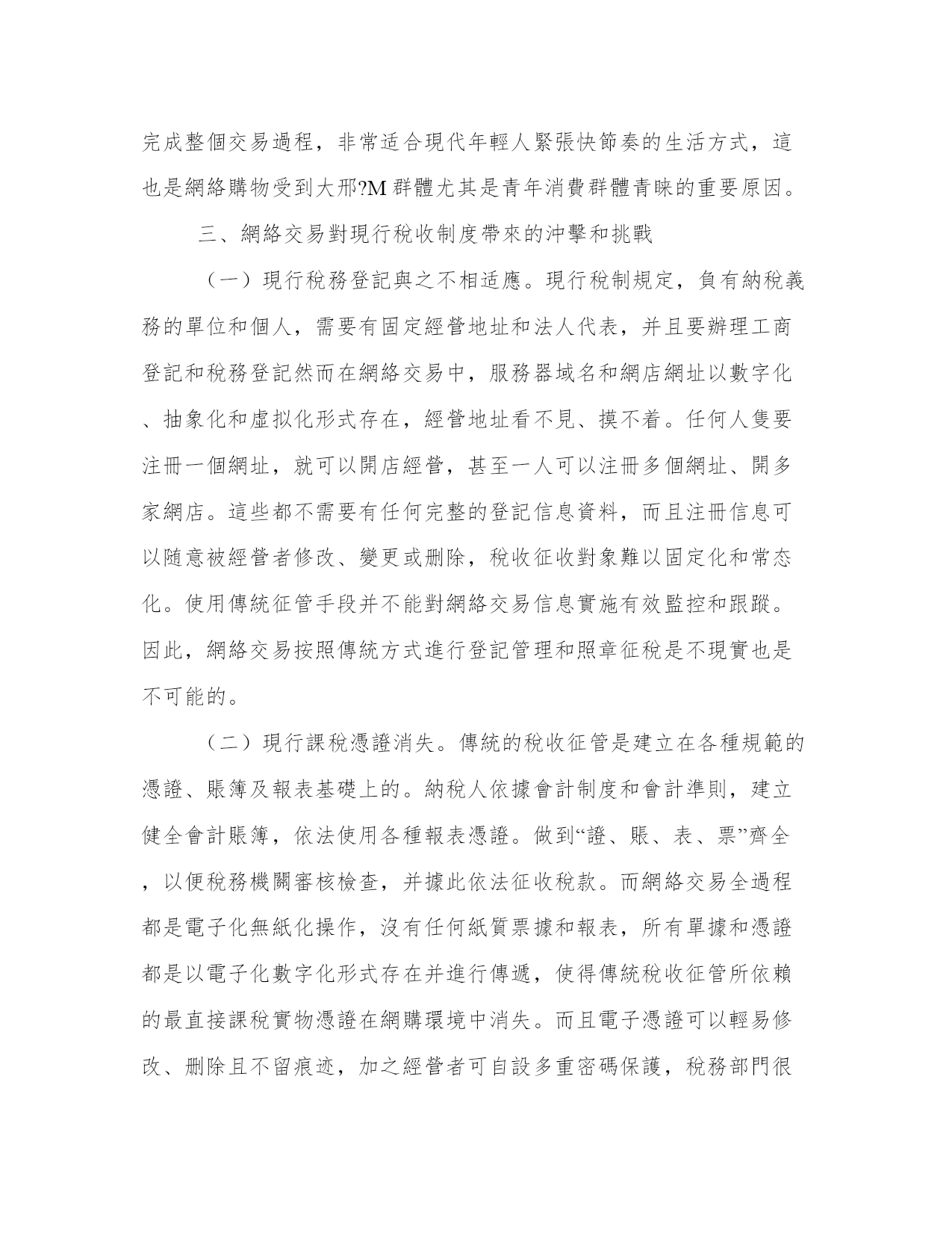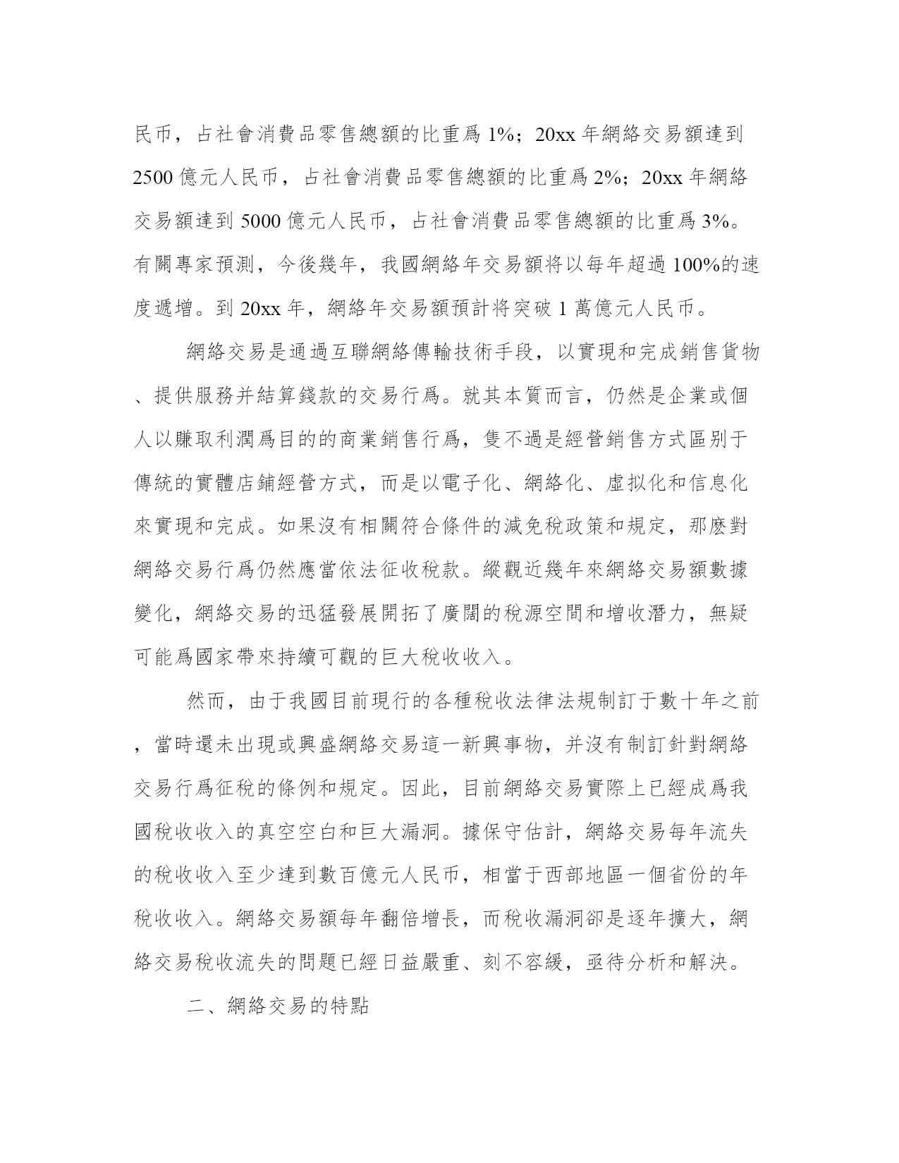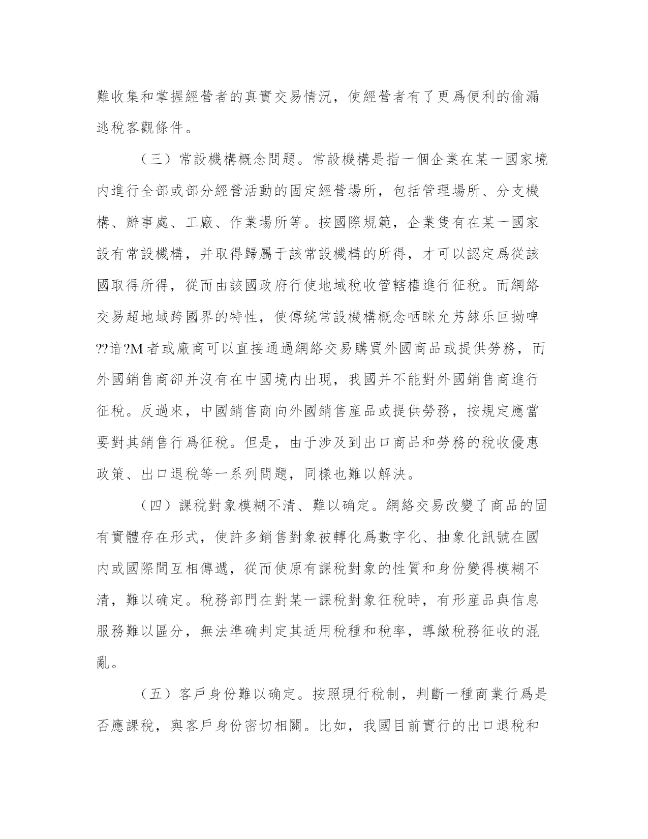 电子商务税收管理调查报告及汇报電子商務稅收管理調查報告及彙報近幾年來,随着互聯網絡的廣泛普及和信息化技術的飛速發展,“網絡經濟”、“指尖經濟”、“宅經濟”等一批新名詞和新方式已逐漸走進大邪傩杖粘I?畈?L靡流行。越來越多的消費者開始青睐于網絡購物這種快捷、方便、高效、實惠的買賣交易手段,在網絡上購買、推銷商品并進行貨款結算。由于我國現行稅制及稅法目前還沒有針對網絡交易稅收問題做出明确的立法和規定,同時網絡交易也難以簡單區分管轄地域和課稅對象。因此,如何對網絡交易行爲進行稅收監督和征收管理,加強和完善我國稅收制度及法律體系,已經成爲各級稅務機關和專家學者必須認真思考和亟待解決的重要問題。一、我國網絡交易的發展和現狀據國家相關部門數據統計,目前我國網絡用戶已躍居世界首位。截至20xx年x月底,我國現有人口數量約14億人,僅互聯網絡網民就達4.6億人,其中網絡購物用戶約1.6億人。也就是說,我國每3人中就有1位互聯網民,每2.8位網民中就有1位在網絡上購買過商品。從事網絡交易的大小網店近1300萬家,國内僅規模大的知名網店就有淘寶、易趣、拍拍、阿裏巴巴、卓越、當當、百度有啊等幾十家。也就是說,每35位網民中就有1位正在從事網店經營,其中不乏一人開多店者。20xx年我國網絡交易額首次突破千億元大關,達到1200億元人民币,占社會消費品零售總額的比重爲1%;20xx年網絡交易額達到2500億元人民币,占社會消費品零售總額的比重爲2%;20xx年網絡交易額達到5000億元人民币,占社會消費品零售總額的比重爲3%。有關專家預測,今後幾年,我國網絡年交易額将以每年超過100%的速度遞增。到20xx年,網絡年交易額預計将突破1萬億元人民币。網絡交易是通過互聯網絡傳輸技術手段,以實現和完成銷售貨物、提供服務并結算錢款的交易行爲。就其本質而言,仍然是企業或個人以賺取利潤爲目的的商業銷售行爲,隻不過是經營銷售方式區别于傳統的實體店鋪經營方式,而是以電子化、網絡化、虛拟化和信息化來實現和完成。如果沒有相關符合條件的減免稅政策和規定,那麽對網絡交易行爲仍然應當依法征收稅款。縱觀近幾年來網絡交易額數據變化,網絡交易的迅猛發展開拓了廣闊的稅源空間和增收潛力,無疑可能爲國家帶來持續可觀的巨大稅收收入。然而,由于我國目前現行的各種稅收法律法規制訂于數十年之前,當時還未出現或興盛網絡交易這一新興事物,并沒有制訂針對網絡交易行爲征稅的條例和規定。因此,目前網絡交易實際上已經成爲我國稅收收入的真空空白和巨大漏洞。據保守估計,網絡交易每年流失的稅收收入至少達到數百億元人民币,相當于西部地區一個省份的年稅收收入。網絡交易額每年翻倍增長,而稅收漏洞卻是逐年擴大,網絡交易稅收流失的問題已經日益嚴重、刻不容緩,亟待分析和解決。二、網絡交易的特點二是支付手段電子化。很顯然,由于地域廣闊的原因,網絡交易并不能像現實交易那樣一手交錢一手交貨,必須依靠電子貨币交易支付方式來完成,即通過網上銀行轉賬支付。目前網絡交易通常使用第三方擔保支付服務平台,如支付寶、财付通支付系統等。在整個交易過程中,沒有一分錢現金往來,錢款結算全部是通過電子化貨币轉賬形式來進行和完成。三是銷售價格實惠化。網絡交易和傳統交易相比,不需要租賃或購買固定經營場所、不需要雇傭銷售人員、無店鋪租金水電暖等營業費用,并且網絡交易面向的顧客群體更寬更廣,消費價格彈性更大,因此網絡交易商品的低價格是吸引顧客的重要手段。同一件商品,網購價格遠遠低于實體店鋪銷售價格,励志,一般僅爲實體店鋪銷售價格的5-6折左右。這也是吸引大量消費群體和交易額翻倍增長的重要原因。四是購物方便快捷化。網絡交易無時間、地域、天氣、交通等因素限制,網店一天24小時開業,店主在家中電腦旁随時恭候顧客光臨。顧客想購買的商品,網絡上一搜索,成千上萬家網店的此類商品信息全部一一列舉。顧客可以根據商品價格、質量、賣家地點、賣家信譽度等選擇最合适的交易商家,通過QQ交談或直接留言。賣家如上線,當即回複顧客留言。買家通過網銀完成付款後,賣家直接将商品通過郵寄、快遞或物流方式送到買家手中。買家和賣家均足不出戶即完成整個交易過程,非常适合現代年輕人緊張快節奏的生活方式,這也是網絡購物受到大邢?M群體尤其是青年消費群體青睐的重要原因。三、網絡交易對現行稅收制度帶來的沖擊和挑戰(一)現行稅務登記與之不相适應。現行稅制規定,負有納稅義務的單位和個人,需要有固定經營地址和法人代表,并且要辦理工商登記和稅務登記然而在網絡交易中,服務器域名和網店網址以數字化、抽象化和虛拟化形式存在,經營地址看不見、摸不着。任何人隻要注冊一個網址,就可以開店經營,甚至一人可以注冊多個網址、開多家網店。這些都不需要有任何完整的登記信息資料,而且注冊信息可以随意被經營者修改、變更或删除,稅收征收對象難以固