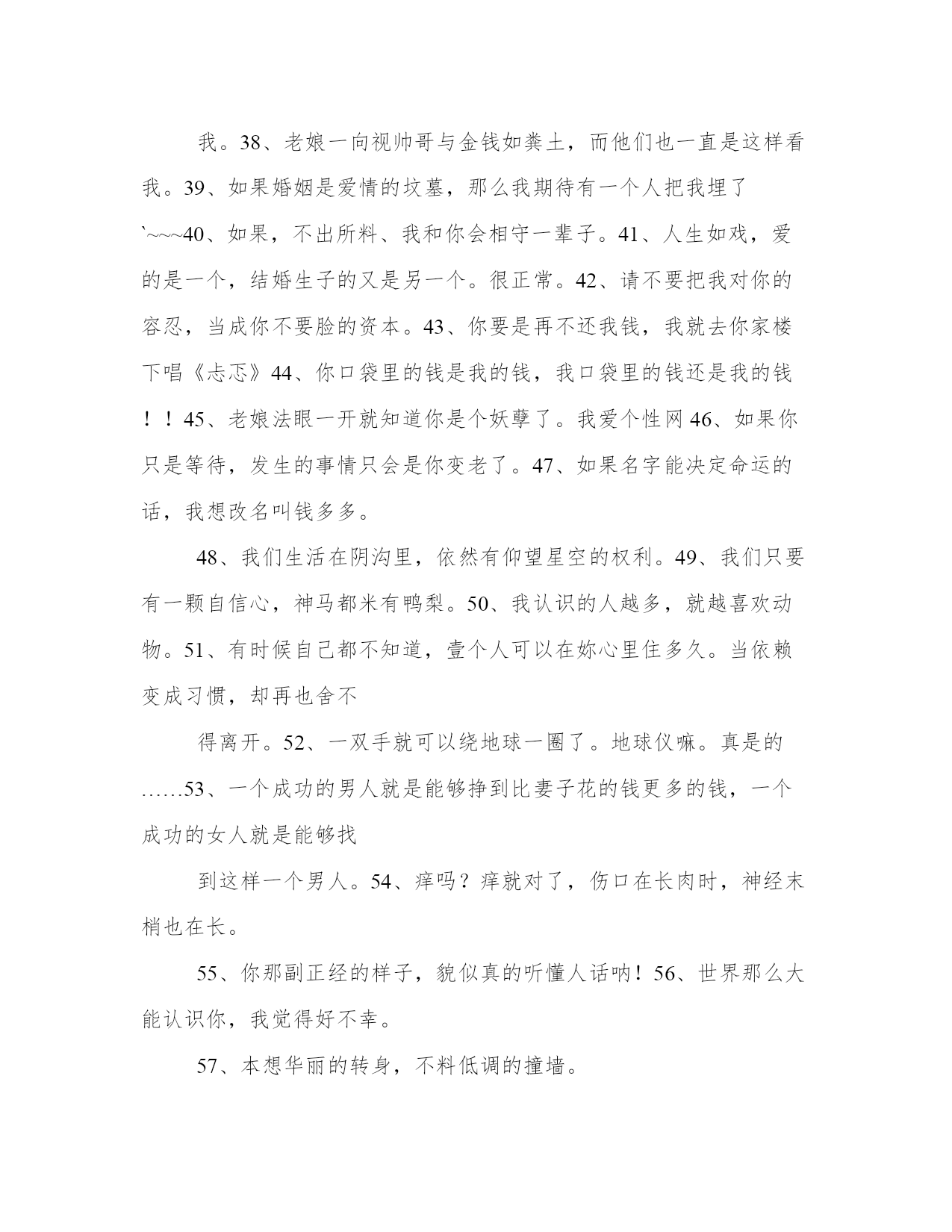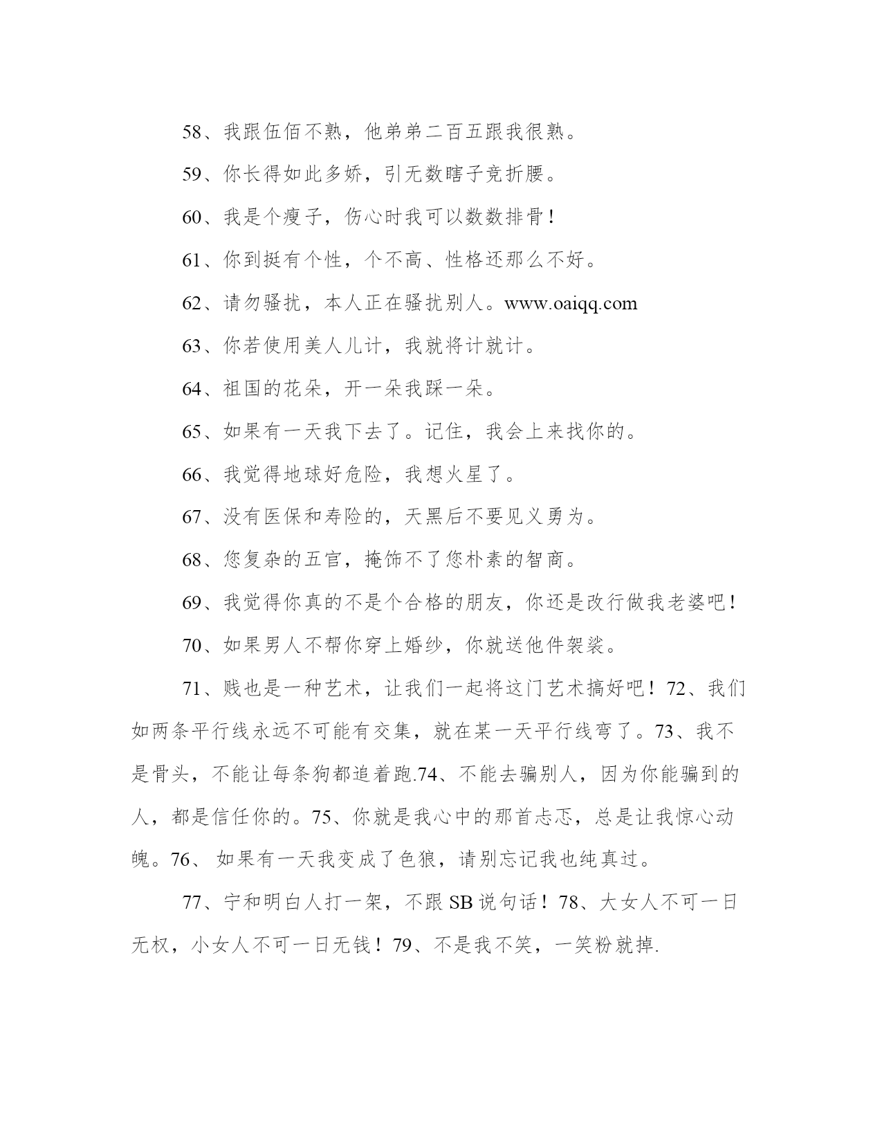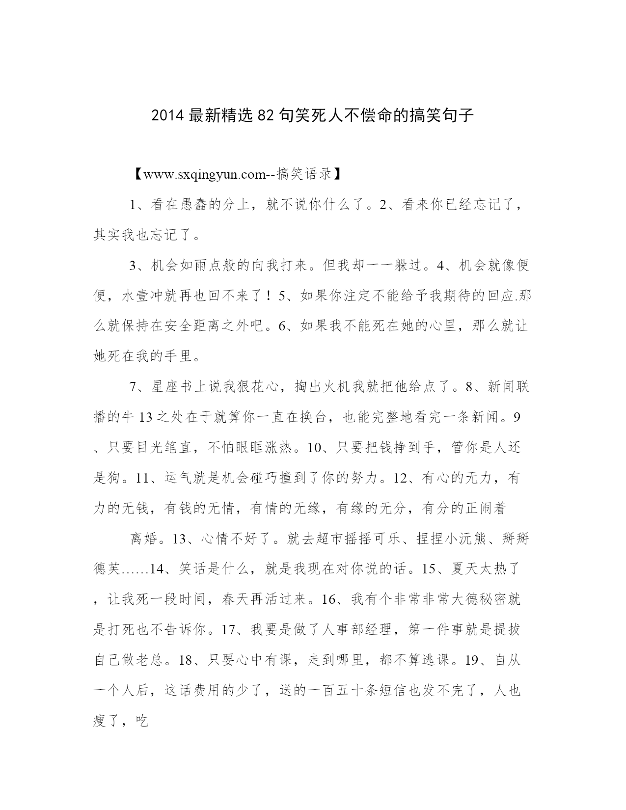 2014最新精选82句笑死人不偿命的搞笑句子【www.sxqingyun.com--搞笑语录】1、看在愚蠢的分上,就不说你什么了。2、看来你已经忘记了,其实我也忘记了。3、机会如雨点般的向我打来。但我却一一躲过。4、机会就像便便,水壹冲就再也回不来了!5、如果你注定不能给予我期待的回应.那么就保持在安全距离之外吧。6、如果我不能死在她的心里,那么就让她死在我的手里。7、星座书上说我狠花心,掏出火机我就把他给点了。8、新闻联播的牛13之处在于就算你一直在换台,也能完整地看完一条新闻。9、只要目光笔直,不怕眼眶涨热。10、只要把钱挣到手,管你是人还是狗。11、运气就是机会碰巧撞到了你的努力。12、有心的无力,有力的无钱,有钱的无情,有情的无缘,有缘的无分,有分的正闹着离婚。13、心情不好了。就去超市摇摇可乐、捏捏小沅熊、掰掰德芙……14、笑话是什么,就是我现在对你说的话。15、夏天太热了,让我死一段时间,春天再活过来。16、我有个非常非常大德秘密就是打死也不告诉你。17、我要是做了人事部经理,第一件事就是提拔自己做老总。18、只要心中有课,走到哪里,都不算逃课。19、自从一个人后,这话费用的少了,送的一百五十条短信也发不完了,人也瘦了,吃我。38、老娘一向视帅哥与金钱如粪土,而他们也一直是这样看我。39、如果婚姻是爱情的坟墓,那么我期待有一个人把我埋了`~~~40、如果,不出所料、我和你会相守一辈子。41、人生如戏,爱的是一个,结婚生子的又是另一个。很正常。42、请不要把我对你的容忍,当成你不要脸的资本。43、你要是再不还我钱,我就去你家楼下唱《忐忑》44、你口袋里的钱是我的钱,我口袋里的钱还是我的钱!!45、老娘法眼一开就知道你是个妖孽了。我爱个性网46、如果你只是等待,发生的事情只会是你变老了。47、如果名字能决定命运的话,我想改名叫钱多多。48、我们生活在阴沟里,依然有仰望星空的权利。49、我们只要有一颗自信心,神马都米有鸭梨。50、我认识的人越多,就越喜欢动物。51、有时候自己都不知道,壹个人可以在妳心里住多久。当依赖变成习惯,却再也舍不得离开。52、一双手就可以绕地球一圈了。地球仪嘛。真是的……53、一个成功的男人就是能够挣到比妻子花的钱更多的钱,一个成功的女人就是能够找到这样一个男人。54、痒吗?痒就对了,伤口在长肉时,神经末梢也在长。55、你那副正经的样子,貌似真的听懂人话呐!56、世界那么大能认识你,我觉得好不幸。57、本想华丽的转身,不料低调的撞墙。58、我跟伍佰不熟,他弟弟二百五跟我很熟。59、你长得如此多娇,引无数瞎子竞折腰。60、我是个瘦子,伤心时我可以数数排骨!61、你到挺有个性,个不高、性格还那么不好。62、请勿骚扰,本人正在骚扰别人。www.oaiqq.com63、你若使用美人儿计,我就将计就计。64、祖国的花朵,开一朵我踩一朵。65、如果有一天我下去了。记住,我会上来找你的。66、我觉得地球好危险,我想火星了。67、没有医保和寿险的,天黑后不要见义勇为。68、您复杂的五官,掩饰不了您朴素的智商。69、我觉得你真的不是个合格的朋友,你还是改行做我老婆吧!70、如果男人不帮你穿上婚纱,你就送他件袈裟。71、贱也是一种艺术,让我们一起将这门艺术搞好吧!72、我们如两条平行线永远不可能有交集,就在某一天平行线弯了。73、我不是骨头,不能让每条狗都追着跑.74、不能去骗别人,因为你能骗到的人,都是信任你的。75、你就是我心中的那首忐忑,总是让我惊心动魄。76、如果有一天我变成了色狼,请别忘记我也纯真过。77、宁和明白人打一架,不跟SB说句话!78、大女人不可一日无权,小女人不可一日无钱!79、不是我不笑,一笑粉就掉.80、世界上最遥远的距离,就他妈是星期一到星期五。81、失败的女人,背后总有个多事的男人。82、没有嫁不到男人的女人,只有娶不到女人的男人。