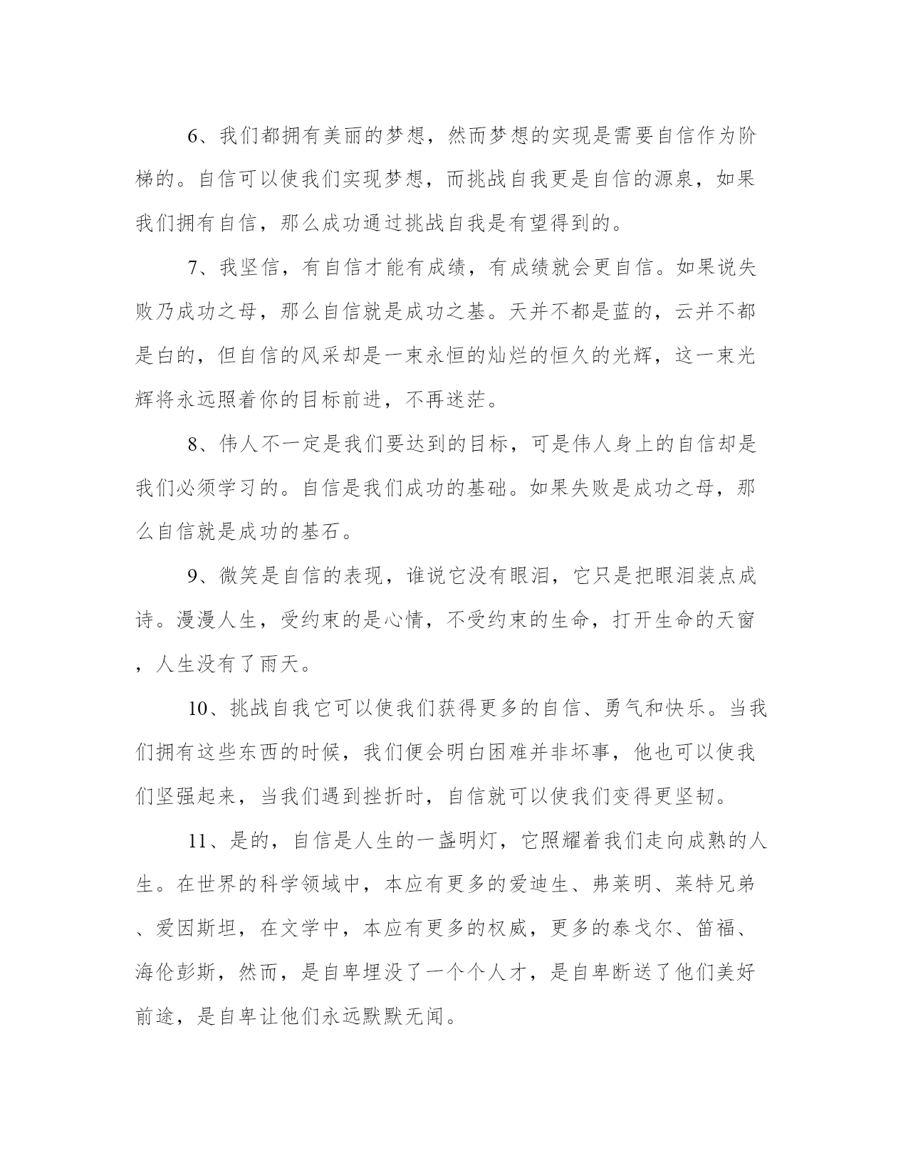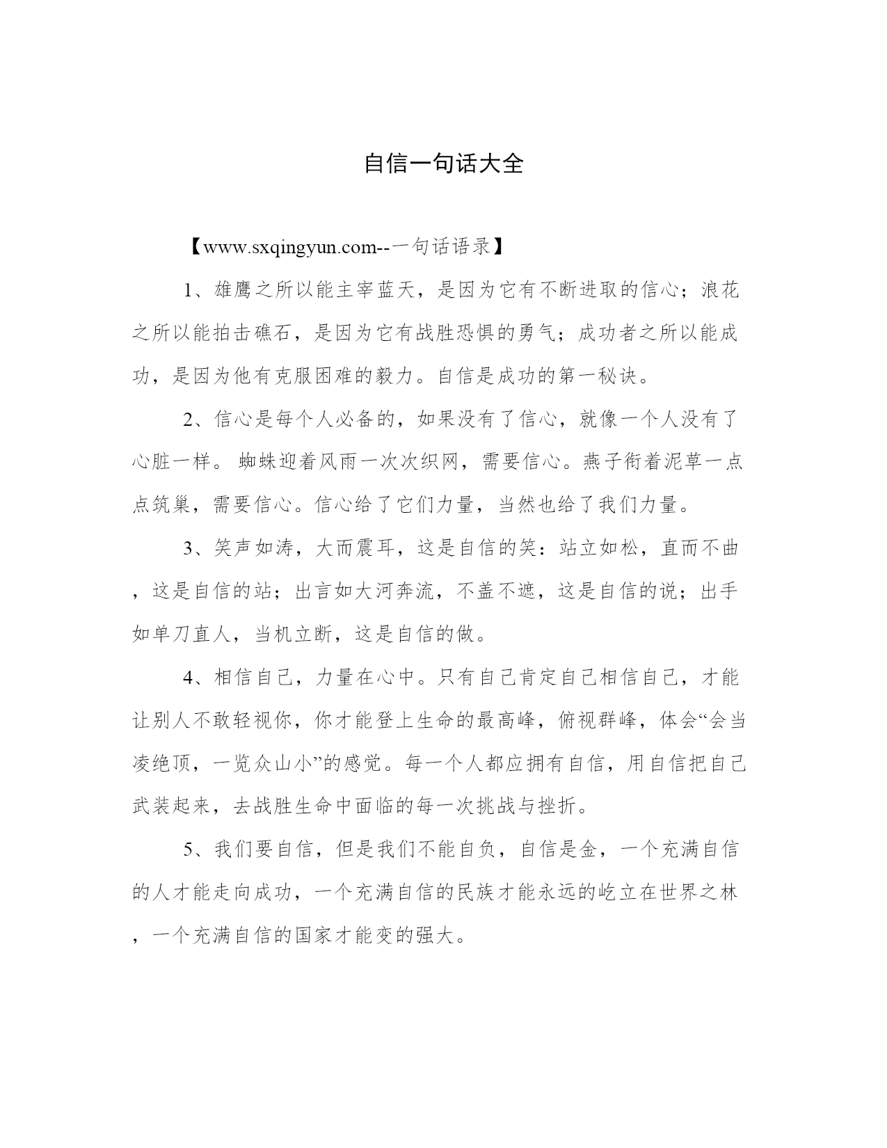自信一句话大全【www.sxqingyun.com--一句话语录】1、雄鹰之所以能主宰蓝天,是因为它有不断进取的信心;浪花之所以能拍击礁石,是因为它有战胜恐惧的勇气;成功者之所以能成功,是因为他有克服困难的毅力。自信是成功的第一秘诀。2、信心是每个人必备的,如果没有了信心,就像一个人没有了心脏一样。蜘蛛迎着风雨一次次织网,需要信心。燕子衔着泥草一点点筑巢,需要信心。信心给了它们力量,当然也给了我们力量。3、笑声如涛,大而震耳,这是自信的笑:站立如松,直而不曲,这是自信的站;出言如大河奔流,不盖不遮,这是自信的说;出手如单刀直人,当机立断,这是自信的做。4、相信自己,力量在心中。只有自己肯定自己相信自己,才能让别人不敢轻视你,你才能登上生命的最高峰,俯视群峰,体会“会当凌绝顶,一览众山小”的感觉。每一个人都应拥有自信,用自信把自己武装起来,去战胜生命中面临的每一次挑战与挫折。5、我们要自信,但是我们不能自负,自信是金,一个充满自信的人才能走向成功,一个充满自信的民族才能永远的屹立在世界之林,一个充满自信的国家才能变的强大。6、我们都拥有美丽的梦想,然而梦想的实现是需要自信作为阶梯的。自信可以使我们实现梦想,而挑战自我更是自信的源泉,如果我们拥有自信,那么成功通过挑战自我是有望得到的。7、我坚信,有自信才能有成绩,有成绩就会更自信。如果说失败乃成功之母,那么自信就是成功之基。天并不都是蓝的,云并不都是白的,但自信的风采却是一束永恒的灿烂的恒久的光辉,这一束光辉将永远照着你的目标前进,不再迷茫。8、伟人不一定是我们要达到的目标,可是伟人身上的自信却是我们必须学习的。自信是我们成功的基础。如果失败是成功之母,那么自信就是成功的基石。9、微笑是自信的表现,谁说它没有眼泪,它只是把眼泪装点成诗。漫漫人生,受约束的是心情,不受约束的生命,打开生命的天窗,人生没有了雨天。10、挑战自我它可以使我们获得更多的自信、勇气和快乐。当我们拥有这些东西的时候,我们便会明白困难并非坏事,他也可以使我们坚强起来,当我们遇到挫折时,自信就可以使我们变得更坚韧。11、是的,自信是人生的一盏明灯,它照耀着我们走向成熟的人生。在世界的科学领域中,本应有更多的爱迪生、弗莱明、莱特兄弟、爱因斯坦,在文学中,本应有更多的权威,更多的泰戈尔、笛福、海伦彭斯,然而,是自卑埋没了一个个人才,是自卑断送了他们美好前途,是自卑让他们永远默默无闻。12、诗圣杜甫告诉我们,自信是“会当凌绝顶,一览众山小”的气魄;诗仙李白告诉我们,自信是“天生我材必有用,千金散尽还复来”的豪情;毛主席告诉我们,自信是“自信人生二百年,会当击水三千里”的壮志。只有拥有自信,你才能斩断畏惧与恐惧,迎来成功的曙光。