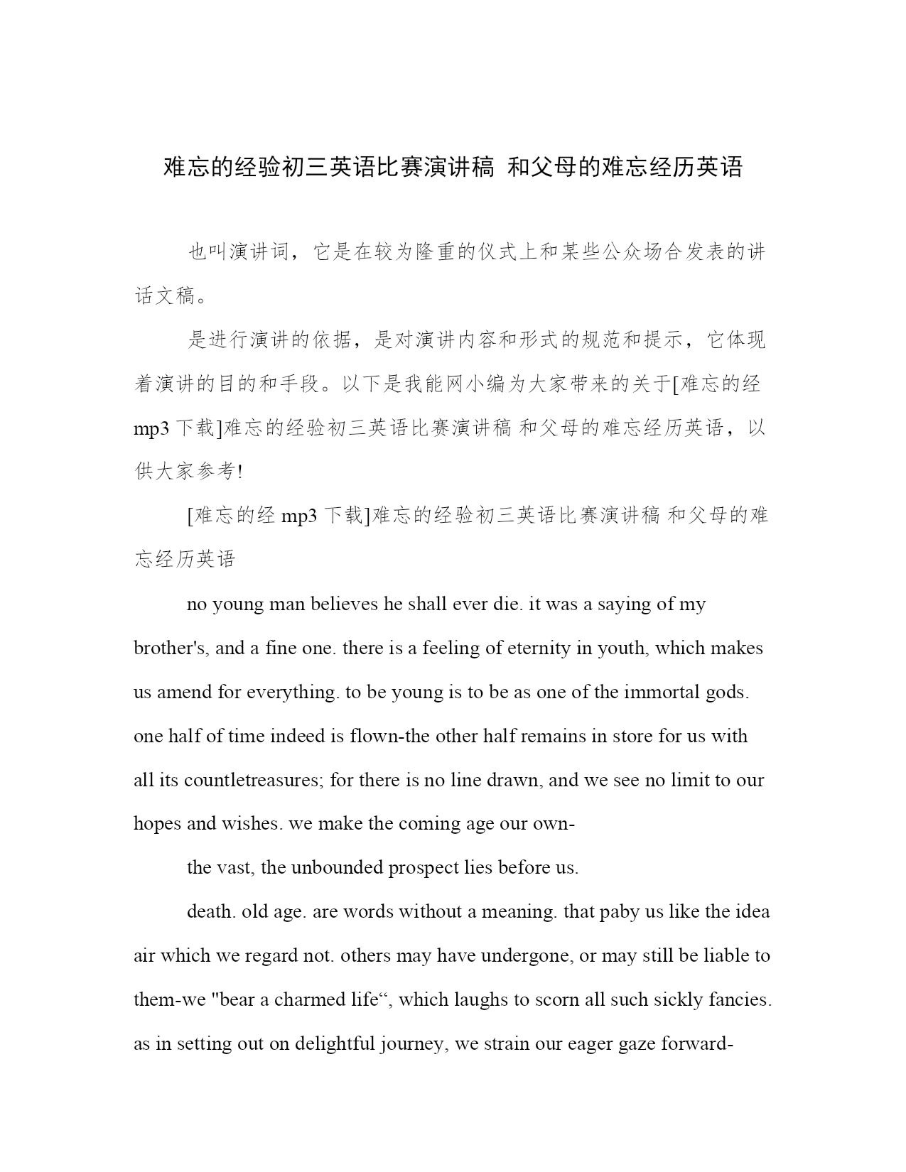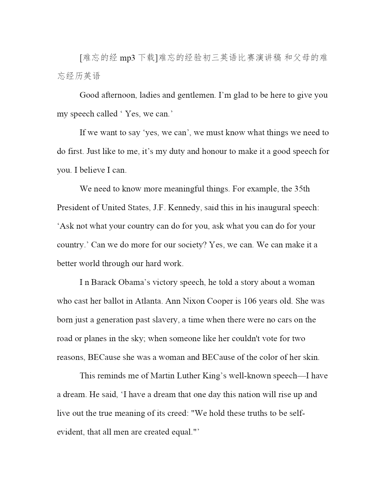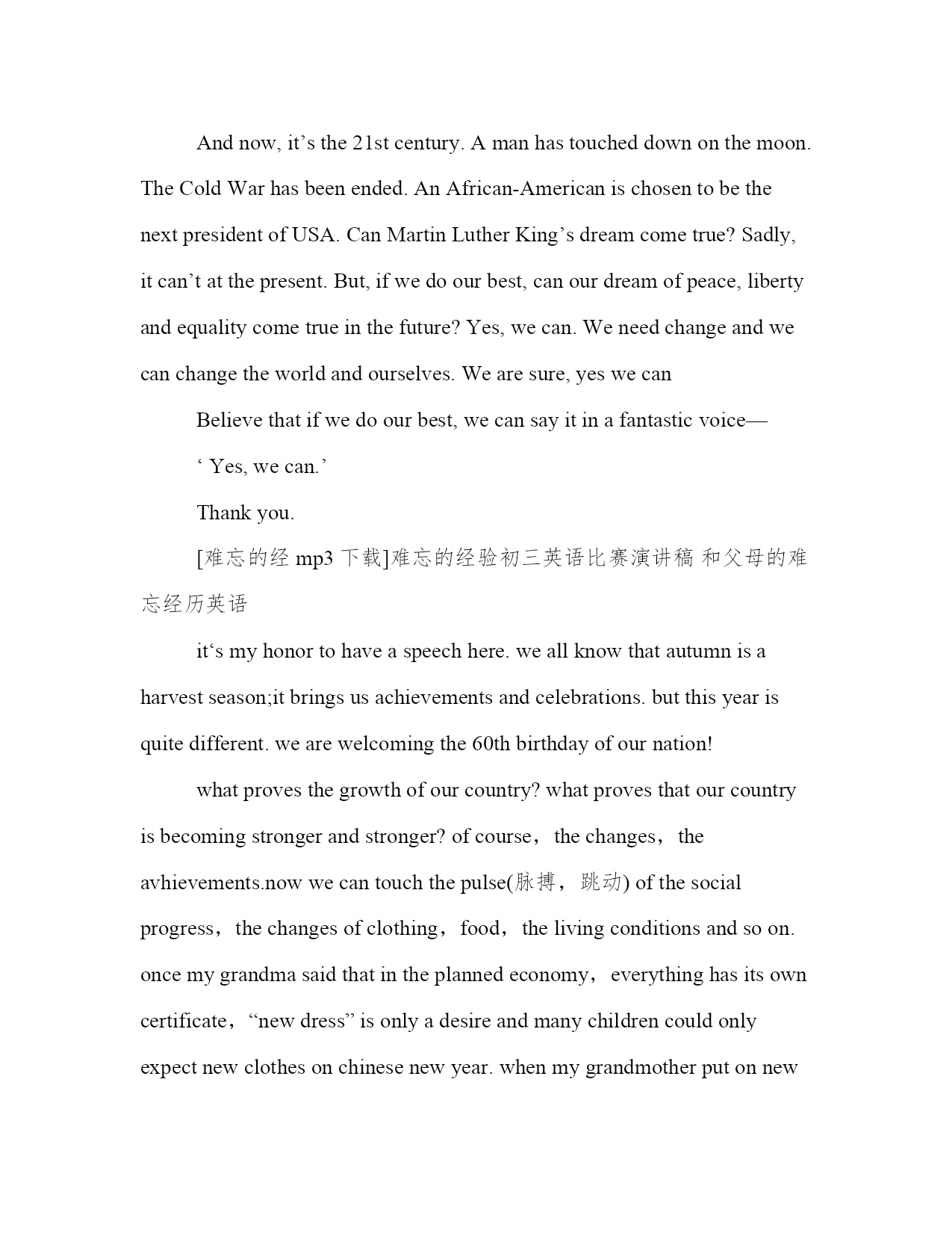难忘的经验初三英语比赛演讲稿和父母的难忘经历英语也叫演讲词,它是在较为隆重的仪式上和某些公众场合发表的讲话文稿。是进行演讲的依据,是对演讲内容和形式的规范和提示,它体现着演讲的目的和手段。以下是我能网小编为大家带来的关于[难忘的经mp3下载]难忘的经验初三英语比赛演讲稿和父母的难忘经历英语,以供大家参考![难忘的经mp3下载]难忘的经验初三英语比赛演讲稿和父母的难忘经历英语noyoungmanbelievesheshalleverdie.itwasasayingofmybrother's,andafineone.thereisafeelingofeternityinyouth,whichmakesusamendforeverything.tobeyoungistobeasoneoftheimmortalgods.onehalfoftimeindeedisflown-theotherhalfremainsinstoreforuswithallitscountletreasures;forthereisnolinedrawn,andweseenolimittoourhopesandwishes.wemakethecomingageourown-thevast,theunboundedprospectliesbeforeus.death.oldage.arewordswithoutameaning.thatpabyusliketheideaairwhichweregardnot.othersmayhaveundergone,ormaystillbeliabletothem-we"bearacharmedlife“,whichlaughstoscornallsuchsicklyfancies.asinsettingoutondelightfuljourney,westrainoureagergazeforward-biddingthelovelyscenesatdistancehail!andseenoendtothelandscape,newobjectspresentingthemselvesasweadvance;so,inthecommencementoflife,wesetnoboundstoourinclinations.nortotheuestrictedopportunitiesofgratifyingthem.wehaveasyetfoundnoobstacle,nodispositiontoflag;anditseemsthatwecangoonsoforever.welookroundinanewworld,fulloflife,andmotion,andceaseleprogress;andfeelinourselvesallthevigorandspirittokeeppacewithit,anddonotforeseefromanypresentsymptomshowweshallbeleftbehindinthenaturalcourseofthings,declineintooldage,anddropintothegrave.itisthesimplicity,andasitwereabstractedneofourfeelingsinyouth,that(sotospeak)identifiesuswithnature,and(ourexperiencebeingslightandourpassionsstrong)deludesusintoabeliefofbeingimmortallikeit.ourshort-livesconnectionwithexistencewefondlyflatterourselves,isanindissolubleandlastingunion-ahoneymoonthatknowsneithercoldness,jar,norseparation.asinfantssmileandsleep,wearerockedinthecradleofourwaywardfancies,andlulledintosecuritybytheroaroftheuniversearoundus0wequaffthecupoflifewitheagerhastewithoutdrainingit,insteadofwhichitonlyoverflowsthemore-objectsprearoundus,fillingthemindwiththeirmagnitudeandwiththestrongofdesiresthatwaituponthem,sothatwehaveno