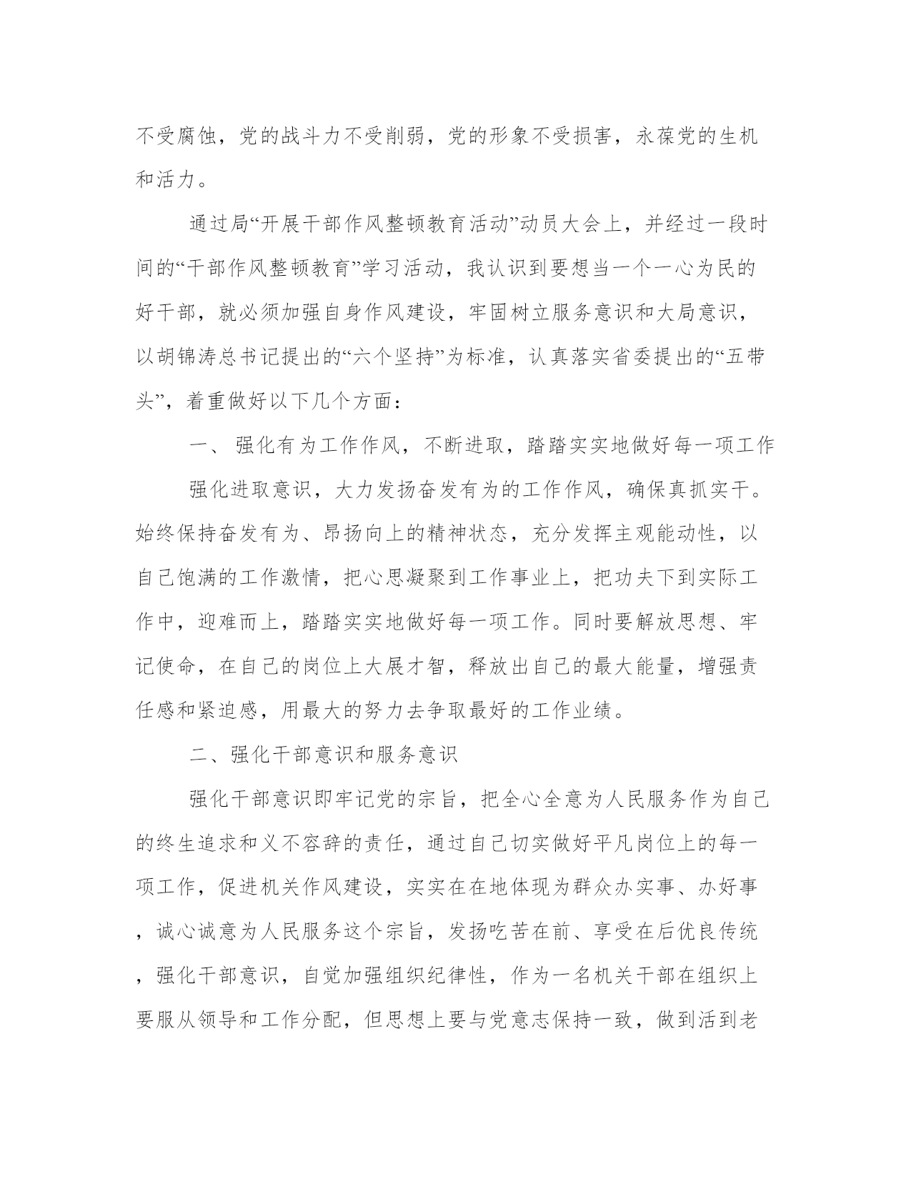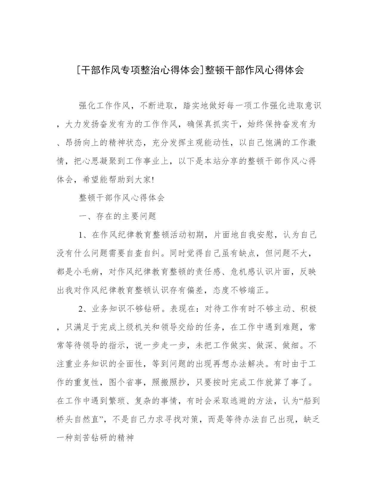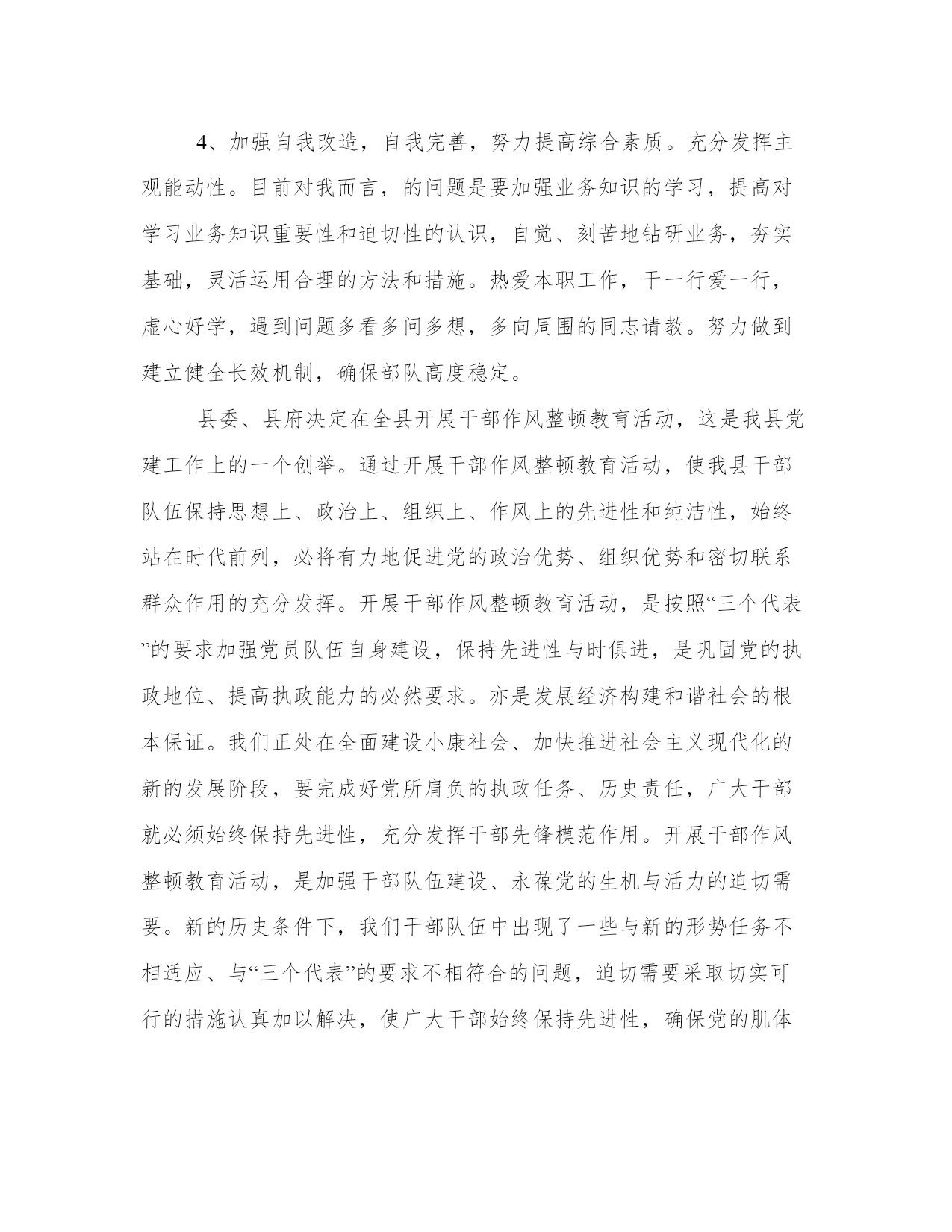 [干部作风专项整治心得体会]整顿干部作风心得体会强化工作作风,不断进取,踏实地做好每一项工作强化进取意识,大力发扬奋发有为的工作作风,确保真抓实干,始终保持奋发有为、昂扬向上的精神状态,充分发挥主观能动性,以自己饱满的工作激情,把心思凝聚到工作事业上,以下是本站分享的整顿干部作风心得体会,希望能帮助到大家!整顿干部作风心得体会一、存在的主要问题1、在作风纪律教育整顿活动初期,片面地自我安慰,认为自己没有什么问题需要自查自纠。同时觉得自己虽有缺点,但问题不大,都是小毛病,对作风纪律教育整顿的责任感、危机感认识片面,反映出我对作风纪律教育整顿认识存有偏差,态度不够端正。2、业务知识不够钻研。表现在:对待工作有时不够主动、积极,只满足于完成上级机关和领导交给的任务,在工作中遇到难题,常常等待领导的指示,说一步走一步,未把工作做实、做深、做细。不注重业务知识的全面性,等到问题的出现再想办法解决。有时由于工作的重复性,图个省事,照搬照抄,只要按时完成工作就算了事了。在工作中遇到繁琐、复杂的事情,有时会采取逃避的方法,认为“船到桥头自然直”,不是自己力求寻找对策,而是等待办法自己出现,缺乏一种刻苦钻研的精神3、在日常生活中,有时错误地强化自身的管人者角色,耍特权的现象偶有发生。如以前非执行任务时冲红灯、闯禁行,这些都是特权意识错位的具体表现。4、自身存在最严重的问题就是急躁的心理,在工作任务繁重或者复杂的情况下容易产生焦躁、心烦意乱的情绪,这样会导致工作中出现重大失误。二、存在问题的主要原因上述这些问题的存在,虽然有一定的客观因素,但更主要的还是主观因素所造成。在这段时间,自已结合理论学习,对自身存在的主要问题和不足也多次进行认真反思,深刻剖析产生这些问题的根源与危害,从主观上查找原因,概括起来主要有以下几个方面:1、政治学习不够,理论基础浅薄,平时只满足于读书、看报,参加单位集中组织的学习多,自学少,特别是对“三个代表”的重要思想没有深刻地领会,钻研不够,联系实际不够,使自己对理论知识的理解与实际脱钩,没有发挥理论的指导作用,只是为了学习而学习,使学习变得形式化、教条化,因而不能准确把握形势。2、业务水平不高,不够钻研,没有深刻意识到业务水平的高低对工作效率和质量起决定性作用,业务水平要有提高,必需要对业务钻研,而自己在业务方面存有依赖性,认为领导会有指示,我不用先急着干,害怕自己先做做不好。而且自己尚未有一整套学习业务知识的计划,故在开展工作中有时比较盲目,缺乏一定自信。3、工作方法简单,只安于表面,把自己份内的事做好就可以了,处理事情方法比较简单,没有创新精神,工作作风还不够扎实,对问题不作深层次的分析,思考不深刻,有时把工作作为负担,未注意到工作方法的完善会给自己的工作带来动力。三、今后的整改措施1、加强政治理论学习,不断提高自身的政治素质。纪律教育学习是终身的事情,任何时候都不能放松。今后我不仅要学条令条例,五条禁令,更要认真学习“三个代表”的重要思想等科学理论,精读有关重点文章,及时学习领会党的文件精神,用知识武装自己的头脑,提高自己的修养,坚定自己的政治信念。进一步增强纪律观念,增强纪律意识,树立正确世界观、人生观、价值观,自觉地加强党性煅炼,遵纪守法,廉洁奉公,做到自重、自省、自警、自励。以高度的责任感、事业心,以勤勤恳恳、扎扎实实的作风,以百折不饶、知难而进的勇气完成党和人民交给的各项任务。2、要积极开拓进取,提高工作水平。要不断加强学习,加强锻炼,努力提高自己办案的本领;要讲究方法,注重实际,加强自己工作能力和修养;要开拓创新,积极进取,把工作提高到一个新的水平。3、随时随地的将“五条禁令”、“法纪教育”印在自己的心上,表现在行动上。明确自己的身份,告诉自己什么可以做,什么不能做,彻底改正自己的毛病,以严谨的态度对待工作,对待每一个人。4、加强自我改造,自我完善,努力提高综合素质。充分发挥主观能动性。目前对我而言,的问题是要加强业务知识的学习,提高对学习业务知识重要性和迫切性的认识,自觉、刻苦地钻研业务,夯实基础,灵活运用合理的方法和措施。热爱本职工作,干一行爱一行,虚心好学,遇到问题多看多问多想,多向周围的同志请教。努力做到建立健全长效机制,确保部队高度稳定。县委、县府决定在全县开展干部作风整顿教育活动,这是我县党建工作上的一个创举。通过开展干部作风整顿教育活动,使我县干部队伍保持思想上、政治上、组织上、作风上的先进性和纯洁性,始终站在时代前列,必将有力地促进党的政治优势、组织优势和密切联系群众作用的充分发挥。开展干部作风整顿教育活动,是按照“三个代表”的要求加强党员队伍自身建设,保持先进性与时俱进,是巩固党的执政地位、提高执政能力的必然要求。亦是发展经济构建和谐社会的根本保证。我们正处在全面建设小康社会、加快推进社