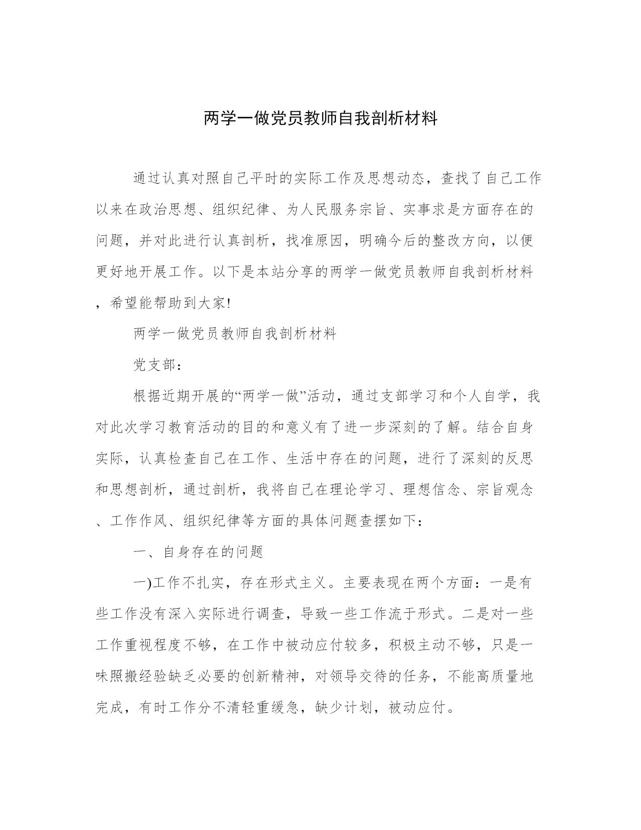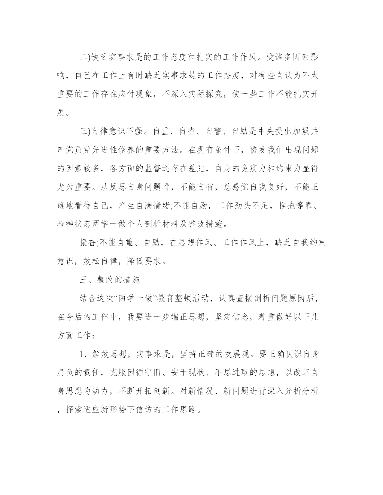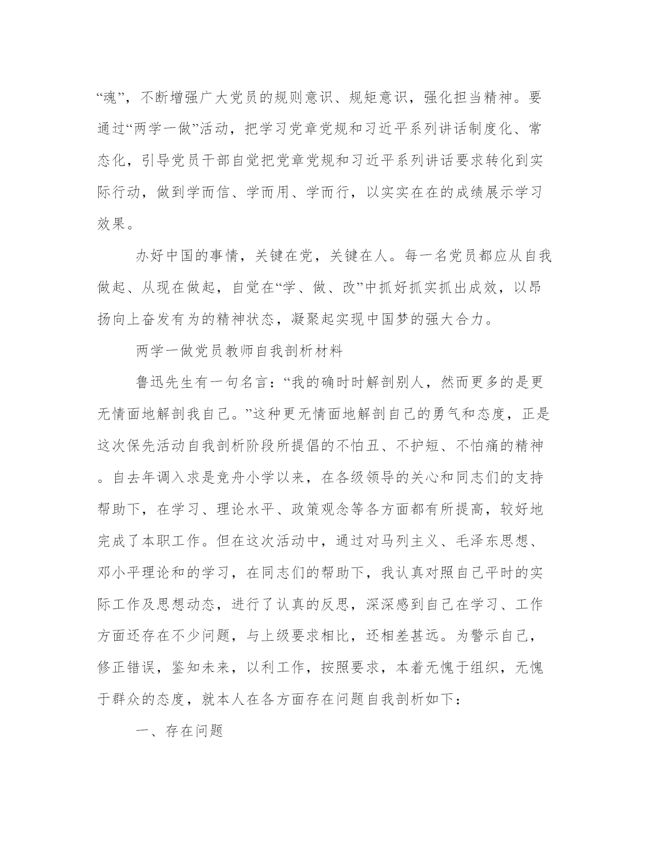 两学一做党员教师自我剖析材料通过认真对照自己平时的实际工作及思想动态,查找了自己工作以来在政治思想、组织纪律、为人民服务宗旨、实事求是方面存在的问题,并对此进行认真剖析,找准原因,明确今后的整改方向,以便更好地开展工作。以下是本站分享的两学一做党员教师自我剖析材料,希望能帮助到大家!两学一做党员教师自我剖析材料党支部:根据近期开展的“两学一做”活动,通过支部学习和个人自学,我对此次学习教育活动的目的和意义有了进一步深刻的了解。结合自身实际,认真检查自己在工作、生活中存在的问题,进行了深刻的反思和思想剖析,通过剖析,我将自己在理论学习、理想信念、宗旨观念、工作作风、组织纪律等方面的具体问题查摆如下:一、自身存在的问题一)工作不扎实,存在形式主义。主要表现在两个方面:一是有些工作没有深入实际进行调查,导致一些工作流于形式。二是对一些工作重视程度不够,在工作中被动应付较多,积极主动不够,只是一味照搬经验缺乏必要的创新精神,对领导交待的任务,不能高质量地完成,有时工作分不清轻重缓急,缺少计划,被动应付。二)思想作风、学风怠慢。存在一些不合时宜的观念、做法,没能及时适应环境和形势的变化而改进工作方法。对于新问题、新情况分析不深入、不具体。特别是在新情况下,对于如何解放思想、实事求是地做好涉法涉诉信访工作方面分析的不够。自己对学习特别是新业务知识学习有所松懈,有一些不思进取的苗头,总认为自己所掌握的知识够用了,对新颁布的相关法律法规不求甚解。三)理想信念不够坚定,缺乏政治敏感性和洞察力。政治理论学习不够,即使是单位组织的学习,有时也是蜻蜓点水,存在着重业务、轻学习的现象,对进一步提高自身知识水平有所松懈,在这种思想支配下,自己的理想信念不够坚定。二、原因分析一)忽视了理论知识学习,放松了主观世界的改造。政治思想的坚实,来源于深厚的思想理论基础,一个政治上合格的人,首先必须善于学习理论知识。反思自己存在的问题,深深感到学习和运用理论方面欠缺很大,特别是时刻运用马克思主义的立场、观点、方法分析解决实际问题还有差距。虽然在思想上也注重学习相关理论知识,但学习得不自觉,不主动,不系统,不扎实,浅尝辄止,零打碎敲。不注意加强对主观世界的改造,就难以更好地改造客观世界。在对自己问题剖析过程中,感到放松对主观世界的改造,特别是放松了对人生观、价值观、世界观的改造是淡化理想、信念和追求的一个重要原因。二)缺乏实事求是的工作态度和扎实的工作作风。受诸多因素影响,自己在工作上有时缺乏实事求是的工作态度,对有些自认为不太重要的工作存在应付现象,不深入实际探究,使一些工作不能扎实开展。三)自律意识不强。自重、自省、自警、自励是中央提出加强共产党员党先进性修养的重要方法。在现有条件下,诱发我们出现问题的因素较多,各方面的监督还存在差距,自身的免疫力和约束力显得尤为重要。从反思自身问题看,不能自省,总感觉自我良好,不能正确地看待自己,产生自满情绪;不能自励,工作劲头不足,推拖等靠、精神状态两学一做个人剖析材料及整改措施。振奋;不能自重、自励,在思想作风、工作作风上,缺乏自我约束意识,放松自律,降低要求。三、整改的措施结合这次“两学一做”教育整顿活动,认真查摆剖析问题原因后,在今后的工作中,我要进一步端正思想,坚定信念,着重做好以下几方面工作:1、解放思想,实事求是,坚持正确的发展观。要正确认识自身肩负的责任,克服因循守旧、安于现状、不思进取的思想,以改革自身思想为动力,不断开拓创新。对新情况、新问题进行深入分析分析,探索适应新形势下信访的工作思路。2、发扬深入细致、谦虚谨慎、戒骄戒躁的学风。自己要静下心,利用一切可以利用的时间,系统、深入地学习业务知识,将自己的业务水平在提高一个层次。3、进一步增强事业心和责任心,坚持科学态度和求实精神,兢兢业业地做好每一件事。坚持讲实话、做实事,力戒浮夸,埋头苦干。把抓落实作为推进各项工作的落脚点,想群众之所想、急群众之所急、谋群众之所求,扎扎实实解决好群众的后顾之忧。4、加强学习,提高自身修养。工作虽忙,但也应加强学习,时刻保持创新意识,牢固树立不断进取,不断超越自我的意识,脚踏实地,扎扎实实做好每一件小事,为老百姓交一份满意的答卷。两学一做党员教师自我剖析材料近日,中央决定在全党开展“学党章党规、学习总书记系列讲话,做合格党员”学习教育活动,这是继党的群众路线教育实践活动、“三严三实”专题教育之后,党中央再次重拳出击,在党风政风、激发党员党性方面发力,抓住党员干部这个“关键少数”,凝聚内在合力。要使“两学一做”学习教育真正“开花结果”达到理想的效果,各级党组织、全体党员干部还得从“抓实”做起。要抓实“学”这个基础。“知为行之始,学为用之先。”思想是行为的先导,党员干部作风好坏,关键在于思想认识。学,就是引导党员干部学党章、学党