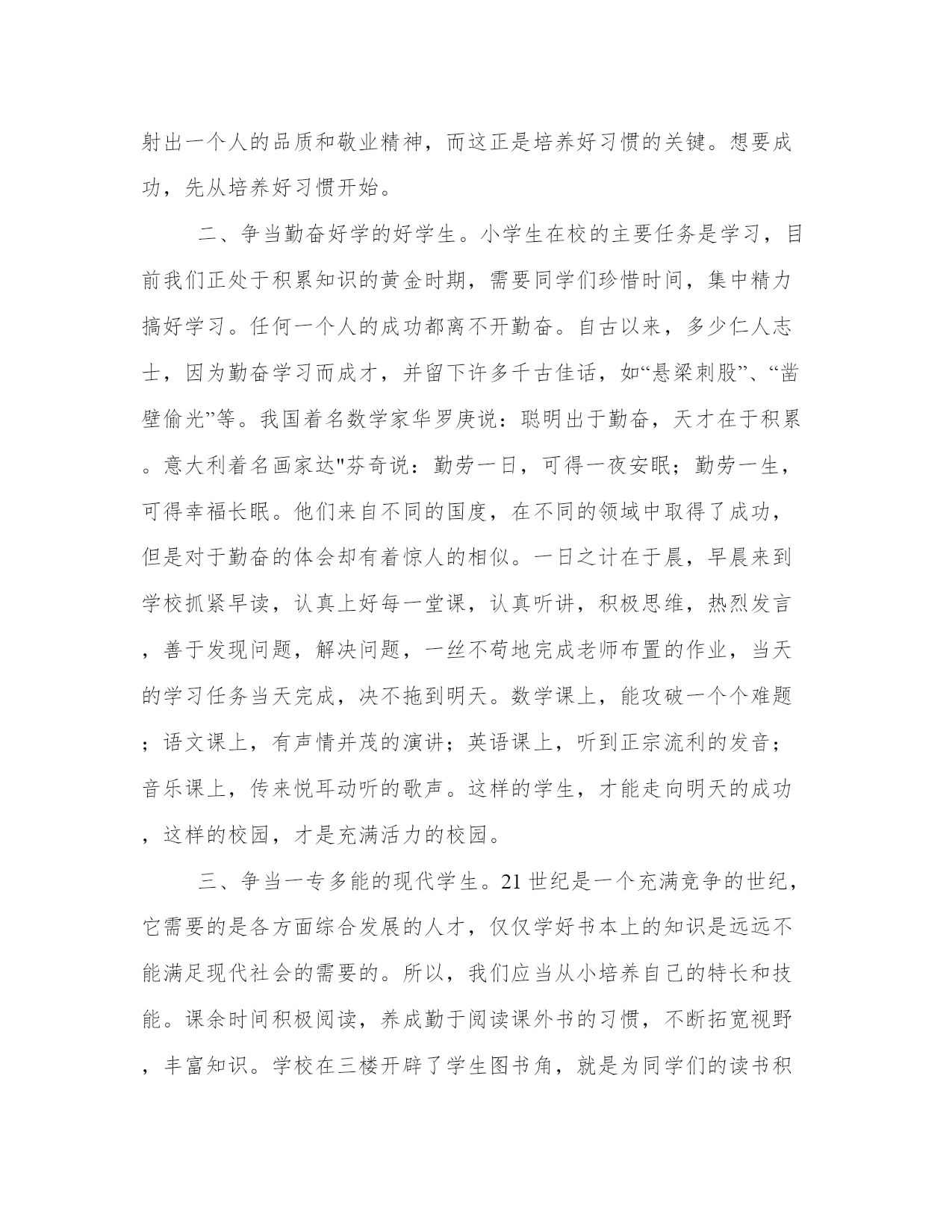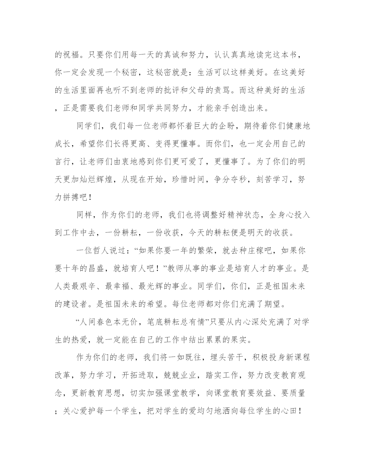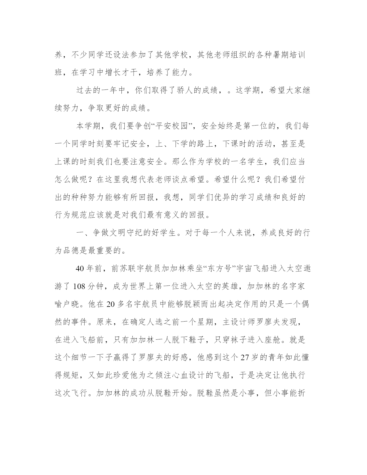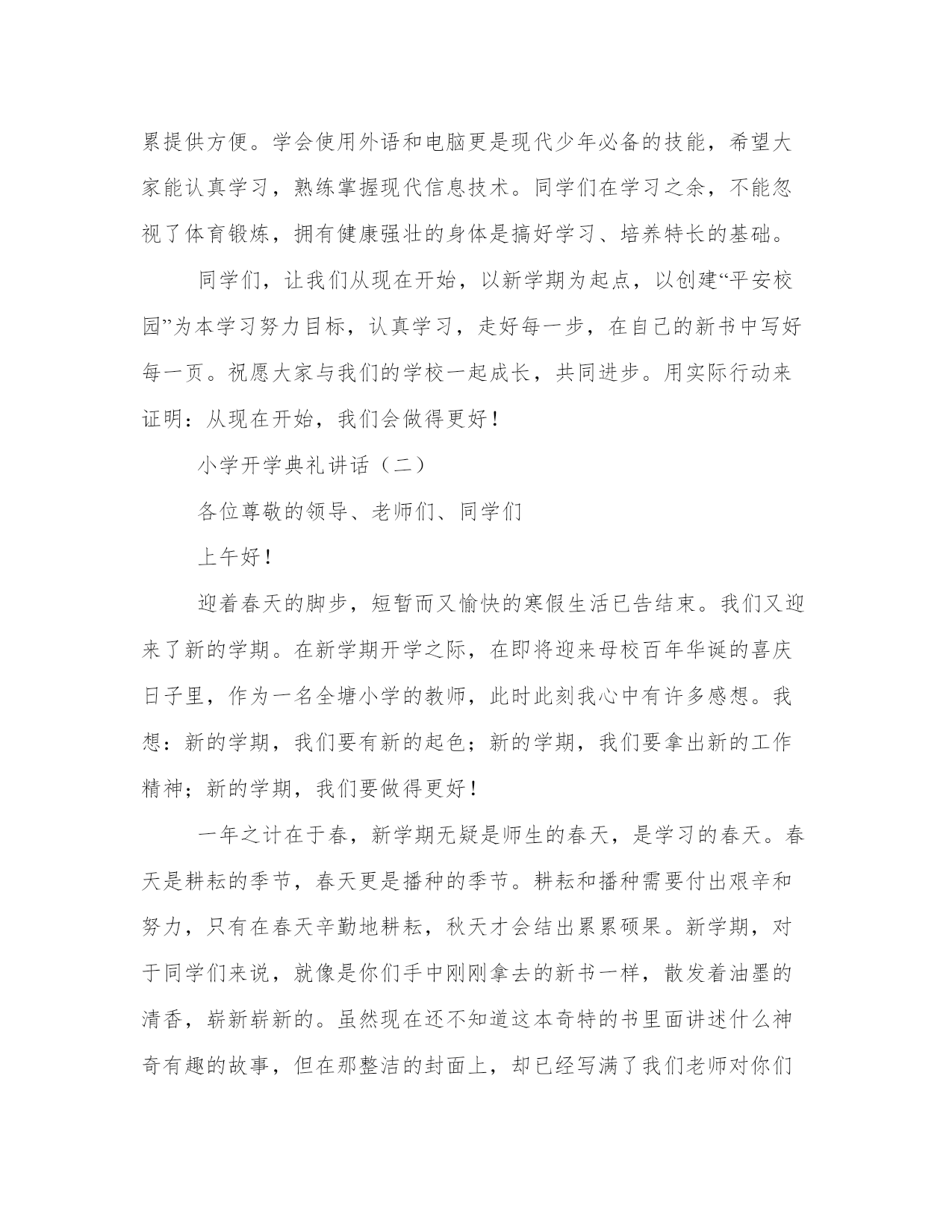 小学开学典礼讲话小学开学典礼讲话(一)同学们:我们又迎来了一个新的学年,开始了新的学习生活。对于每一位同学来说,新学期就像是刚刚翻开的一本新书,虽然现在还不知道书里面讲述的故事,但在那整洁的封面上,却分明写满了老师对你们的祝福,家长对你们的希望,还有你自己的愿望。而它的内容是空白的,等待你去书写。只要你肯努力,能坚持,认认真真地写完这本书,你一定会发现,原来进步就那么简单,无非就是坚持两个字,学习生活原来就是这样美好。到那时,你会特别地记起今天的时光。为了帮助你们写好这本书,开学前,学校里的十多位老师、员工,一直在做着精心的准备,制定计划、备课、学习研讨、打扫卫生、准备新书---就像以往一样,我们每一个人都怀着巨大的企盼期待着你们健康的成长,希望你们长得更高、变得更懂事、更聪明能干。而你们,也一定会用自己的言行,让老师们由衷地感到,重新出现在他们面前的学生更可爱了,更懂事了。暑假里,我们西山小学的食堂发生了一些变化。教室内的黑板全部变新的了,环境一天天在改善,学校一天天在发展。当然,我们同学也没有闲着,大家在家里认真地完成暑假作业,从课外书中吸取营养,不少同学还设法参加了其他学校,其他老师组织的各种暑期培训班,在学习中增长才干,培养了能力。过去的一年中,你们取得了骄人的成绩,。这学期,希望大家继续努力,争取更好的成绩。本学期,我们要争创“平安校园”,安全始终是第一位的,我们每一个同学时刻要牢记安全,上、下学的路上,下课时的活动,甚至是上课的时刻我们也要注意安全。那么作为学校的一名学生,我们应当怎么做呢?在这里我想代表老师谈点希望。希望什么呢?我们希望付出的种种努力能够有所回报,我想,同学们优异的学习成绩和良好的行为规范应该就是对我们最有意义的回报。一、争做文明守纪的好学生。对于每一个人来说,养成良好的行为品德是最重要的。40年前,前苏联宇航员加加林乘坐“东方号”宇宙飞船进入太空遨游了108分钟,成为世界上第一位进入太空的英雄,加加林的名字家喻户晓。他在20多名宇航员中能够脱颖而出起决定作用的只是一个偶然的事件。原来,在确定人选之前一个星期,主设计师罗廖夫发现,在进入飞船前,只有加加林一人脱下鞋子,只穿袜子进入座舱。就是这个细节一下子赢得了罗廖夫的好感,他感到这个27岁的青年如此懂得规矩,又如此珍爱他为之倾注心血设计的飞船,于是决定让他执行这次飞行。加加林的成功从脱鞋开始。脱鞋虽然是小事,但小事能折射出一个人的品质和敬业精神,而这正是培养好习惯的关键。想要成功,先从培养好习惯开始。二、争当勤奋好学的好学生。小学生在校的主要任务是学习,目前我们正处于积累知识的黄金时期,需要同学们珍惜时间,集中精力搞好学习。任何一个人的成功都离不开勤奋。自古以来,多少仁人志士,因为勤奋学习而成才,并留下许多千古佳话,如“悬梁刺股”、“凿壁偷光”等。我国着名数学家华罗庚说:聪明出于勤奋,天才在于积累。意大利着名画家达"芬奇说:勤劳一日,可得一夜安眠;勤劳一生,可得幸福长眠。他们来自不同的国度,在不同的领域中取得了成功,但是对于勤奋的体会却有着惊人的相似。一日之计在于晨,早晨来到学校抓紧早读,认真上好每一堂课,认真听讲,积极思维,热烈发言,善于发现问题,解决问题,一丝不苟地完成老师布置的作业,当天的学习任务当天完成,决不拖到明天。数学课上,能攻破一个个难题;语文课上,有声情并茂的演讲;英语课上,听到正宗流利的发音;音乐课上,传来悦耳动听的歌声。这样的学生,才能走向明天的成功,这样的校园,才是充满活力的校园。三、争当一专多能的现代学生。21世纪是一个充满竞争的世纪,它需要的是各方面综合发展的人才,仅仅学好书本上的知识是远远不能满足现代社会的需要的。所以,我们应当从小培养自己的特长和技能。课余时间积极阅读,养成勤于阅读课外书的习惯,不断拓宽视野,丰富知识。学校在三楼开辟了学生图书角,就是为同学们的读书积累提供方便。学会使用外语和电脑更是现代少年必备的技能,希望大家能认真学习,熟练掌握现代信息技术。同学们在学习之余,不能忽视了体育锻炼,拥有健康强壮的身体是搞好学习、培养特长的基础。同学们,让我们从现在开始,以新学期为起点,以创建“平安校园”为本学习努力目标,认真学习,走好每一步,在自己的新书中写好每一页。祝愿大家与我们的学校一起成长,共同进步。用实际行动来证明:从现在开始,我们会做得更好!小学开学典礼讲话(二)各位尊敬的领导、老师们、同学们上午好!迎着春天的脚步,短暂而又愉快的寒假生活已告结束。我们又迎来了新的学期。在新学期开学之际,在即将迎来母校百年华诞的喜庆日子里,作为一名全塘小学的教师,此时此刻我心中有许多感想。我想:新的学期,我们要有新的起色;新的学期,我们要拿出新的工作精神;新的学期,我们要做得更好!一年之计在于春,新学期无疑是师生的春天,是学习的