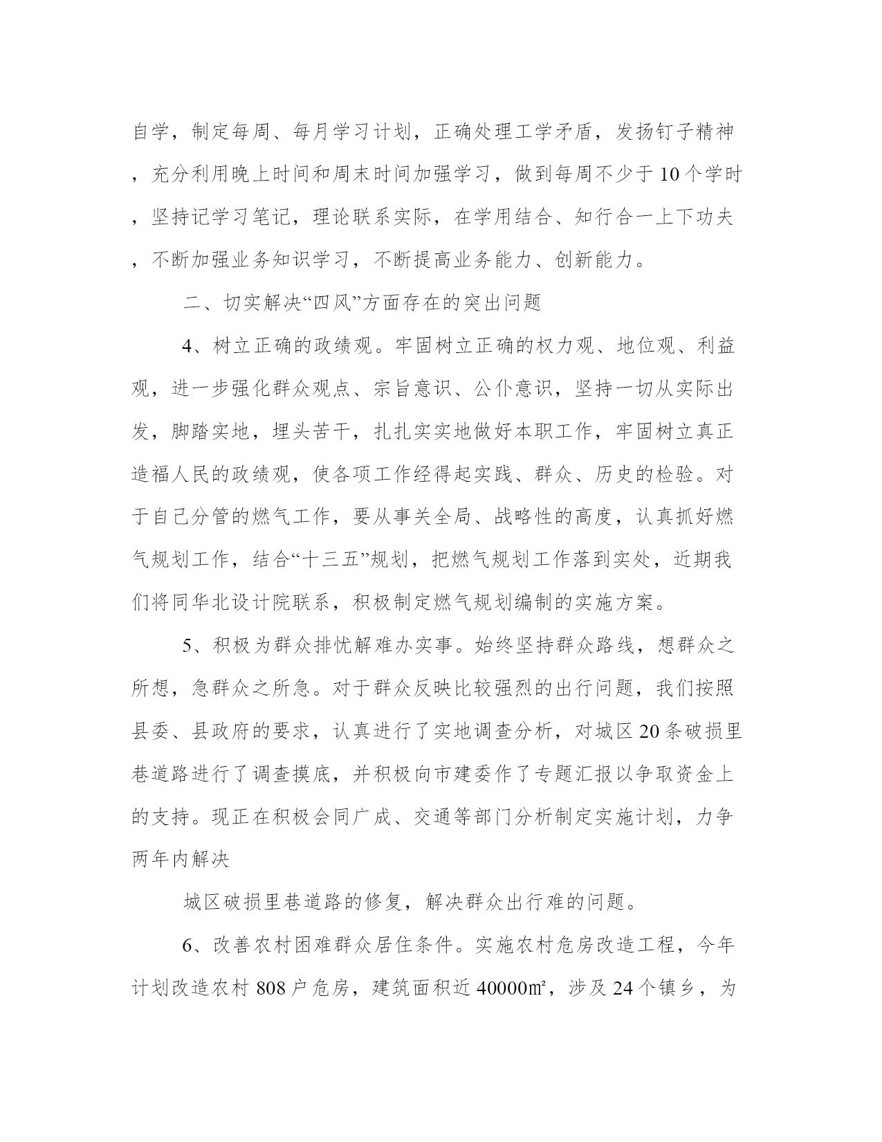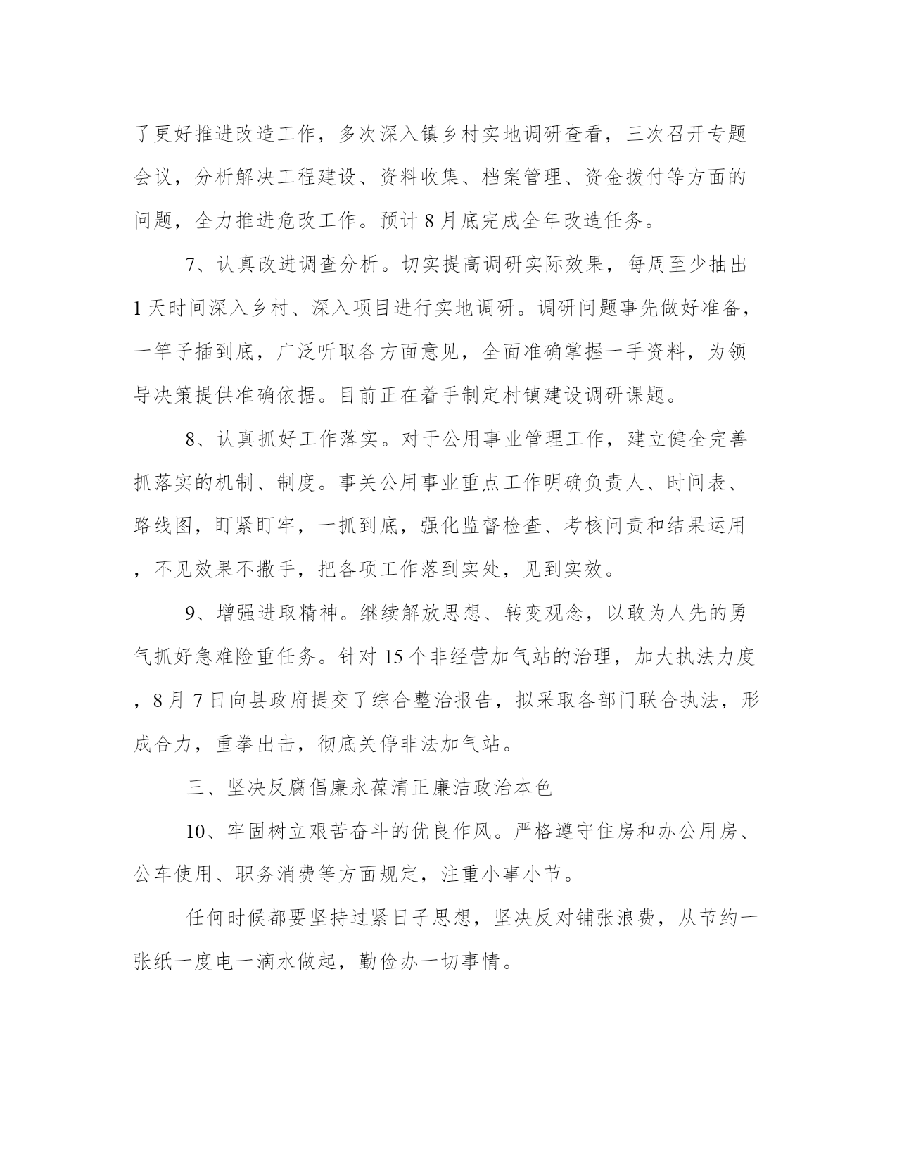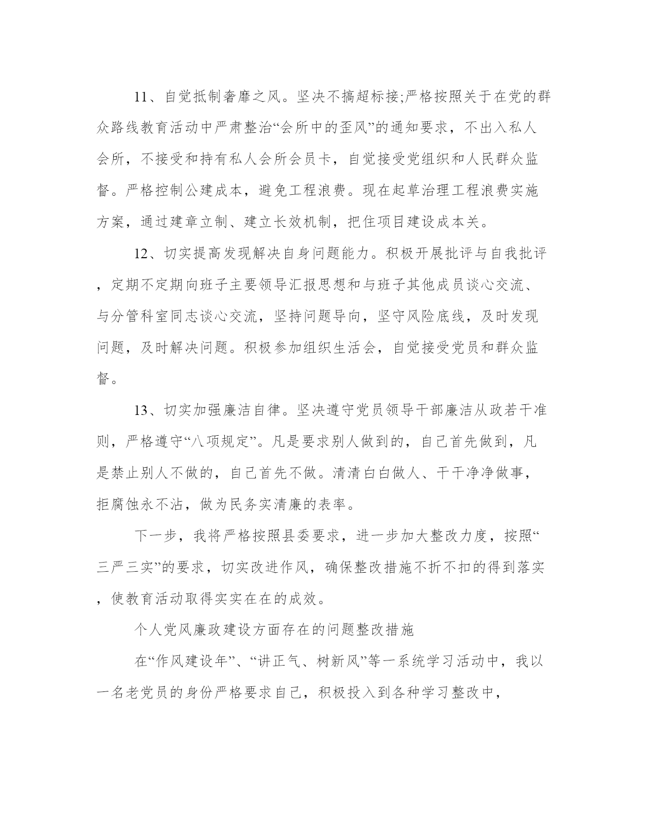 个人党风廉政建设方面存在的问题整改措施党风廉政建设工作方面存在形式主义,有文件不贯彻,工作蜻蜓点水、浮于表面,或只做表面文章,而不是深入基层、深入群众、深入工作第一线,本站为大家整理的相关的个人党风廉政建设方面存在的问题整改措施,供大家参考选择。个人党风廉政建设方面存在的问题整改措施根据工委、纪检部门的具体安排,我坚持以邓小平理论和“三个代表”重要思想为指导,按照上级关于加强党风廉政建设的指示,切实落实党风廉政建设职责制的各项要求,把党风廉政建设工作与本职工作“同部署、同落实、同检查、同考核、同奖惩”。现结合本人的实际将个人执行党风廉政建设状况总结如下:个人党风廉政建设方面存在的问题:整改措施:1、加强学习,不断提高思想认识,增强了自觉执行党风廉政规定的自觉性。认真学习邓小平理论和“三个代表”重要思想,学习有关廉政建设方面的规定政策。切实把为人民服务,致富一方作为自我的行动指南。按照上级纪检部门的有关要求,经常性的学习党纪法规和廉政建设的有关规定,学习中纪委提出的关于领导干部廉洁自律的“六项规定”、“四大纪律八项要求”。不断增强自律意识,提高自身思想修养,与党中央和上级持续一致,以此端正工作作风、生活作风。3、努力做好本职工作,用心配合主要领导做好工作。能够同工委、办事处一班人团结一致,密切配合,勤奋工作。真正做到该做的事情用心去做好,不该做的事情不去管闲事,该忙的忙,不该忙的不忙。廉洁自律,持续共产党员本色。总之,在抓党风廉政建设和个人廉洁自律方面,我严格执行了有关的制度规定,无一例不廉洁行为发生,取得了必须成绩。今后我要继续按照党风廉政建设职责制的要求,坚持不懈地抓好个人及所联系中心、办的党风廉政建设工作,力争工作再上一个台阶。个人党风廉政建设方面存在的问题整改措施按照XX的要求,认真对照个人“四风”方面存在的突出问题,结合谈心谈话、专题民主生活会上大家提的意见和建议,本着即知即改、立行立改的原则,制定如下整改措施。一、严格遵守党的政治纪律2、严格执行党的政治纪律。带头讲政治、讲党性、讲大局,不断增强政治敏锐性和政治鉴别力,认真贯彻党的路线、方针、政策,不折不扣贯彻中央决()策部署,在大是大非上头脑清醒,在路线原则上立场坚定,在重大问题上旗帜鲜明,坚决维护中央权威。刻把握“中国梦”的丰富内涵,用马克思主义的最新理论成果武装头脑、指导实践、推动工作。认真遵守学习制度,坚持集体学习与个人自学相结合,注重学习深度和学习效果。积极按时参加党委理论学习中心组集体学习,坚持多学习多思考,常联系实践。认真抓好个人自学,制定每周、每月学习计划,正确处理工学矛盾,发扬钉子精神,充分利用晚上时间和周末时间加强学习,做到每周不少于10个学时,坚持记学习笔记,理论联系实际,在学用结合、知行合一上下功夫,不断加强业务知识学习,不断提高业务能力、创新能力。二、切实解决“四风”方面存在的突出问题4、树立正确的政绩观。牢固树立正确的权力观、地位观、利益观,进一步强化群众观点、宗旨意识、公仆意识,坚持一切从实际出发,脚踏实地,埋头苦干,扎扎实实地做好本职工作,牢固树立真正造福人民的政绩观,使各项工作经得起实践、群众、历史的检验。对于自己分管的燃气工作,要从事关全局、战略性的高度,认真抓好燃气规划工作,结合“十三五”规划,把燃气规划工作落到实处,近期我们将同华北设计院联系,积极制定燃气规划编制的实施方案。5、积极为群众排忧解难办实事。始终坚持群众路线,想群众之所想,急群众之所急。对于群众反映比较强烈的出行问题,我们按照县委、县政府的要求,认真进行了实地调查分析,对城区20条破损里巷道路进行了调查摸底,并积极向市建委作了专题汇报以争取资金上的支持。现正在积极会同广成、交通等部门分析制定实施计划,力争两年内解决城区破损里巷道路的修复,解决群众出行难的问题。6、改善农村困难群众居住条件。实施农村危房改造工程,今年计划改造农村808户危房,建筑面积近40000㎡,涉及24个镇乡,为了更好推进改造工作,多次深入镇乡村实地调研查看,三次召开专题会议,分析解决工程建设、资料收集、档案管理、资金拨付等方面的问题,全力推进危改工作。预计8月底完成全年改造任务。7、认真改进调查分析。切实提高调研实际效果,每周至少抽出1天时间深入乡村、深入项目进行实地调研。调研问题事先做好准备,一竿子插到底,广泛听取各方面意见,全面准确掌握一手资料,为领导决策提供准确依据。目前正在着手制定村镇建设调研课题。8、认真抓好工作落实。对于公用事业管理工作,建立健全完善抓落实的机制、制度。事关公用事业重点工作明确负责人、时间表、路线图,盯紧盯牢,一抓到底,强化监督检查、考核问责和结果运用,不见效果不撒手,把各项工作落到实处,见到实效。9、增强进取精神。继续解放思想、转变观念,以敢为人先的勇气抓好急难险重