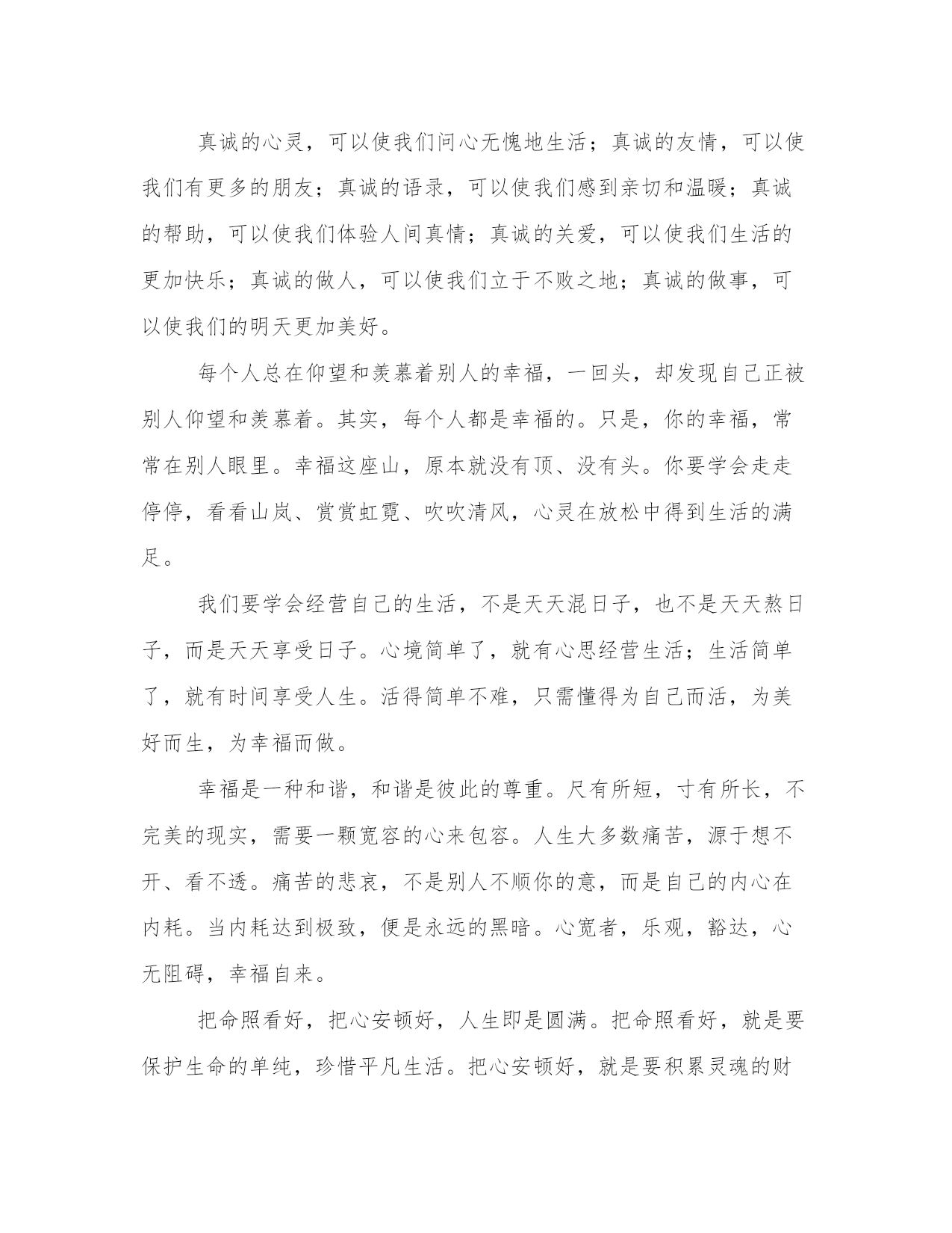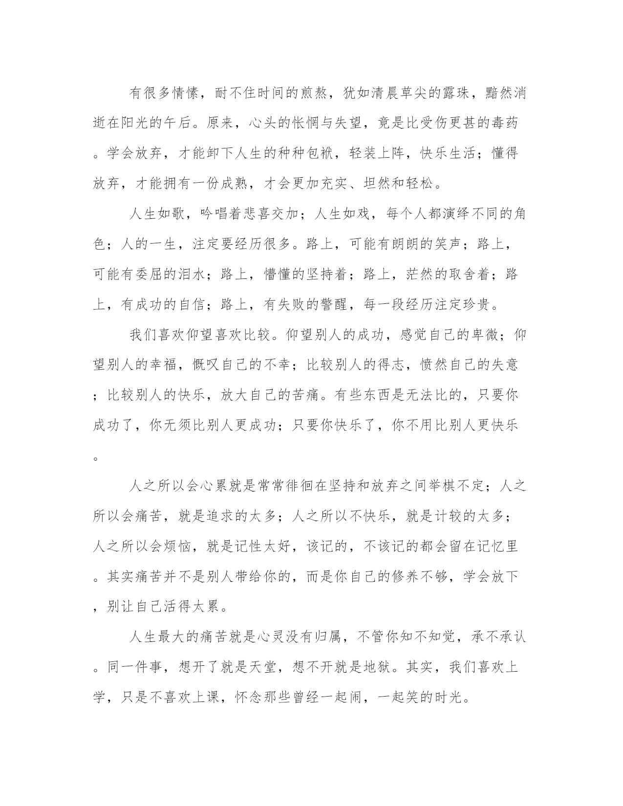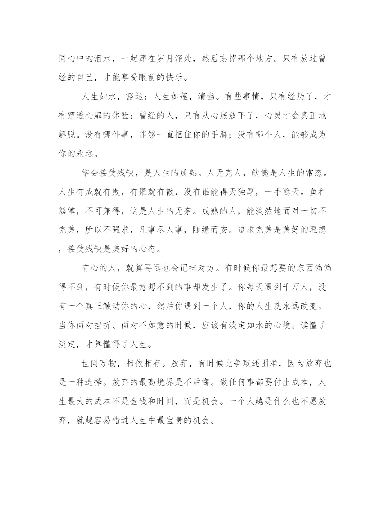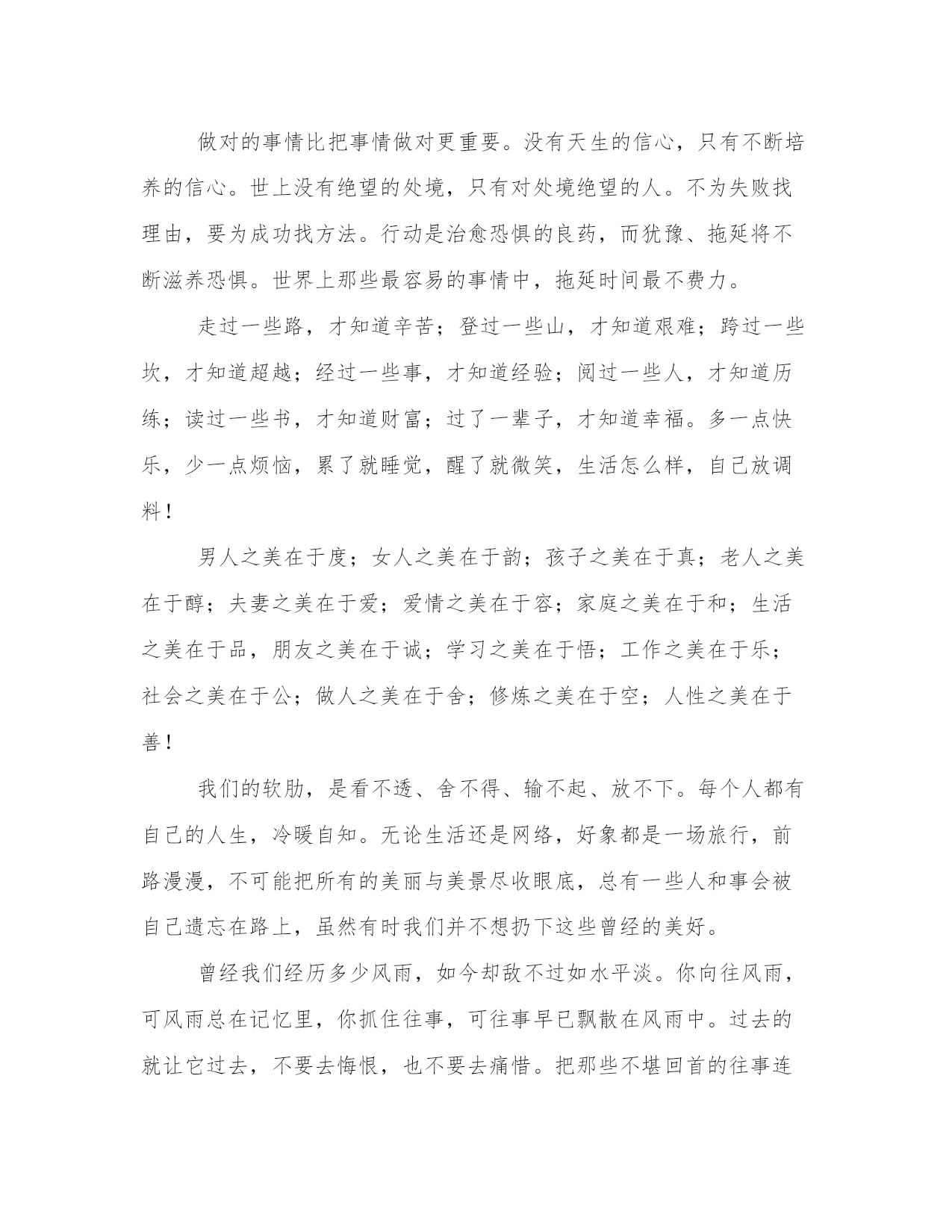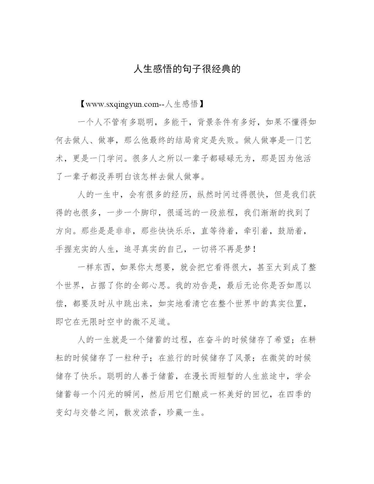 人生感悟的句子很经典的【www.sxqingyun.com--人生感悟】一个人不管有多聪明,多能干,背景条件有多好,如果不懂得如何去做人、做事,那么他最终的结局肯定是失败。做人做事是一门艺术,更是一门学问。很多人之所以一辈子都碌碌无为,那是因为他活了一辈子都没弄明白该怎样去做人做事。人的一生中,会有很多的经历,纵然时间过得很快,但是我们获得的也很多,一步一个脚印,很遥远的一段旅程,我们渐渐的找到了方向。那些是是非非,那些快快乐乐,直等待着,牵引着,鼓励着,手握充实的人生,追寻真实的自己,一切将不再是梦!一样东西,如果你太想要,就会把它看得很大,甚至大到成了整个世界,占据了你的全部心思。我的劝告是,最后无论你是否如愿以偿,都要及时从中跳出来,如实地看清它在整个世界中的真实位置,即它在无限时空中的微不足道。人的一生就是一个储蓄的过程,在奋斗的时候储存了希望;在耕耘的时候储存了一粒种子;在旅行的时候储存了风景;在微笑的时候储存了快乐。聪明的人善于储蓄,在漫长而短暂的人生旅途中,学会储蓄每一个闪光的瞬间,然后用它们酿成一杯美好的回忆,在四季的变幻与交替之间,散发浓香,珍藏一生。做对的事情比把事情做对更重要。没有天生的信心,只有不断培养的信心。世上没有绝望的处境,只有对处境绝望的人。不为失败找理由,要为成功找方法。行动是治愈恐惧的良药,而犹豫、拖延将不断滋养恐惧。世界上那些最容易的事情中,拖延时间最不费力。走过一些路,才知道辛苦;登过一些山,才知道艰难;跨过一些坎,才知道超越;经过一些事,才知道经验;阅过一些人,才知道历练;读过一些书,才知道财富;过了一辈子,才知道幸福。多一点快乐,少一点烦恼,累了就睡觉,醒了就微笑,生活怎么样,自己放调料!男人之美在于度;女人之美在于韵;孩子之美在于真;老人之美在于醇;夫妻之美在于爱;爱情之美在于容;家庭之美在于和;生活之美在于品,朋友之美在于诚;学习之美在于悟;工作之美在于乐;社会之美在于公;做人之美在于舍;修炼之美在于空;人性之美在于善!我们的软肋,是看不透、舍不得、输不起、放不下。每个人都有自己的人生,冷暖自知。无论生活还是网络,好象都是一场旅行,前路漫漫,不可能把所有的美丽与美景尽收眼底,总有一些人和事会被自己遗忘在路上,虽然有时我们并不想扔下这些曾经的美好。曾经我们经历多少风雨,如今却敌不过如水平淡。你向往风雨,可风雨总在记忆里,你抓住往事,可往事早已飘散在风雨中。过去的就让它过去,不要去悔恨,也不要去痛惜。把那些不堪回首的往事连同心中的泪水,一起葬在岁月深处,然后忘掉那个地方。只有放过曾经的自己,才能享受眼前的快乐。人生如水,豁达;人生如莲,清幽。有些事情,只有经历了,才有穿透心扉的体验;曾经的人,只有从心底放下了,心灵才会真正地解脱。没有哪件事,能够一直捆住你的手脚;没有哪个人,能够成为你的永远。学会接受残缺,是人生的成熟。人无完人,缺憾是人生的常态。人生有成就有败,有聚就有散,没有谁能得天独厚,一手遮天。鱼和熊掌,不可兼得,这是人生的无奈。成熟的人,能淡然地面对一切不完美,所以不强求,凡事尽人事,随缘而安。追求完美是美好的理想,接受残缺是美好的心态。有心的人,就算再远也会记挂对方。有时候你最想要的东西偏偏得不到,有时候你最意想不到的事却发生了。你每天遇到千万人,没有一个真正触动你的心,然后你遇到一个人,你的人生就永远改变。当你面对挫折、面对不如意的时候,应该有淡定如水的心境。读懂了淡定,才算懂得了人生。世间万物,相依相存。放弃,有时候比争取还困难,因为放弃也是一种选择。放弃的最高境界是不后悔。做任何事都要付出成本,人生最大的成本不是金钱和时间,而是机会。一个人越是什么也不愿放弃,就越容易错过人生中最宝贵的机会。有很多情愫,耐不住时间的煎熬,犹如清晨草尖的露珠,黯然消逝在阳光的午后。原来,心头的怅惘与失望,竟是比受伤更甚的毒药。学会放弃,才能卸下人生的种种包袱,轻装上阵,快乐生活;懂得放弃,才能拥有一份成熟,才会更加充实、坦然和轻松。人生如歌,吟唱着悲喜交加;人生如戏,每个人都演绎不同的角色;人的一生,注定要经历很多。路上,可能有朗朗的笑声;路上,可能有委屈的泪水;路上,懵懂的坚持着;路上,茫然的取舍着;路上,有成功的自信;路上,有失败的警醒,每一段经历注定珍贵。我们喜欢仰望喜欢比较。仰望别人的成功,感觉自己的卑微;仰望别人的幸福,慨叹自己的不幸;比较别人的得志,愤然自己的失意;比较别人的快乐,放大自己的苦痛。有些东西是无法比的,只要你成功了,你无须比别人更成功;只要你快乐了,你不用比别人更快乐。人之所以会心累就是常常徘徊在坚持和放弃之间举棋不定;人之所以会痛苦,就是追求的太多;人之所以不快乐,就是计较的太多;人之所以会烦恼,就是记性太好,该记的,不该记的都会留在记忆里。其实痛苦并不是别