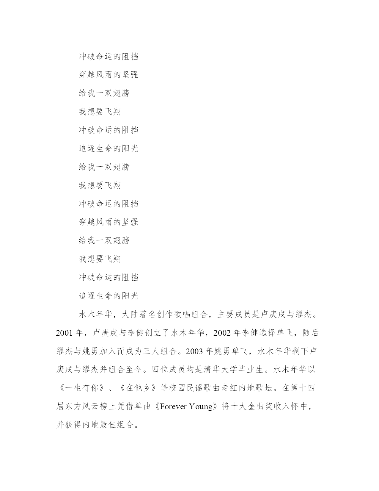 水木年华励志歌曲:给我一双翅膀【www.sxqingyun.com--励志歌曲】夕阳伴我走过孤独的山岗山脚下炊烟里是生我的地方多少次梦中离开我的村庄醒来只看到妈妈憔悴的脸庞给我一双翅膀我想要飞翔冲破命运的阻挡穿越风雨的坚强给我一双翅膀我想要飞翔冲破命运的阻挡追逐生命的阳光第一次踏进这低矮的学堂他让我的生活变得不一样推开窗世界就在你的身旁为梦想我愿付出全部的力量给我一双翅膀我想要飞翔冲破命运的阻挡穿越风雨的坚强给我一双翅膀我想要飞翔冲破命运的阻挡追逐生命的阳光给我一双翅膀我想要飞翔冲破命运的阻挡穿越风雨的坚强给我一双翅膀我想要飞翔冲破命运的阻挡追逐生命的阳光水木年华,大陆著名创作歌唱组合,主要成员是卢庚戌与缪杰。2001年,卢庚戌与李健创立了水木年华,2002年李健选择单飞,随后缪杰与姚勇加入而成为三人组合。2003年姚勇单飞,水木年华剩下卢庚戌与缪杰并组合至今。四位成员均是清华大学毕业生。水木年华以《一生有你》、《在他乡》等校园民谣歌曲走红内地歌坛。在第十四届东方风云榜上凭借单曲《ForeverYoung》将十大金曲奖收入怀中,并获得内地最佳组合。
