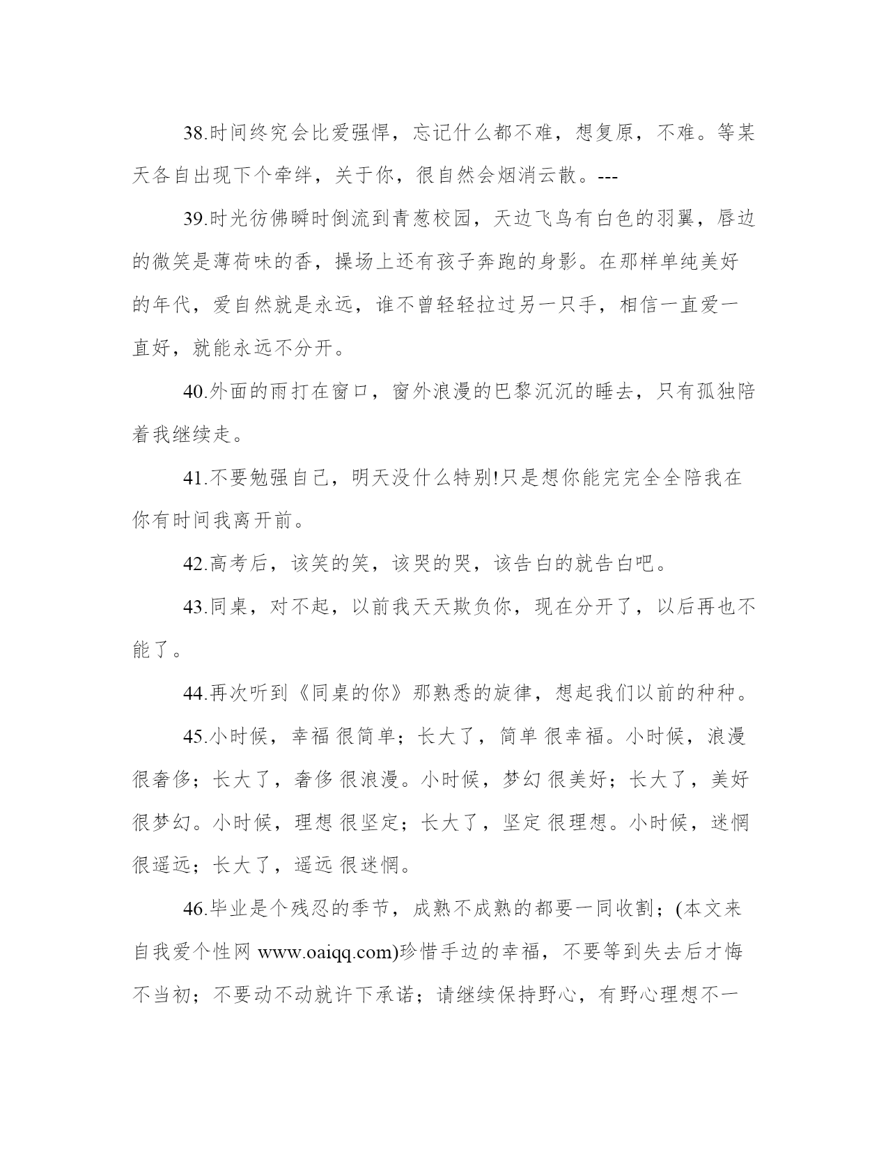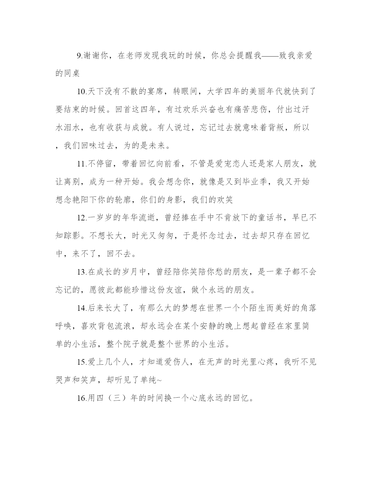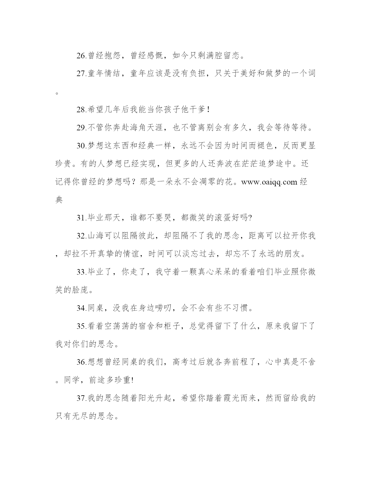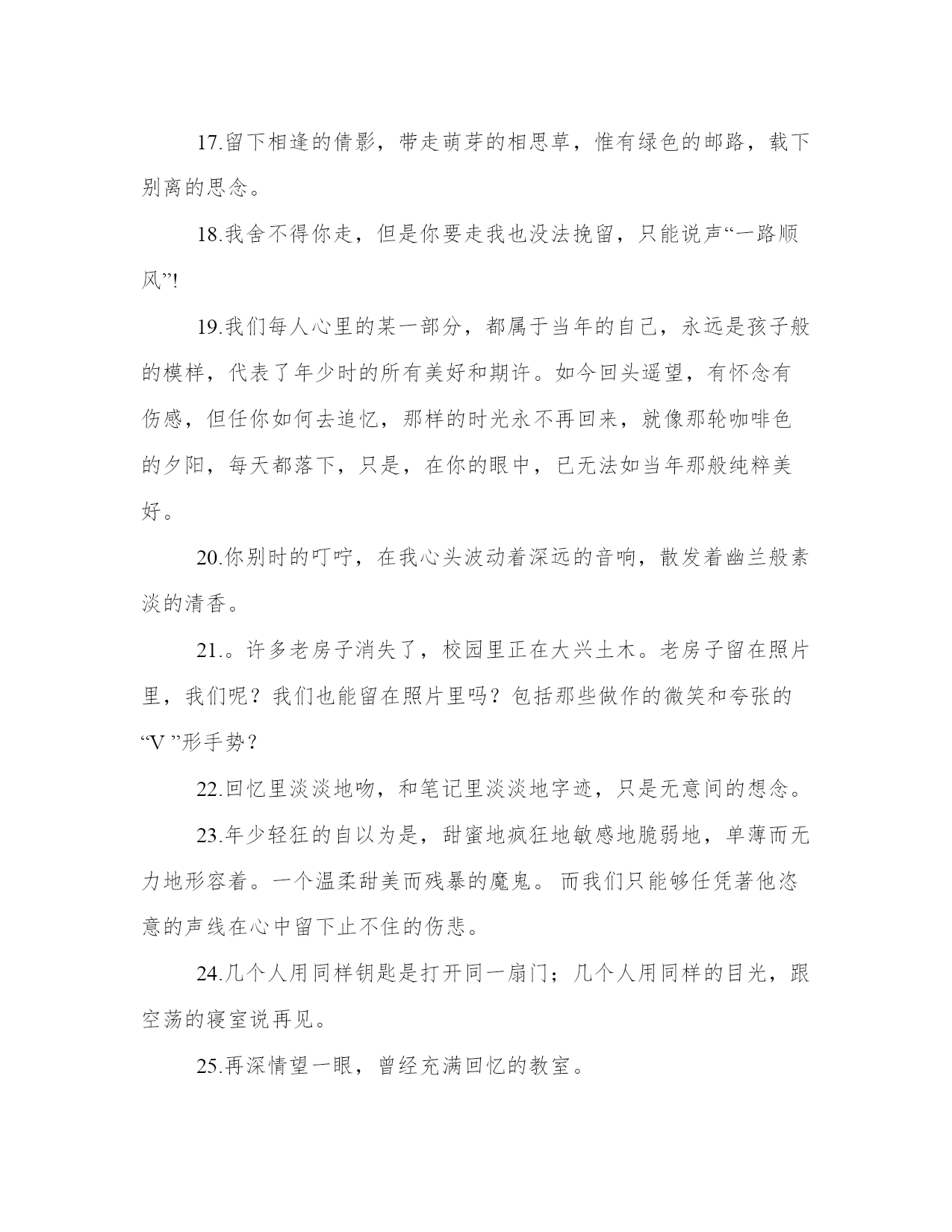 那些年一起走过的青春毕业季语录100句精选【www.sxqingyun.com--爱情语录】毕业季语录大全:1.两年,很短,让我们看不出自己已经长大;两年,很长,让我们看着她绽放光芒。那个唱歌去旅行的女孩,在喜欢她的人心中,游历到现在,美妙的声音穿透一束束绿光锁进心的镜头2.吵架也好,斗嘴也好,开心也好,出气也好,你永远是我心中最好的死党。3.在我们相聚的日子里,有着最珍惜的情谊,在我们年轻的岁月中,有着最真挚的相知,这份缘值得我们珍惜。4.无尽的人海中,我们相聚又分离;但愿我们的友谊冲破时空,随岁月不断增长。5.就算是拼尽全力,我也不会轻言放弃,因为有个傻瓜,一直在等我。6.用四(三)年的时间换一个心底永远的回忆。7.我也并不是总舍不得你走,只是总想看见你的笑容,听你的笑声。8.想说的很多。可是这样的时刻,这样的场合,能留给你的,只有我的默默的祈祷:珍重啊,朋友!9.谢谢你,在老师发现我玩的时候,你总会提醒我——致我亲爱的同桌10.天下没有不散的宴席,转眼间,大学四年的美丽年代就快到了要结束的时候。回首这四年,有过欢乐兴奋也有痛苦悲伤,付出过汗水泪水,也有收获与成就。有人说过,忘记过去就意味着背叛,所以,我们回味过去,为的是未来。11.不停留,带着回忆向前看,不管是爱宠恋人还是家人朋友,就让离别,成为一种开始。我会想念你,就像是又到毕业季,我又开始想念艳阳下你的轮廓,你们的身影,我们的欢笑12.一岁岁的年华流逝,曾经捧在手中不肯放下的童话书,早已不知踪影。不想长大,时光又匆匆,于是怀念过去,过去却只存在回忆中,来不了,回不去。13.在成长的岁月中,曾经陪你笑陪你愁的朋友,是一辈子都不会忘记的,愿彼此都能珍惜这份友谊,做个永远的朋友。14.后来长大了,有那么大的梦想在世界一个个陌生而美好的角落呼唤,喜欢背包流浪,却永远会在某个安静的晚上想起曾经在家里简单的小生活,整个院子就是整个世界的小生活。15.爱上几个人,才知道爱伤人,在无声的时光里心疼,我听不见哭声和笑声,却听见了单纯~16.用四(三)年的时间换一个心底永远的回忆。17.留下相逢的倩影,带走萌芽的相思草,惟有绿色的邮路,载下别离的思念。18.我舍不得你走,但是你要走我也没法挽留,只能说声“一路顺风”!19.我们每人心里的某一部分,都属于当年的自己,永远是孩子般的模样,代表了年少时的所有美好和期许。如今回头遥望,有怀念有伤感,但任你如何去追忆,那样的时光永不再回来,就像那轮咖啡色的夕阳,每天都落下,只是,在你的眼中,已无法如当年那般纯粹美好。20.你别时的叮咛,在我心头波动着深远的音响,散发着幽兰般素淡的清香。21.。许多老房子消失了,校园里正在大兴土木。老房子留在照片里,我们呢?我们也能留在照片里吗?包括那些做作的微笑和夸张的“V”形手势?22.回忆里淡淡地吻,和笔记里淡淡地字迹,只是无意间的想念。23.年少轻狂的自以为是,甜蜜地疯狂地敏感地脆弱地,单薄而无力地形容着。一个温柔甜美而残暴的魔鬼。而我们只能够任凭著他恣意的声线在心中留下止不住的伤悲。24.几个人用同样钥匙是打开同一扇门;几个人用同样的目光,跟空荡的寝室说再见。25.再深情望一眼,曾经充满回忆的教室。26.曾经抱怨,曾经感慨,如今只剩满腔留恋。27.童年情结,童年应该是没有负担,只关于美好和做梦的一个词。28.希望几年后我能当你孩子他干爹!29.不管你奔赴海角天涯,也不管离别会有多久,我会等待等待。30.梦想这东西和经典一样,永远不会因为时间而褪色,反而更显珍贵。有的人梦想已经实现,但更多的人还奔波在茫茫追梦途中。还记得你曾经的梦想吗?那是一朵永不会凋零的花。www.oaiqq.com经典31.毕业那天,谁都不要哭,都微笑的滚蛋好吗?32.山海可以阻隔彼此,却阻隔不了我的思念,距离可以拉开你我,却拉不开真挚的情谊,时间可以淡忘过去,却忘不了永远的朋友。33.毕业了,你走了,我守着一颗真心呆呆的看着咱们毕业照你微笑的脸庞。34.同桌,没我在身边唠叨,会不会有些不习惯。35.看着空荡荡的宿舍和柜子,总觉得留下了什么,原来我留下了我对你们的思念。36.想想曾经同桌的我们,高考过后就各奔前程了,心中真是不舍。同学,前途多珍重!37.我的思念随着阳光升起,希望你踏着霞光而来,然而留给我的只有无尽的思念。38.时间终究会比爱强悍,忘记什么都不难,想复原,不难。等某天各自出现下个牵绊,关于你,很自然会烟消云散。---39.时光彷佛瞬时倒流到青葱校园,天边飞鸟有白色的羽翼,唇边的微笑是薄荷味的香,操场上还有孩子奔跑的身影。在那样单纯美好的年代,爱自然就是永远,谁不曾轻轻拉过另一只手,相信一直爱一直好,就能永远不分开。40.外面的雨打在窗口,窗外浪漫的巴黎沉沉的睡去,只有孤独陪着我继续走。41.不要勉强自己,明天没什么特别!