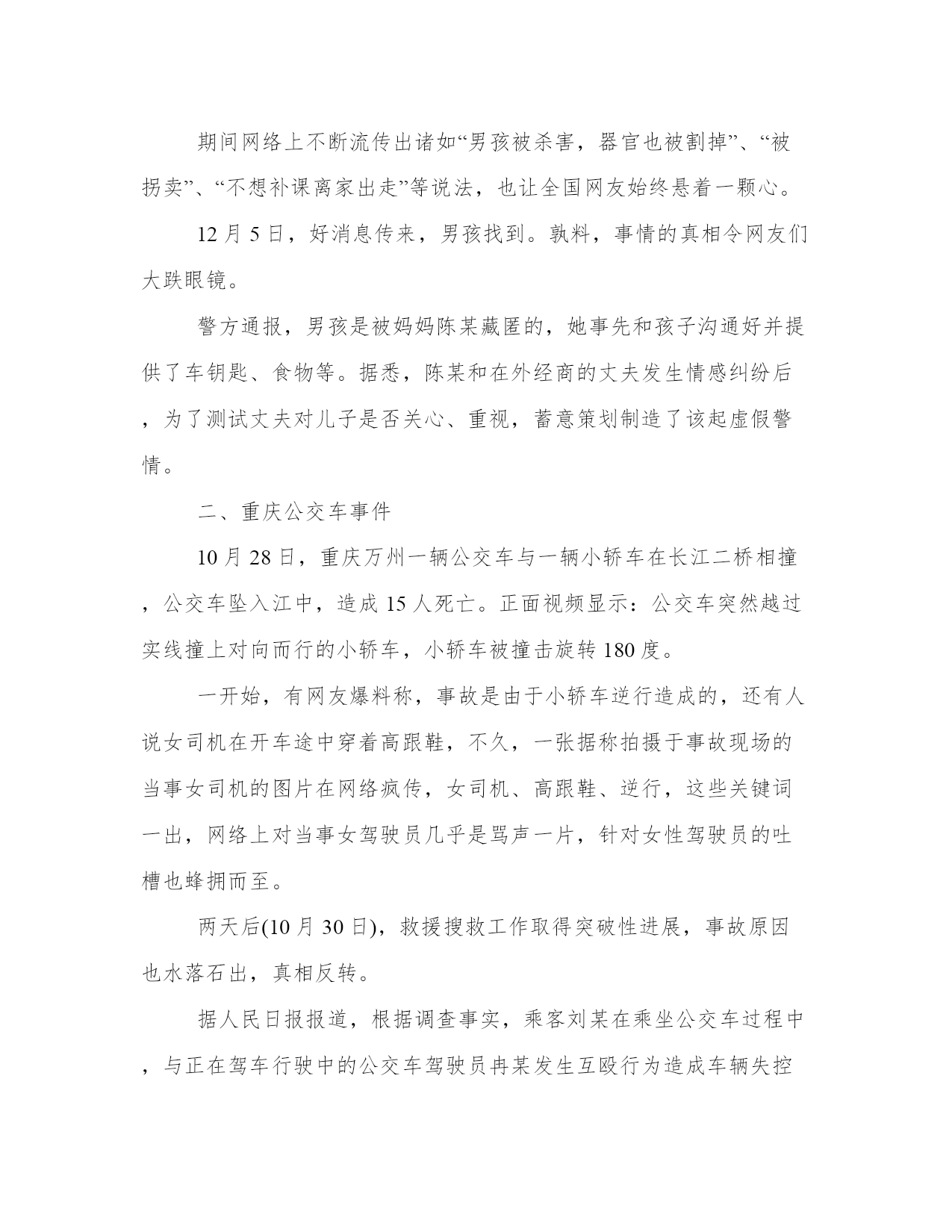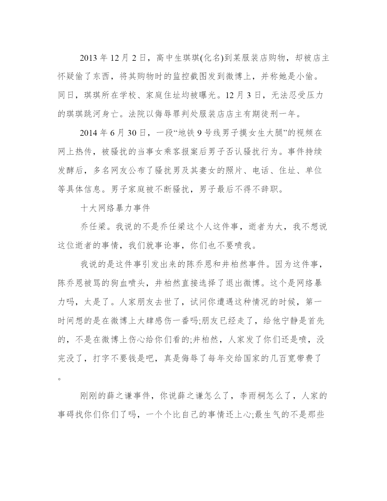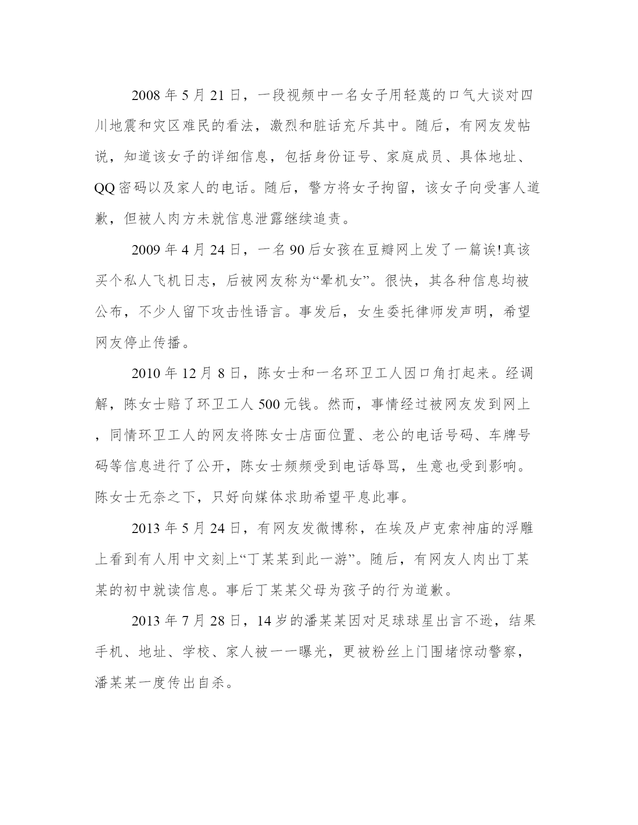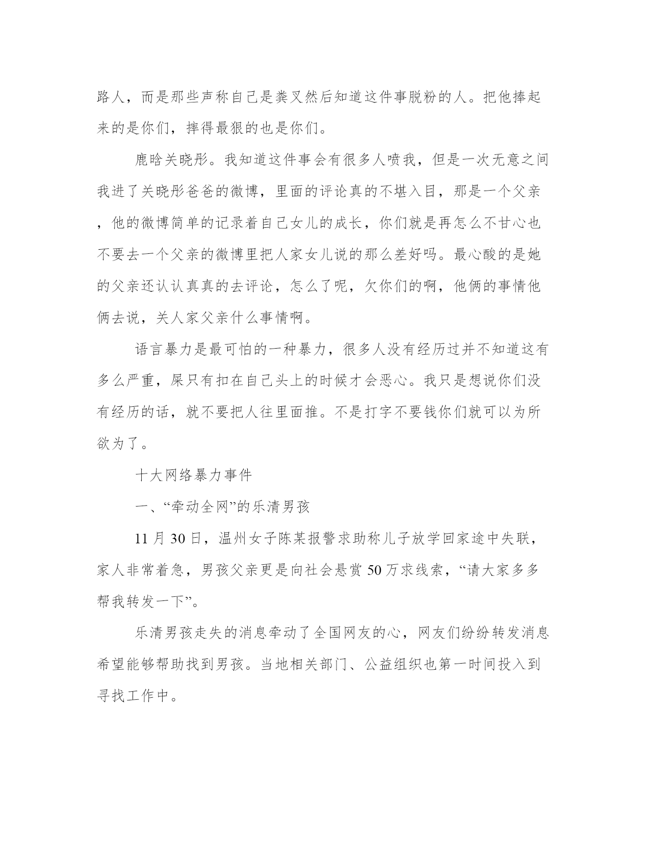 十大网络暴力事件网络暴力是一种危害严重、影响恶劣的暴力形式。下面是本站为大家整理的十大网络暴力事件,供大家参考。十大网络暴力事件2001年,有网民在猫扑网贴出一张“自己女朋友”的美女照片,引起网友关注并开始搜索。很快,这位名叫“陈某某”的女子大量个人资料被公布于网络,“陈某某事件”被视为人肉搜索的第一例,但那时候还没有“人肉”的说法。自该事件之后,网络暴力愈演愈烈。2006年2月,一网友公布了一组虐猫视频截图,一名时髦女子用高跟鞋将小猫踩死。不久,有网友发出“宇宙通缉令”,不少网友悬赏捉拿“凶手”。很快,该女子虐猫地点和她的工作单位等信息曝光。事件的结果是,虐猫女被解除职务。2007年12月29日,北京一女白领跳楼身亡。她在“死亡博客”中将寻死原因归咎于丈夫的不忠,并在博客贴出丈夫和第三者的照片。随后,有网站将该女子丈夫的住址、工作单位等信息全部披露。部分网民到该女子丈夫和其父母住处骚扰,甚至在墙壁上刷写“逼死贤妻”、“血债血偿”等标语。最终,法院宣判该女子丈夫起诉的三家网站赔偿8000元。2008年5月21日,一段视频中一名女子用轻蔑的口气大谈对四川地震和灾区难民的看法,激烈和脏话充斥其中。随后,有网友发帖说,知道该女子的详细信息,包括身份证号、家庭成员、具体地址、QQ密码以及家人的电话。随后,警方将女子拘留,该女子向受害人道歉,但被人肉方未就信息泄露继续追责。2009年4月24日,一名90后女孩在豆瓣网上发了一篇诶!真该买个私人飞机日志,后被网友称为“晕机女”。很快,其各种信息均被公布,不少人留下攻击性语言。事发后,女生委托律师发声明,希望网友停止传播。2010年12月8日,陈女士和一名环卫工人因口角打起来。经调解,陈女士赔了环卫工人500元钱。然而,事情经过被网友发到网上,同情环卫工人的网友将陈女士店面位置、老公的电话号码、车牌号码等信息进行了公开,陈女士频频受到电话辱骂,生意也受到影响。陈女士无奈之下,只好向媒体求助希望平息此事。2013年5月24日,有网友发微博称,在埃及卢克索神庙的浮雕上看到有人用中文刻上“丁某某到此一游”。随后,有网友人肉出丁某某的初中就读信息。事后丁某某父母为孩子的行为道歉。2013年7月28日,14岁的潘某某因对足球球星出言不逊,结果手机、地址、学校、家人被一一曝光,更被粉丝上门围堵惊动警察,潘某某一度传出自杀。2013年12月2日,高中生琪琪(化名)到某服装店购物,却被店主怀疑偷了东西,将其购物时的监控截图发到微博上,并称她是小偷。同日,琪琪所在学校、家庭住址均被曝光。12月3日,无法忍受压力的琪琪跳河身亡。法院以侮辱罪判处服装店店主有期徒刑一年。2014年6月30日,一段“地铁9号线男子摸女生大腿”的视频在网上热传,被骚扰的当事女乘客报案后男子否认骚扰行为。事件持续发酵后,多名网友公布了骚扰男及其妻女的照片、电话、住址、单位等具体信息。男子家庭被不断骚扰,男子最后不得不辞职。十大网络暴力事件乔任梁。我说的不是乔任梁这个人这件事,逝者为大,我不想说这位逝者的事情,我们就事论事,你们也不要喷我。我说的是这件事引发出来的陈乔恩和井柏然事件。因为这件事,陈乔恩被骂的狗血喷头,井柏然直接选择了退出微博。这个是网络暴力吗,太是了。人家朋友去世了,试问你遭遇这种情况的时候,第一时间想的是在微博上大肆感伤一番吗;朋友已经走了,给他宁静是首先的,不是在微博上伤心给你们看的;井柏然,人家发了你们还是喷,没完没了,打字不要钱是吧,真是侮辱了每年交给国家的几百宽带费了。刚刚的薛之谦事件,你说薛之谦怎么了,李雨桐怎么了,人家的事碍找你们你们了吗,一个个比自己的事情还上心;最生气的不是那些路人,而是那些声称自己是粪叉然后知道这件事脱粉的人。把他捧起来的是你们,摔得最狠的也是你们。鹿晗关晓彤。我知道这件事会有很多人喷我,但是一次无意之间我进了关晓彤爸爸的微博,里面的评论真的不堪入目,那是一个父亲,他的微博简单的记录着自己女儿的成长,你们就是再怎么不甘心也不要去一个父亲的微博里把人家女儿说的那么差好吗。最心酸的是她的父亲还认认真真的去评论,怎么了呢,欠你们的啊,他俩的事情他俩去说,关人家父亲什么事情啊。语言暴力是最可怕的一种暴力,很多人没有经历过并不知道这有多么严重,屎只有扣在自己头上的时候才会恶心。我只是想说你们没有经历的话,就不要把人往里面推。不是打字不要钱你们就可以为所欲为了。十大网络暴力事件一、“牵动全网”的乐清男孩11月30日,温州女子陈某报警求助称儿子放学回家途中失联,家人非常着急,男孩父亲更是向社会悬赏50万求线索,“请大家多多帮我转发一下”。乐清男孩走失的消息牵动了全国网友的心,网友们纷纷转发消息希望能够帮助找到男孩。当地相关部门、公益组织也第一时间投入到寻找工作中。期间网络上不断流传出诸如“男孩被杀害,