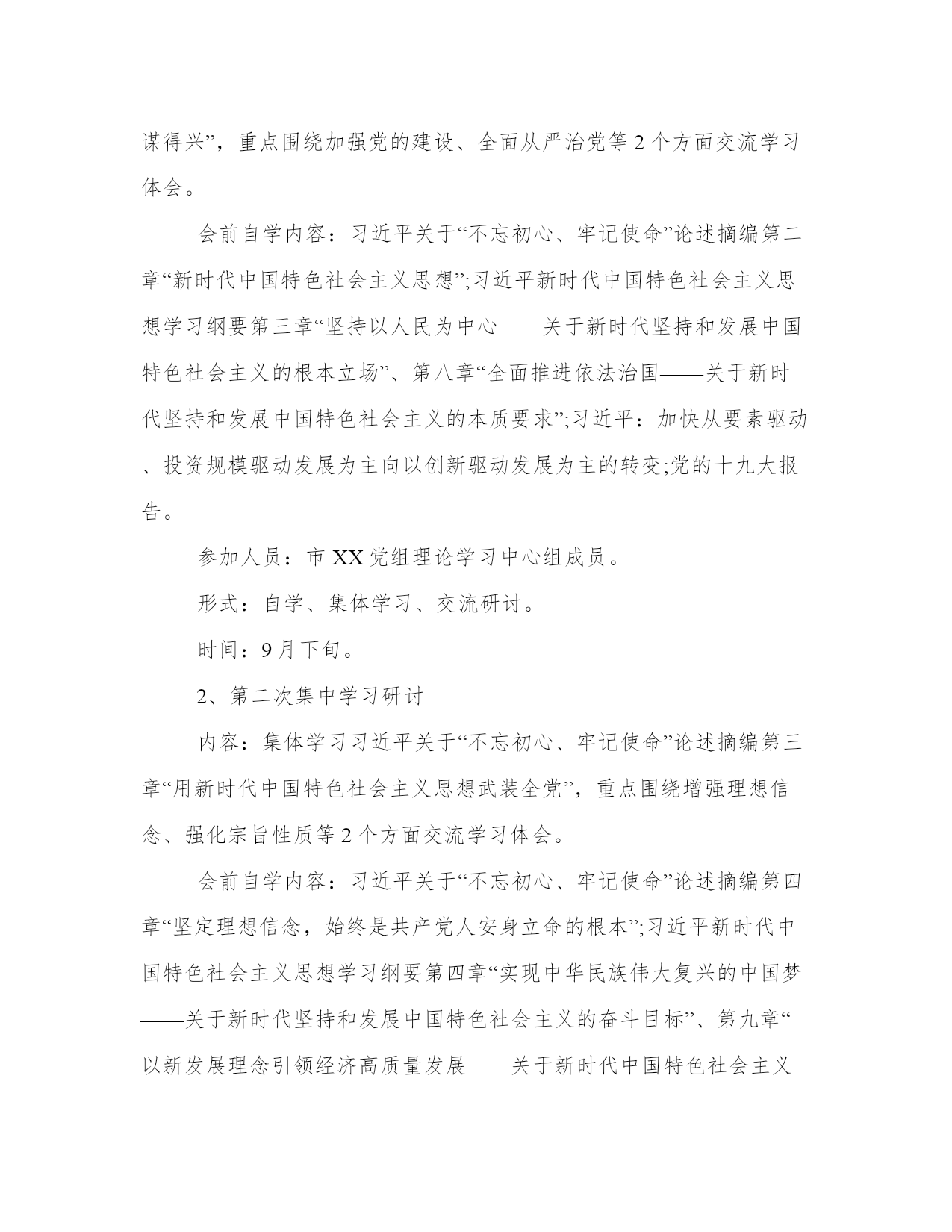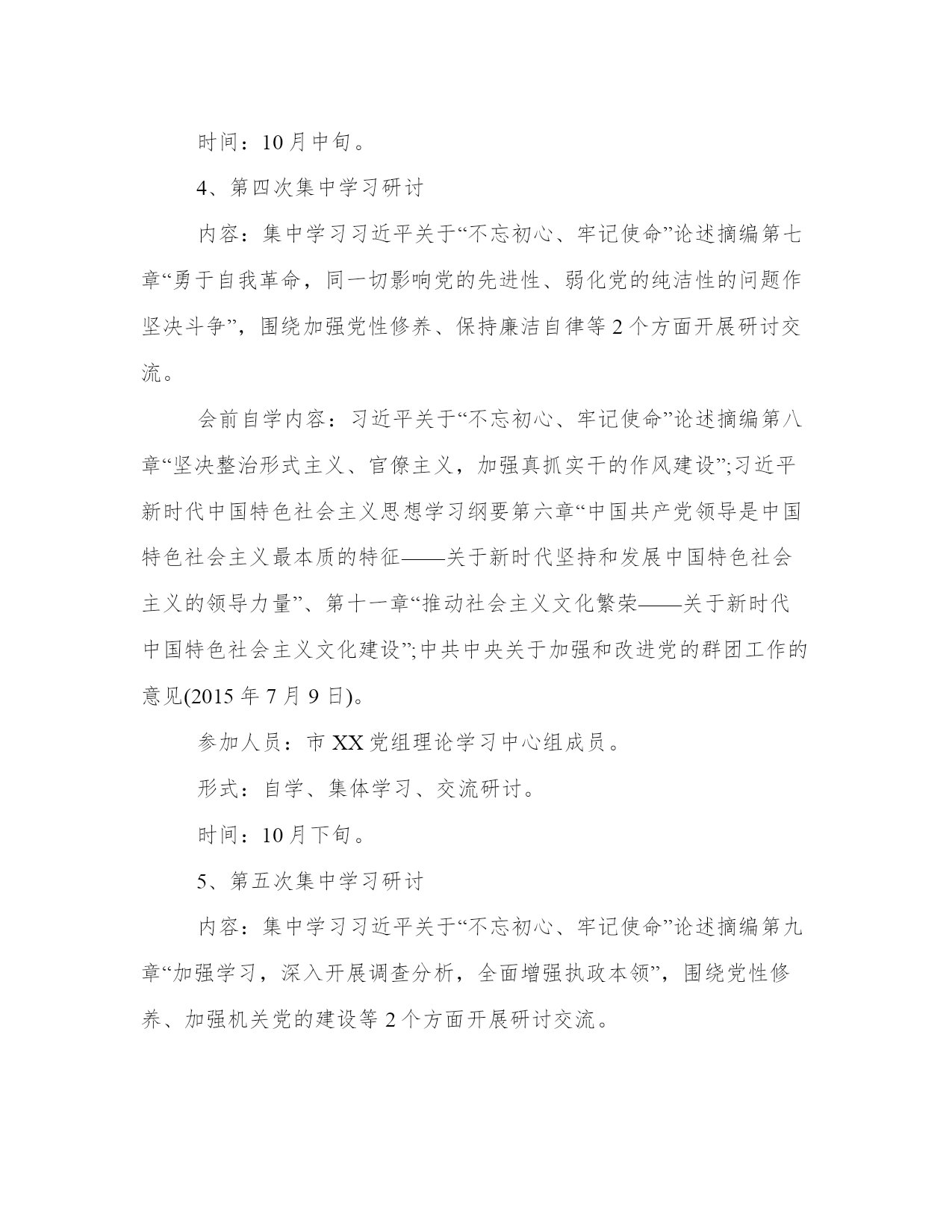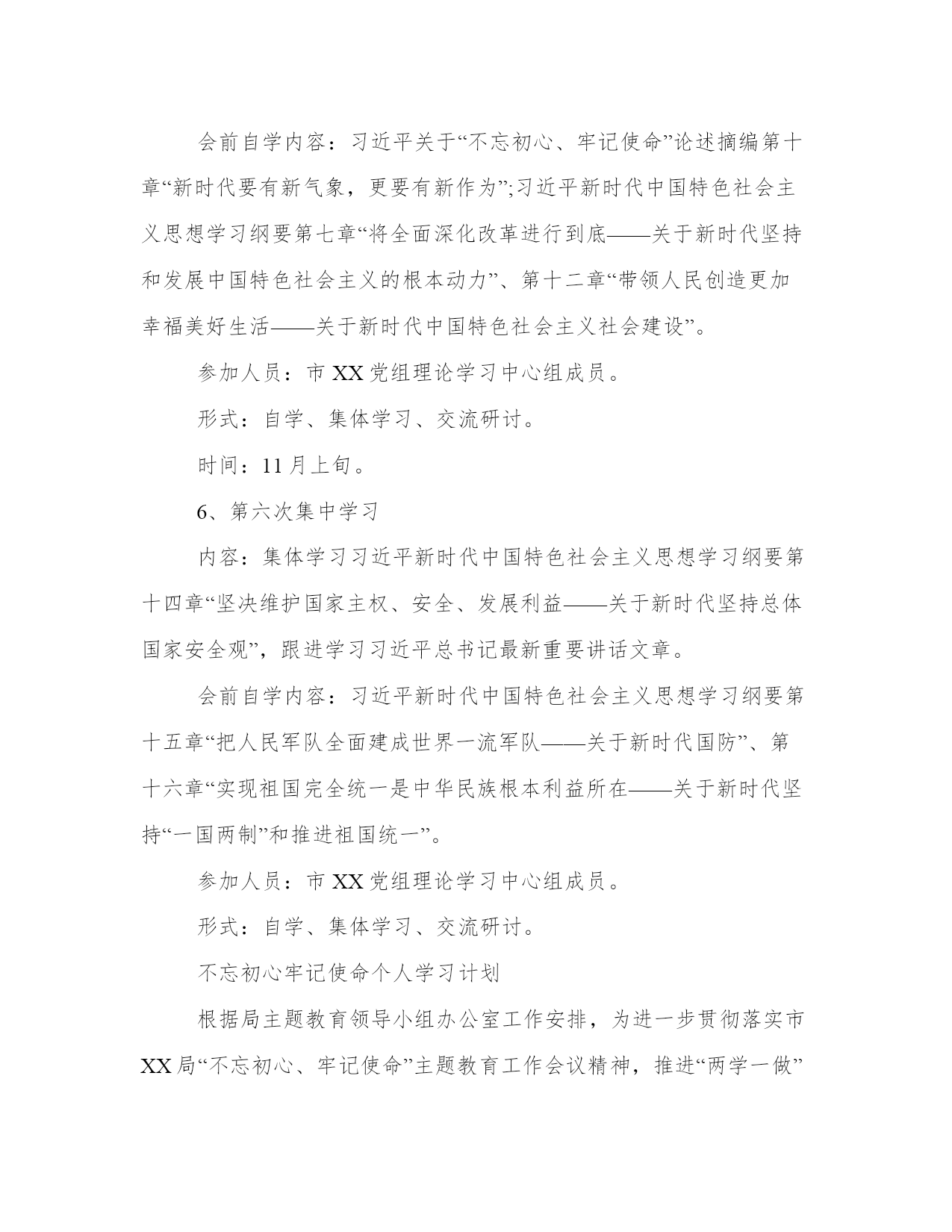 不忘初心牢记使命个人学习计划五篇学习计划是我们学习日常必备的东西,一个好的学习计划可以让你的学习变得异常轻松。以下是本站分享的不忘初心牢记使命个人学习计划,希望能帮助到大家!不忘初心牢记使命个人学习计划一、总体把握二、学习内容重点学习党的十九大报告、党章、习近平关于“不忘初心、牢记使命”重要论述选编、习近平新时代中国特色社会主义思想学习纲要、习近平总书记视察XX重要讲话、重要指示批示;跟进学习习近平总书记最新重要讲话文章;突出学习习近平总书记关于政治建设、全面从严治党、理想信念和XX工作的重要论述。(一)主题教育读书班学习市XX班子和党员领导干部参加全市“不忘初心、牢记使命”主题教育读书班。学习时间:9月XX日至XX日。(二)党组理论学习中心组学习研讨1、第一次集中学习研讨内容:集体学习习近平关于“不忘初心、牢记使命”论述摘编第一章“中国共产党人的初心和使命,就是为中国人民谋幸福,为中华民族谋得兴”,重点围绕加强党的建设、全面从严治党等2个方面交流学习体会。会前自学内容:习近平关于“不忘初心、牢记使命”论述摘编第二章“新时代中国特色社会主义思想”;习近平新时代中国特色社会主义思想学习纲要第三章“坚持以人民为中心——关于新时代坚持和发展中国特色社会主义的根本立场”、第八章“全面推进依法治国——关于新时代坚持和发展中国特色社会主义的本质要求”;习近平:加快从要素驱动、投资规模驱动发展为主向以创新驱动发展为主的转变;党的十九大报告。参加人员:市XX党组理论学习中心组成员。形式:自学、集体学习、交流研讨。时间:9月下旬。2、第二次集中学习研讨内容:集体学习习近平关于“不忘初心、牢记使命”论述摘编第三章“用新时代中国特色社会主义思想武装全党”,重点围绕增强理想信念、强化宗旨性质等2个方面交流学习体会。会前自学内容:习近平关于“不忘初心、牢记使命”论述摘编第四章“坚定理想信念,始终是共产党人安身立命的根本”;习近平新时代中国特色社会主义思想学习纲要第四章“实现中华民族伟大复兴的中国梦——关于新时代坚持和发展中国特色社会主义的奋斗目标”、第九章“以新发展理念引领经济高质量发展——关于新时代中国特色社会主义经济建设”;习近平:为建设世界科技强国而奋斗;中共产产党党章关于新形势下党内政治生活的若干准则中国共产党纪律处分条例。参加人员:市XX党组理论学习中心组成员。形式:自学、集体学习、交流研讨。时间:9月下旬。3、第三次集中学习研讨内容:集中学习习近平关于“不忘初心、牢记使命”论述摘编第五章“把政治建设摆在首位,不断增强‘四个意识’、坚定‘四个自信’、做到‘两个维护’”,围绕勇于担当作为、强化政治纪律和政治规矩等2个方面开展研讨交流。会前自学内容:习近平关于“不忘初心、牢记使命”论述摘编第六章“坚持以人民为中心,把群众观点和群众路线深深植根于思想中、具体落实到行动上”;习近平新时代中国特色社会主义思想学习纲要第五章“开启全面建设社会主义现代化国家新征程-关于新时代坚持和发展中国特色社会主义的战略安排、第十章“发展社会主义民主政治——关于新时代中国特色这会主义政治建设”;习近平:在中国科学院第十九次院士大会、中国工程院第十四次院士大会上的讲话(2018年5月28日);习近平出席中央党的群团工作会议(2015年7月7日新华社电);习近平总书记视察XX重要讲话、重要指示批示。参加人员:市XX党组理论学习中心组成员。形式:自学、集体学习、交流研讨。时间:10月中旬。4、第四次集中学习研讨内容:集中学习习近平关于“不忘初心、牢记使命”论述摘编第七章“勇于自我革命,同一切影响党的先进性、弱化党的纯洁性的问题作坚决斗争”,围绕加强党性修养、保持廉洁自律等2个方面开展研讨交流。会前自学内容:习近平关于“不忘初心、牢记使命”论述摘编第八章“坚决整治形式主义、官僚主义,加强真抓实干的作风建设”;习近平新时代中国特色社会主义思想学习纲要第六章“中国共产党领导是中国特色社会主义最本质的特征——关于新时代坚持和发展中国特色社会主义的领导力量”、第十一章“推动社会主义文化繁荣——关于新时代中国特色社会主义文化建设”;中共中央关于加强和改进党的群团工作的意见(2015年7月9日)。参加人员:市XX党组理论学习中心组成员。形式:自学、集体学习、交流研讨。时间:10月下旬。5、第五次集中学习研讨内容:集中学习习近平关于“不忘初心、牢记使命”论述摘编第九章“加强学习,深入开展调查分析,全面增强执政本领”,围绕党性修养、加强机关党的建设等2个方面开展研讨交流。会前自学内容:习近平关于“不忘初心、牢记使命”论述摘编第十章“新时代要有新气象,更要有新作为”;习近平新时代中国特色社会主义思想学习纲要第七章“将全面深化改革进行到底——关于新时代坚持和发展中国特色社会主义的根本动力”、第十二