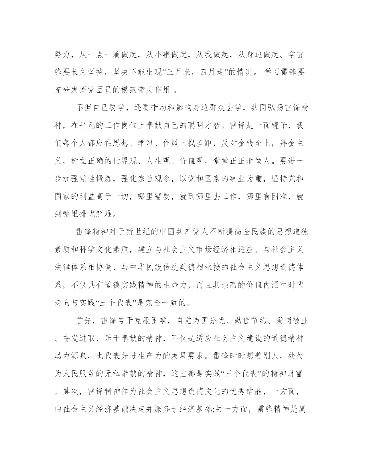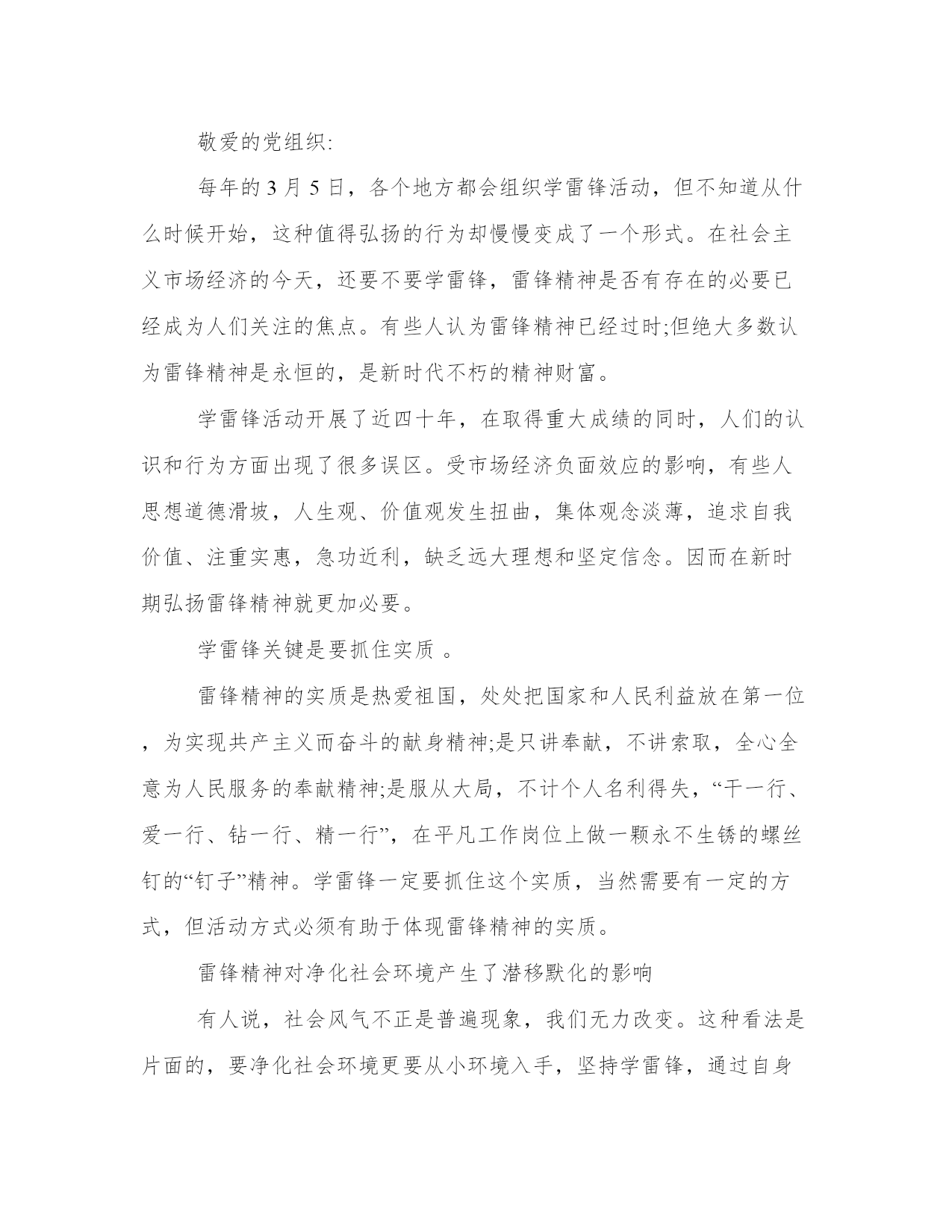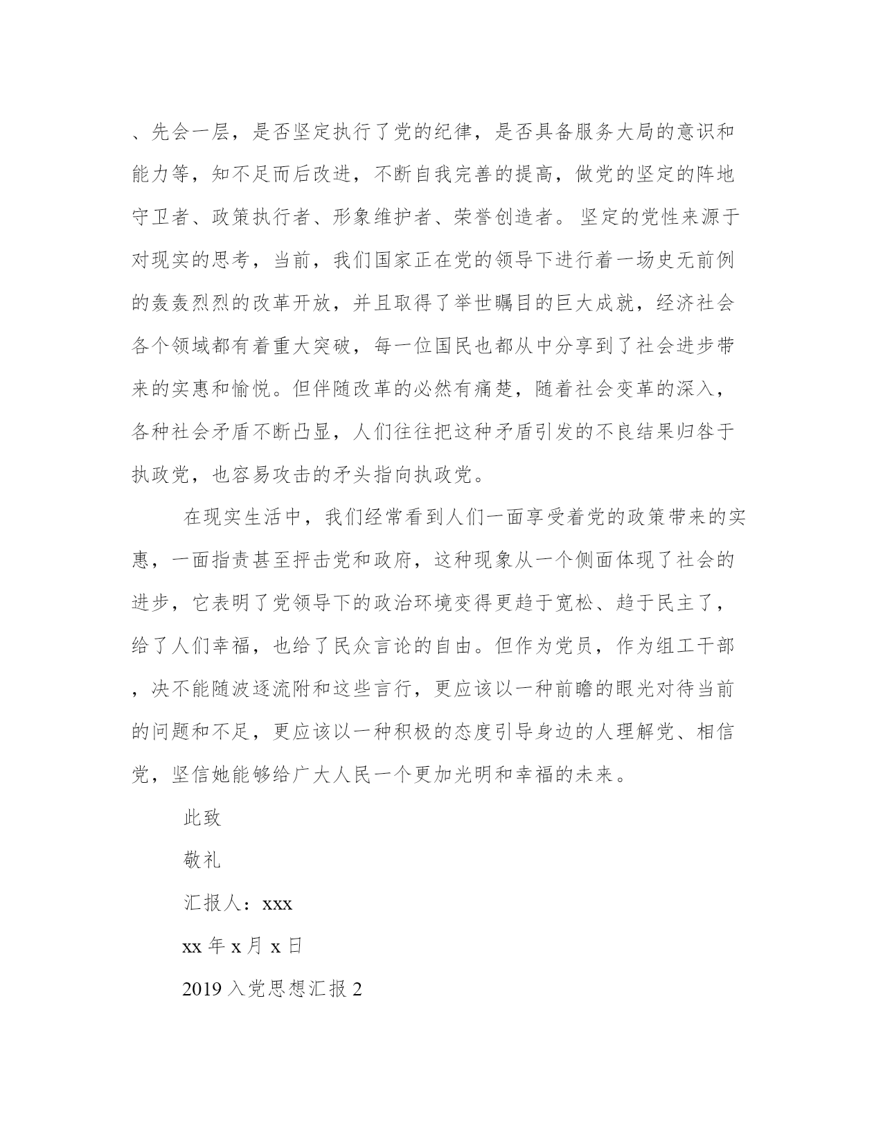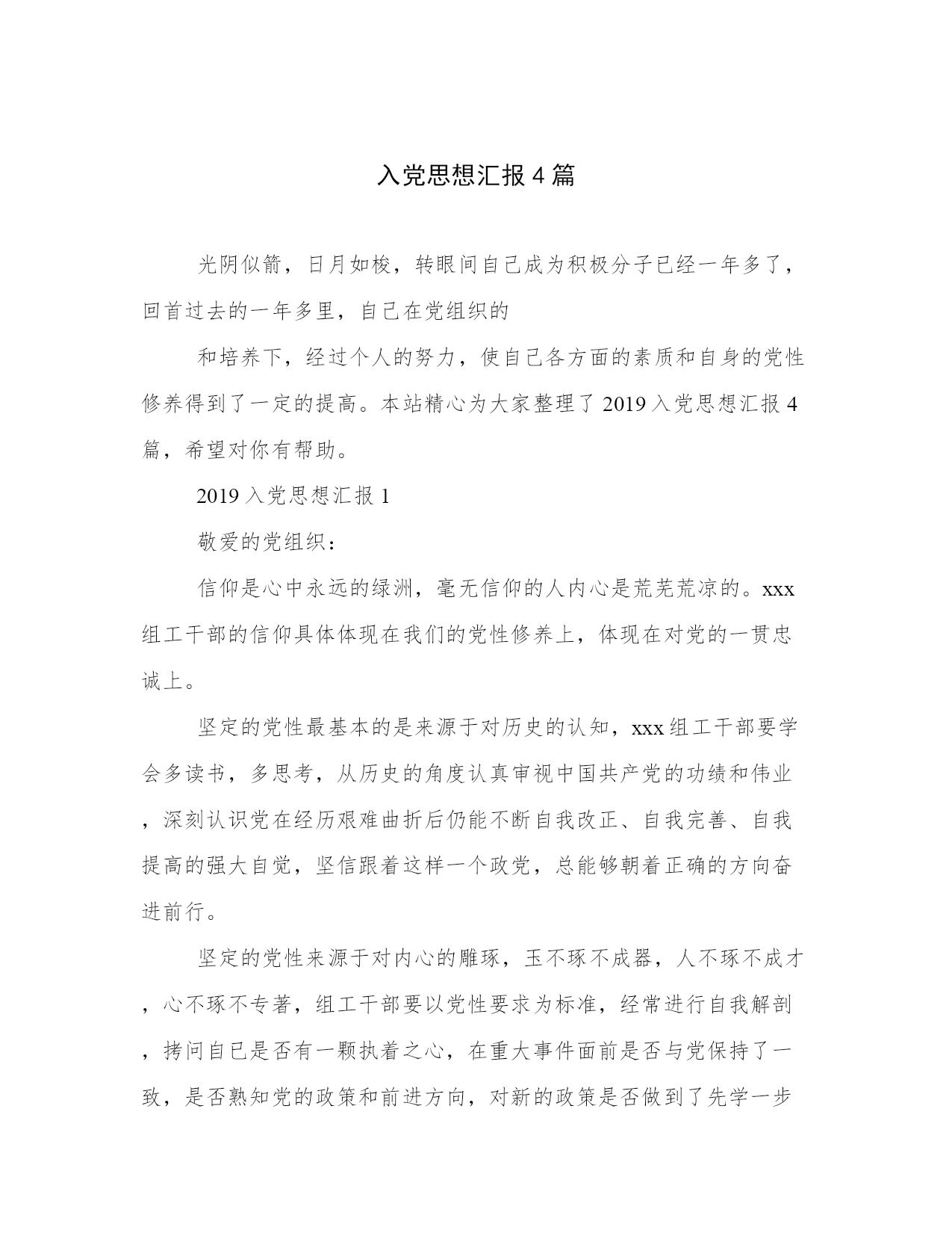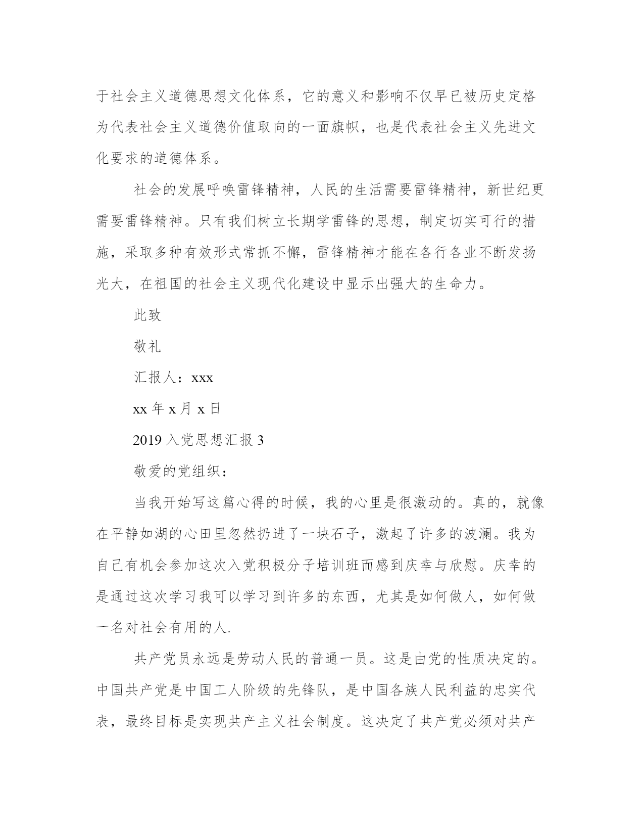 入党思想汇报4篇光阴似箭,日月如梭,转眼间自己成为积极分子已经一年多了,回首过去的一年多里,自己在党组织的和培养下,经过个人的努力,使自己各方面的素质和自身的党性修养得到了一定的提高。本站精心为大家整理了2019入党思想汇报4篇,希望对你有帮助。2019入党思想汇报1敬爱的党组织:信仰是心中永远的绿洲,毫无信仰的人内心是荒芜荒凉的。xxx组工干部的信仰具体体现在我们的党性修养上,体现在对党的一贯忠诚上。坚定的党性最基本的是来源于对历史的认知,xxx组工干部要学会多读书,多思考,从历史的角度认真审视中国共产党的功绩和伟业,深刻认识党在经历艰难曲折后仍能不断自我改正、自我完善、自我提高的强大自觉,坚信跟着这样一个政党,总能够朝着正确的方向奋进前行。坚定的党性来源于对内心的雕琢,玉不琢不成器,人不琢不成才,心不琢不专著,组工干部要以党性要求为标准,经常进行自我解剖,拷问自已是否有一颗执着之心,在重大事件面前是否与党保持了一致,是否熟知党的政策和前进方向,对新的政策是否做到了先学一步、先会一层,是否坚定执行了党的纪律,是否具备服务大局的意识和能力等,知不足而后改进,不断自我完善的提高,做党的坚定的阵地守卫者、政策执行者、形象维护者、荣誉创造者。坚定的党性来源于对现实的思考,当前,我们国家正在党的领导下进行着一场史无前例的轰轰烈烈的改革开放,并且取得了举世瞩目的巨大成就,经济社会各个领域都有着重大突破,每一位国民也都从中分享到了社会进步带来的实惠和愉悦。但伴随改革的必然有痛楚,随着社会变革的深入,各种社会矛盾不断凸显,人们往往把这种矛盾引发的不良结果归咎于执政党,也容易攻击的矛头指向执政党。在现实生活中,我们经常看到人们一面享受着党的政策带来的实惠,一面指责甚至抨击党和政府,这种现象从一个侧面体现了社会的进步,它表明了党领导下的政治环境变得更趋于宽松、趋于民主了,给了人们幸福,也给了民众言论的自由。但作为党员,作为组工干部,决不能随波逐流附和这些言行,更应该以一种前瞻的眼光对待当前的问题和不足,更应该以一种积极的态度引导身边的人理解党、相信党,坚信她能够给广大人民一个更加光明和幸福的未来。此致敬礼汇报人:xxxxx年x月x日2019入党思想汇报2敬爱的党组织:每年的3月5日,各个地方都会组织学雷锋活动,但不知道从什么时候开始,这种值得弘扬的行为却慢慢变成了一个形式。在社会主义市场经济的今天,还要不要学雷锋,雷锋精神是否有存在的必要已经成为人们关注的焦点。有些人认为雷锋精神已经过时;但绝大多数认为雷锋精神是永恒的,是新时代不朽的精神财富。学雷锋活动开展了近四十年,在取得重大成绩的同时,人们的认识和行为方面出现了很多误区。受市场经济负面效应的影响,有些人思想道德滑坡,人生观、价值观发生扭曲,集体观念淡薄,追求自我价值、注重实惠,急功近利,缺乏远大理想和坚定信念。因而在新时期弘扬雷锋精神就更加必要。学雷锋关键是要抓住实质。雷锋精神的实质是热爱祖国,处处把国家和人民利益放在第一位,为实现共产主义而奋斗的献身精神;是只讲奉献,不讲索取,全心全意为人民服务的奉献精神;是服从大局,不计个人名利得失,“干一行、爱一行、钻一行、精一行”,在平凡工作岗位上做一颗永不生锈的螺丝钉的“钉子”精神。学雷锋一定要抓住这个实质,当然需要有一定的方式,但活动方式必须有助于体现雷锋精神的实质。雷锋精神对净化社会环境产生了潜移默化的影响有人说,社会风气不正是普遍现象,我们无力改变。这种看法是片面的,要净化社会环境更要从小环境入手,坚持学雷锋,通过自身努力,从一点一滴做起,从小事做起,从我做起,从身边做起。学雷锋要长久坚持,坚决不能出现“三月来,四月走”的情况。学习雷锋要充分发挥党团员的模范带头作用。不但自己要学,还要带动和影响身边群众去学,共同弘扬雷锋精神,在平凡的工作岗位上奉献自己的聪明才智。雷锋是一面镜子,我们每个人都应在思想、学习、作风上找差距,反对金钱至上,拜金主义,树立正确的世界观、人生观、价值观,堂堂正正地做人。要进一步加强党性锻炼,强化宗旨观念,以党和国家的事业为重,坚持党和国家的利益高于一切,哪里需要,就到哪里去工作,哪里有困难,就到哪里排忧解难。雷锋精神对于新世纪的中国共产党人不断提高全民族的思想道德素质和科学文化素质,建立与社会主义市场经济相适应、与社会主义法律体系相协调、与中华民族传统美德相承接的社会主义思想道德体系,不仅具有道德实践精神的生命力,而且其崇高的价值内涵和时代走向与实践“三个代表”是完全一致的。首先,雷锋勇于克服困难,自觉为国分忧、勤俭节约、爱岗敬业、奋发进取、乐于奉献的精神,不仅是适应社会主义建设的道德精神动力源泉,也代表先进生产力的发展要求。雷锋时时想着别人,处处为人民服务的无私奉献的精神,这些都是实践“三个代表”的精神财富。其次,
