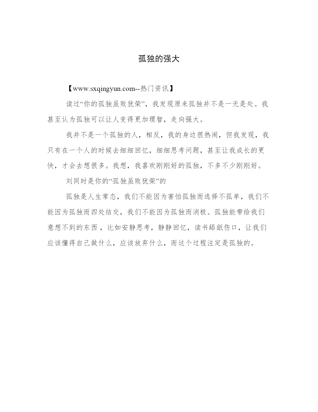 孤独的强大【www.sxqingyun.com--热门资讯】读过“你的孤独虽败犹荣”,我发现原来孤独并不是一无是处。我甚至认为孤独可以让人变得更加理智,走向强大。我并不是一个孤独的人,相反,我的身边很热闹,但我发现,我只有在一个人的时候去细细回忆,细细思考问题,甚至让我成长的更快,才会去想很多。我想,我喜欢刚刚好的孤独,不多不少刚刚好。刘同时是你的“孤独虽败犹荣”的孤独是人生常态,我们不能因为害怕孤独而选择不孤单,我们不能因为孤独而四处结交,我们不能因为孤独而消极。孤独能带给我们意想不到的东西,比如安静思考,静静回忆,读书舔舐伤口,让我们应该懂得自己做什么,应该放弃什么,而这个过程注定是孤独的。