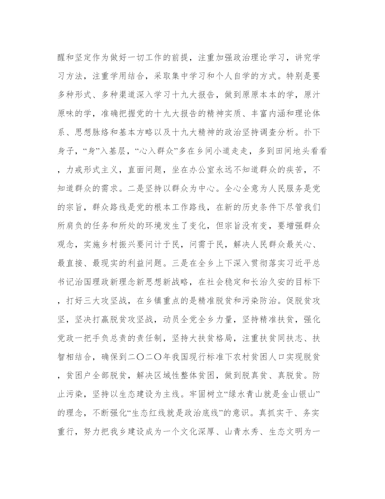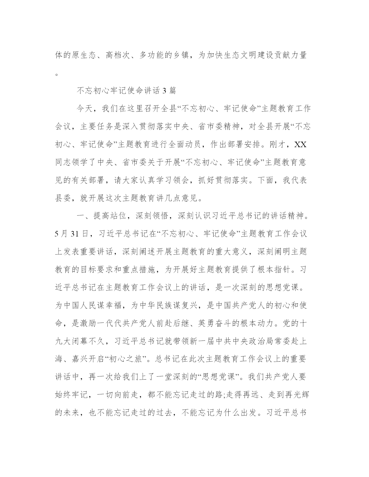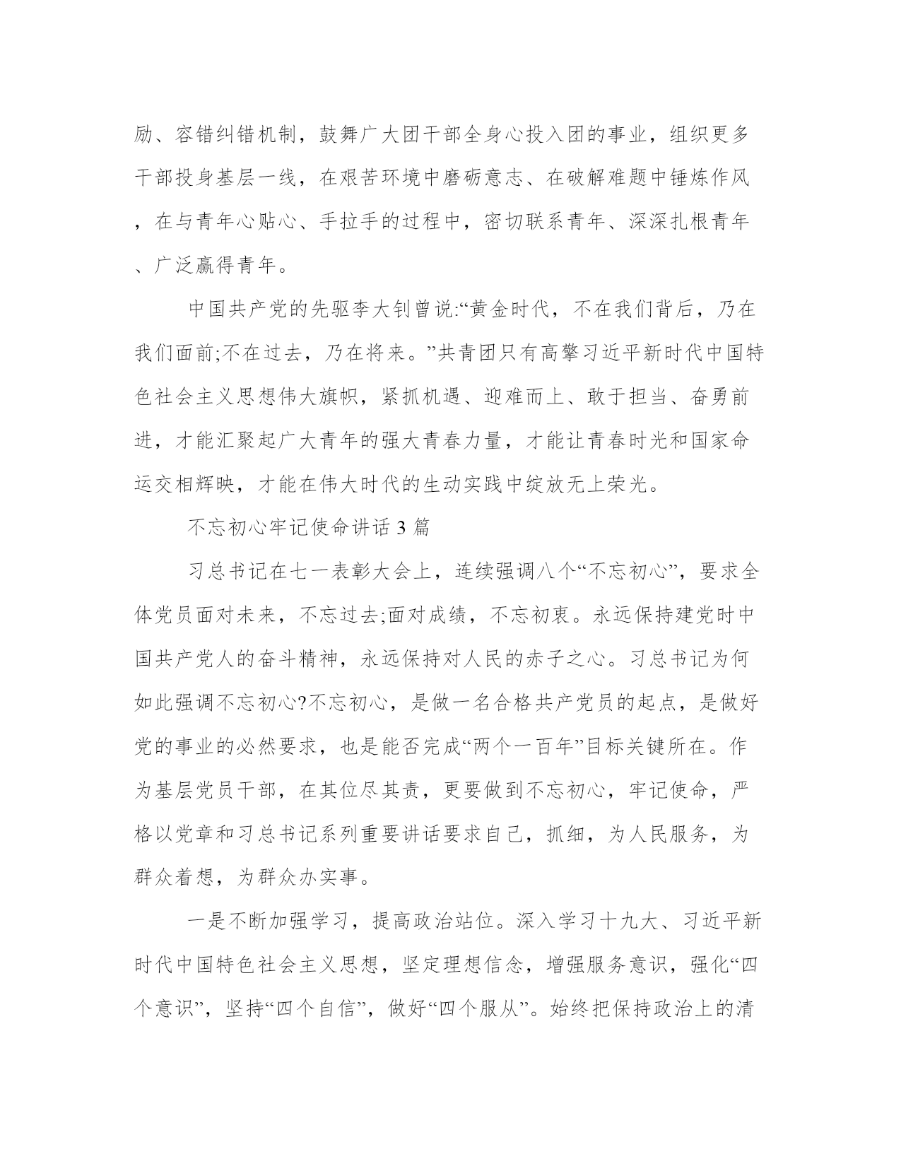不忘初心牢记使命讲话3篇“走得再远、走到再光辉的未来,也不能忘记走过的过去,不能忘记为什么出发。”以下是本站分享的不忘初心牢记使命讲话3篇,希望能帮助到大家!不忘初心牢记使命讲话3篇习近平新时代中国特色社会主义思想是贯穿十九大报告的灵魂,也是解读党在新时代政治宣言的关键。新思想开辟新时代,凝聚新使命。这其中就包括一代代青年接力奋斗实现中国梦的重大战略要求。共青团作为党的助手和后备军,贯彻落实好党的十九大精神就是要紧紧围绕增强“政治性、先进性、群众性”,锐意改革、奋勇前进,扎扎实实抓好共青团改革工作,全力开创共青团改革发展新局面。紧紧围绕增强政治性,锐意改革、奋勇前进。始终坚持把学习习近平总书记重要讲话精神作为重大政治任务,全面学习领会和践行习近平新时代中国特色社会主义思想,更加注重系统地学习贯彻习近平总书记关于青少年和群团工作的重要指示精神,不断强化“四个意识”、坚定“四个自信”。始终坚持把自身置于党的领导之下,在思想上行动上同党中央持续高度一致,自觉维护党中央权威,旗帜鲜明发声亮剑,改革创新求索上进。始终坚持以理服人、以情感人,加强对青少年的政治引领和价值引领,创新引导的手段和方式,引导青年透过认真的思考和对现实生活深刻的观察分析,真正把“八个明确、十四个坚持”作为自身成长的指路明灯,坚定信念跟党走。紧紧围绕增强先进性,锐意改革、奋勇前进。持续加强共青团先进性建设,个性注重加强团员队伍先进性建设,严把入口、控制增量、规范行为、树立形象,大力培养提升团员意识和荣誉感。持续加强联系青年的桥梁纽带作用,健全青少年维权机制,探索建立高效有序的青年利益诉求表达渠道,全力促进青年成长成才。持续推进网上共青团建设,传递网络正能量、弘扬社会主旋律。持续引领青年以习近平总书记为榜样、向习近平总书记学习,自觉践行社会主义核心价值观,踊跃投身改革发展稳定一线,全面融入推进伟大斗争、伟大工程、伟大事业、伟大梦想的磅礴征程,为实现中华民族伟大复兴中国梦而不懈奋斗。紧紧围绕增强群众性,锐意改革、奋勇前进。直面脱离群众问题,稳步推进既定改革任务,个性注重在防范化解重大风险、精准脱贫、污染防治等大局工作中努力破除“四化”现象,个性注重在共青团自身改革中破解基层“四缺”难题,个性注重在调查分析中进一步掌握青少年时代特征、活动规律等,科学设计工作项目、优化工作资料、提升工作实效。密切与普通青年联系,落实直接联系青年工作制度,每联系一名青年力求做到“有感情、有服务、有效果”。树立良好的群众形象,全面推进从严治团,推进“两学一做”学习教育常态化制度化,扎实开展“不忘初心、牢记使命”主题教育,运用好干部考核评价、激励、容错纠错机制,鼓舞广大团干部全身心投入团的事业,组织更多干部投身基层一线,在艰苦环境中磨砺意志、在破解难题中锤炼作风,在与青年心贴心、手拉手的过程中,密切联系青年、深深扎根青年、广泛赢得青年。中国共产党的先驱李大钊曾说:“黄金时代,不在我们背后,乃在我们面前;不在过去,乃在将来。”共青团只有高擎习近平新时代中国特色社会主义思想伟大旗帜,紧抓机遇、迎难而上、敢于担当、奋勇前进,才能汇聚起广大青年的强大青春力量,才能让青春时光和国家命运交相辉映,才能在伟大时代的生动实践中绽放无上荣光。不忘初心牢记使命讲话3篇习总书记在七一表彰大会上,连续强调八个“不忘初心”,要求全体党员面对未来,不忘过去;面对成绩,不忘初衷。永远保持建党时中国共产党人的奋斗精神,永远保持对人民的赤子之心。习总书记为何如此强调不忘初心?不忘初心,是做一名合格共产党员的起点,是做好党的事业的必然要求,也是能否完成“两个一百年”目标关键所在。作为基层党员干部,在其位尽其责,更要做到不忘初心,牢记使命,严格以党章和习总书记系列重要讲话要求自己,抓细,为人民服务,为群众着想,为群众办实事。一是不断加强学习,提高政治站位。深入学习十九大、习近平新时代中国特色社会主义思想,坚定理想信念,增强服务意识,强化“四个意识”,坚持“四个自信”,做好“四个服从”。始终把保持政治上的清醒和坚定作为做好一切工作的前提,注重加强政治理论学习,讲究学习方法,注重学用结合,采取集中学习和个人自学的方式。特别是要多种形式、多种渠道深入学习十九大报告,做到原原本本的学,原汁原味的学,准确把握党的十九大报告的精神实质、丰富内涵和理论体系、思想脉络和基本方略以及十九大精神的政治坚持调查分析。扑下身子,“身”入基层,“心入群众”多在乡间小道走走,多到田间地头看看,力戒形式主义,直面问题,坐在办公室永远不知道群众的疾苦,不知道群众的需求。二是坚持以群众为中心。全心全意为人民服务是党的宗旨,群众路线是党的根本工作路线,在新的历史条件下尽管我们所肩负的任务和所处的环境发生了变化,但宗旨没有变,要增强群众观念,实施乡村振兴要问计于民,问需
